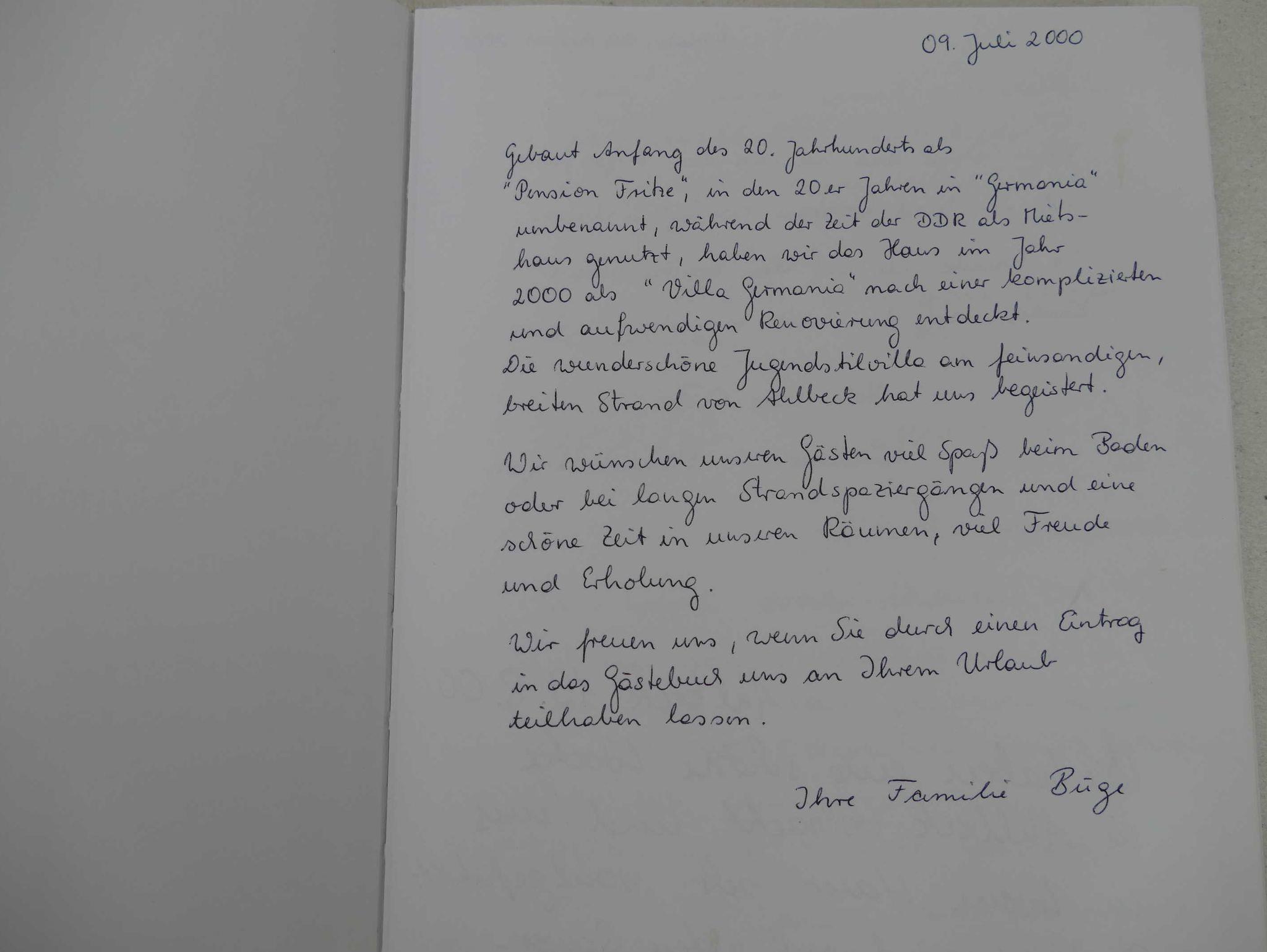 Die Jugendstilvilla Germania mit 3 Türmchen, befindet sich direkt am Strand und ist eines der schönsten denkmalgeschützten Häuser der Bäderarchitektur auf Usedom. Das Haus liegt ruhig an der Strandpromenade des Seebades Heringsdort im Ortsteil Ahlbeck beim Ostender Tor. Die Promenade mit Radweg verbindet die Kaiserbäder mit dem 5 km entfernten Zentrum von Swinemünde.