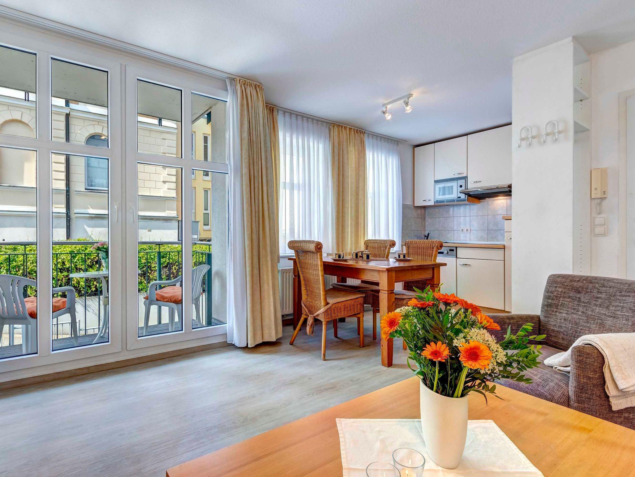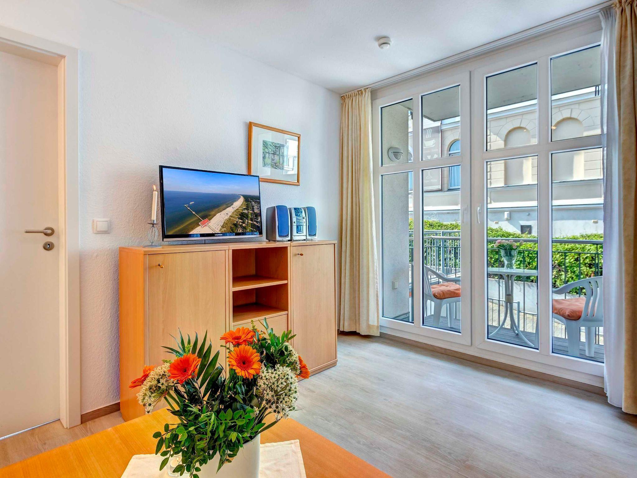 Direkt an der Strandpromenade mit SÜDBALKON und FAHRSTUHL im Haus! Schönes geräumiges 2-Zimmer-Apartment (ca. 37 m²) mit moderner guter Ausstattung. Separates Schlafzimmer (mit Fernseher), Wohnzimmer mit Küchenzeile und Essplatz, Duschbad, Balkon zur Südseite mit Sonne bis abends. Die Wohnung verfügt über einen Tiefgaragen-Pkw-Stellplatz. In der Garage können auch Fahrräder und ähnliches untergestellt werden. Von der Villa Aquamarina aus können Sie das Ortszentrum und die bekannte Ahlbecker Seebrücke in ca. 3 Minuten zu Fuß erreichen. Zum Strand sind es 50 m.
