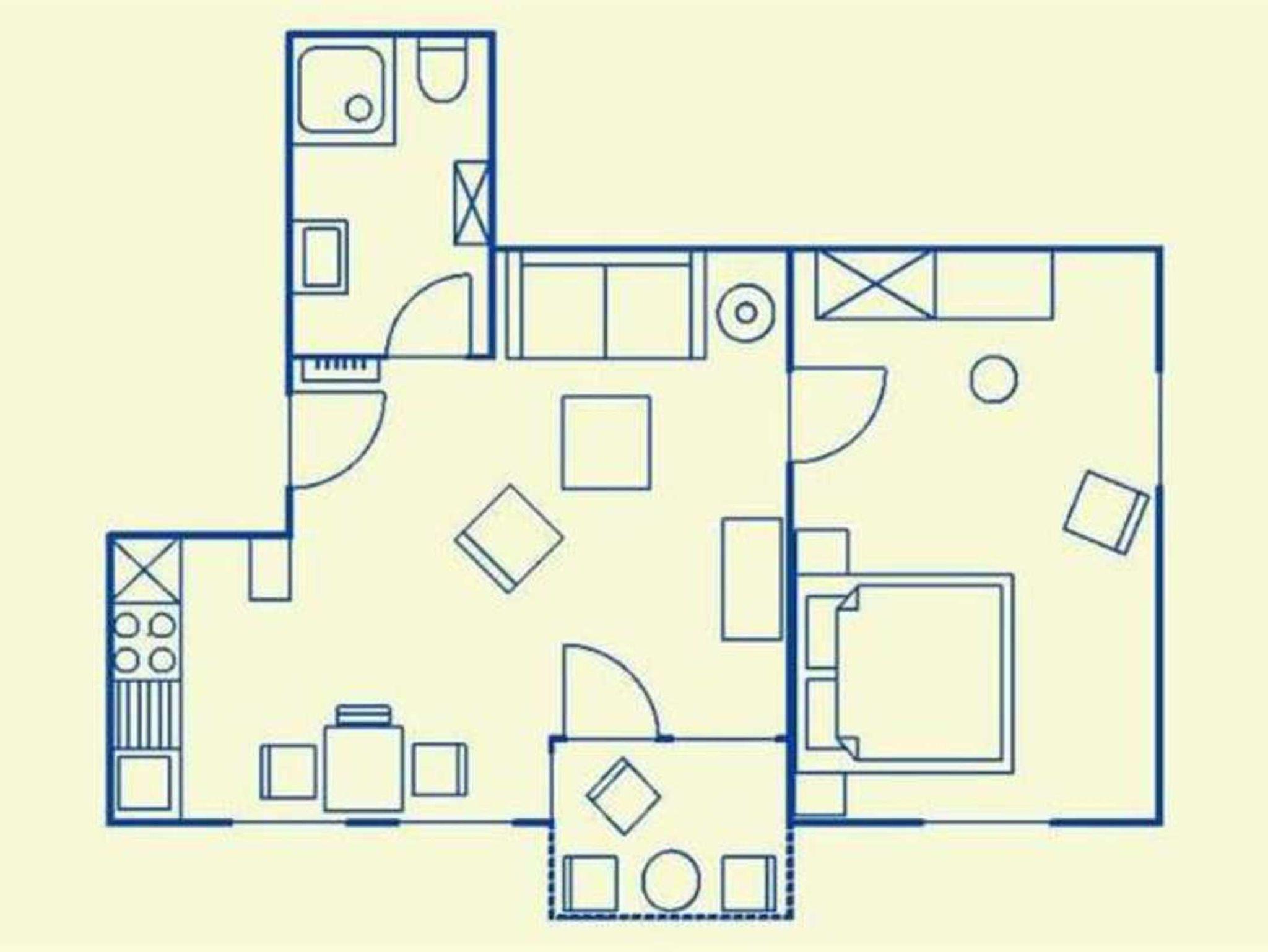 1 Schlafraum, 1 Wohnraum, 1 Küchenzeile, 1 Badezimmer mit Dusche