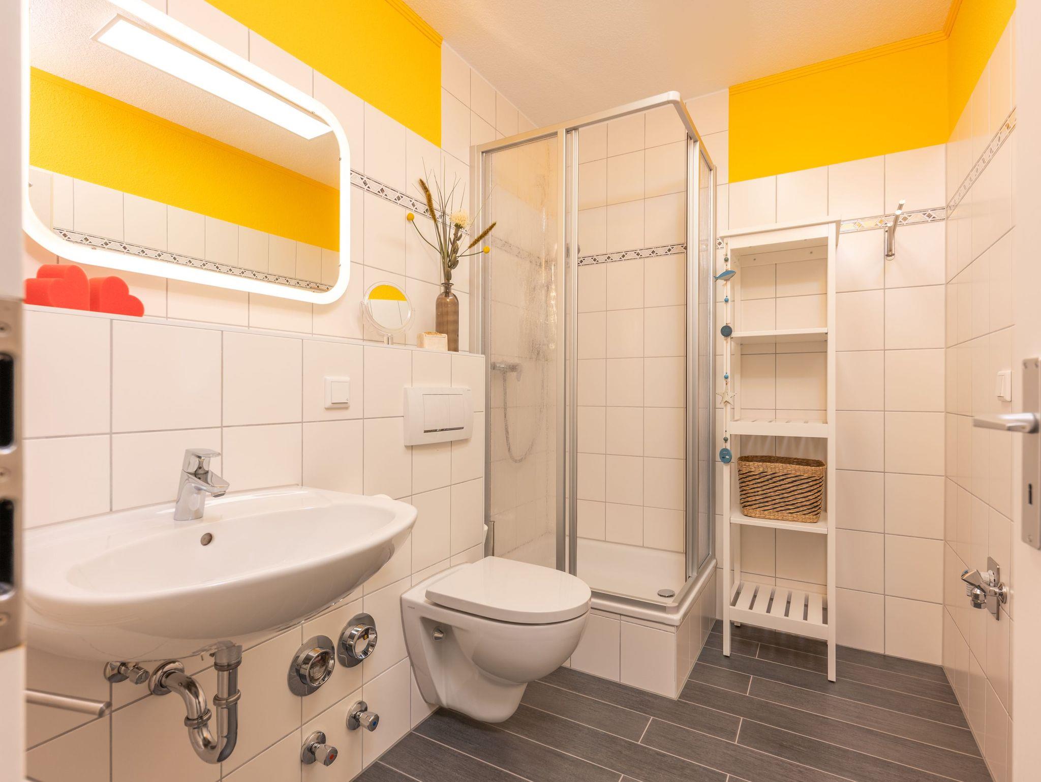 Die kleine offene Küche ist funktional eingerichtet und bietet alles, was man im Urlaub braucht: Glaskeramik-Kochfeld, Backofen, Wasserkocher, Toaster und Kaffeemaschine für den schnellen Kaffee am Morgen. Das moderne Bad verfügt über Dusche und WC und rundet den Komfort der Wohnung ab.