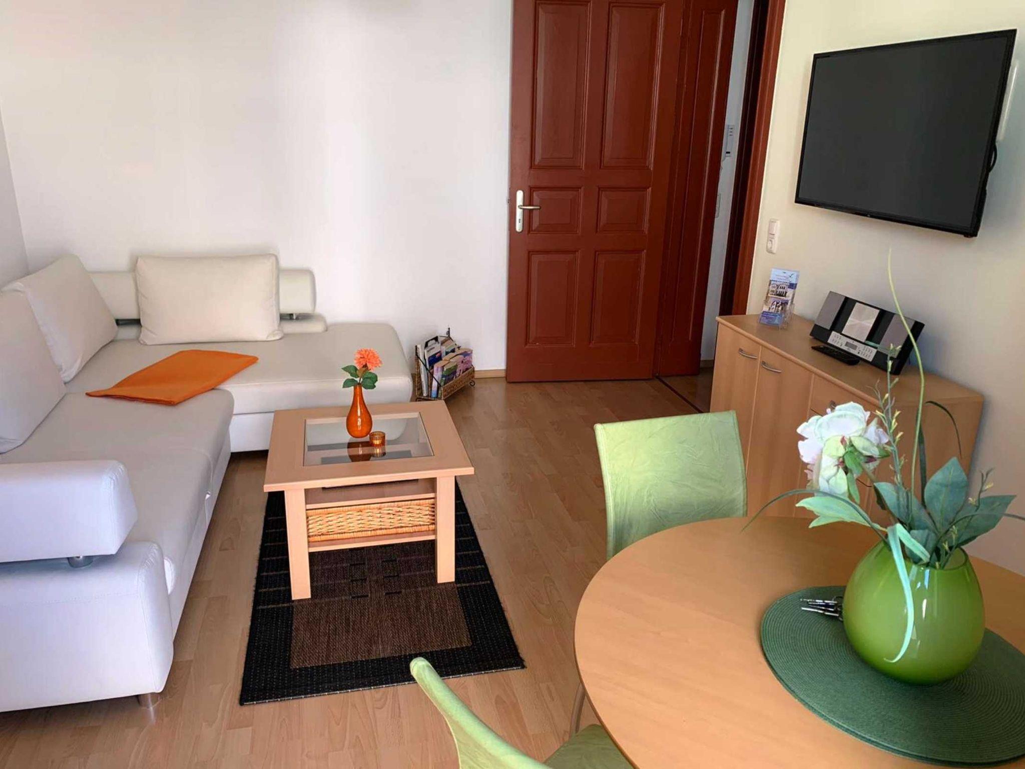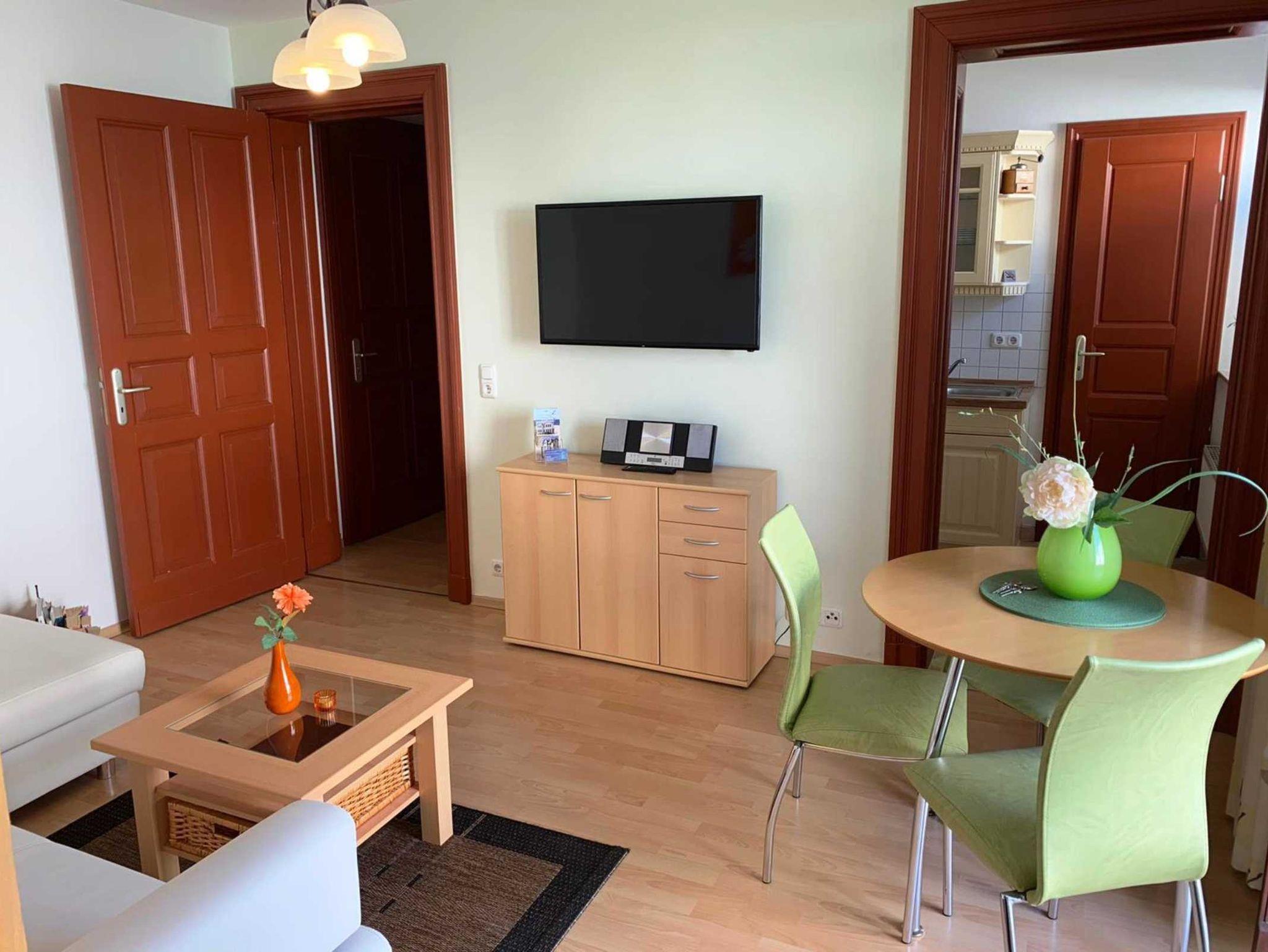 Die stilvoll eingerichtete Nichtraucher-Ferienwohnung mit einer Größe von ca. 50 qm befindet sich ebenerdig in der Villa Medici. Geschmackvoll eingerichtet bietet sie ein Wohnzimmer mit einer Doppelbettschlafcouch, Flat-TV und Esstisch sowie ein separates Schlafzimmer mit Boxspringbett und Kleiderschrank. Die moderne Einbauküche verfügt über ein Cerankochfeld, Backofen, Mikrowelle, Kaffeemaschine, Wasserkocher und Toaster. Das Badezimmer ist mit einer Badewanne sowie einer Dusche, WC und Bidet ausgestattet.