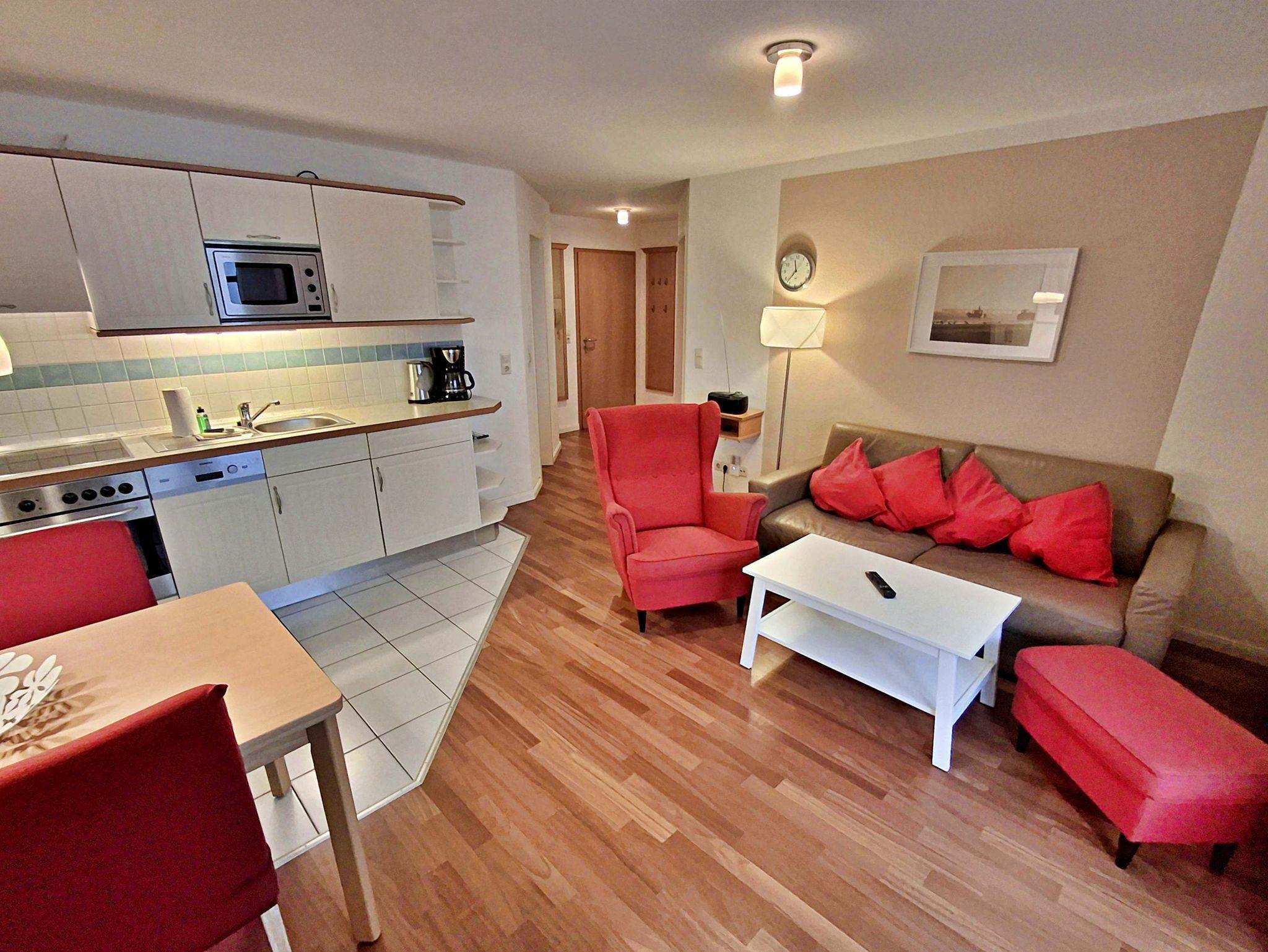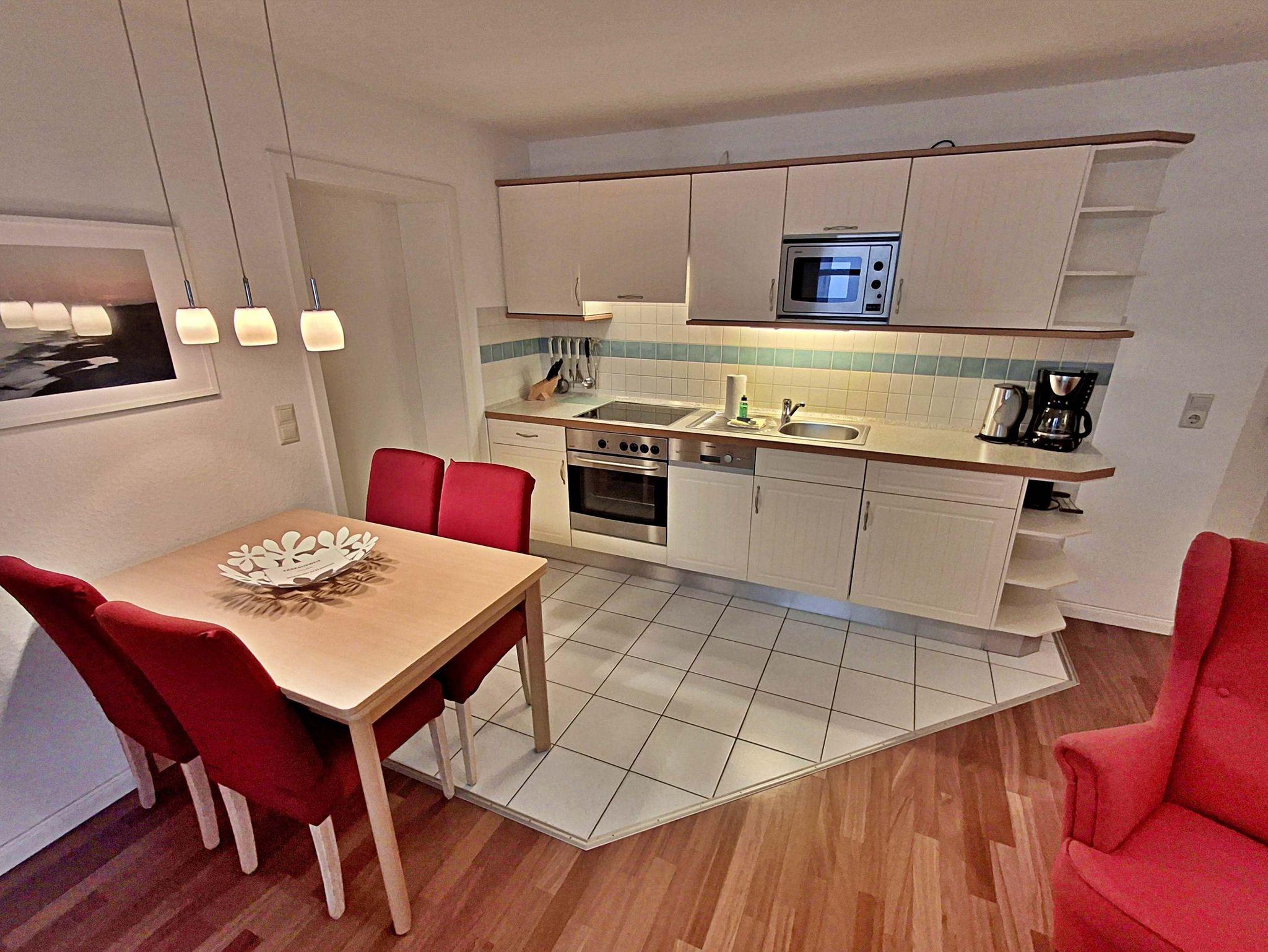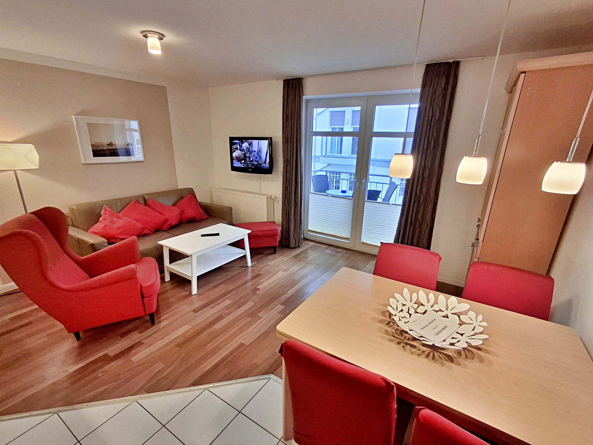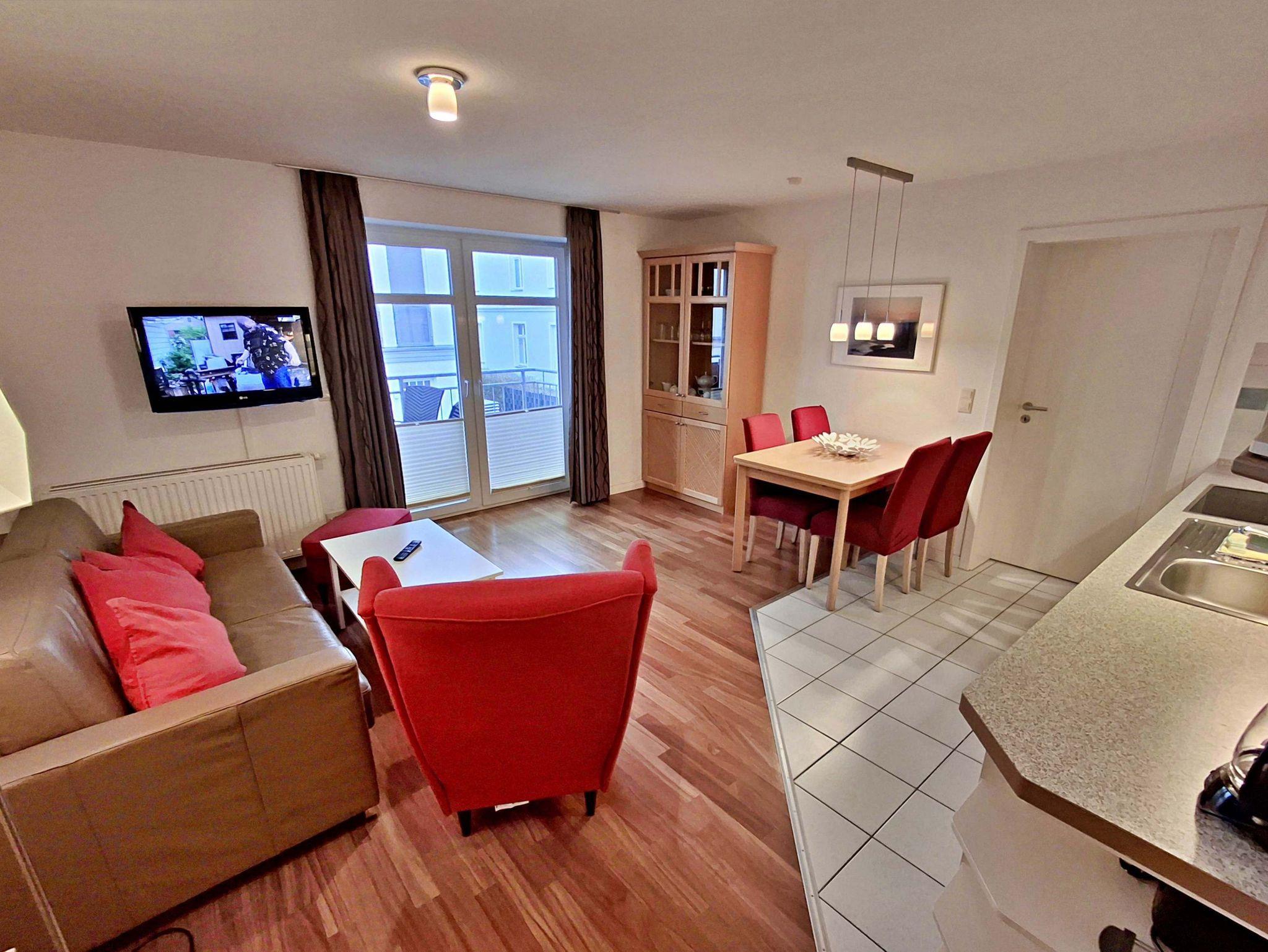 Die freundliche 3-Zimmer-Wohnung Silbermöwe in der 1. Etage mit Balkon für max. 4 Erwachsene und 1 Kind bis 14 Jahre befindet im Nebengebäude der stilvoll restaurierten Villa Ahlbeck - nur wenige Schritte von der Promenade und dem Strand entfernt. Im Wohnbereich befinden sich neben der gemütlichen Couch auch ein Sessel mit passendem Fußhocker sowie ein Essbereich Das Highlight der Wohnung ist der Balkon in Nord-Ost-Ausrichtung, wo Sie bei schönem Wetter bereits morgens Ihren Kaffee genießen oder den Abend bei einem Glas Wein ausklingen lassen können. Die moderne Küchenzeile mit Ceranherd, Backofen, Geschirrspüler, Mikrowelle, Kaffeemaschine, Wasserkocher und Toaster lässt keine Wünsche offen. Für die Unterhaltung sorgen ein Flachbild-TV, Radio-CD-Player und kostenfreies W-LAN. Die beiden Schlafzimmer verfügen jeweils über ein Doppelbett und hochwertigem Frame-TV. Das Badezimmer hat DU/WC.