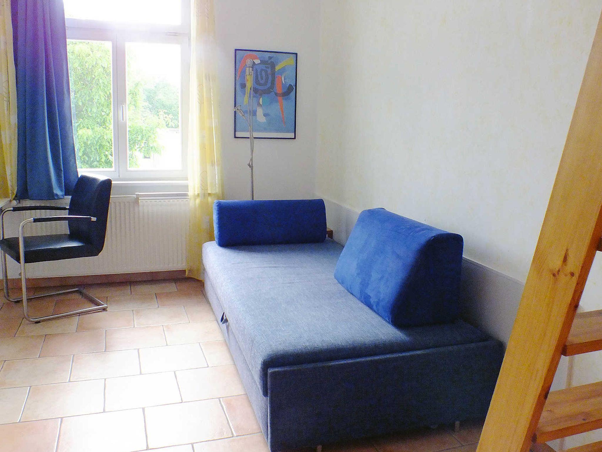 Das moderne 19 qm große vollständig geflieste 1-Raum-Appartement liegt im 1. OG und besteht aus einem kombinierten Wohn- und Schlafraum mit einem Kleiderschrank, einer Kommode, TV, Esstisch mit Stühlen, einem qualitativem Bali-Sofa-Bett mit einer Liegefläche 1,80 x 2,00 m sowie einem Hochbett mit einer Liegefläche von 1,00 x 2,00 m (Kopfhöhe ca. 1m). Komplettiert wird die Ausstattung durch eine Küchenzeile mit 2-Platten-Herd, Spüle, Kühlschrank, Kaffeemaschine, Toaster, Geschirr uvm. sowie einem Bad mit DU/WC.