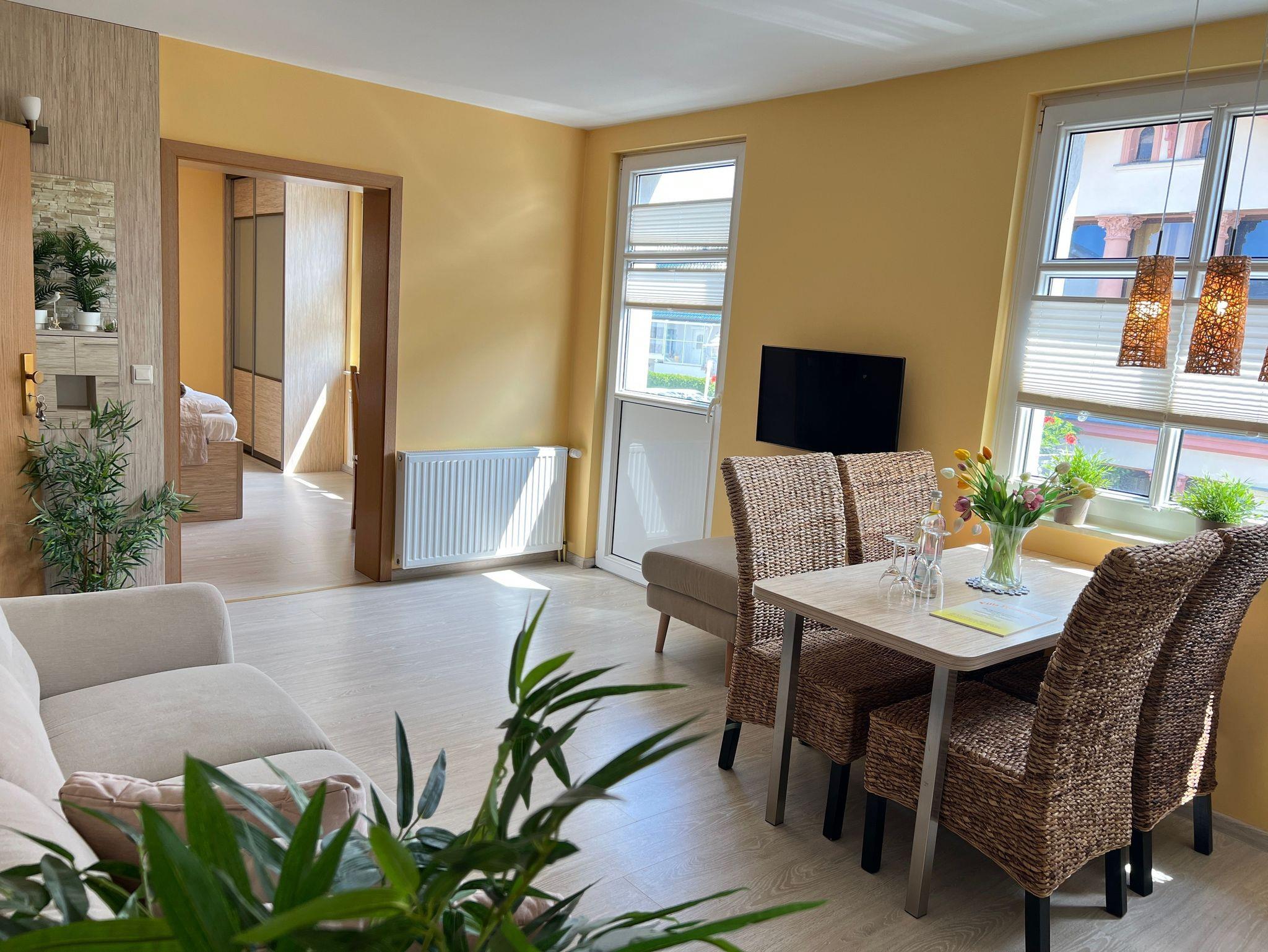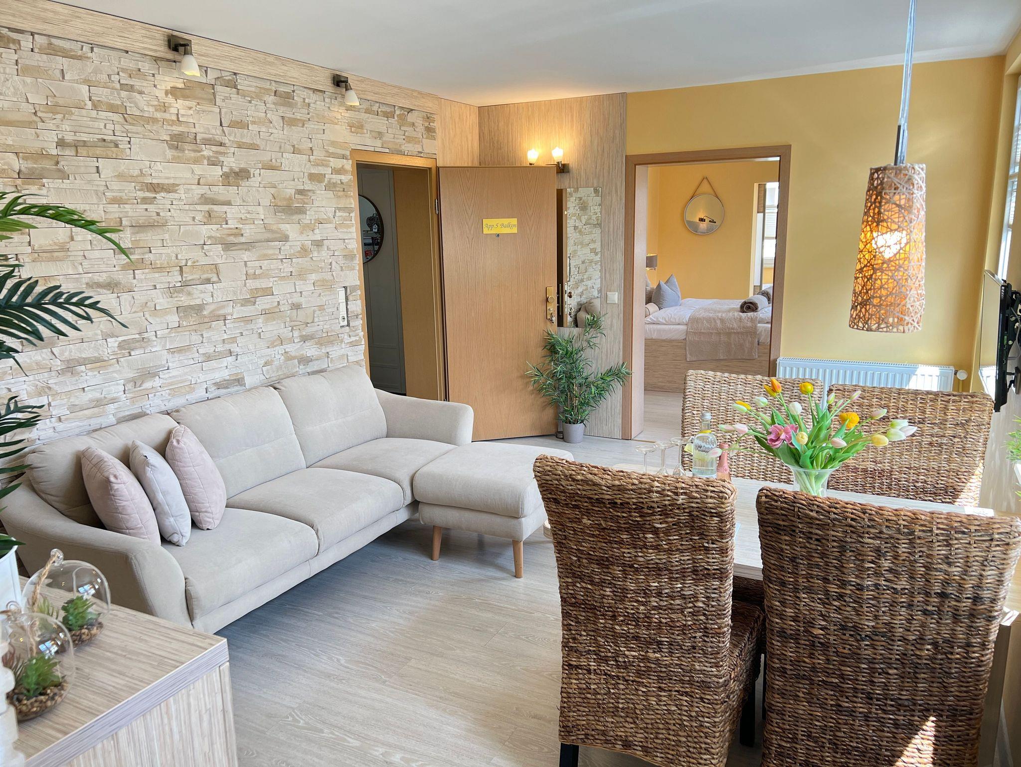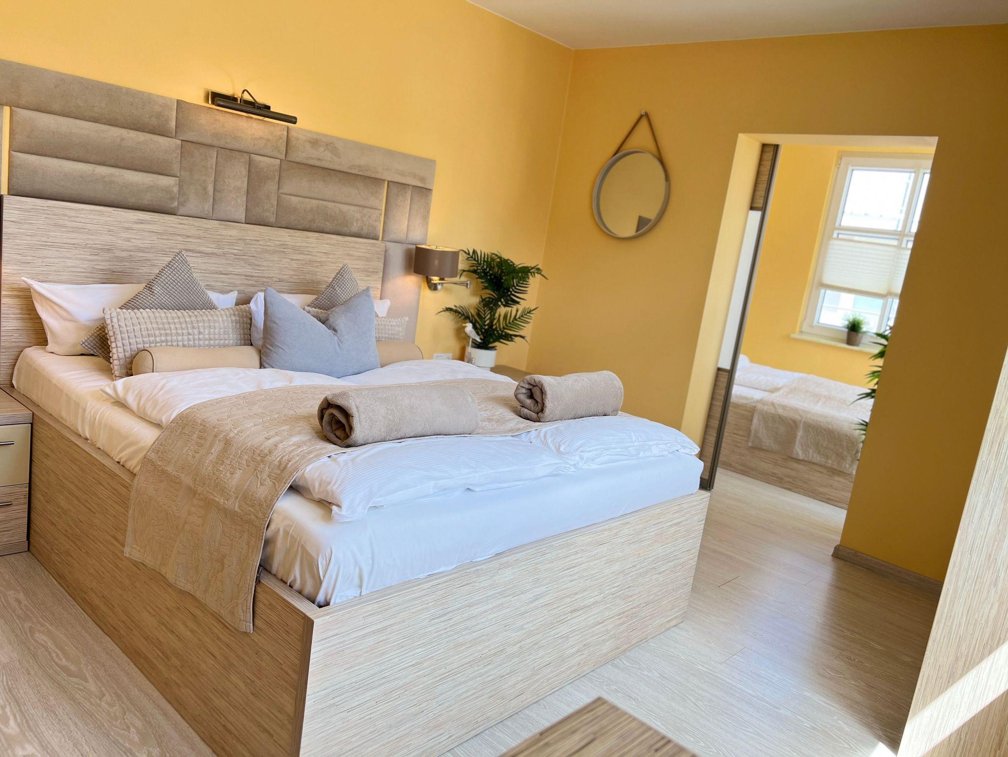 Die nur 80 Meter vom Strand entfernte Obergeschosswohnung mit Meerblick ist wundervoll lichtdurchflutet. Selbst ein kleiner Balkon lädt Sie zum Frühstücken oder auf ein Glas Wein abends ein. Viele Fenster mit speziell beschichteten Plissees sorgen für ein individuelles Raumklima. Ein großzügiger Schlafraum sowie ein zweites, separates Schlafzimmer dienen Familien mit ausreichend Platz. Zwei groß, extrahohe Betten (160cm und 140cm) und ein separater Wohnraum mit einem farblich abgestimmten Sofa lassen Ihrer Ruhe keine Wünsche offen. Eine moderne, grundausgestattete Einbauküche, LED-SMART-TV, HiFi-Anlage und Internetzugang lassen Sie bei uns alle Sorgen vergessen. Ihr Appartement ist so wohl Allergiker wie Nichtraucher freundlich. Weiße, kräftige Baumwollbettwäsche und weiche Handtücher werden Ihnen schmeicheln. Geschirrtücher und Duschvorleger sind vorhanden. Interessant für junge Familien sind die Unterbringungsmöglichkeiten mitgebrachten Eigentums (entweder im Haus Ihres Appartements Parterre oder im Fahrradschuppen). Auf dem Hof finden Sie Wäscheständer für Ihre nasse Wäsche. Ihrem Fahrzeug ist ein Parkplatz direkt am Ferienhaus reserviert. Für eventuell benötigte Hochstühle oder Kinderreisebetten entstehen Ihnen nach Rücksprache keine zusätzlichen Kosten. Bitte informieren Sie uns über Ihre Wünsche rechtzeitig.
