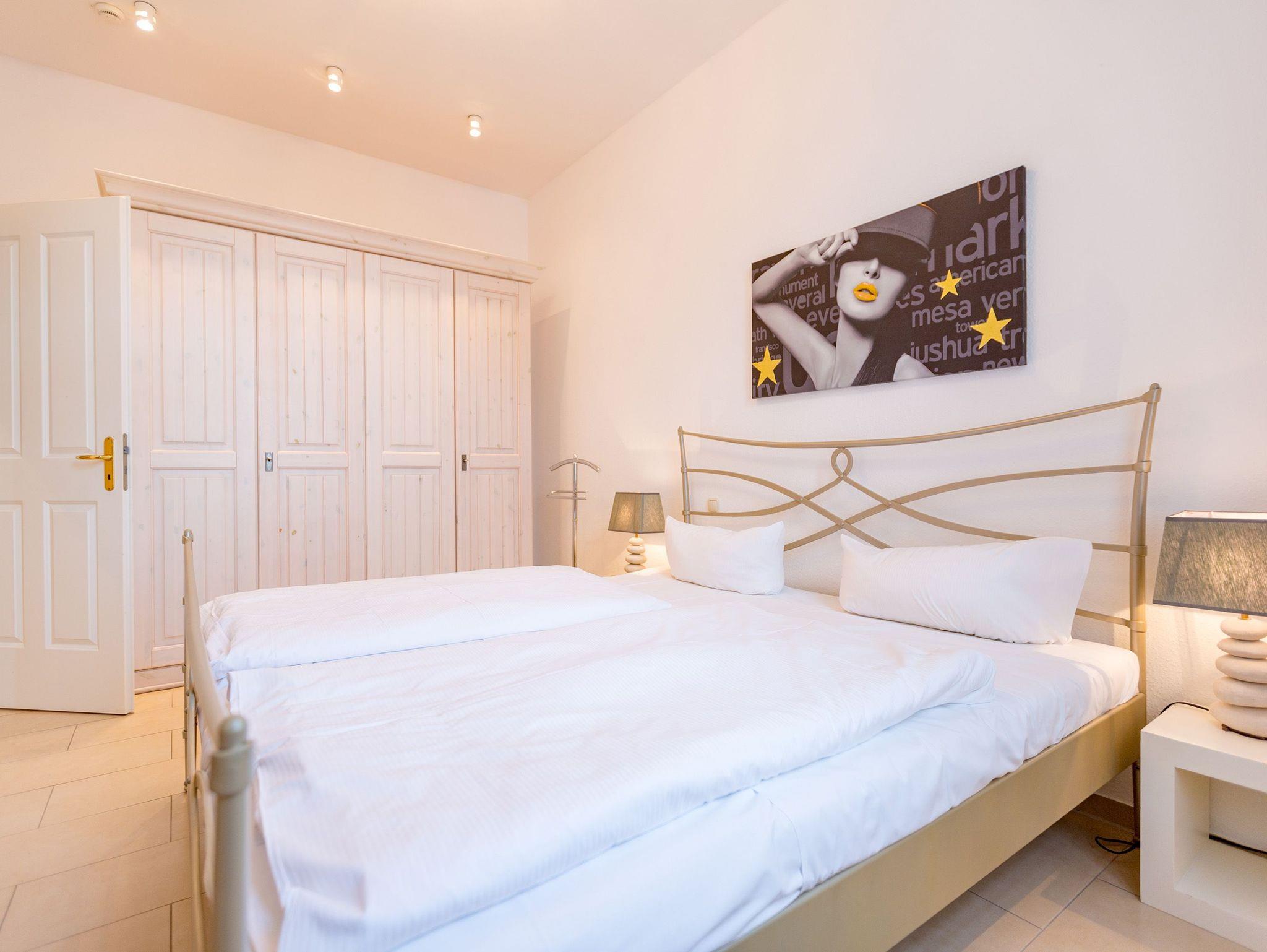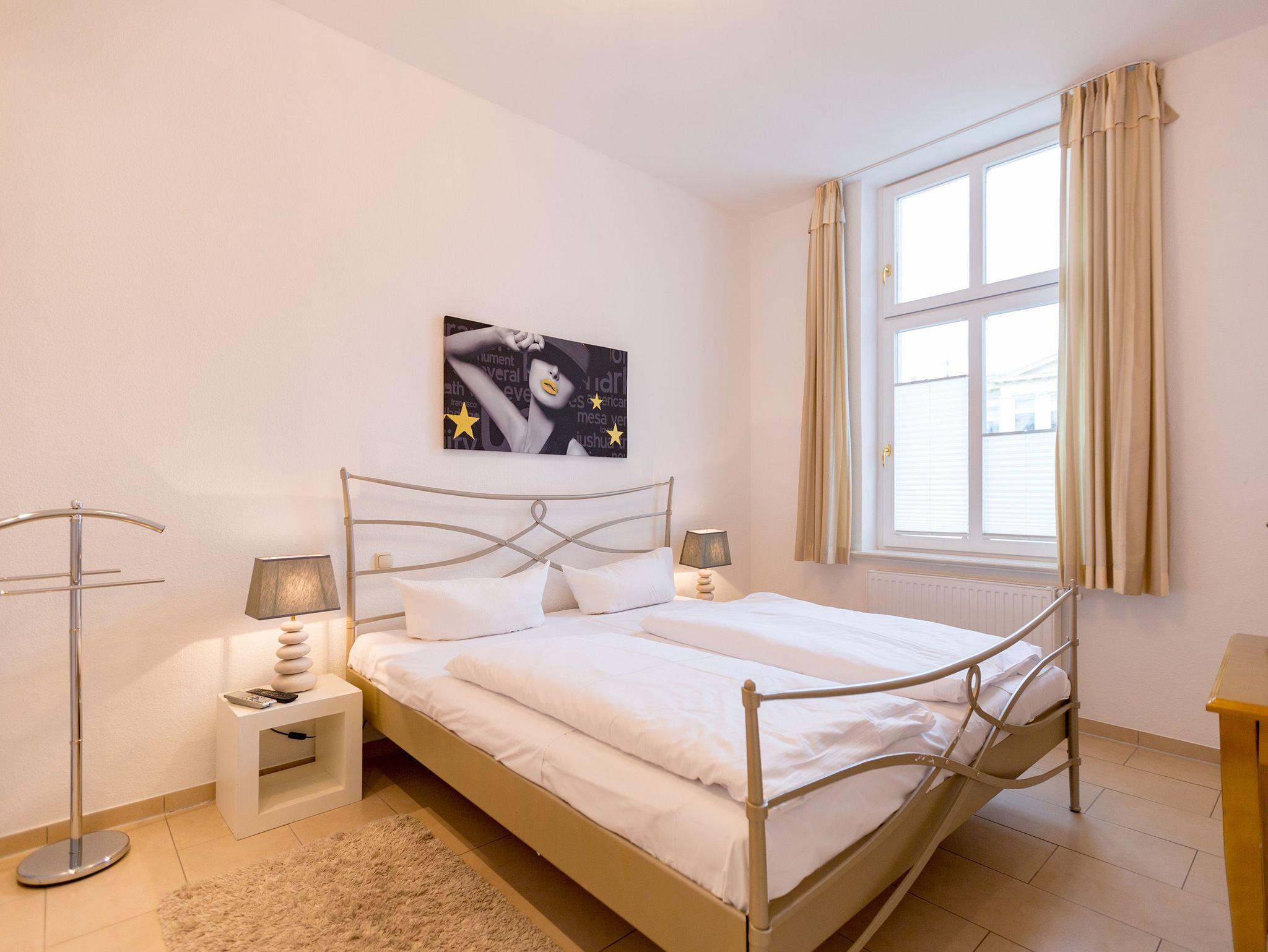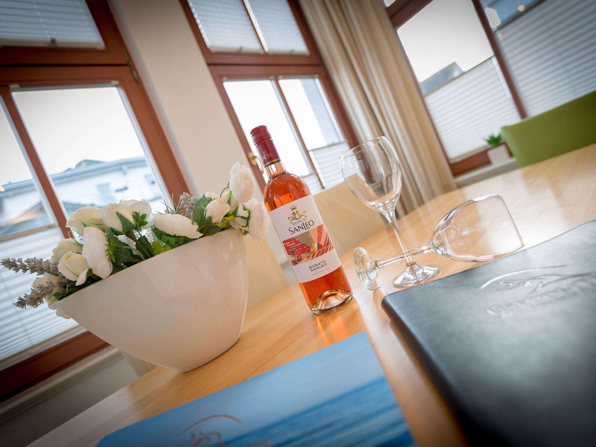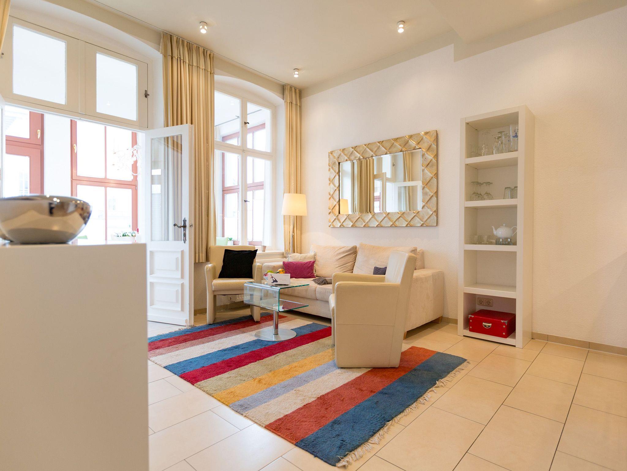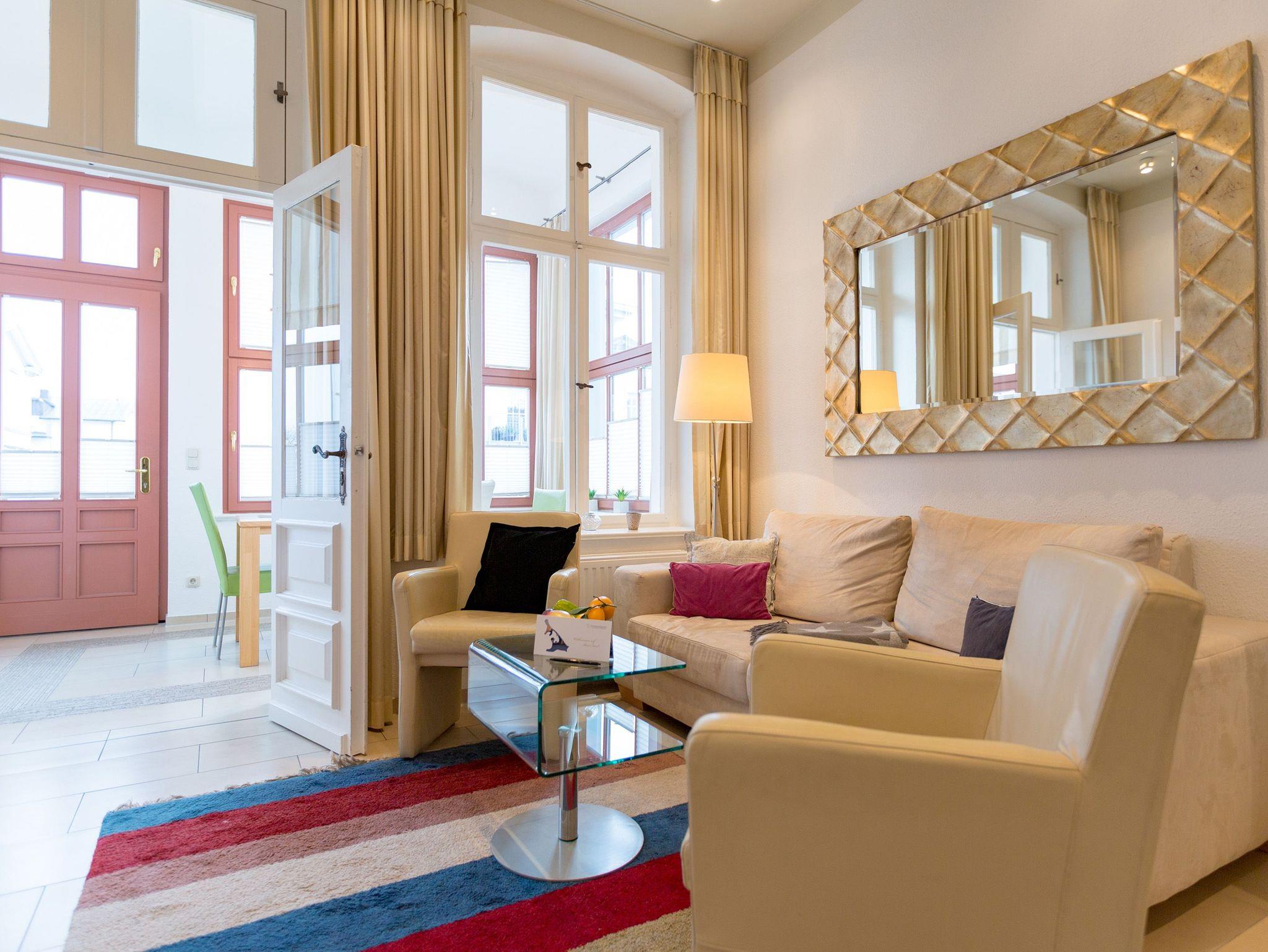 Modernes Ambiente in stilvoller Villa! Geschmackvolle Accessoires und helle Farben machen die 2-Raum-Ferienwohnung im Erdgeschoss des Autorenhauses zu einem perfekten Urlaubsdomizil für 2 - 4 Personen (davon 2 Kinder bis 15 Jahre). Der Wohnbereich mit Küchenzeile [&] Schlafcouch lädt zum Relaxen ein. Ihr Urlaubsfrühstück genießen Sie in der hellen, verglasten Loggia oder auf der schönen Terrasse. Das Schlafzimmer mit Doppelbett ( 1,80m x 2m) bietet zusätzlich Platz für ein Kinderreisebett. Das WLAN-Netz in der Wohnung kann kostenfrei genutzt werden. Am Haus steht ein PKW-Stellplatz zur Verfügung.