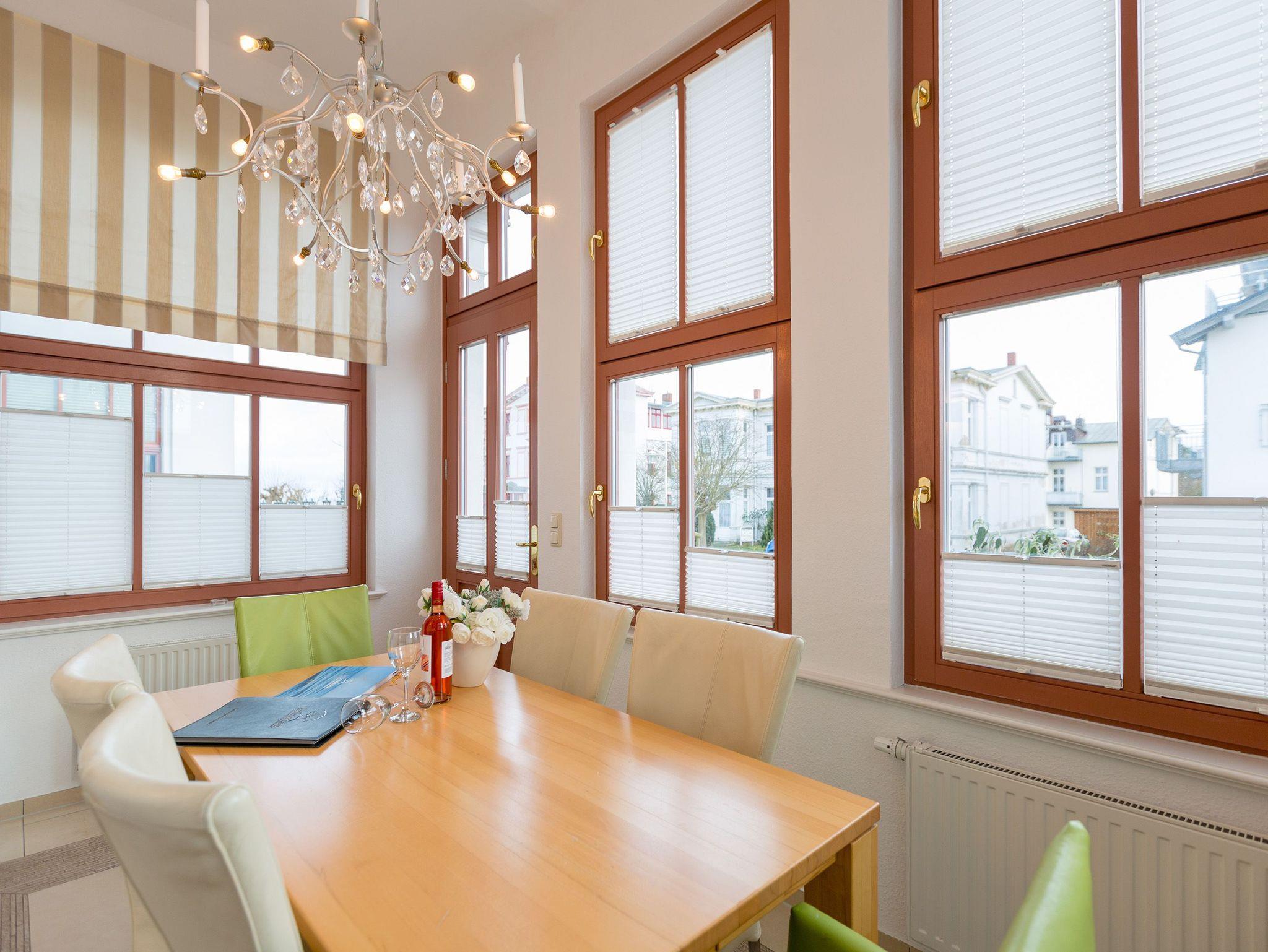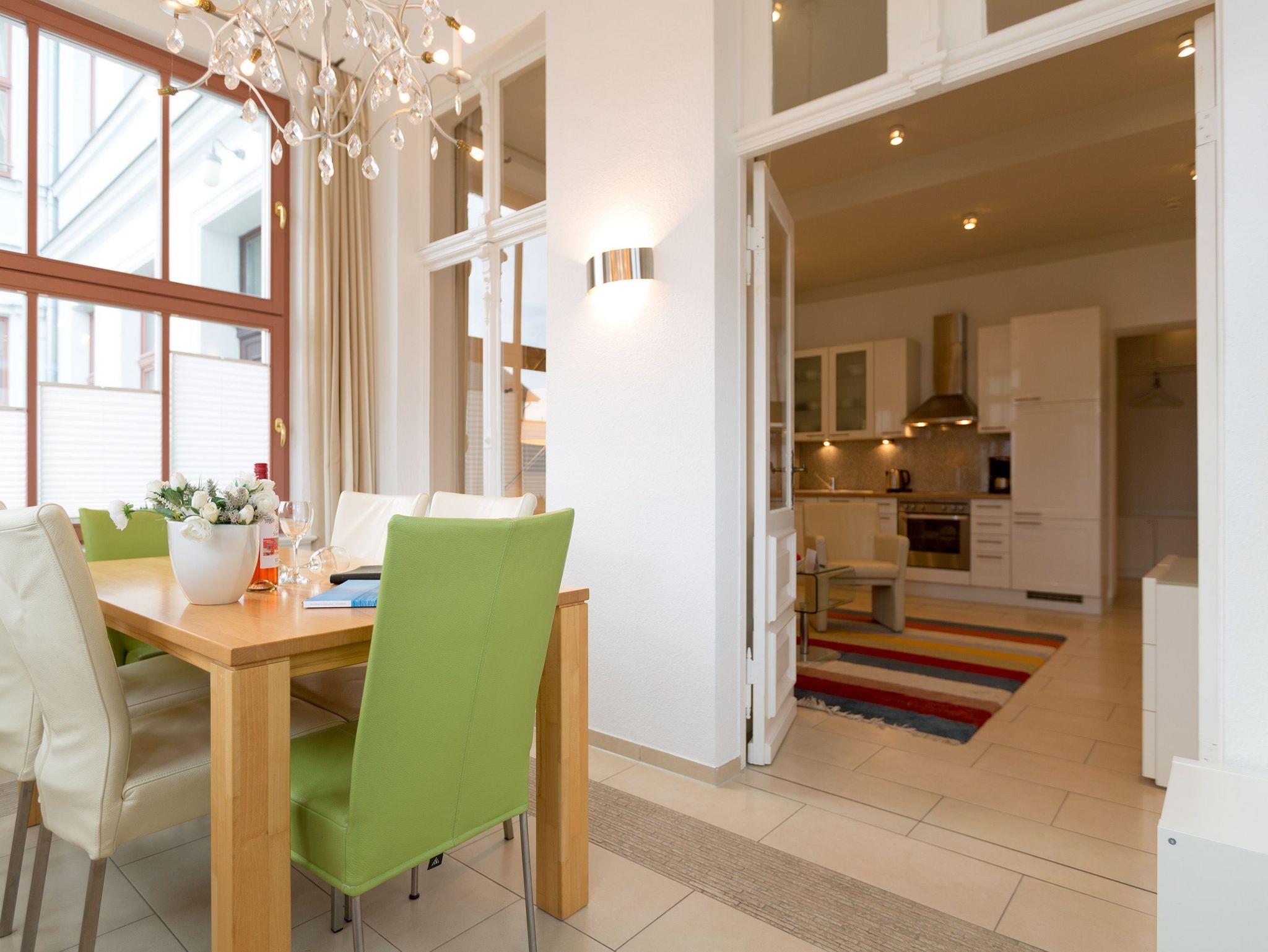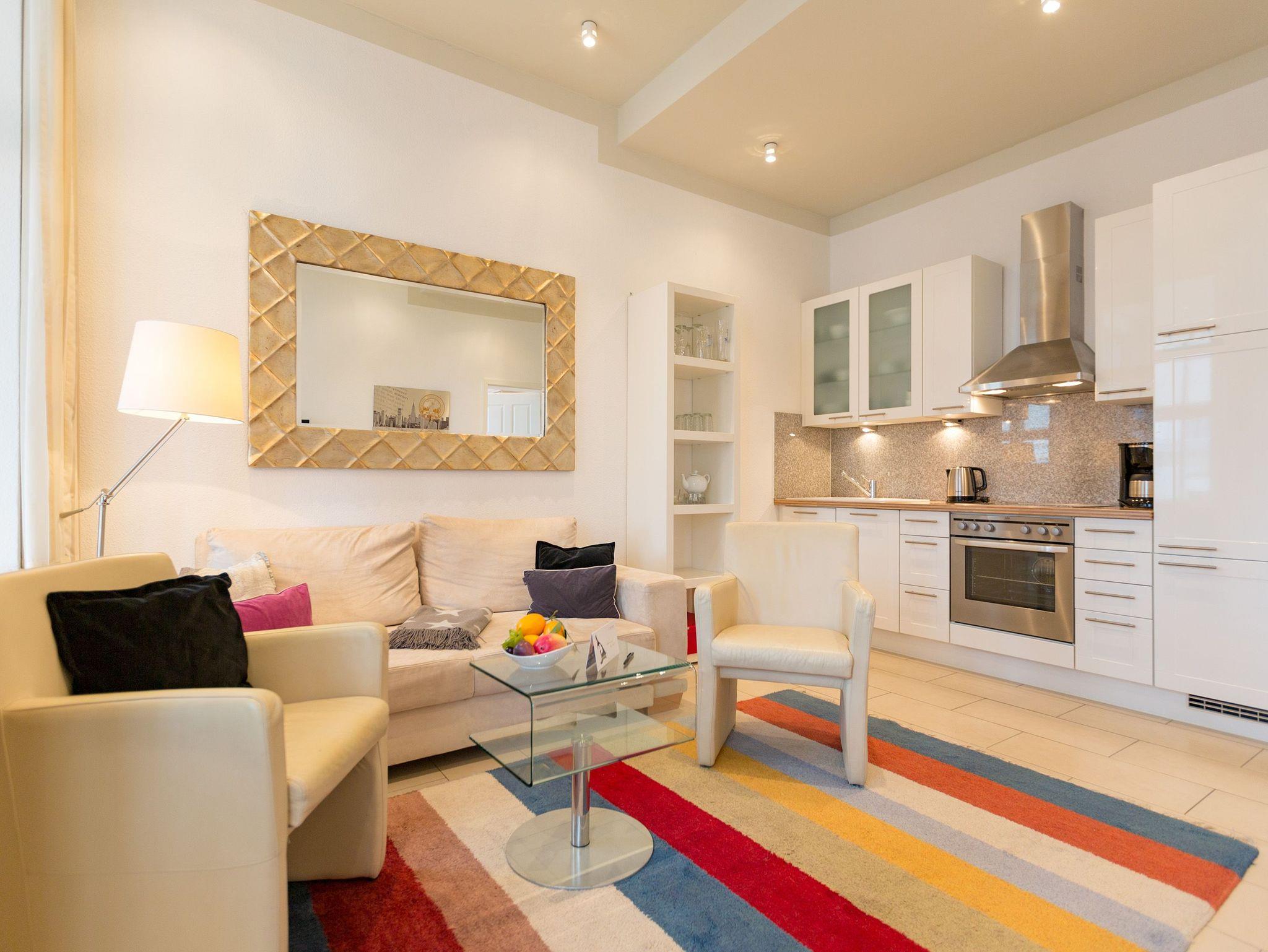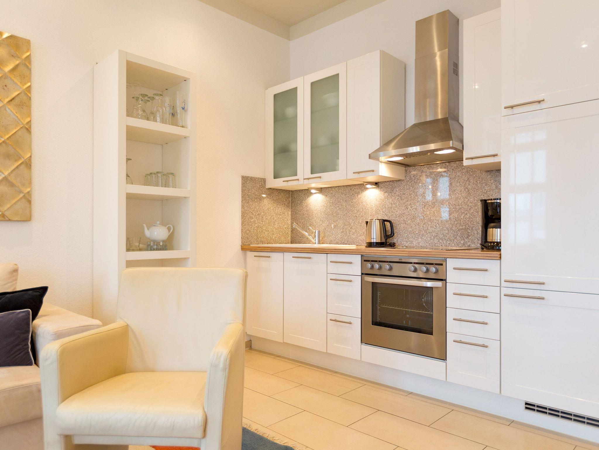 Modernes Ambiente in stilvoller Villa! Geschmackvolle Accessoires und helle Farben machen die 2-Raum-Ferienwohnung im Erdgeschoss des Autorenhauses zu einem perfekten Urlaubsdomizil für 2 - 4 Personen (davon 2 Kinder bis 15 Jahre). Der Wohnbereich mit Küchenzeile [&] Schlafcouch lädt zum Relaxen ein. Ihr Urlaubsfrühstück genießen Sie in der hellen, verglasten Loggia oder auf der schönen Terrasse. Das Schlafzimmer mit Doppelbett ( 1,80m x 2m) bietet zusätzlich Platz für ein Kinderreisebett. Das WLAN-Netz in der Wohnung kann kostenfrei genutzt werden. Am Haus steht ein PKW-Stellplatz zur Verfügung.