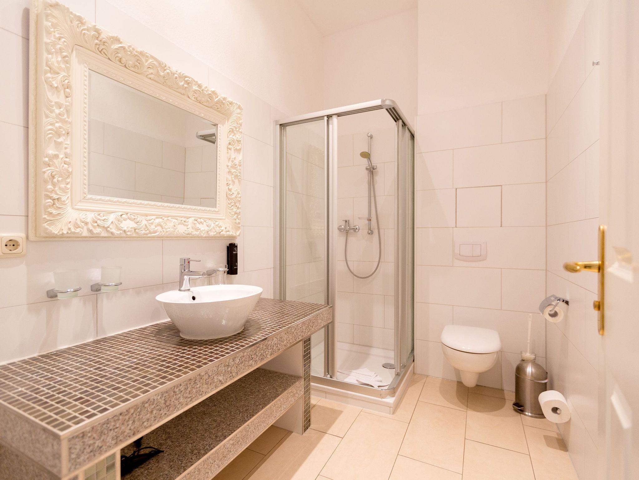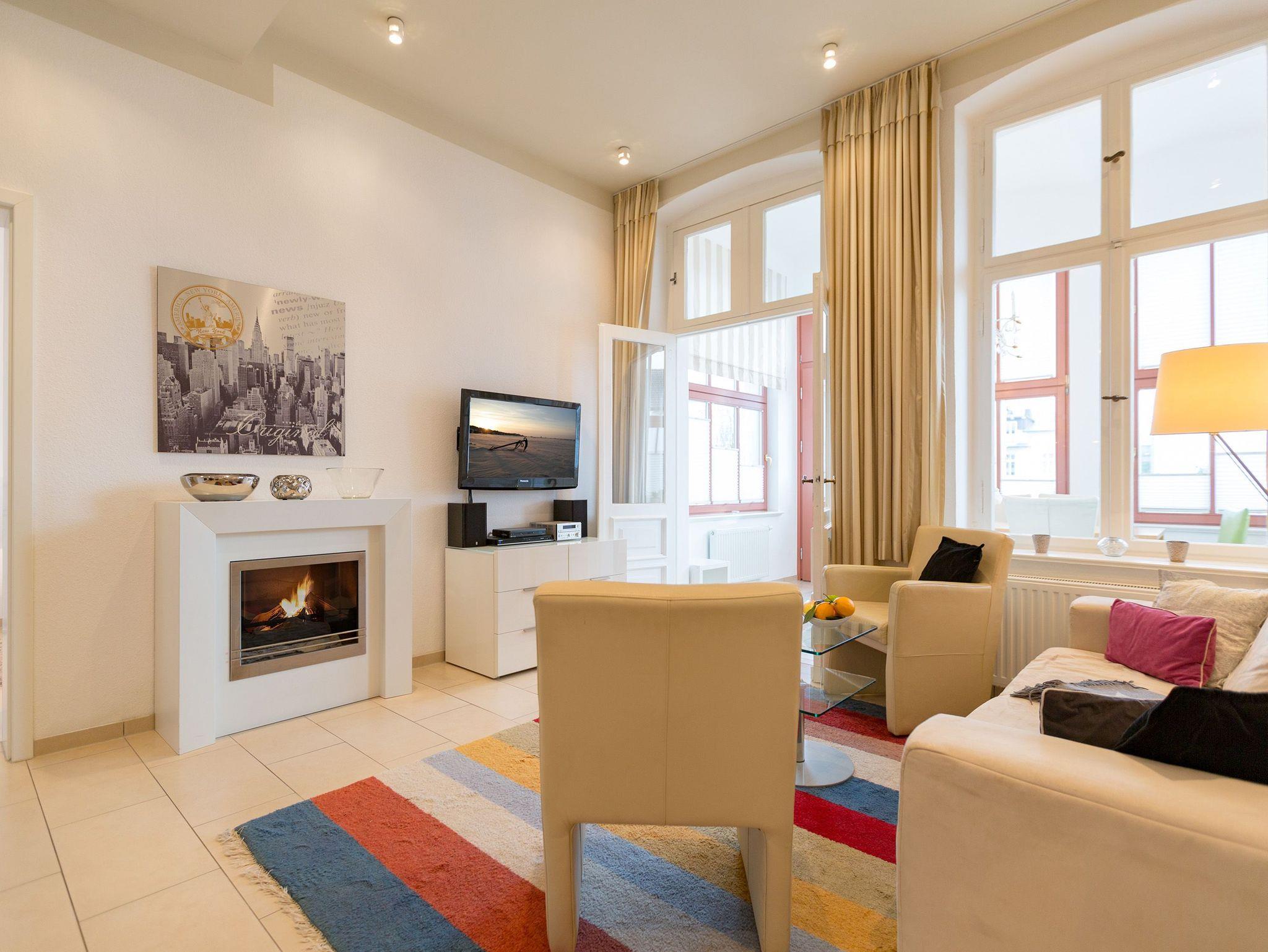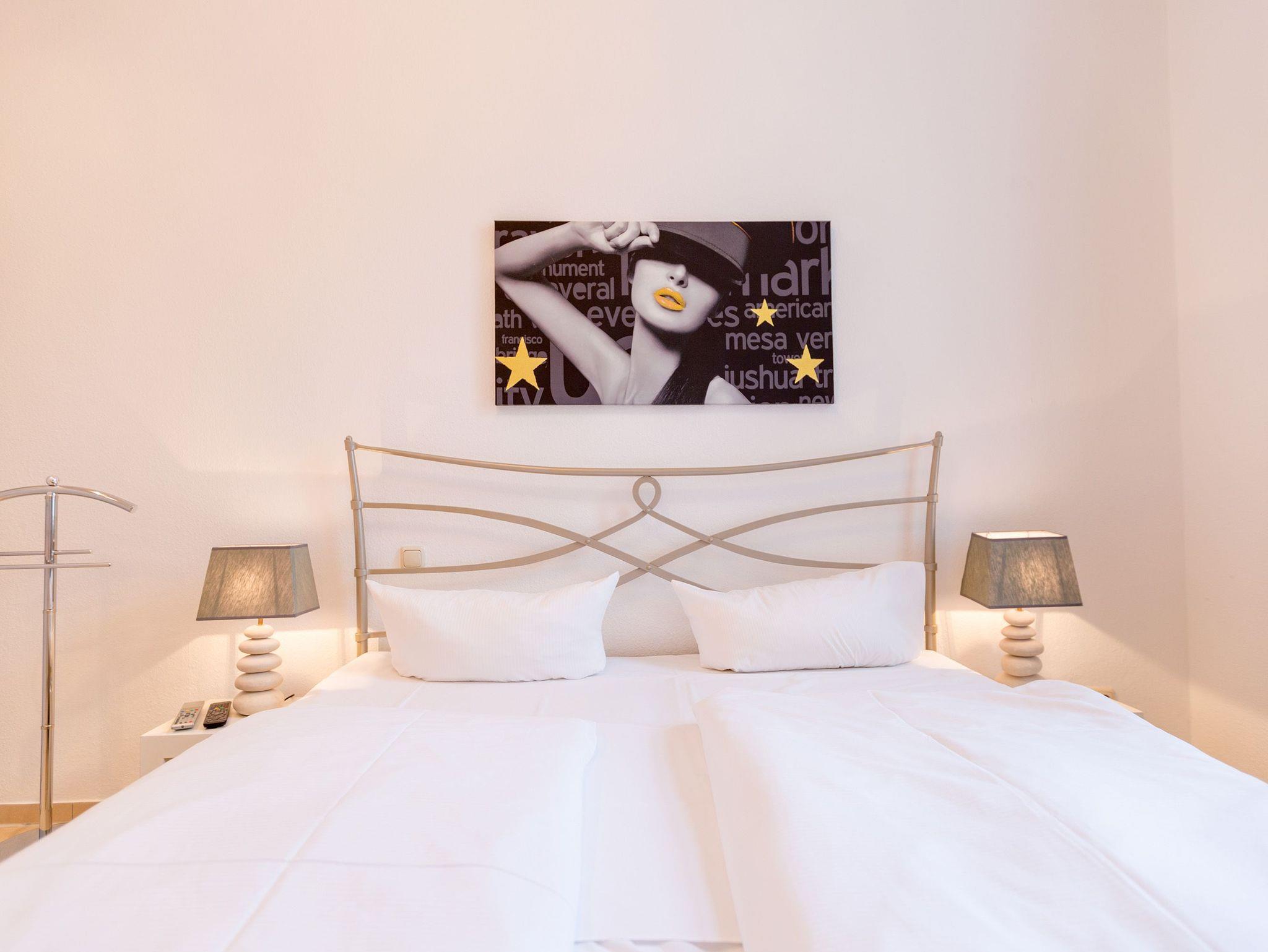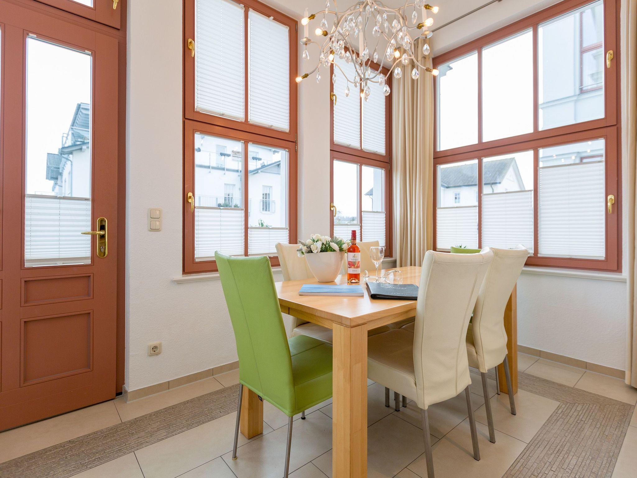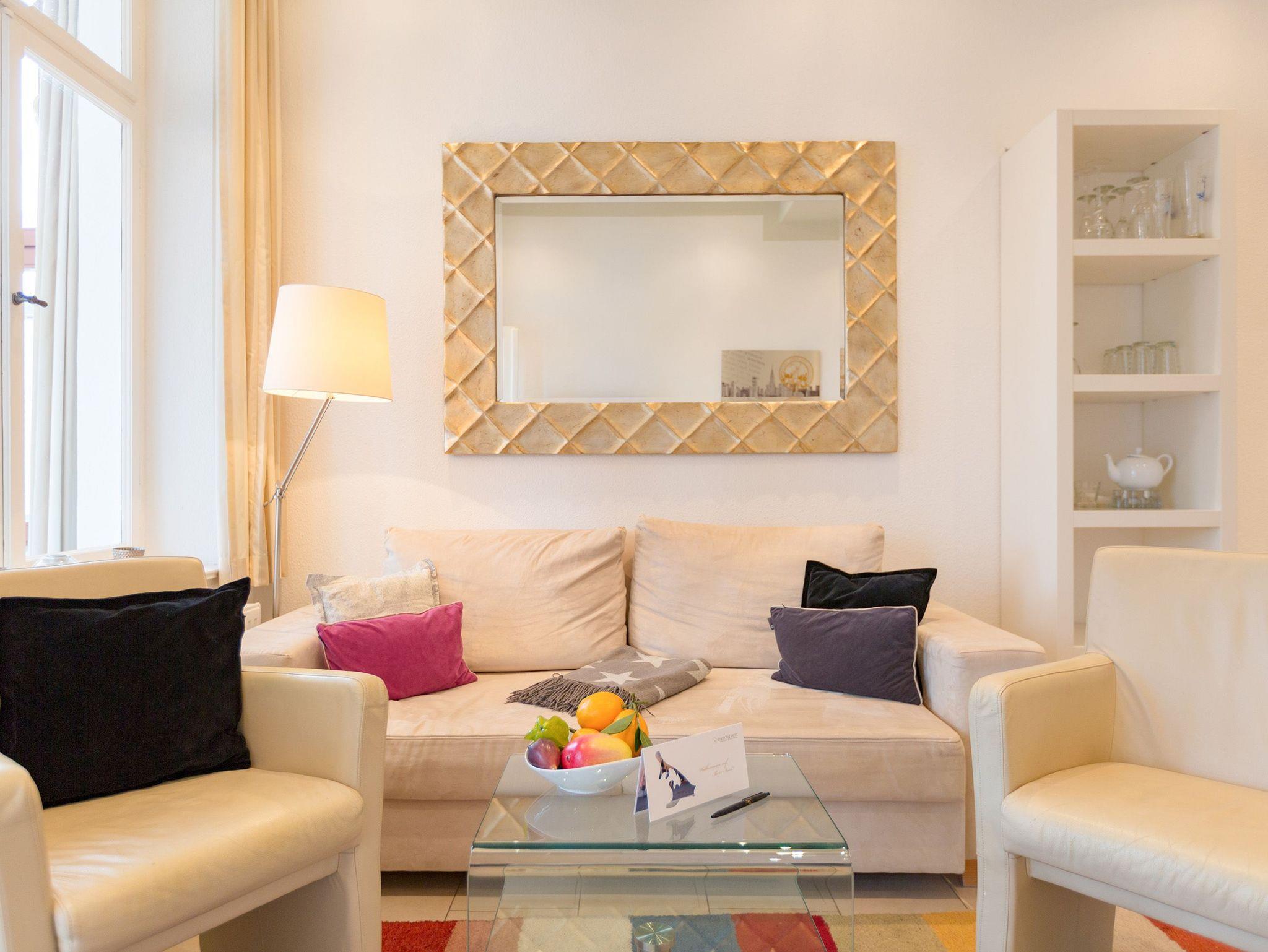 Modernes Ambiente in stilvoller Villa! Geschmackvolle Accessoires und helle Farben machen die 2-Raum-Ferienwohnung im Erdgeschoss des Autorenhauses zu einem perfekten Urlaubsdomizil für 2 - 4 Personen (davon 2 Kinder bis 15 Jahre). Der Wohnbereich mit Küchenzeile [&] Schlafcouch lädt zum Relaxen ein. Ihr Urlaubsfrühstück genießen Sie in der hellen, verglasten Loggia oder auf der schönen Terrasse. Das Schlafzimmer mit Doppelbett ( 1,80m x 2m) bietet zusätzlich Platz für ein Kinderreisebett. Das WLAN-Netz in der Wohnung kann kostenfrei genutzt werden. Am Haus steht ein PKW-Stellplatz zur Verfügung.