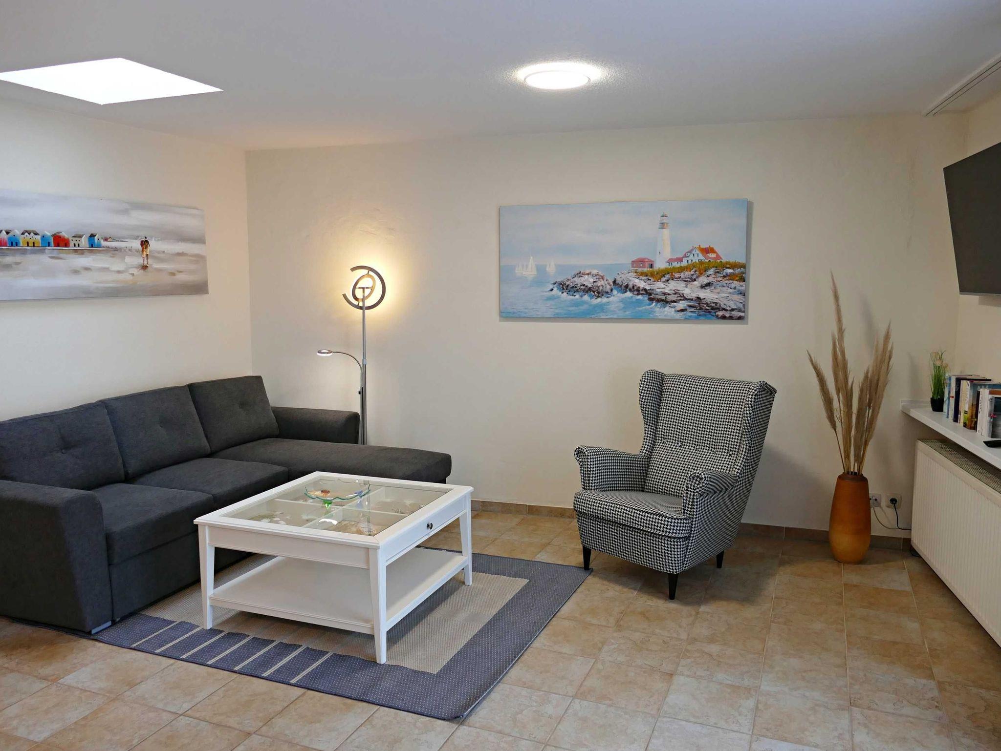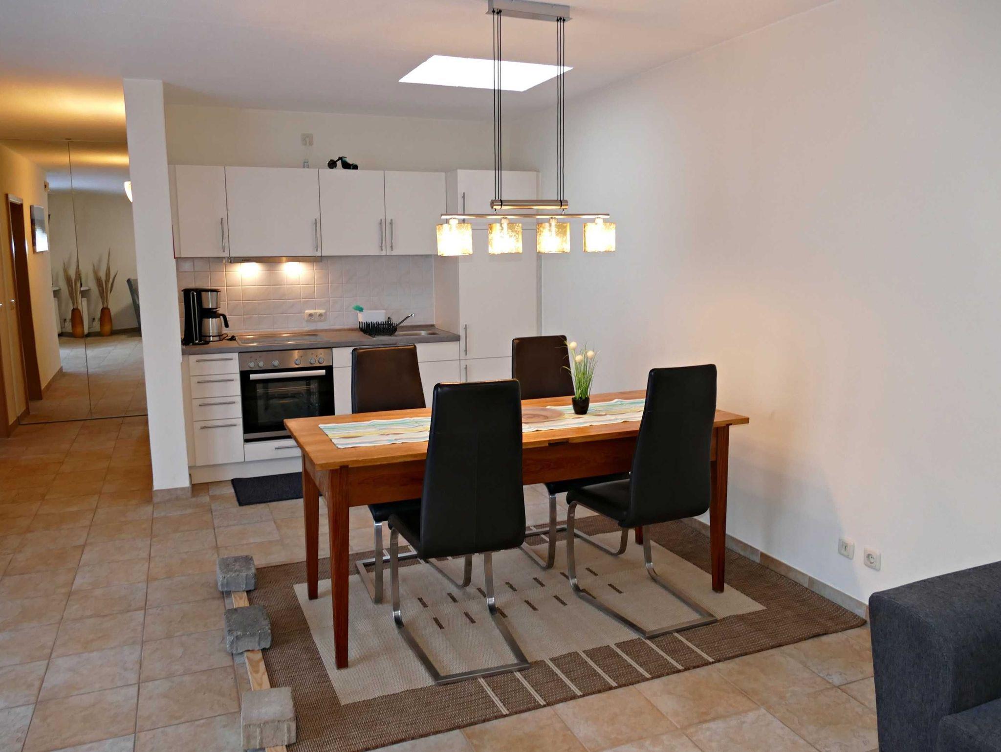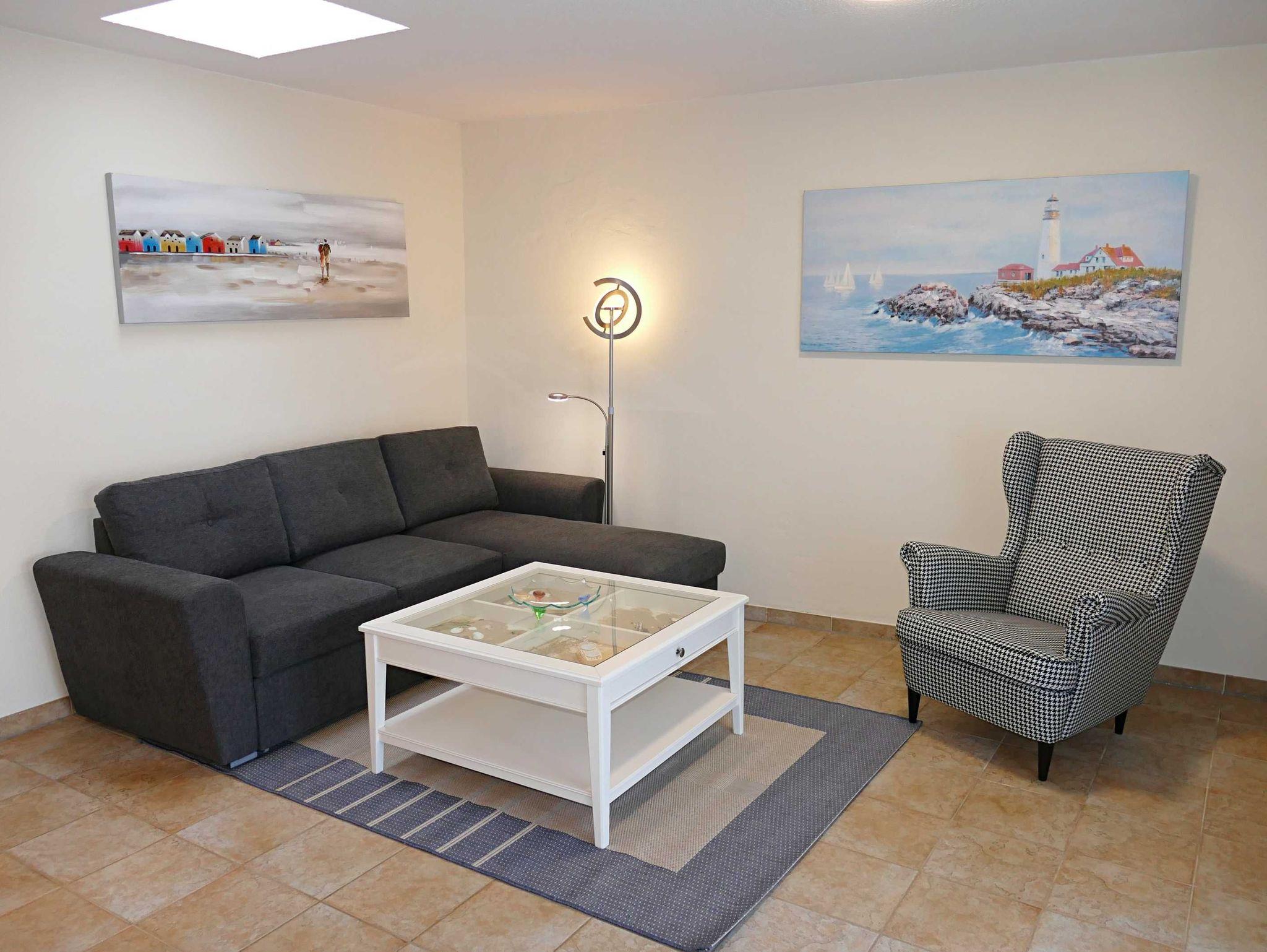 Diese moderne 60qm große 2-Raum-Ferienwohnung im Erdgeschoss verfügt über einen großzügigen kombinieren Wohn- und Schlafraum mit Sofa (Schlafsofa für bis zu zwei Personen), Ohrensessel, Kabel-TV und Radio, einen Essplatz für vier Personen, eine Küchenzeile mit Ceranherd, Backofen, Kühlschrank mit Gefriermöglichkeit, Spülmaschine, Kaffeemaschine, Toaster, Mikrowelle und Geschirr. Das Schlafzimmer ist mit einem Doppelbett, Kleiderschrank und Ablagemöglichkeiten ausgestattet. Die zur Wohnung gehörende Terrasse mit Sitzmöbeln lädt zum Verweilen ein. Hier können Sie bei herrlichstem Wetter das Frühstück genießen oder den Abend bei einem Glas Wein ausklingen lassen.