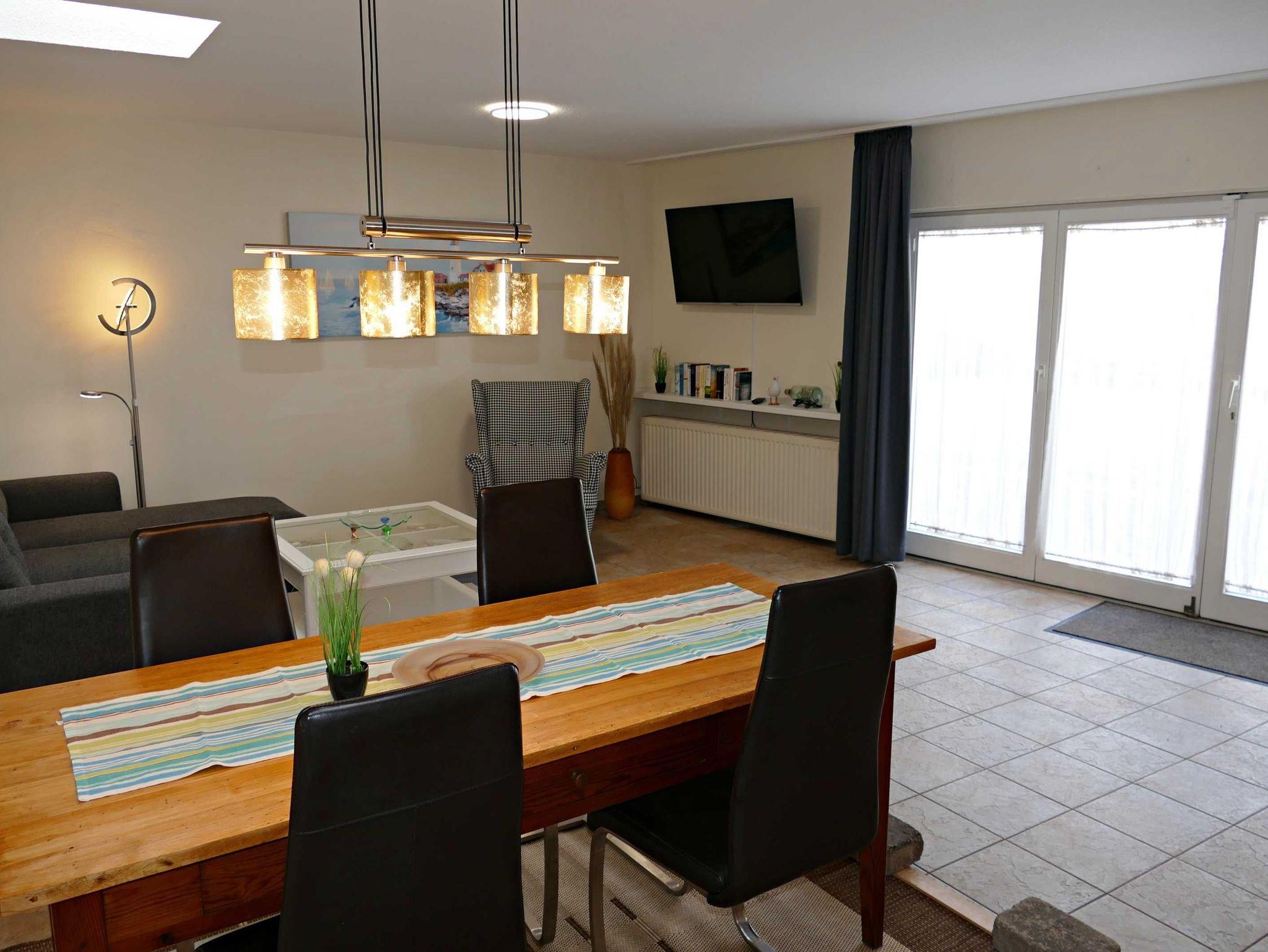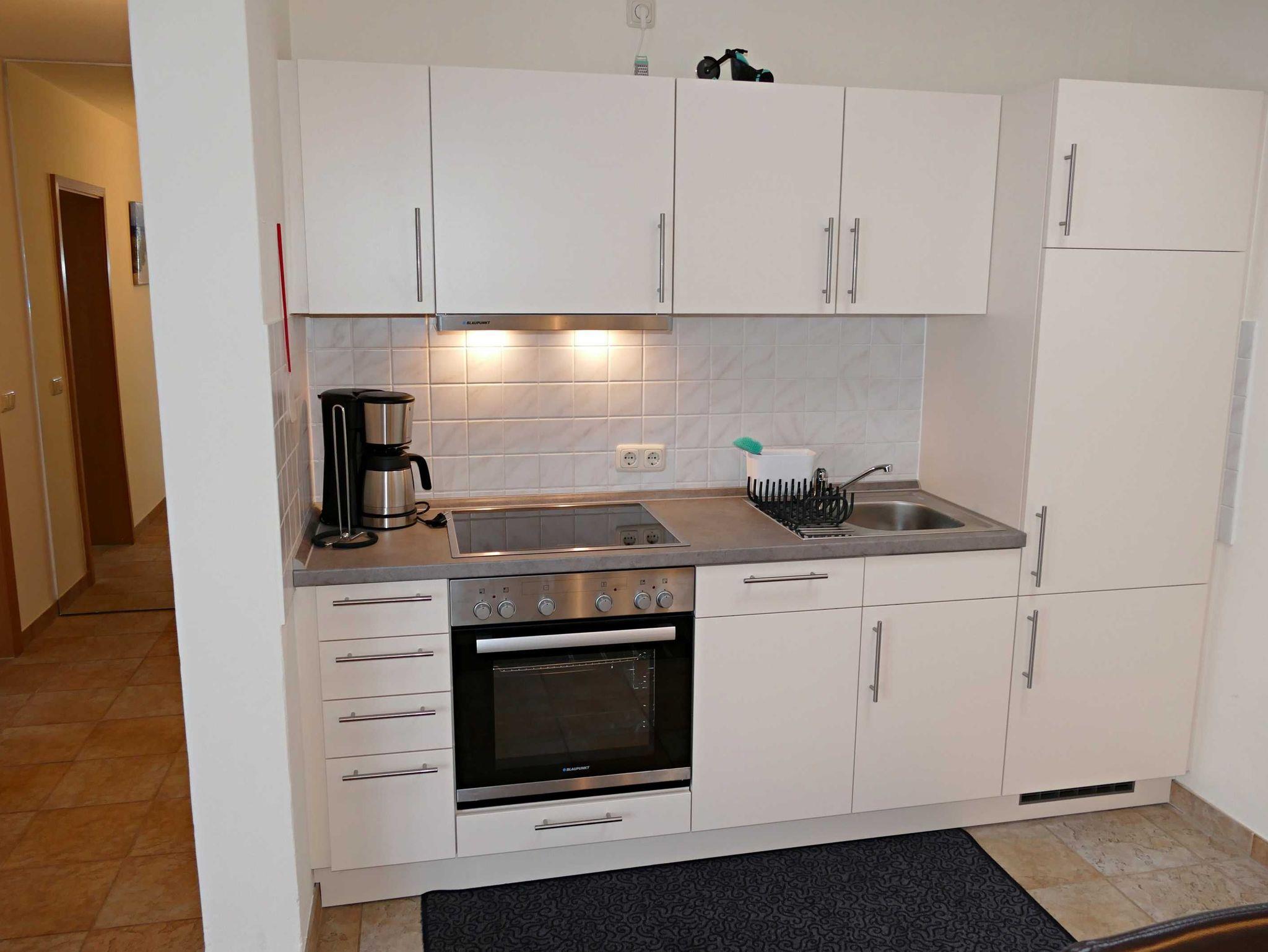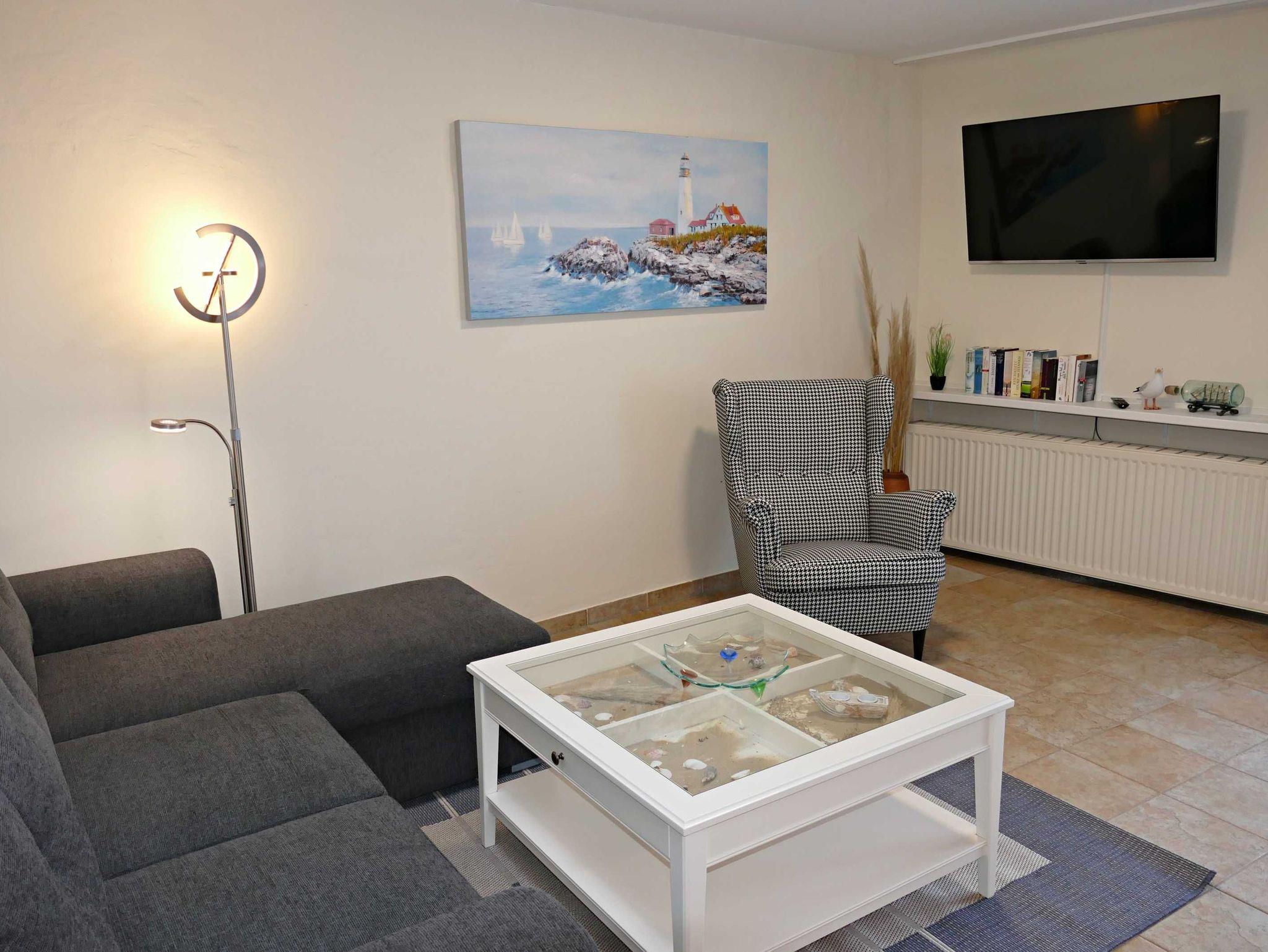 Diese moderne 60qm große 2-Raum-Ferienwohnung im Erdgeschoss verfügt über einen großzügigen kombinieren Wohn- und Schlafraum mit Sofa (Schlafsofa für bis zu zwei Personen), Ohrensessel, Kabel-TV und Radio, einen Essplatz für vier Personen, eine Küchenzeile mit Ceranherd, Backofen, Kühlschrank mit Gefriermöglichkeit, Spülmaschine, Kaffeemaschine, Toaster, Mikrowelle und Geschirr. Das Schlafzimmer ist mit einem Doppelbett, Kleiderschrank und Ablagemöglichkeiten ausgestattet. Die zur Wohnung gehörende Terrasse mit Sitzmöbeln lädt zum Verweilen ein. Hier können Sie bei herrlichstem Wetter das Frühstück genießen oder den Abend bei einem Glas Wein ausklingen lassen.