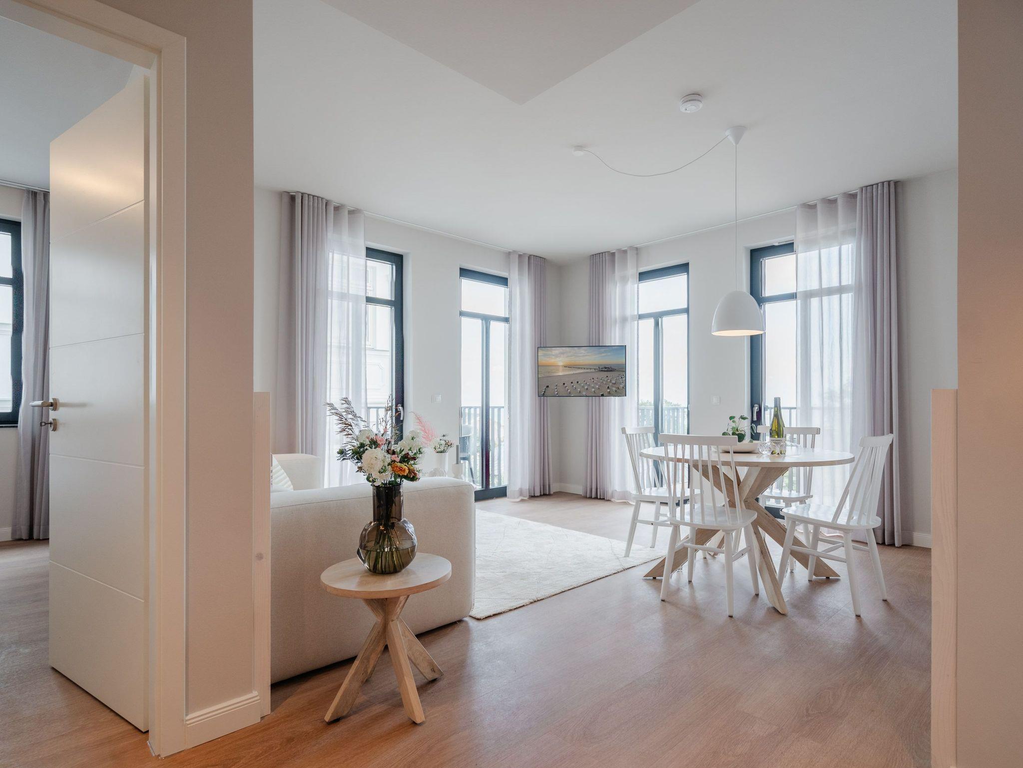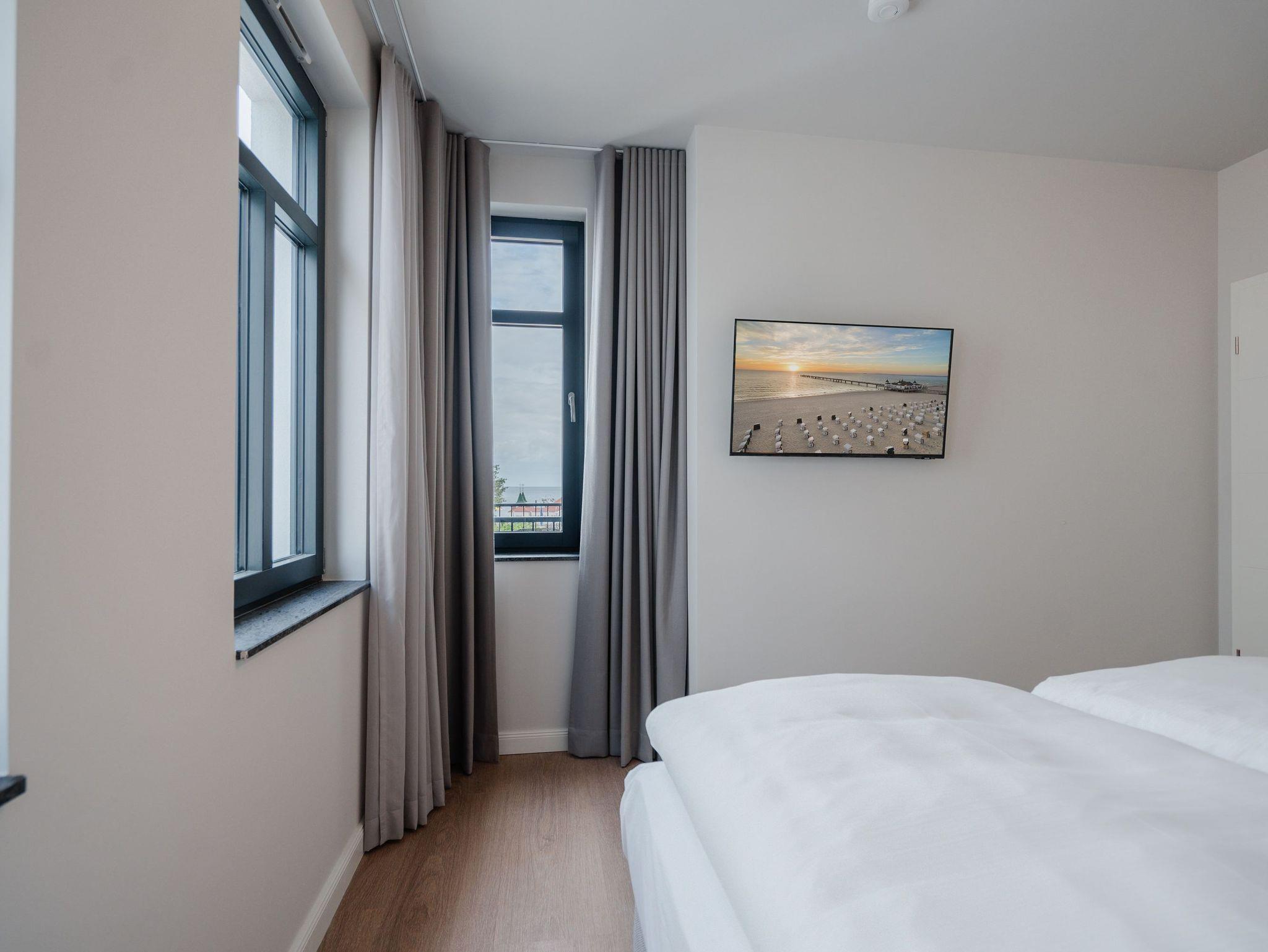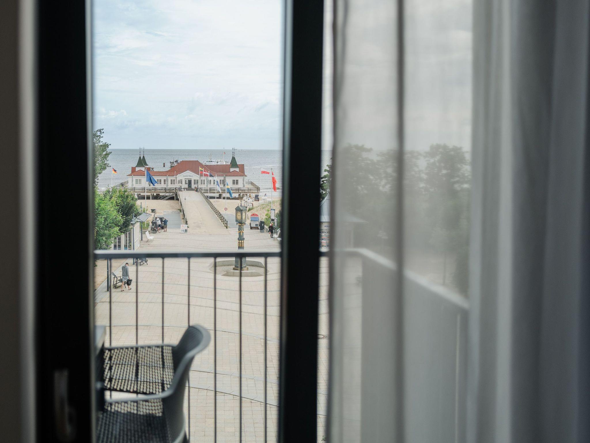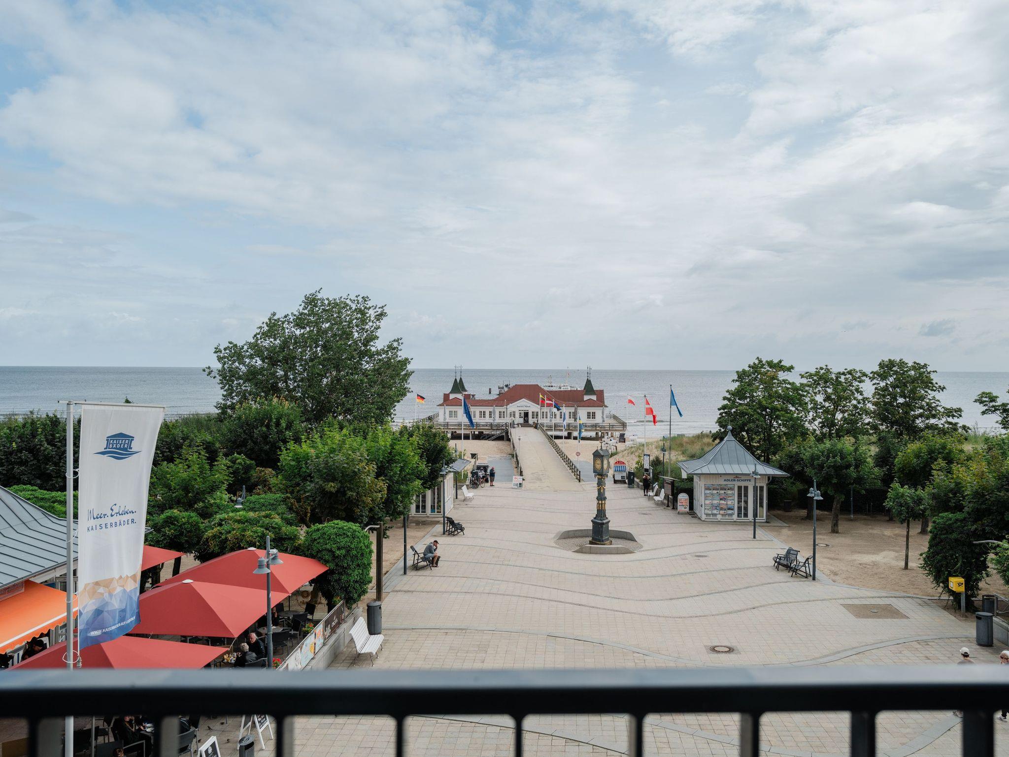 Willkommen in der Strandterrasse (Haus A) und in unserem wundervollen 2-Raum-Appartement A2.3 für zwei Personen im zweiten Obergeschoss. In diesem Appartement wird Ihr Urlaub zu einem ganz besonderen Auszeiterlebnis, denn mehr Meer geht nicht. Vis-à-vis der Ahlbecker Seebrücke können Sie sich aus den beiden Räumen dieses 57 Quadratmeter großen Appartements an der Ostsee gar nicht satt sehen. Ob morgens, wenn die Sonne aus der glitzernden Wasseroberfläche aufsteigt oder nachmittags mit Schäfchenwolken über dem endlosen Blau oder abends, wenn sich der Himmel rosarot einfärbt; ob bei Sonnenschein oder stürmischem Wellengang ? die Tage in dieser mit viel Liebe und einem Händchen für Farben und Formen eingerichteten Unterkunft werden unvergesslich schön. Neben dem Meerblick, den Sie gleich von zwei Balkonen aus (mit Ausrichtung Nord-Ost und Nord-West) genießen können, hat das Appartement eine wundervolle Einrichtung zu bieten, die mit allem erdenklichen Komfort aufwartet. Der offene Wohn- und Essbereich ist zur Seeseite hin ausgerichtet und bietet sowohl beim Essen als auch von der gemütlichen Couch aus, einen atemberaubenden Blick auf die Ahlbecker Seebrücke. Die voll ausgestattete Küchenzeile mit hochwertigen Siemens-Elektrogeräten, darunter ein Backofen, eine Spülmaschine und ein 3-Zonen-Induktionsherd, ist ein Garant für ein entspanntes Kochen. Der 50-Zoll-Flachbildfernseher ist internetfähig und bietet spannende Unterhaltung an kuscheligen Tagen und Abenden. Das Schlafzimmer ist mit einem komfortablen Boxspringdoppelbett (1,80m x 2,00m) und einem großen Kleiderschrank ausgestattet. Auch hier befindet sich ein 43-Zoll-Flachbildfernseher. Dusche, WC, Waschtisch und sogar eine Infrarotsauna zum Entspannen und Abschalten ? das innenliegende Bad ist Ihre ganz persönliche Wellnessoase. Ihr Auto können Sie auf dem zur Wohnung gehörenden PKW-Stellplatz in der Tiefgarage parken. So dass Sie nur noch anzukommen brauchen und der Urlaub mit Meerblick kann beginnen.