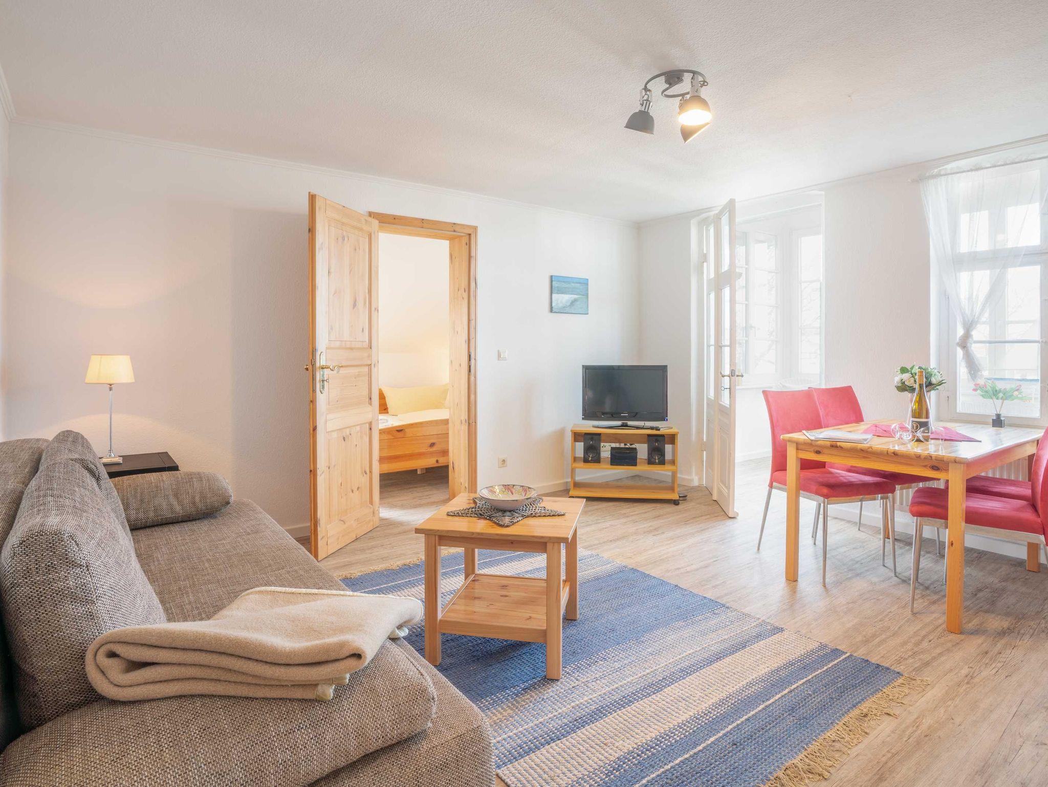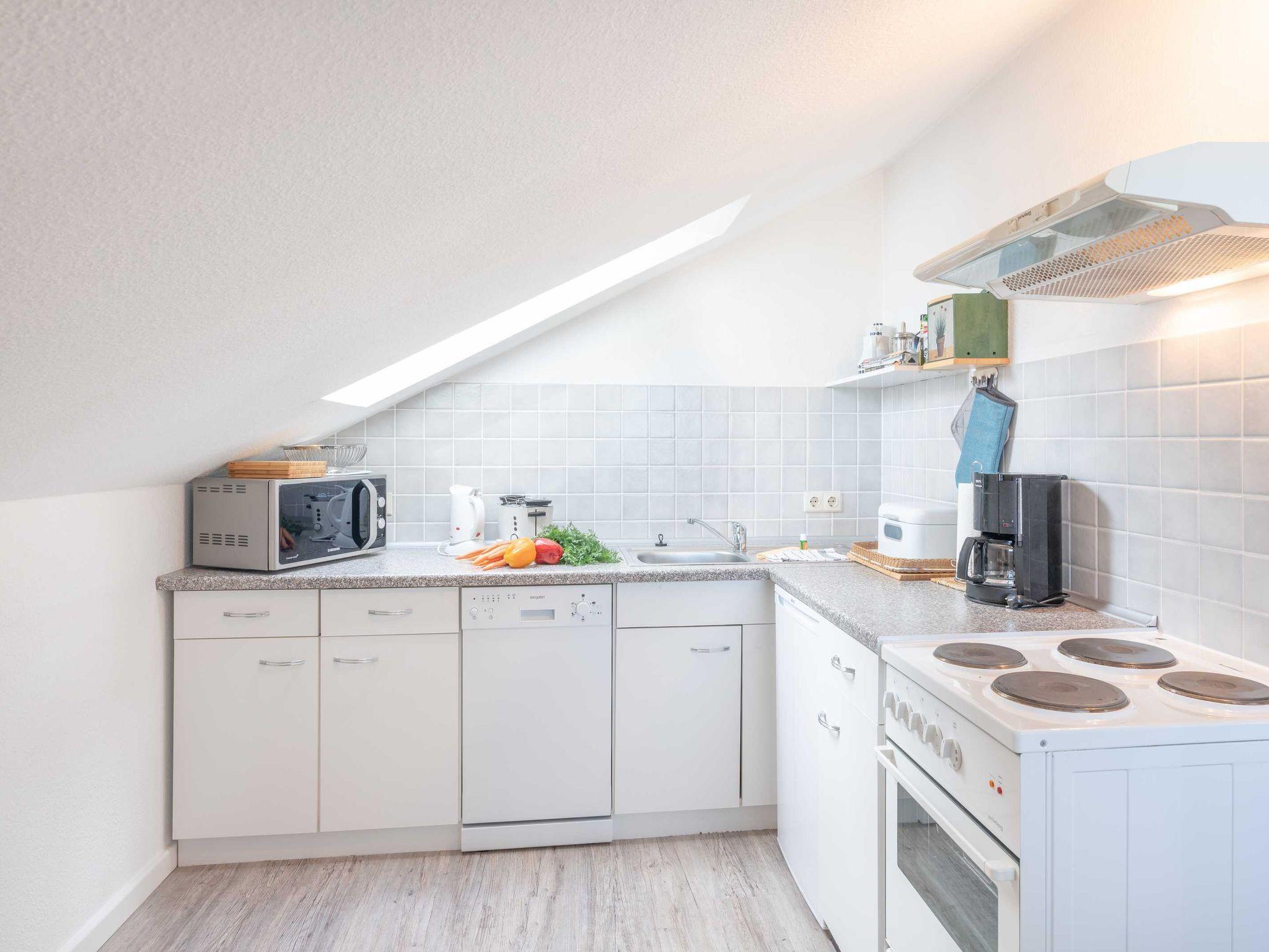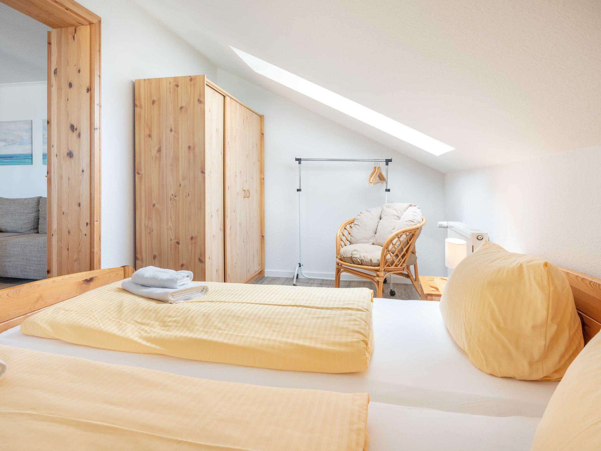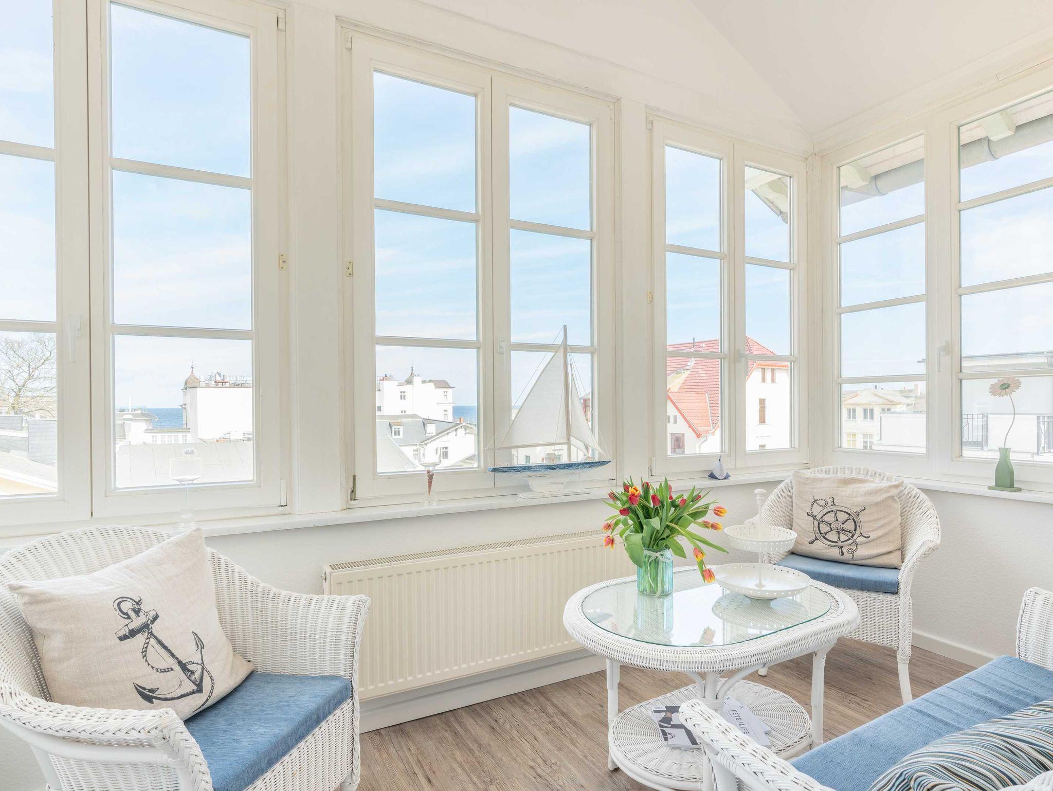 Die 45 qm große Ferienwohnung 3 für bis zu 4 Personen befindet sich im Dachgeschoss zur Seeseite hin. Die verglaste Veranda (Wintergarten), liegt in Nordostrichtung mit Blick auf die Ostsee und lädt zum Schmökern und Relaxen ein. Das Schlafzimmer verfügt über ein 180 cm breites Doppelbett, ergänzt um ein ausziehbares Schlafsofa (140 cm) im Wohnzimmer. Die funktionale Küche ist komplett ausgestattet. Ideal ist die Ferienwohnung für zwei Personen oder eine dreiköpfige Familie.