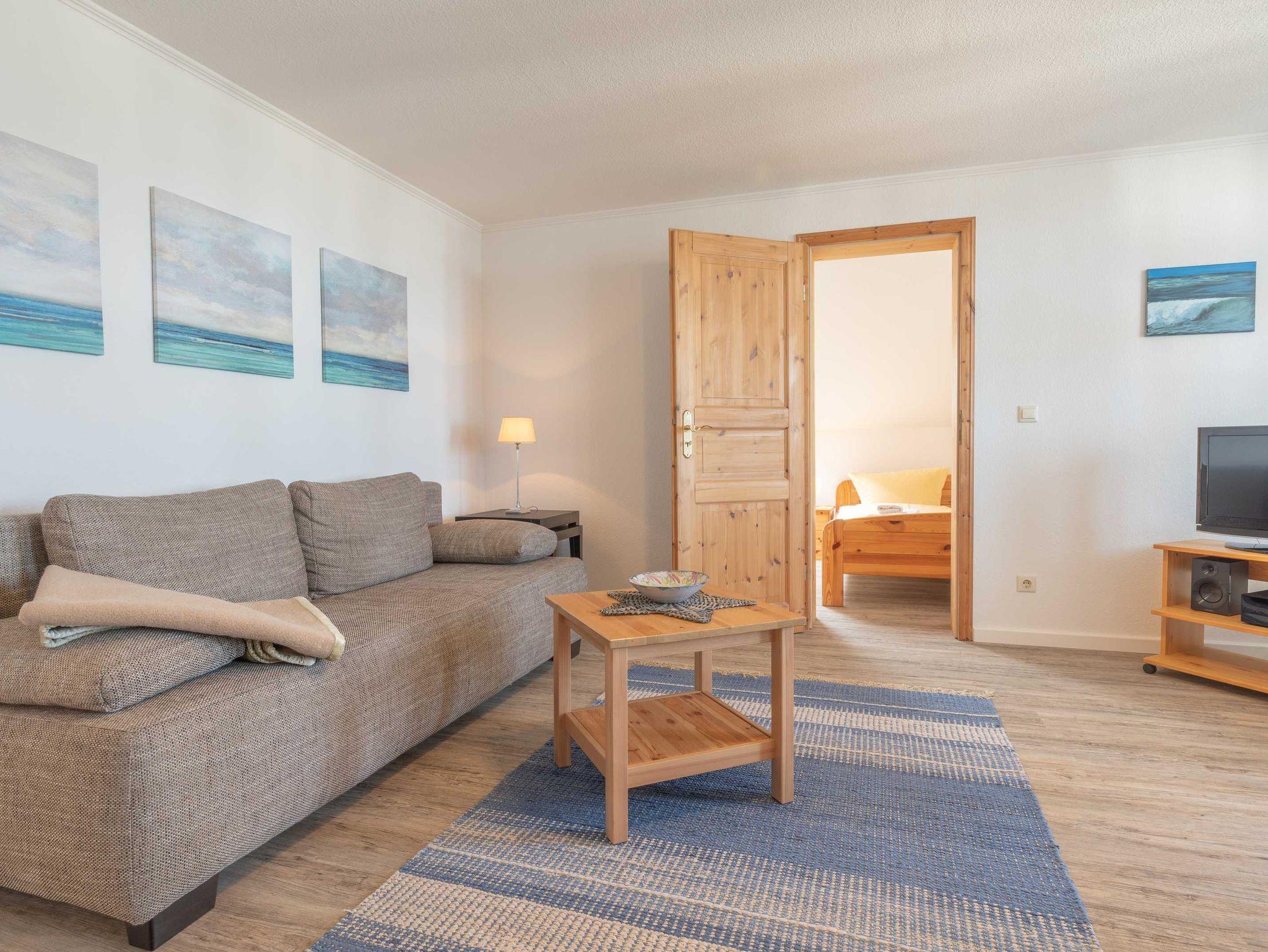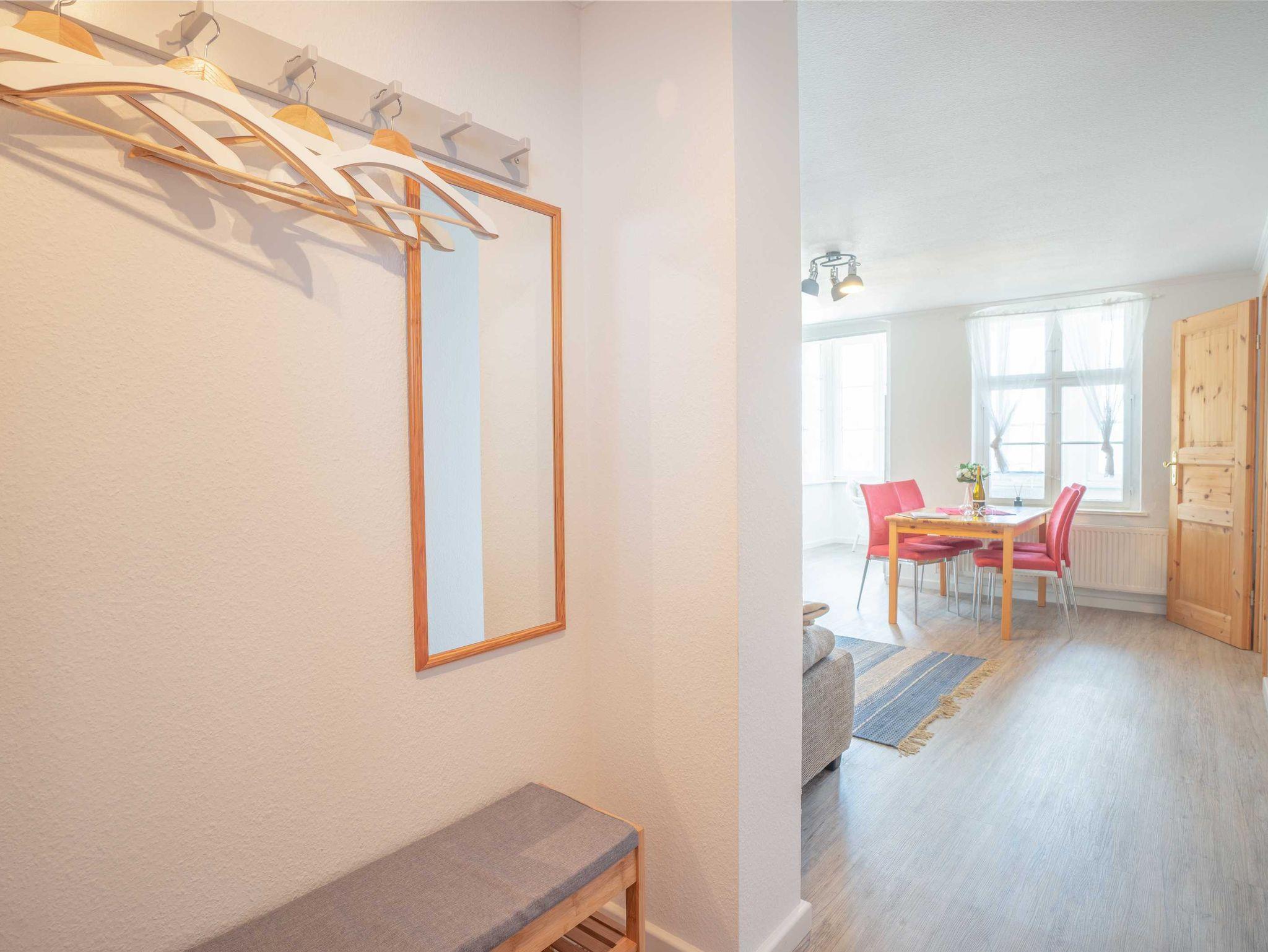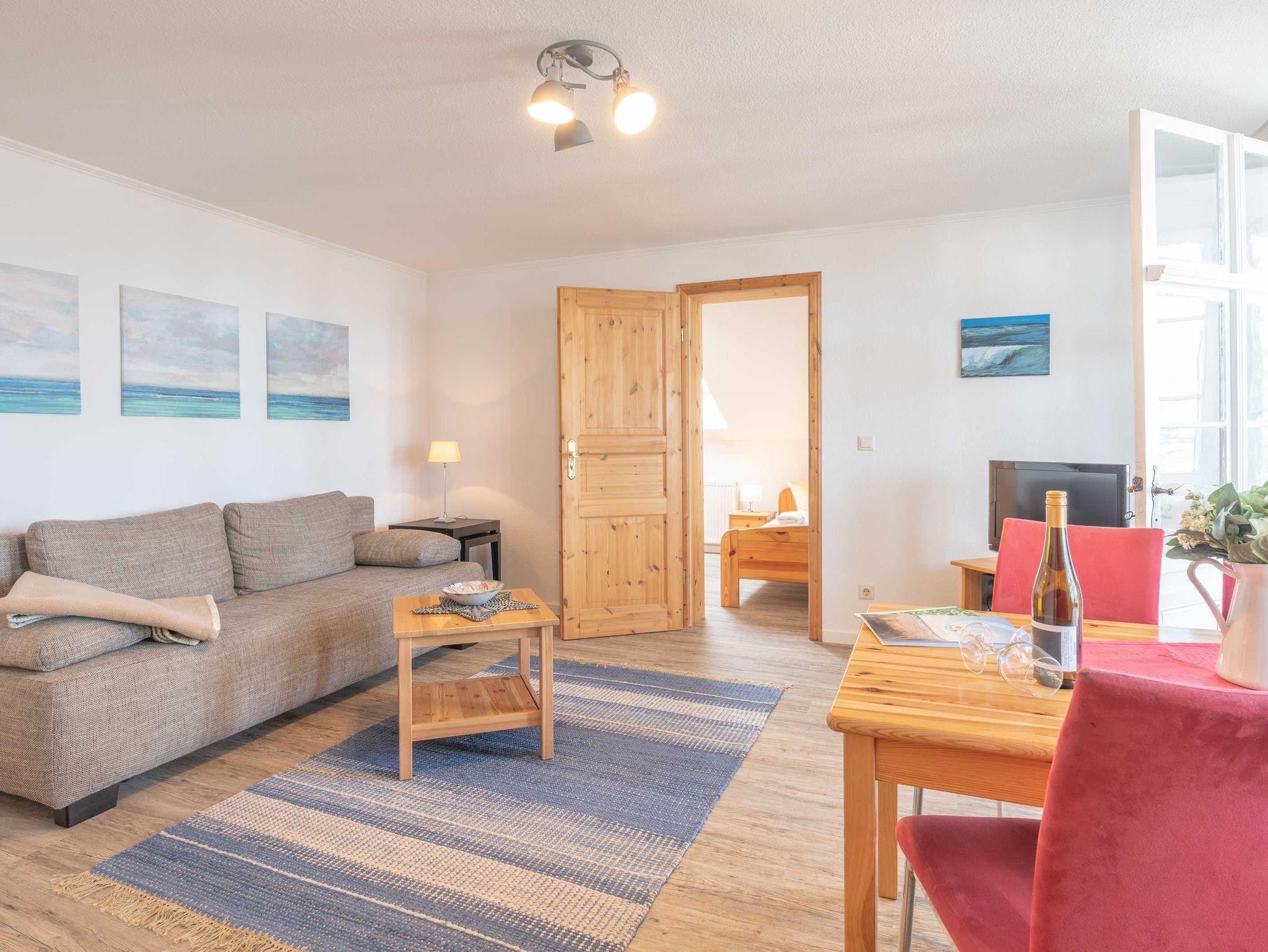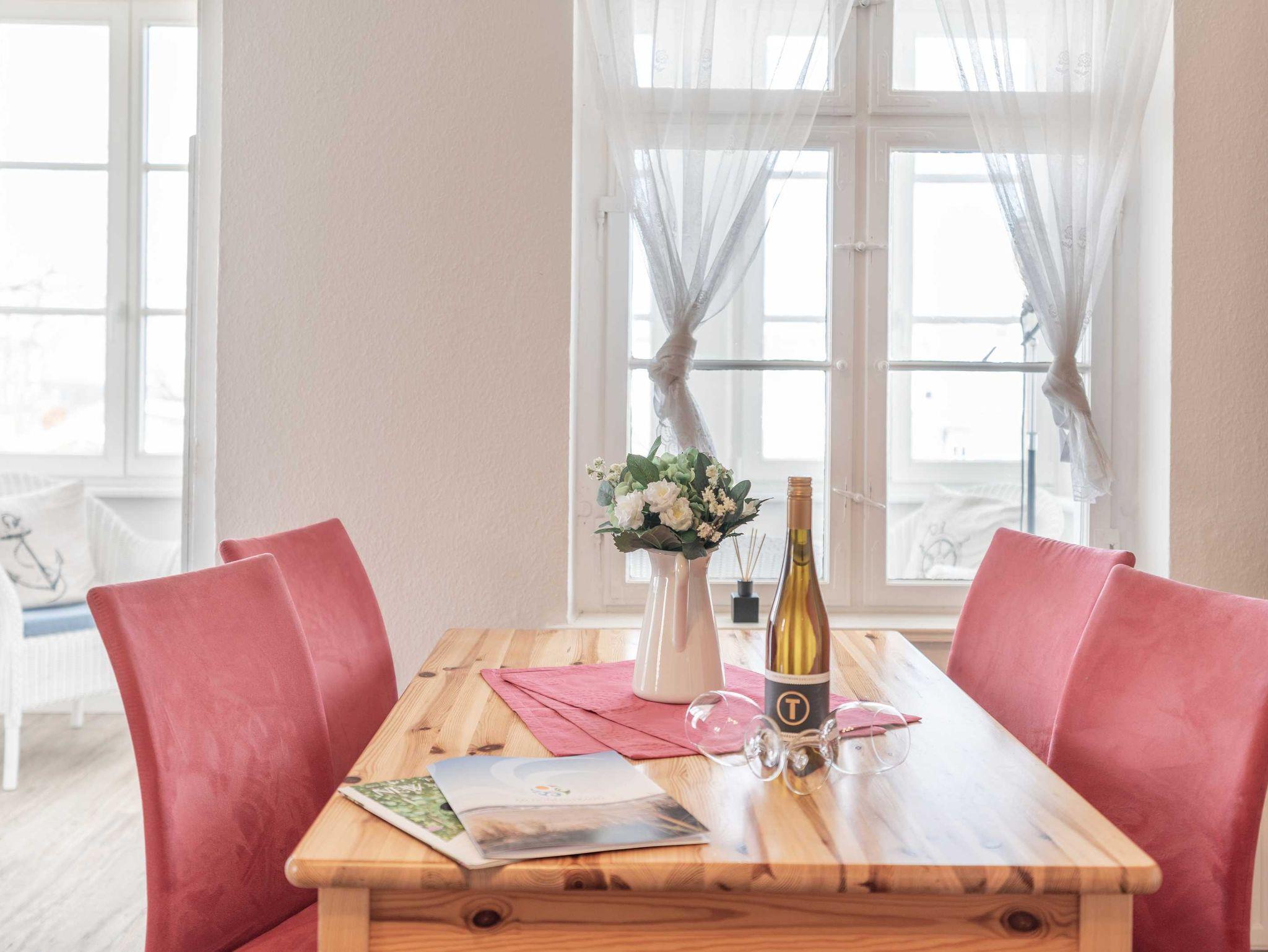Die 45 qm große Ferienwohnung 3 für bis zu 4 Personen befindet sich im Dachgeschoss zur Seeseite hin. Die verglaste Veranda (Wintergarten), liegt in Nordostrichtung mit Blick auf die Ostsee und lädt zum Schmökern und Relaxen ein. Das Schlafzimmer verfügt über ein 180 cm breites Doppelbett, ergänzt um ein ausziehbares Schlafsofa (140 cm) im Wohnzimmer. Die funktionale Küche ist komplett ausgestattet. Ideal ist die Ferienwohnung für zwei Personen oder eine dreiköpfige Familie.