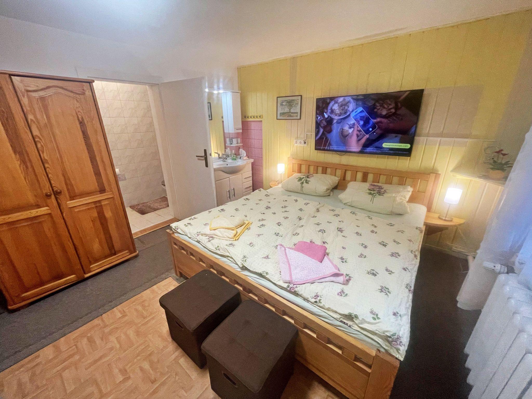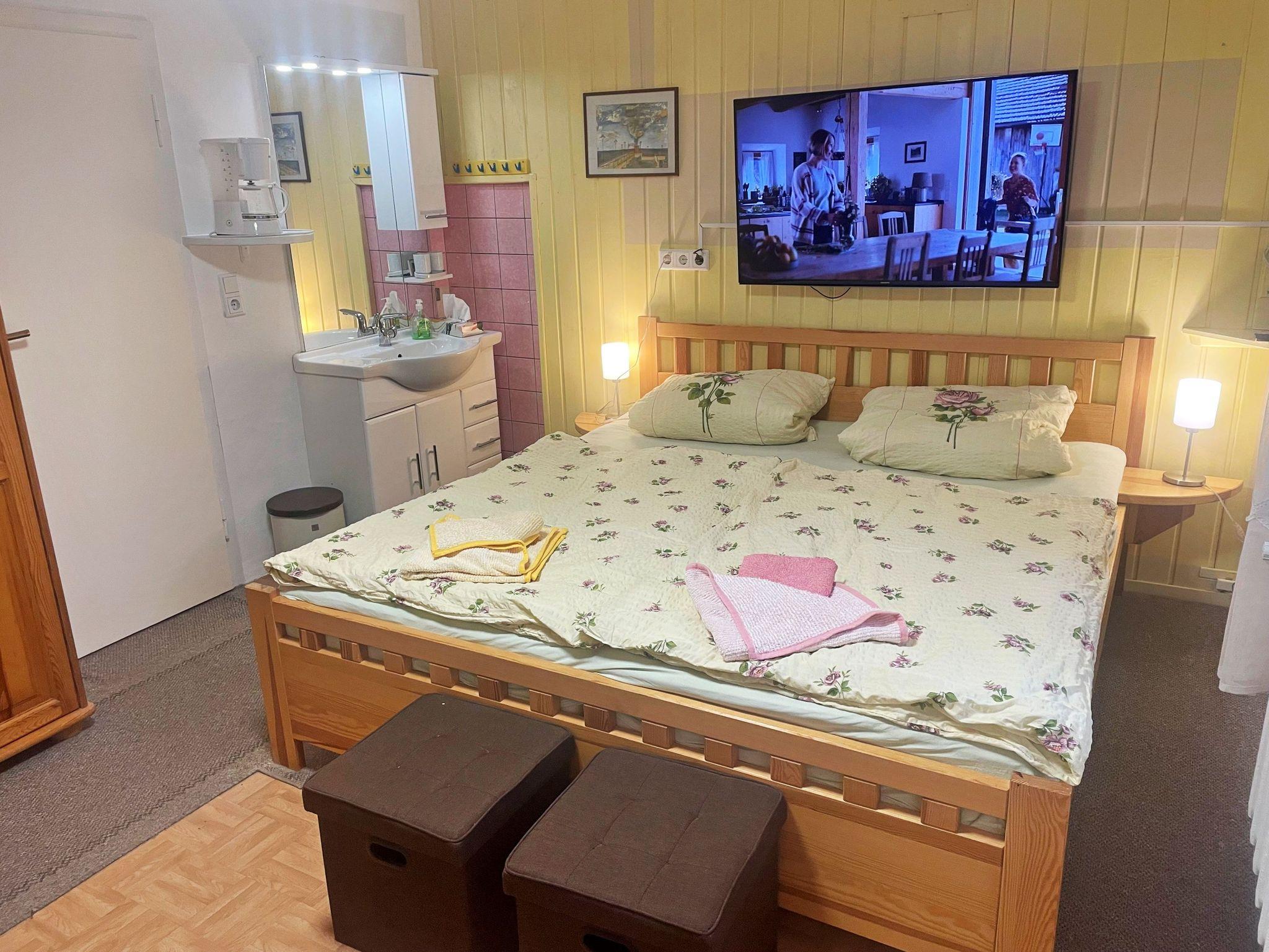 Das gemütlich eingerichtete Doppelzimmer befindet sich im Souterrain im Wohnhaus des Vermieters und verfügt über einen separaten Eingang. Das Zimmer ist mit einem Doppelbett (1,40 x 2,00 m), Couchsitzecke mit Tisch und 2 Sessel und Flat-TV ausgestattet. Das Waschbecken befindet sich mit im Zimmer. Eine Kaffeemaschine gehört mit zur Ausstattung. Das Bad ist mit Dusche und WC. Eine kleine Gemeinschaftsküche befindet sich direkt neben dem Zimmer. Diese ist ausgestattet mit Kühlschrank u. Toaster sowie einer Pantryküche. Die Erstausstattung Bettwäsche und Handtücher, Endreinigung sowie der Parkplatz sind im Preis inklusive.