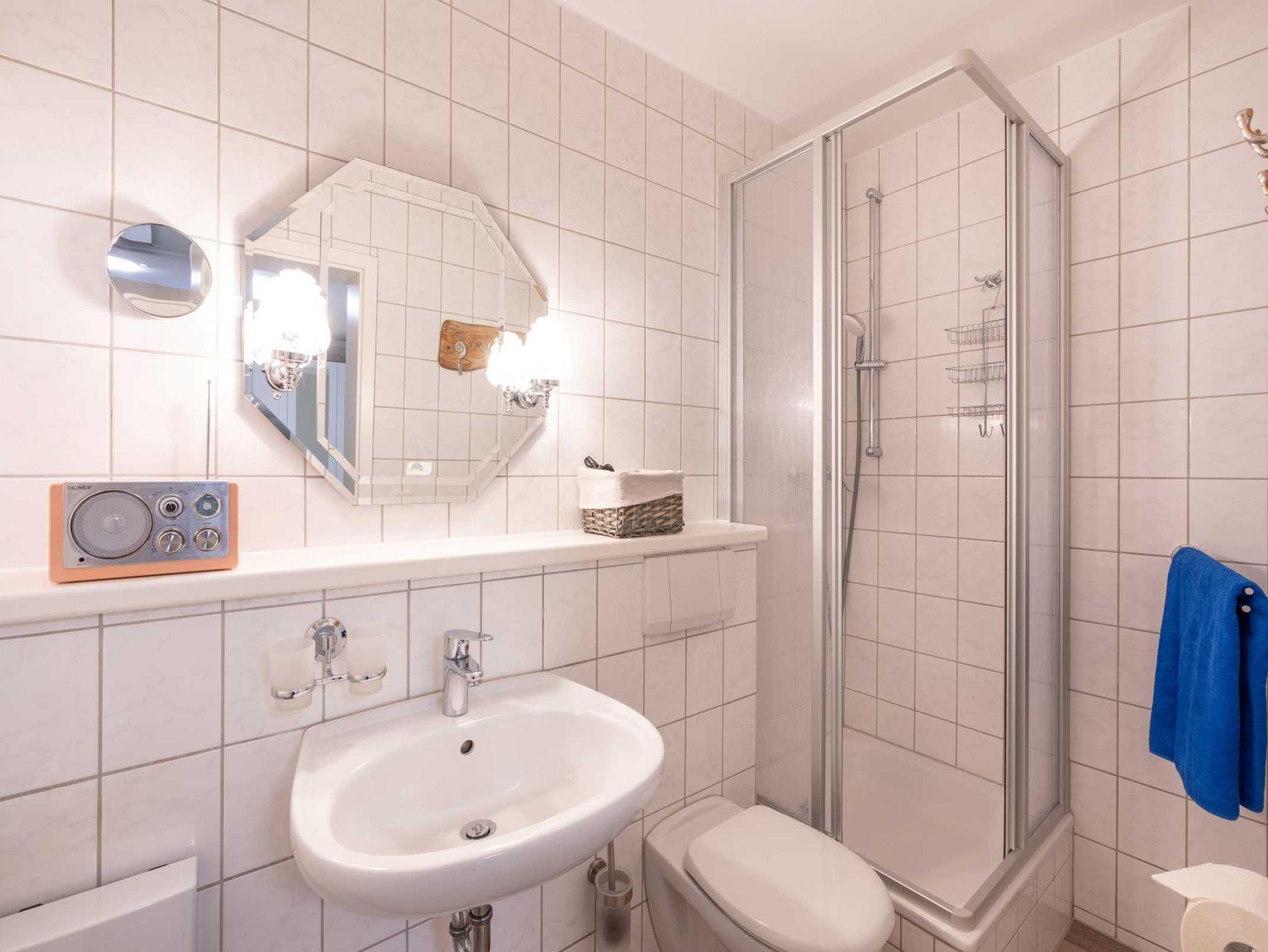 • Badezimmer vom Flur begehbar mit Dusche, WC und einen Föhn