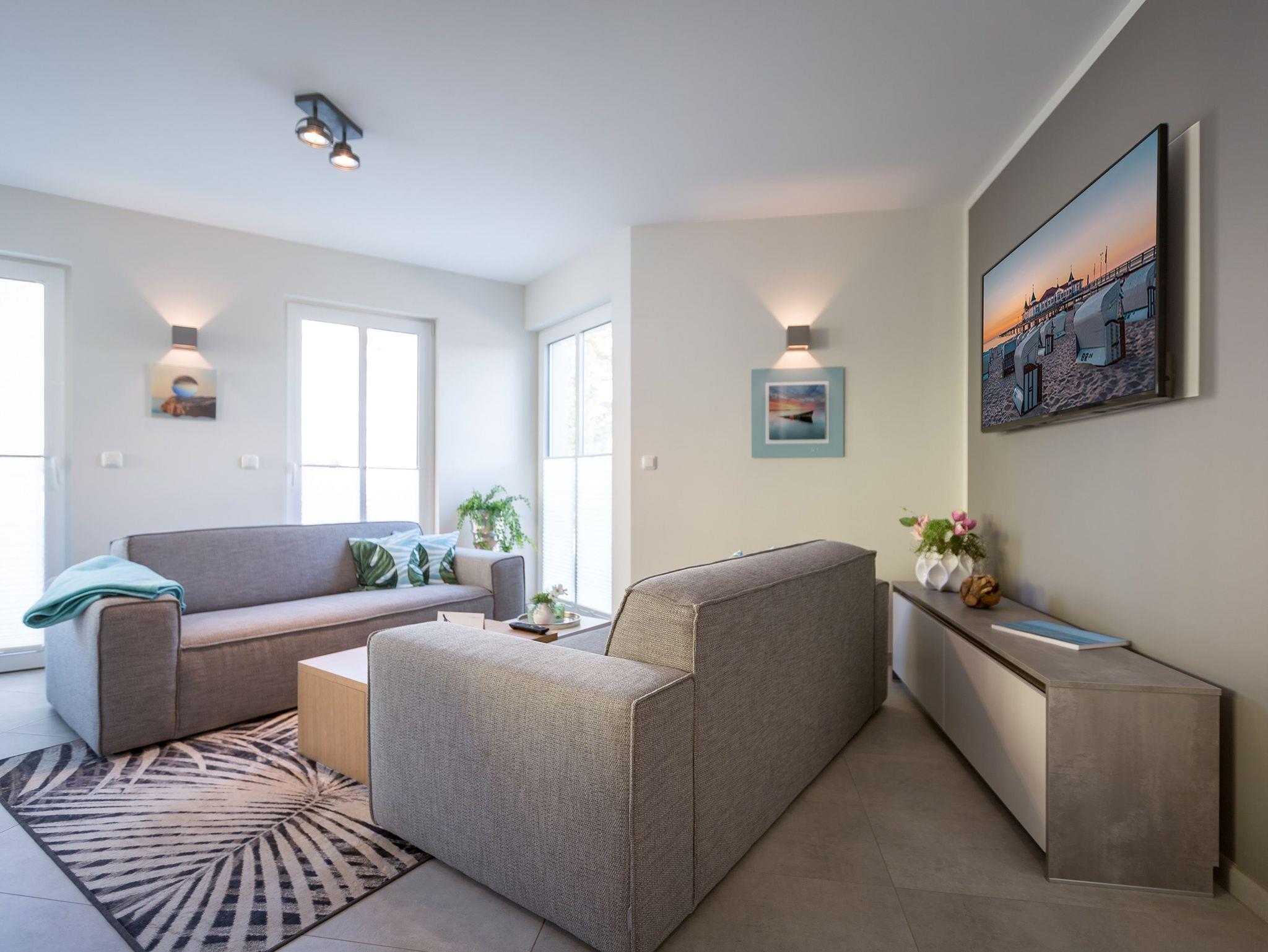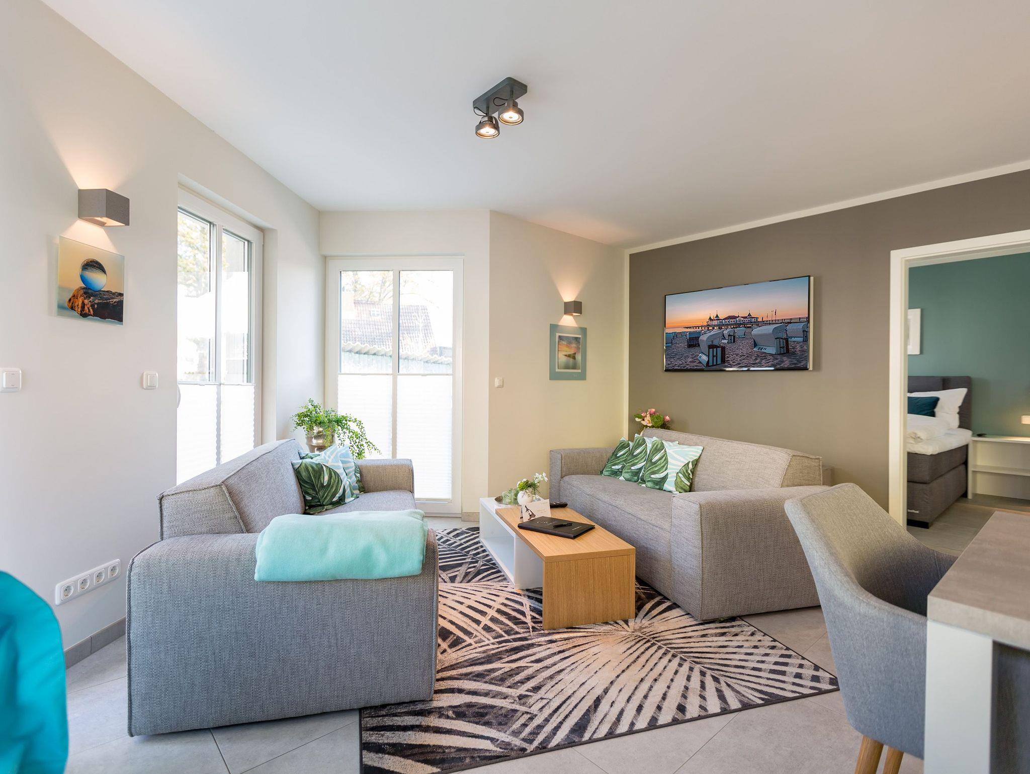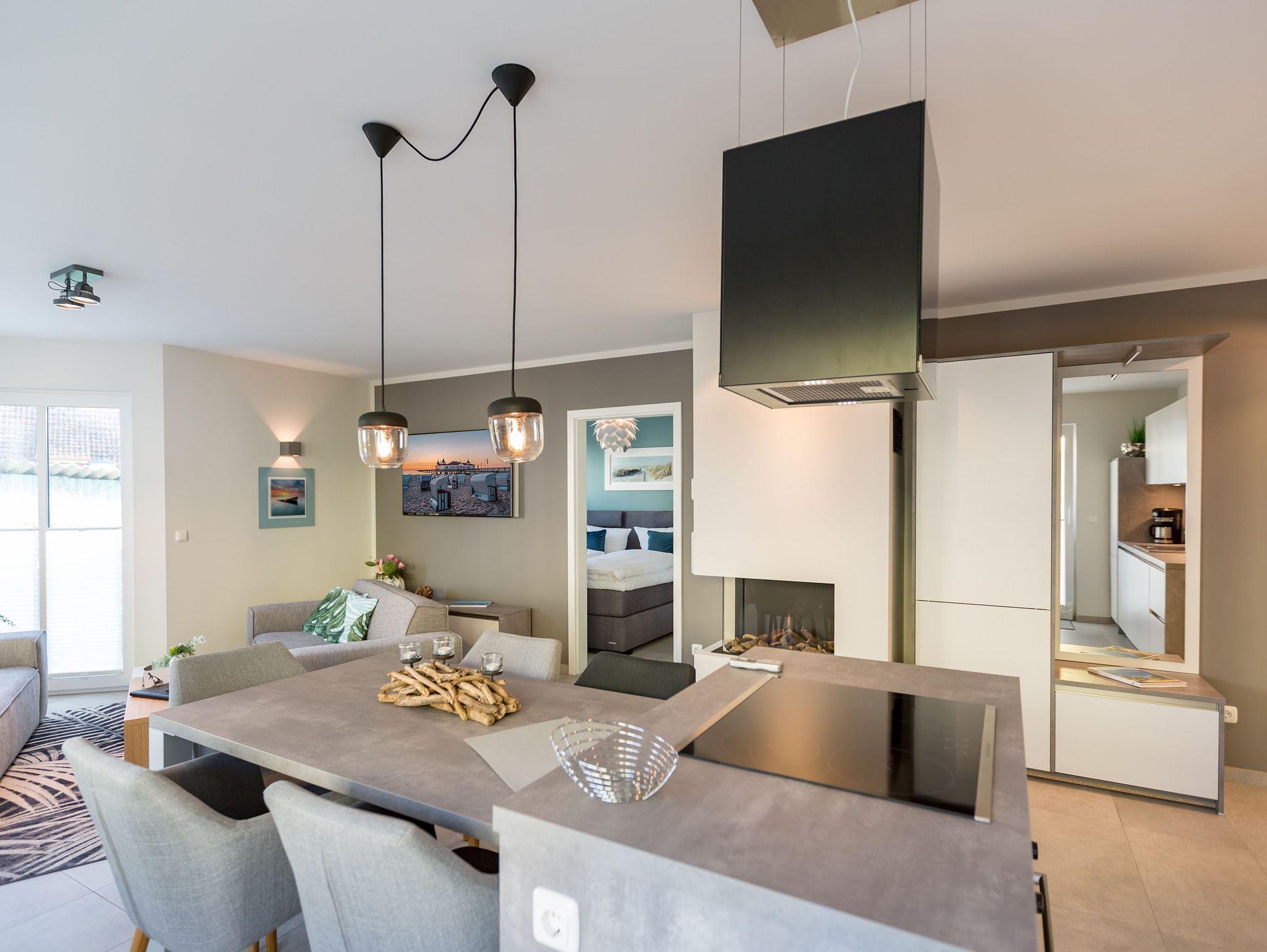 Individualisten werden sich in diesem Drei-Raum-Appartement im Erdgeschoss ganz besonders wohlfühlen. Denn ausgefallen, stylisch und modern empfängt es seine Gäste mit viel Komfort und Eleganz. Zeitlose Betonoptik, eine Einrichtung, die mit exklusivem Designgeschmack ausgesucht und mit den passenden Dekorationen ergänzt wurde. Das große und offene Wohnzimmer lässt viel Sonnenlicht ein. Zwei Terrassen (15 Quadratmeter groß Richtung Norden [&] 37 Quadratmeter groß Richtung Nord-Westen) schauen direkt auf die Ostsee. Hier ist Entspannung pur angesagt ? egal, ob beim Sonnenbaden oder zum gemütlichen Essen. Das Innere der Ferienwohnung lockt mit viel Platz ebenfalls zum Entspannen. Ganz besonders die beiden großen Sofas eignen sich dafür perfekt. An ungemütlichen Tagen und Abenden sorgt der Gas-Kamin für eine wohlige Kuschelatmosphäre. Natürlich steht hier für die Unterhaltung ein großer Flat-TV zur Verfügung. Das Wohnzimmer öffnet sich zu einem geräumigen und gemütlichen Ess- und Küchenbereich. Die Kochzeile ist voll ausgestattet mit hochwertigen Geräten und Marken-Geschirr. Gemeinsam kochen ? an der modernen und freistehenden Kochinsel ist das möglich. Am schönen Esstisch mit gemütlichen Sesseln haben bis zu fünf Personen ausreichend Platz zum Schlemmen und Genießen. In den beiden Schlafzimmern können bis zu vier Personen und ein Kleinkind im Kinderreisebett schlafen. Zwei bequeme Boxspringdoppelbetten (1,80 m x 2,00 m) verleihen Ihren Träumen behagliche Leichtigkeit. Im Badezimmer wartet ein besonderes Highlight auf Sie: eine Panorama-Sauna. Gerade an kühlen Abenden ist die Finnische Sauna eine kleine Wellness-Oase, die Sie trübe Gedanken schnell vergessen lässt. Eine geräumige Dusche, ein Waschtisch und ein WC gehören ebenfalls zur Bad-Ausstattung. Zudem verfügt die Wohnung über ein Gäste-WC. Bei Anreise sind die Betten für Sie schon bezogen und Handtücher liegen bereit. Ihr Auto können Sie auf dem für Sie am Haus reservierten und überdachten Stellplatz parken.