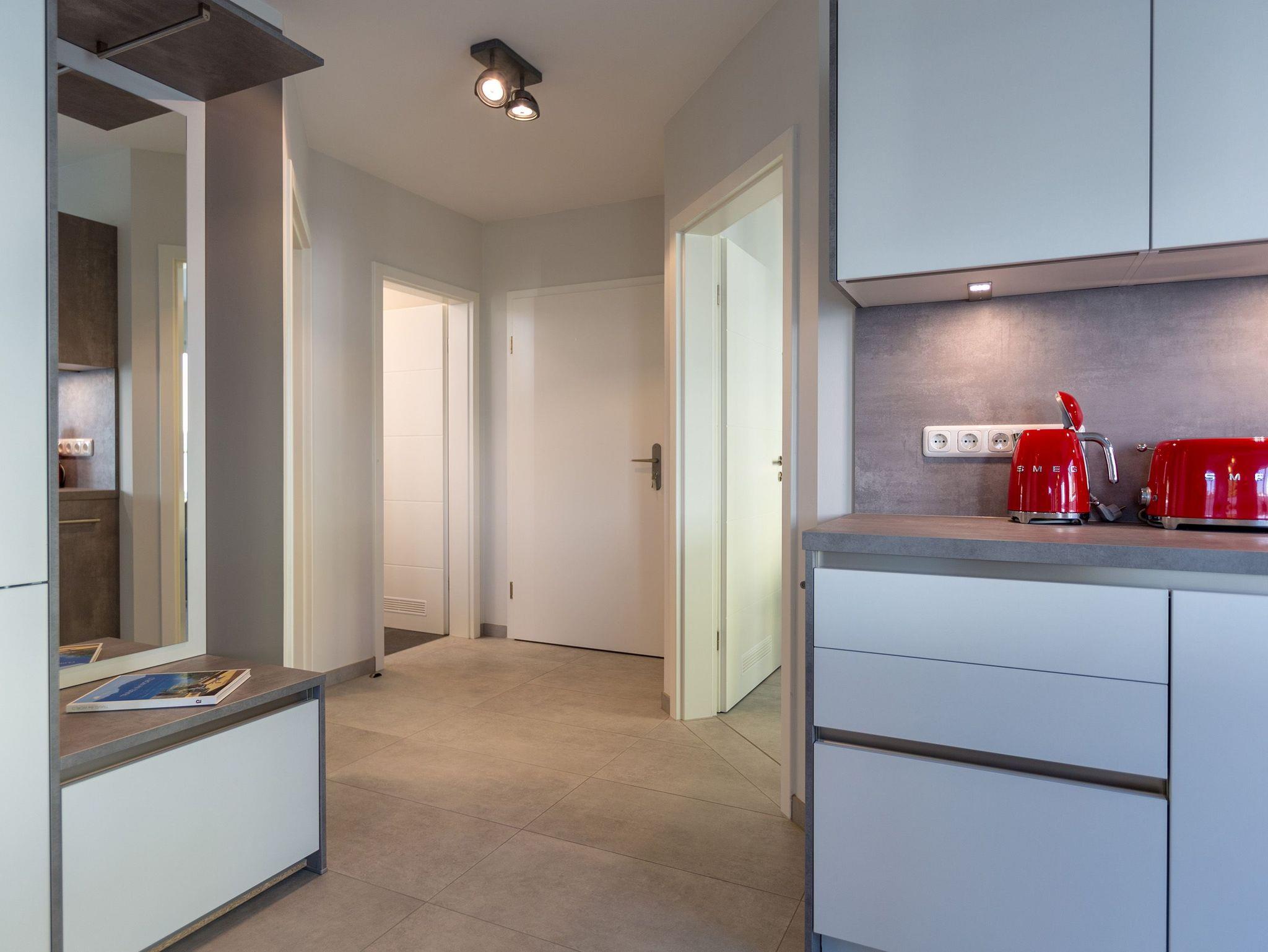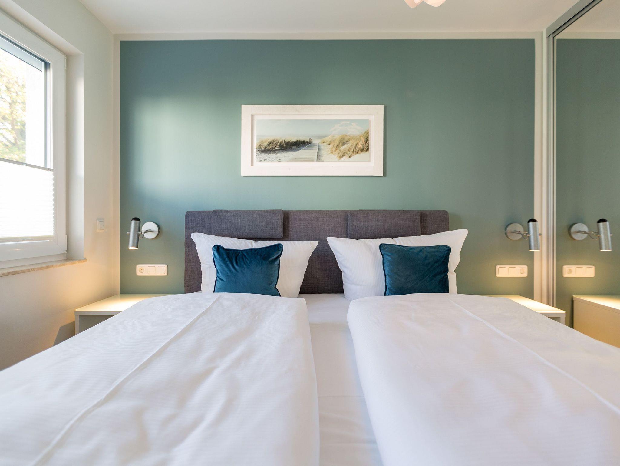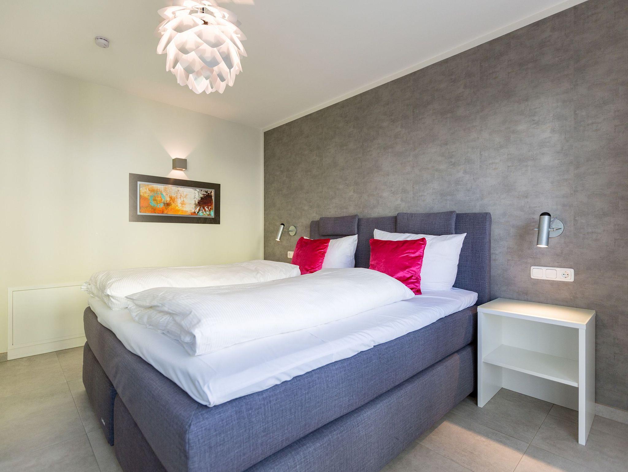 Individualisten werden sich in diesem Drei-Raum-Appartement im Erdgeschoss ganz besonders wohlfühlen. Denn ausgefallen, stylisch und modern empfängt es seine Gäste mit viel Komfort und Eleganz. Zeitlose Betonoptik, eine Einrichtung, die mit exklusivem Designgeschmack ausgesucht und mit den passenden Dekorationen ergänzt wurde. Das große und offene Wohnzimmer lässt viel Sonnenlicht ein. Zwei Terrassen (15 Quadratmeter groß Richtung Norden [&] 37 Quadratmeter groß Richtung Nord-Westen) schauen direkt auf die Ostsee. Hier ist Entspannung pur angesagt ? egal, ob beim Sonnenbaden oder zum gemütlichen Essen. Das Innere der Ferienwohnung lockt mit viel Platz ebenfalls zum Entspannen. Ganz besonders die beiden großen Sofas eignen sich dafür perfekt. An ungemütlichen Tagen und Abenden sorgt der Gas-Kamin für eine wohlige Kuschelatmosphäre. Natürlich steht hier für die Unterhaltung ein großer Flat-TV zur Verfügung. Das Wohnzimmer öffnet sich zu einem geräumigen und gemütlichen Ess- und Küchenbereich. Die Kochzeile ist voll ausgestattet mit hochwertigen Geräten und Marken-Geschirr. Gemeinsam kochen ? an der modernen und freistehenden Kochinsel ist das möglich. Am schönen Esstisch mit gemütlichen Sesseln haben bis zu fünf Personen ausreichend Platz zum Schlemmen und Genießen. In den beiden Schlafzimmern können bis zu vier Personen und ein Kleinkind im Kinderreisebett schlafen. Zwei bequeme Boxspringdoppelbetten (1,80 m x 2,00 m) verleihen Ihren Träumen behagliche Leichtigkeit. Im Badezimmer wartet ein besonderes Highlight auf Sie: eine Panorama-Sauna. Gerade an kühlen Abenden ist die Finnische Sauna eine kleine Wellness-Oase, die Sie trübe Gedanken schnell vergessen lässt. Eine geräumige Dusche, ein Waschtisch und ein WC gehören ebenfalls zur Bad-Ausstattung. Zudem verfügt die Wohnung über ein Gäste-WC. Bei Anreise sind die Betten für Sie schon bezogen und Handtücher liegen bereit. Ihr Auto können Sie auf dem für Sie am Haus reservierten und überdachten Stellplatz parken.