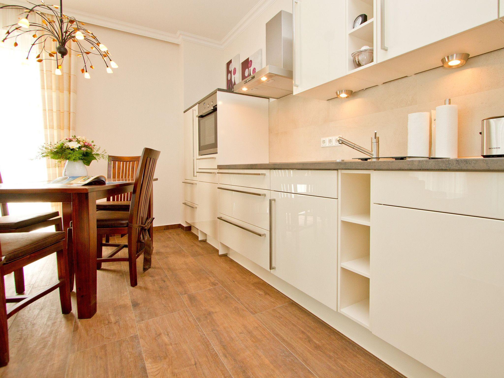 Dünenpalais Ferienwohnung 6: Im Erdgeschoss des Südhauses befindet sich dieses schöne 3-Raum-Appartement für 4 Personen und ein Kleinkind (bis 3 Jahre im Kinderreisebett). Der gemütliche Wohnraum wird ergänzt durch die moderne, komplett ausgestattete Küchenzeile mit Essbereich. Die beiden Schlafzimmer sind mit Doppelbetten (1,80 m x 2 m) und je einem Flat-TV ausgestattet, hier findet sich auch genug Platz für ein Kinderreisebett (kann im Vorwege ohne Matratze [&] Bettzeug gegen einen Aufpreis bestellt werden). Zum hellen Bad mit großer Echtglasdusche und WC gibt es zusätzlich ein Gäste-WC. Ein besonderes Highlight ist die wohnungseigene Sauna (ideal für 2 Personen) und der per Fernbedienung bedienbare Gaskamin. Wer keine Lust auf Strand hat, macht es sich wahlweise auf dem großen, sonnigen Südbalkon (teilweise überdacht) oder der schönen Terrasse gemütlich, bequeme Gartenmöbel und ein Strandkorb sowie Sonnenliege warten hier auf Sie. Für Ihren Komfort steht die Erstausstattung Wäsche für Sie bereit. Ein Pkw-Stellplatz befindet sich in der Tiefgarage.