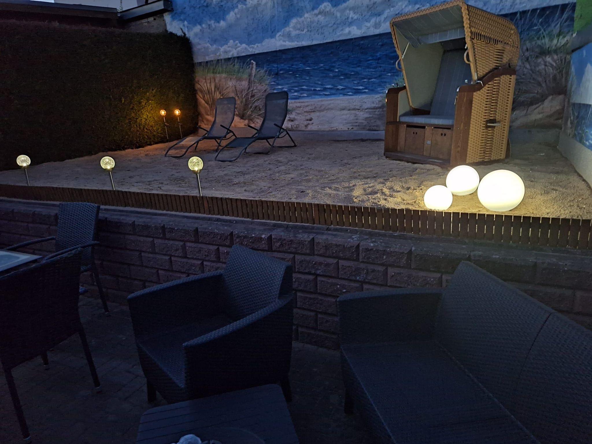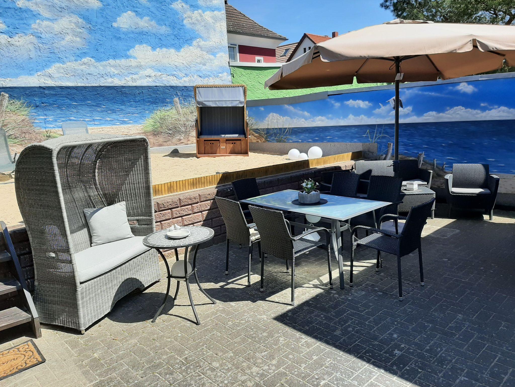 Eine große Terrasse mit zwei Strandkörben , Sonnenliegen, Sitzecken und einer Grillmöglichkeit laden unsere Urlauber zur Erholung und Sonnenbaden ein.
