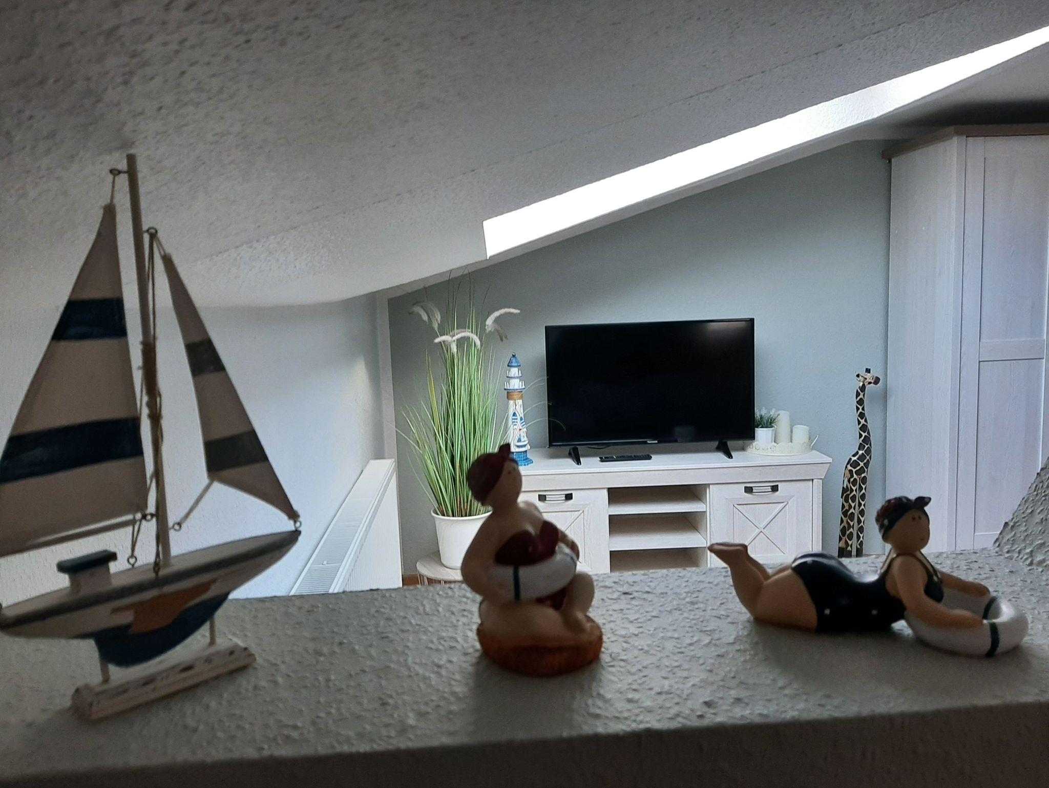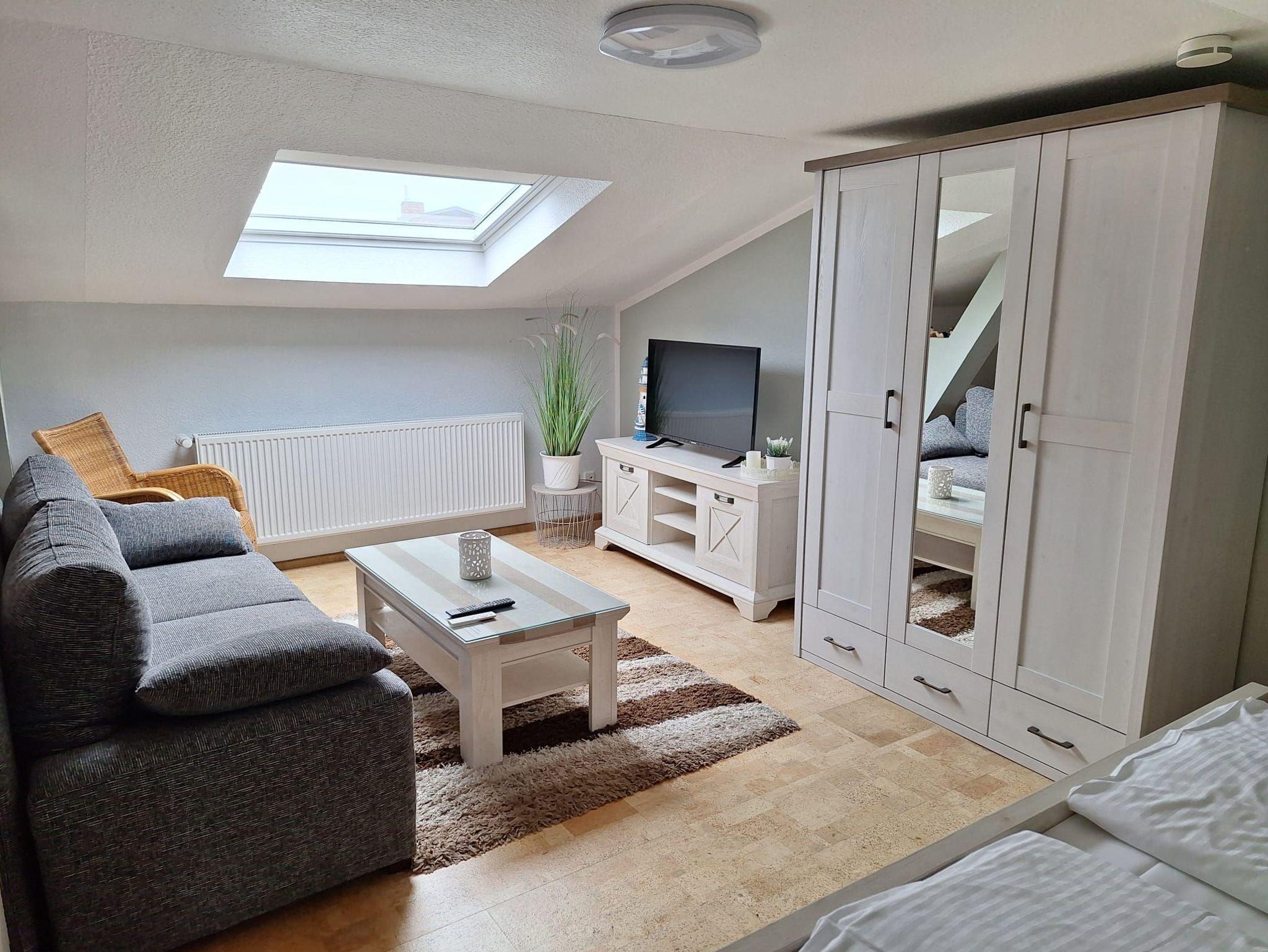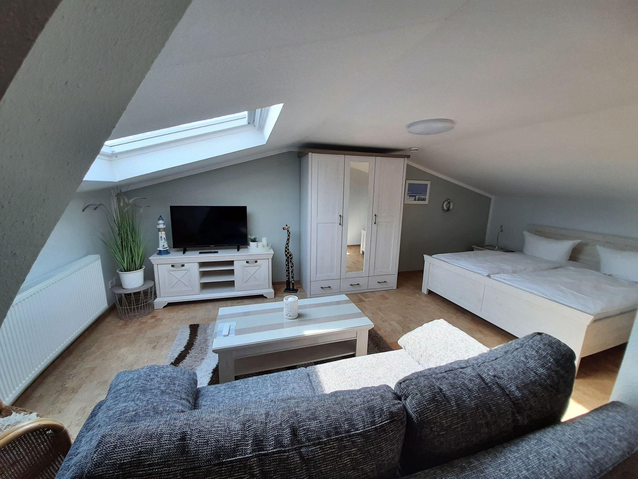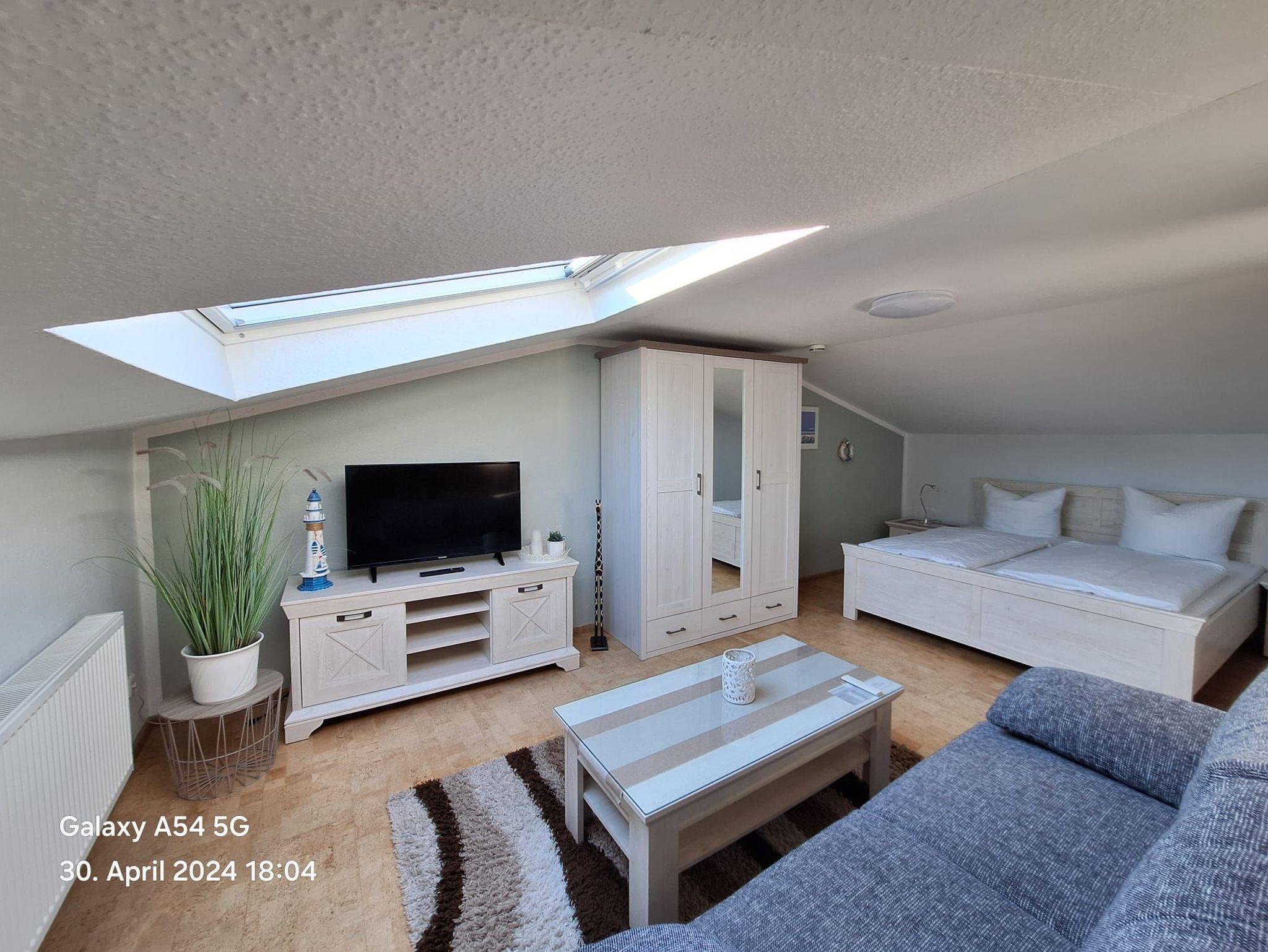 Schlafsofa ,großen Doppelbett, Kleiderschrank sowie TV und Esstisch.