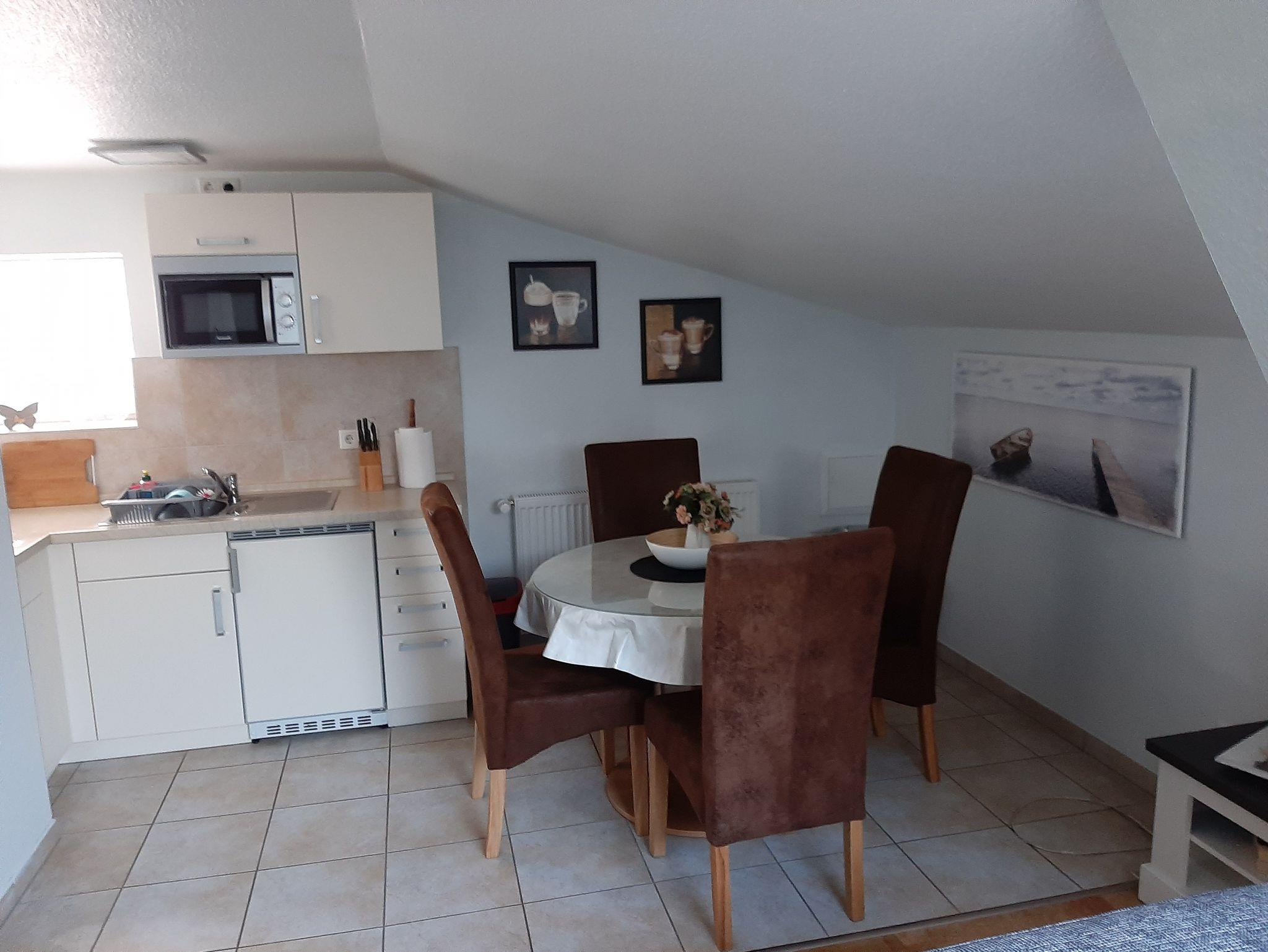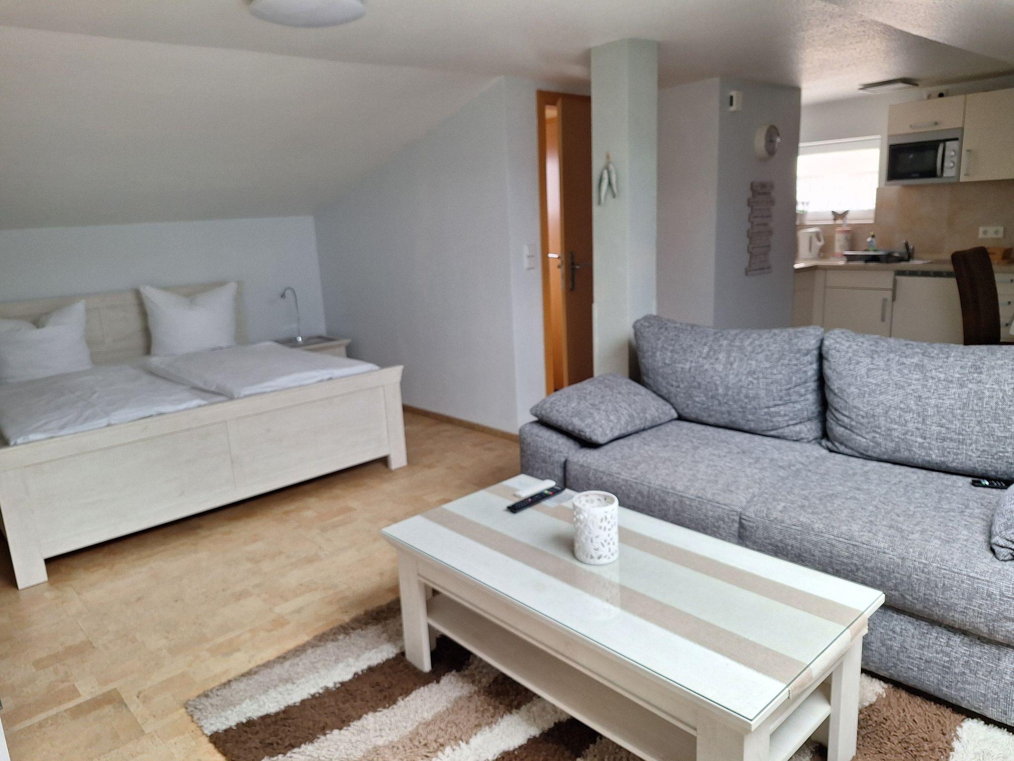 Unsere 1 Raum Ferienwohnung mit großen Wohn.- Schlafraum ,Einbauküche und Bad ist gemütlich und komfortable eingerichtet und befinden sich im Dachgeschoß mit W-Lan-Internetzugang (DSL/Breitband) sowie mit Parkplatz auf dem Grundstück.