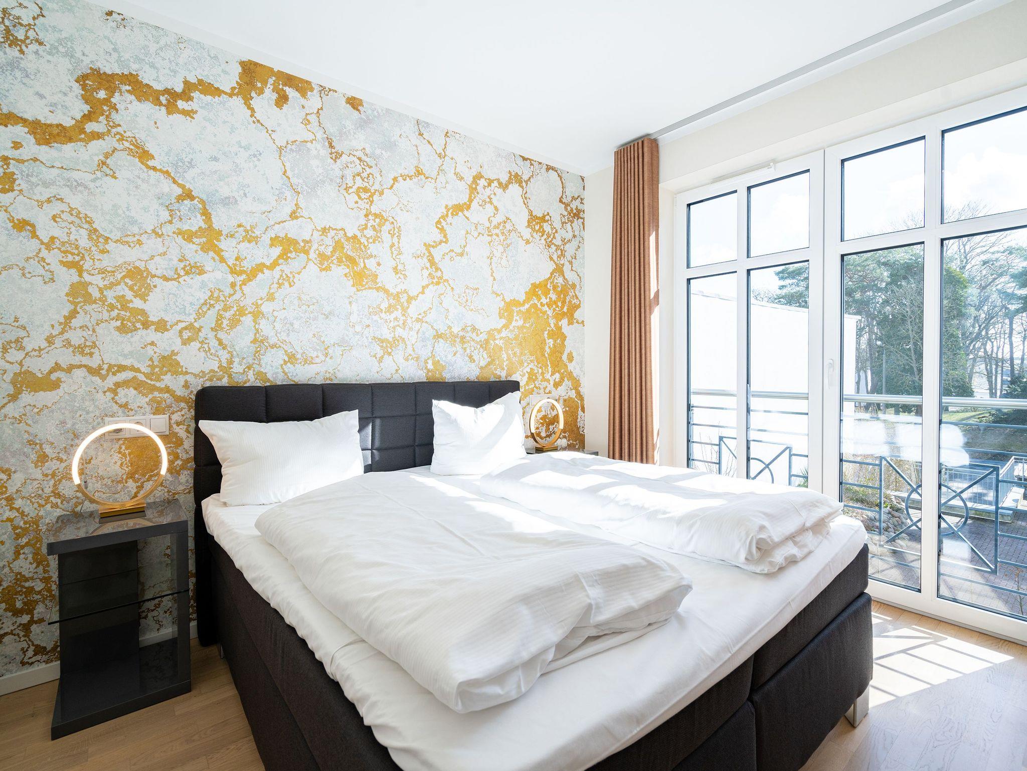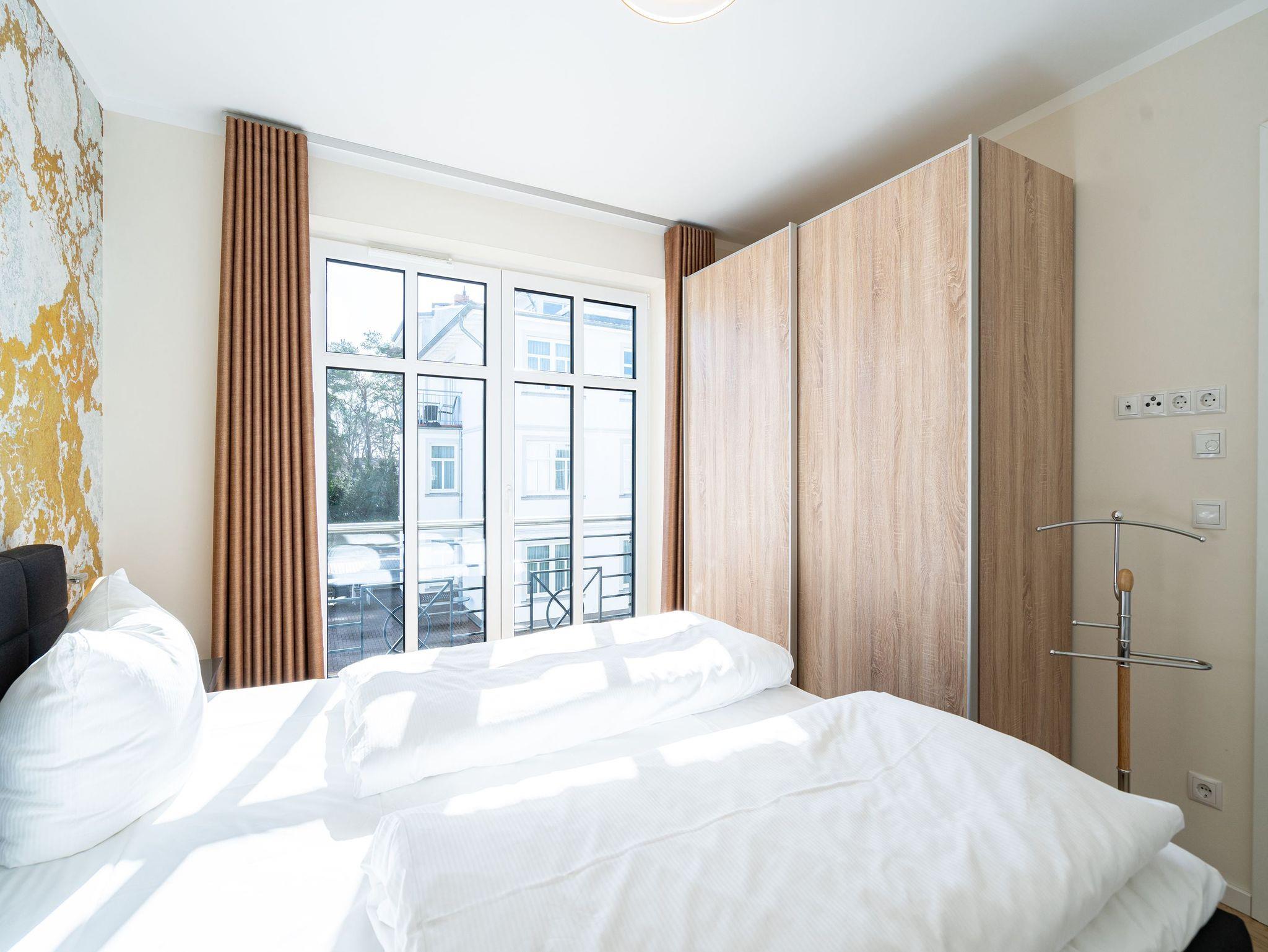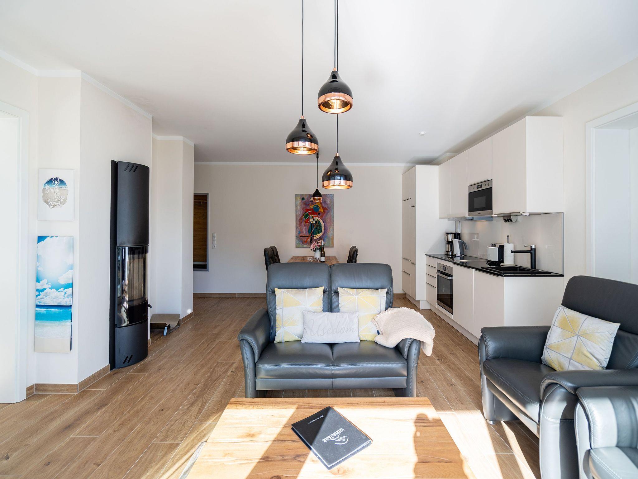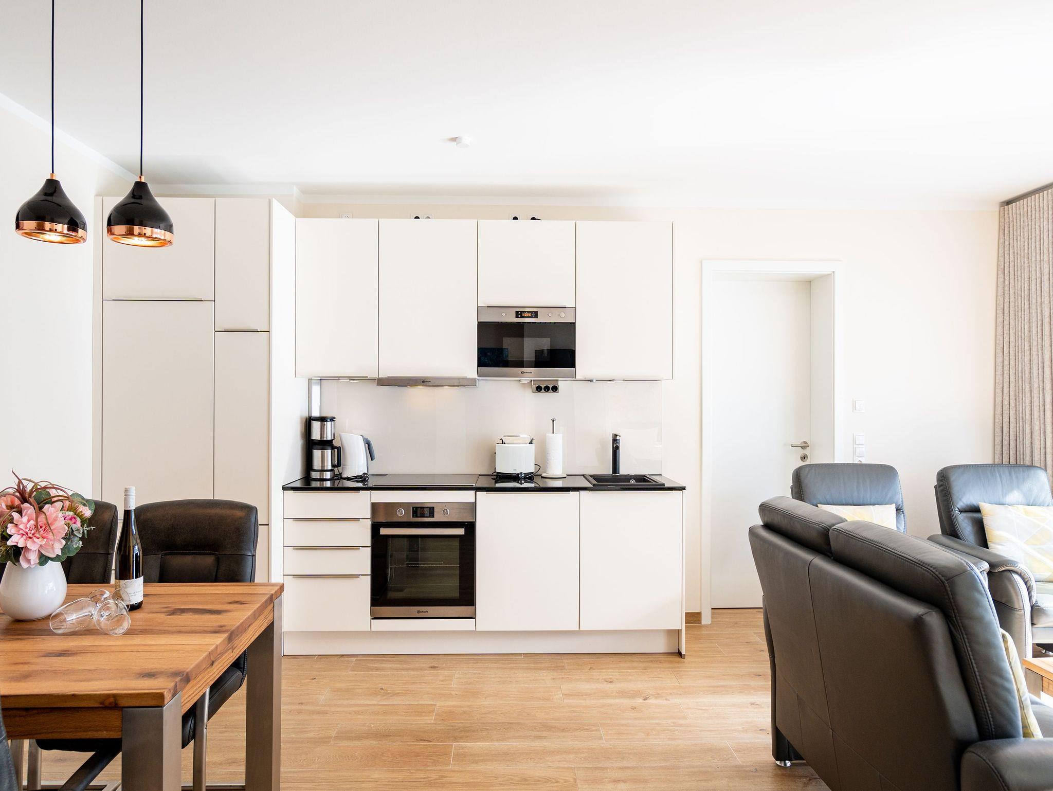 Ein stilvolles Appartement ist die Nummer 8 im ersten Obergeschoss. Für bis zu vier Personen bieten die 74 Quadratmeter viel Platz zum Entspannen und Genießen. Ein großer offener Wohnbereich mit hochwertig und voll ausgestatteter Küchenzeile ist der ideale Ort, um neue Energie zu tanken und mit der Familie oder mit Freunden eine wundervolle Zeit zu verbringen. Eine gemütliche Sofa-Sitz-Landschaft, ein großer Flat-TV, ein Kaminofen und ein schöner Esstisch mit Stühlen ? all das wird Ihre Ostseeauszeit verschönern. Vom Wohnzimmer aus können Sie auf den Balkon (10 Quadratmeter) mit Gartenmöbeln hinaustreten. Lassen Sie es sich hier bei einem erfrischenden Getränk oder einem feinen Essen gut gehen. In der Küche ist alles Nötige vorhanden: Induktionsherd, Geschirrspüler, Mikrowelle, Toaster, Kaffeemaschine, Wasserkocher, Töpfe, Pfannen und edles Porzellan. Das Appartement verfügt über zwei Schlafzimmer, die mit je einem bequemen Boxspringdoppelbett (1,80 m x 2,00 m) und einem geräumigen Kleiderschrank eingerichtet sind. Die bodentiefen Fenster lassen viel Licht in jeden der Räume. Auf das Badezimmer wird es sicher nie einen Ansturm geben, denn es gibt sogar zwei davon. Beide verfügen über Dusche, Föhn und WC. Das Masterbad hält noch eine kleine Überraschung bereit: Eine Finnische Sauna. Genießen Sie Ihre private Wellness-Oase. In einem separaten Hauswirtschaftsraum befindet sich zudem eine Waschmaschine. Handtücher und Bettbezüge gehören zum Preis dazu. Auch das WLAN ist inklusive. In der Tiefgarage gehört zur Wohnung der Stellplatz Nr. 8. Außerdem gibt es dort einen Fahrradraum.