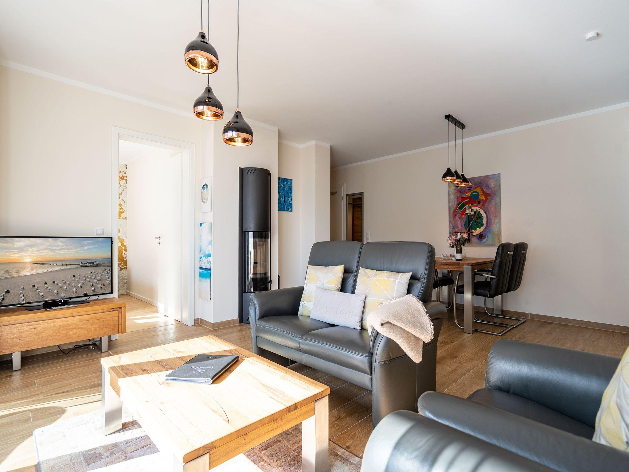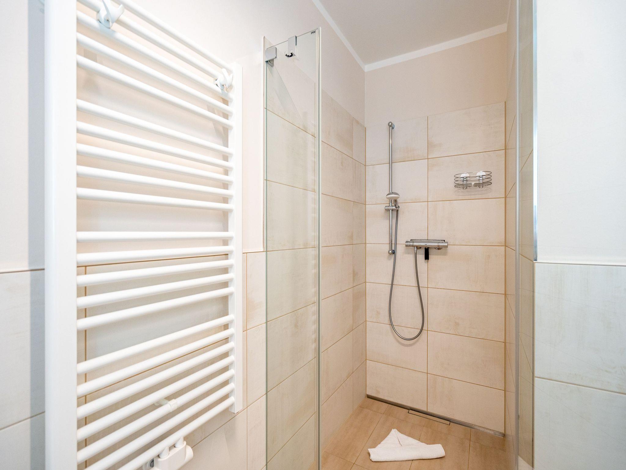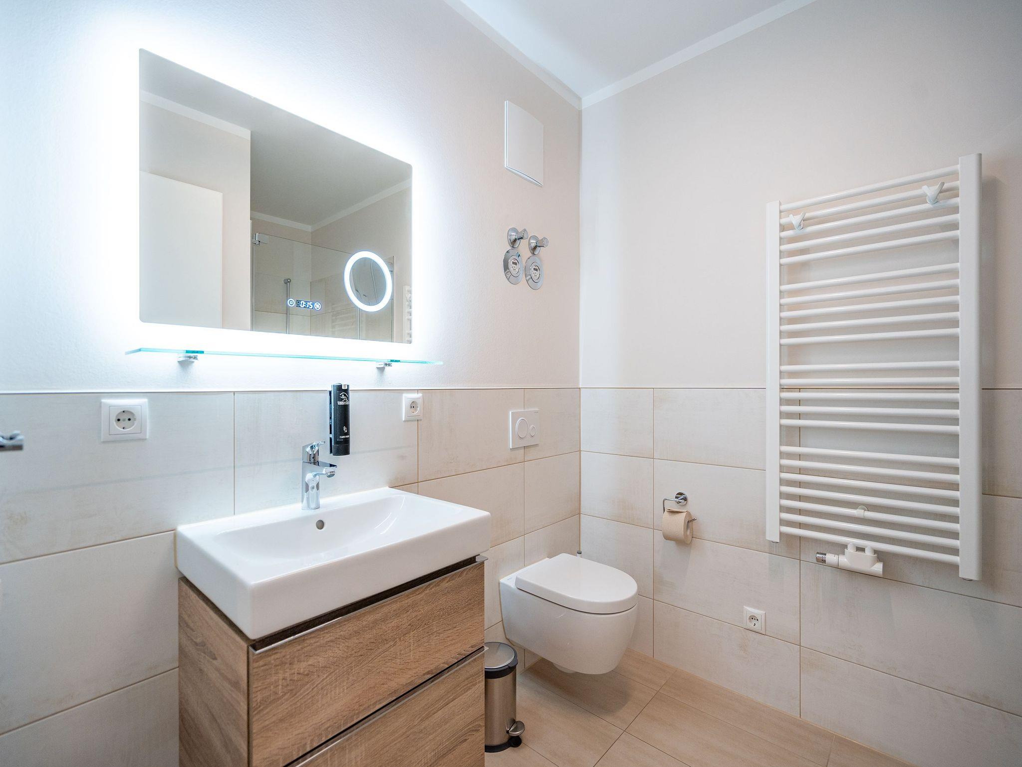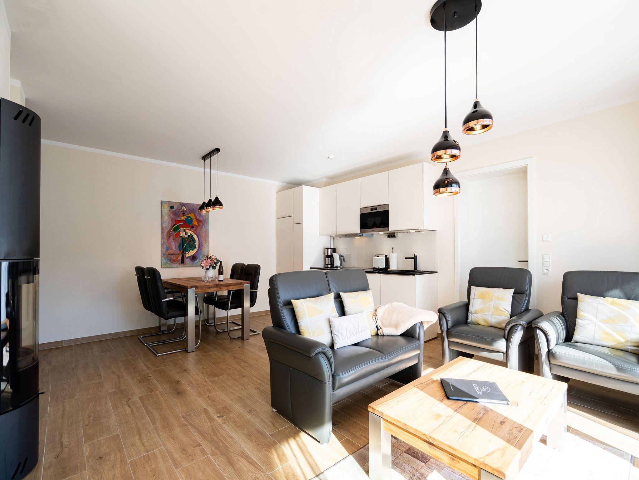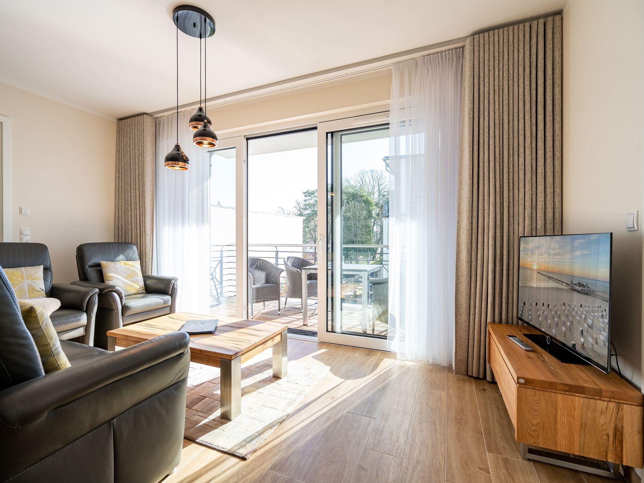 Ein stilvolles Appartement ist die Nummer 8 im ersten Obergeschoss. Für bis zu vier Personen bieten die 74 Quadratmeter viel Platz zum Entspannen und Genießen. Ein großer offener Wohnbereich mit hochwertig und voll ausgestatteter Küchenzeile ist der ideale Ort, um neue Energie zu tanken und mit der Familie oder mit Freunden eine wundervolle Zeit zu verbringen. Eine gemütliche Sofa-Sitz-Landschaft, ein großer Flat-TV, ein Kaminofen und ein schöner Esstisch mit Stühlen ? all das wird Ihre Ostseeauszeit verschönern. Vom Wohnzimmer aus können Sie auf den Balkon (10 Quadratmeter) mit Gartenmöbeln hinaustreten. Lassen Sie es sich hier bei einem erfrischenden Getränk oder einem feinen Essen gut gehen. In der Küche ist alles Nötige vorhanden: Induktionsherd, Geschirrspüler, Mikrowelle, Toaster, Kaffeemaschine, Wasserkocher, Töpfe, Pfannen und edles Porzellan. Das Appartement verfügt über zwei Schlafzimmer, die mit je einem bequemen Boxspringdoppelbett (1,80 m x 2,00 m) und einem geräumigen Kleiderschrank eingerichtet sind. Die bodentiefen Fenster lassen viel Licht in jeden der Räume. Auf das Badezimmer wird es sicher nie einen Ansturm geben, denn es gibt sogar zwei davon. Beide verfügen über Dusche, Föhn und WC. Das Masterbad hält noch eine kleine Überraschung bereit: Eine Finnische Sauna. Genießen Sie Ihre private Wellness-Oase. In einem separaten Hauswirtschaftsraum befindet sich zudem eine Waschmaschine. Handtücher und Bettbezüge gehören zum Preis dazu. Auch das WLAN ist inklusive. In der Tiefgarage gehört zur Wohnung der Stellplatz Nr. 8. Außerdem gibt es dort einen Fahrradraum.