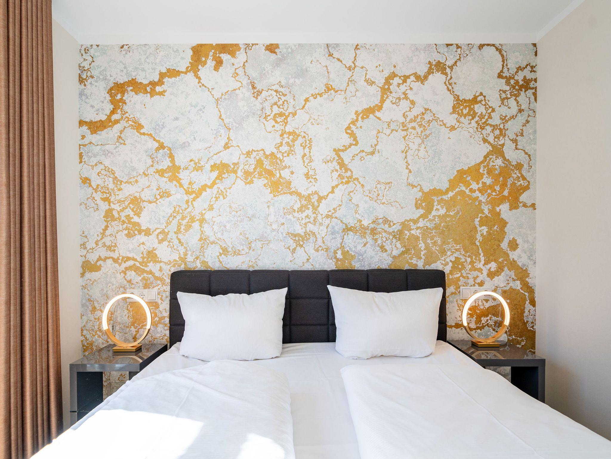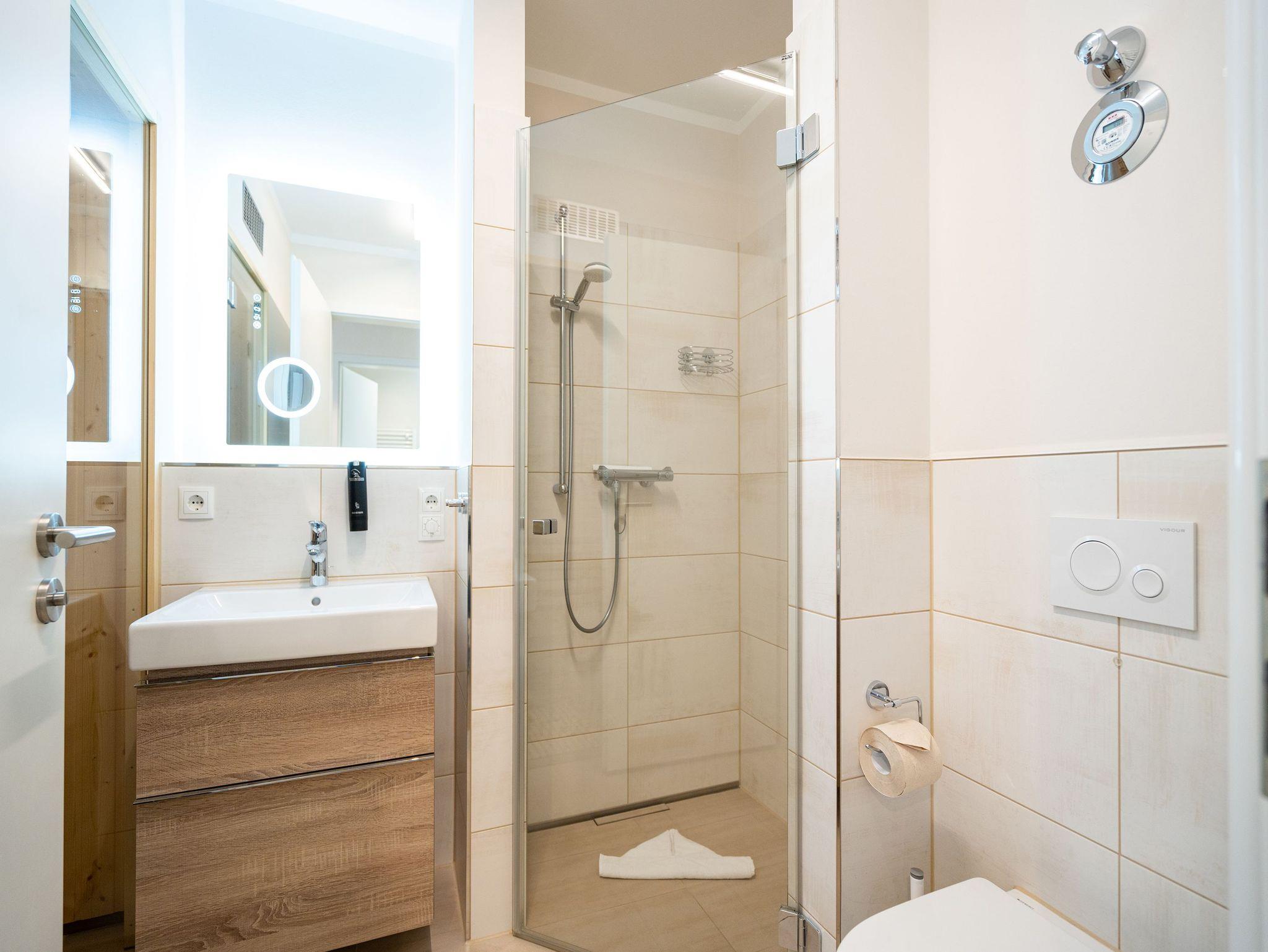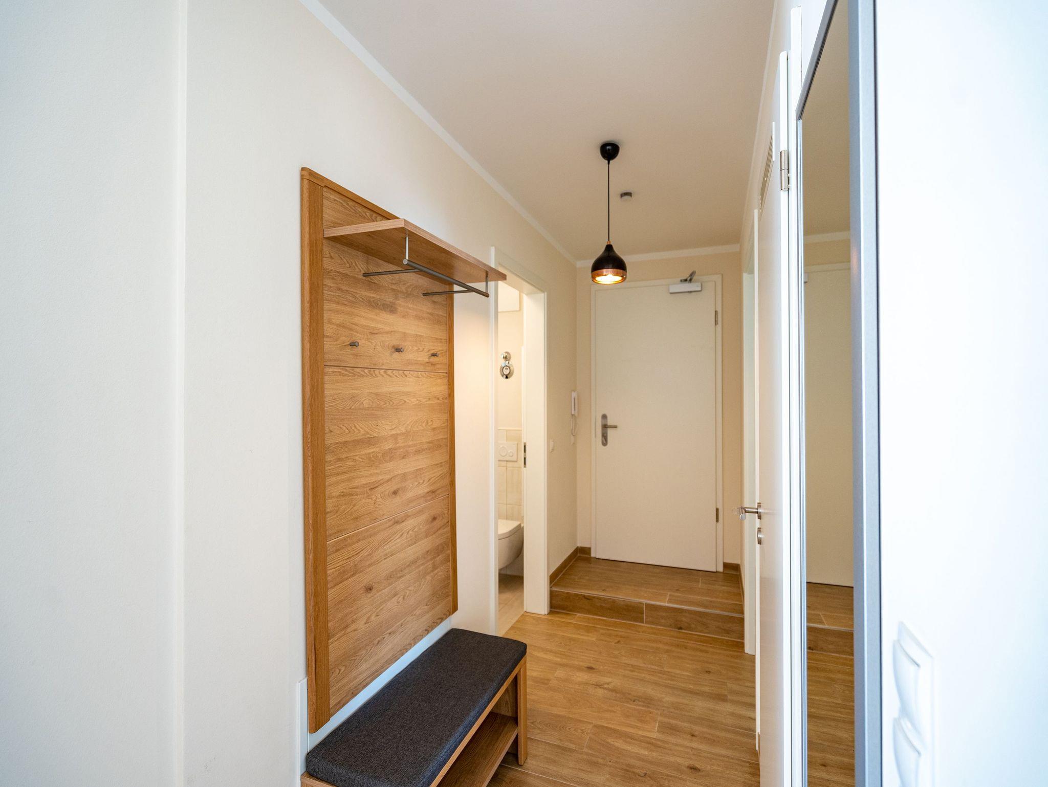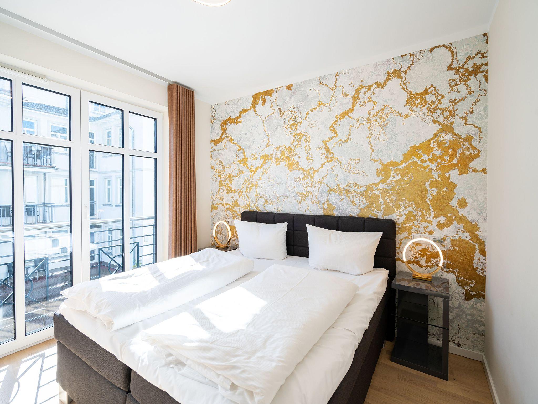 Ein stilvolles Appartement ist die Nummer 8 im ersten Obergeschoss. Für bis zu vier Personen bieten die 74 Quadratmeter viel Platz zum Entspannen und Genießen. Ein großer offener Wohnbereich mit hochwertig und voll ausgestatteter Küchenzeile ist der ideale Ort, um neue Energie zu tanken und mit der Familie oder mit Freunden eine wundervolle Zeit zu verbringen. Eine gemütliche Sofa-Sitz-Landschaft, ein großer Flat-TV, ein Kaminofen und ein schöner Esstisch mit Stühlen ? all das wird Ihre Ostseeauszeit verschönern. Vom Wohnzimmer aus können Sie auf den Balkon (10 Quadratmeter) mit Gartenmöbeln hinaustreten. Lassen Sie es sich hier bei einem erfrischenden Getränk oder einem feinen Essen gut gehen. In der Küche ist alles Nötige vorhanden: Induktionsherd, Geschirrspüler, Mikrowelle, Toaster, Kaffeemaschine, Wasserkocher, Töpfe, Pfannen und edles Porzellan. Das Appartement verfügt über zwei Schlafzimmer, die mit je einem bequemen Boxspringdoppelbett (1,80 m x 2,00 m) und einem geräumigen Kleiderschrank eingerichtet sind. Die bodentiefen Fenster lassen viel Licht in jeden der Räume. Auf das Badezimmer wird es sicher nie einen Ansturm geben, denn es gibt sogar zwei davon. Beide verfügen über Dusche, Föhn und WC. Das Masterbad hält noch eine kleine Überraschung bereit: Eine Finnische Sauna. Genießen Sie Ihre private Wellness-Oase. In einem separaten Hauswirtschaftsraum befindet sich zudem eine Waschmaschine. Handtücher und Bettbezüge gehören zum Preis dazu. Auch das WLAN ist inklusive. In der Tiefgarage gehört zur Wohnung der Stellplatz Nr. 8. Außerdem gibt es dort einen Fahrradraum.