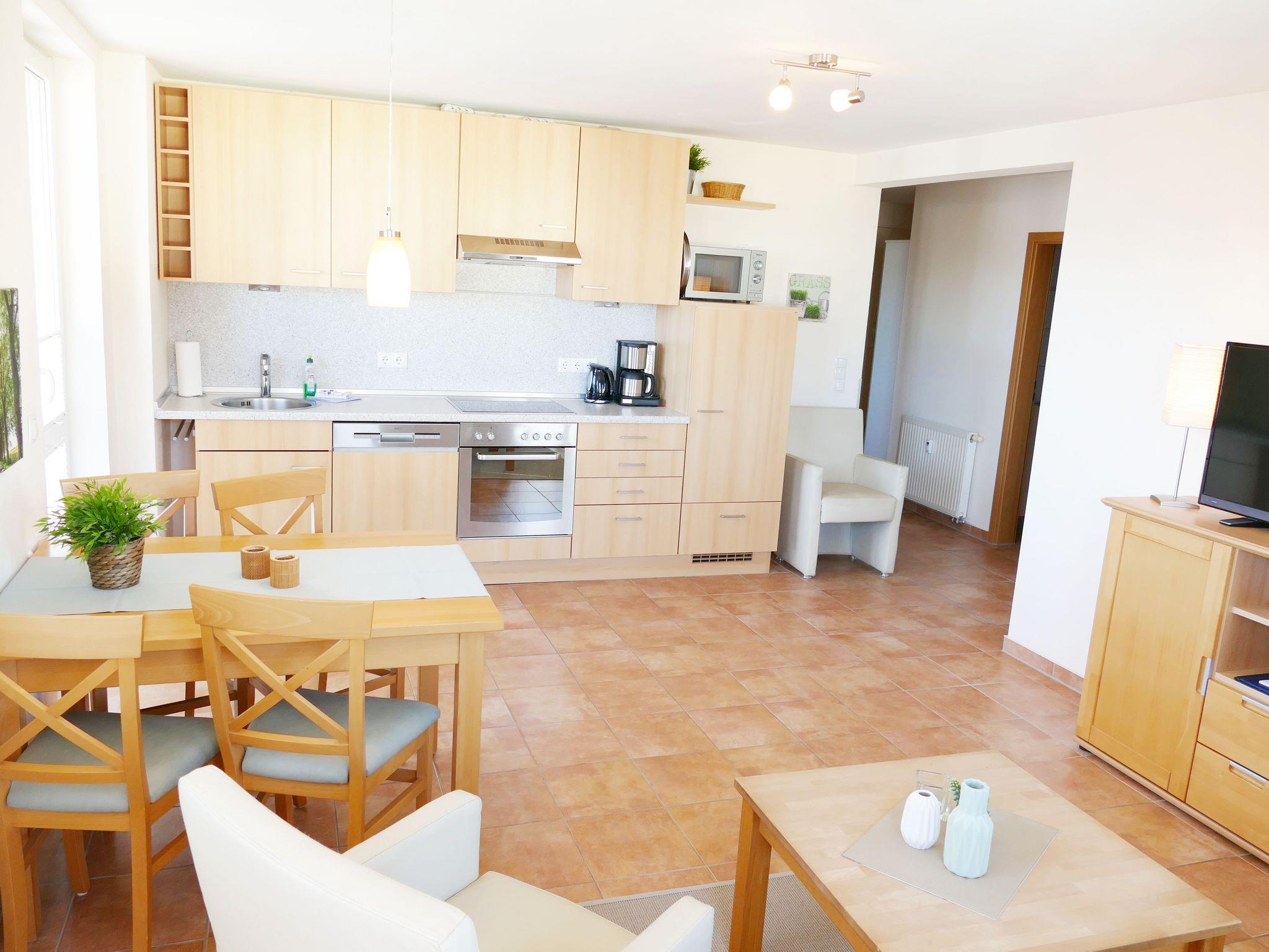 Die helle und freundliche Ferienwohnung in der dritten Etage des Neubaus der Villa Linquenda bietet auf 63 m² komfortablen Platz für bis zu vier Personen. Die hochwertig eingerichtete Wohnung verfügt über einen gemütlichen Wohnbereich mit Sitzgruppe und Flat-TV sowie eine komplett ausgestattete Küchenzeile.