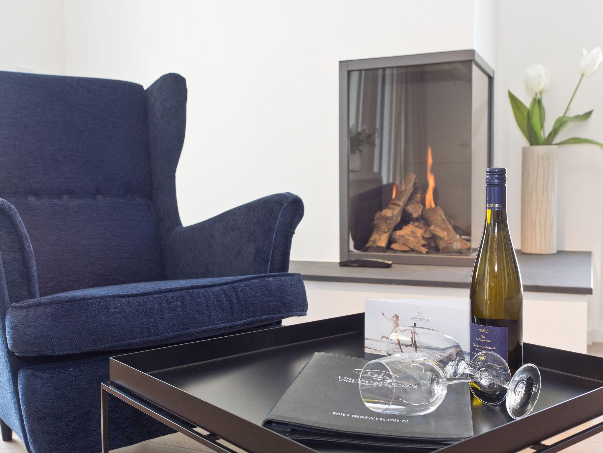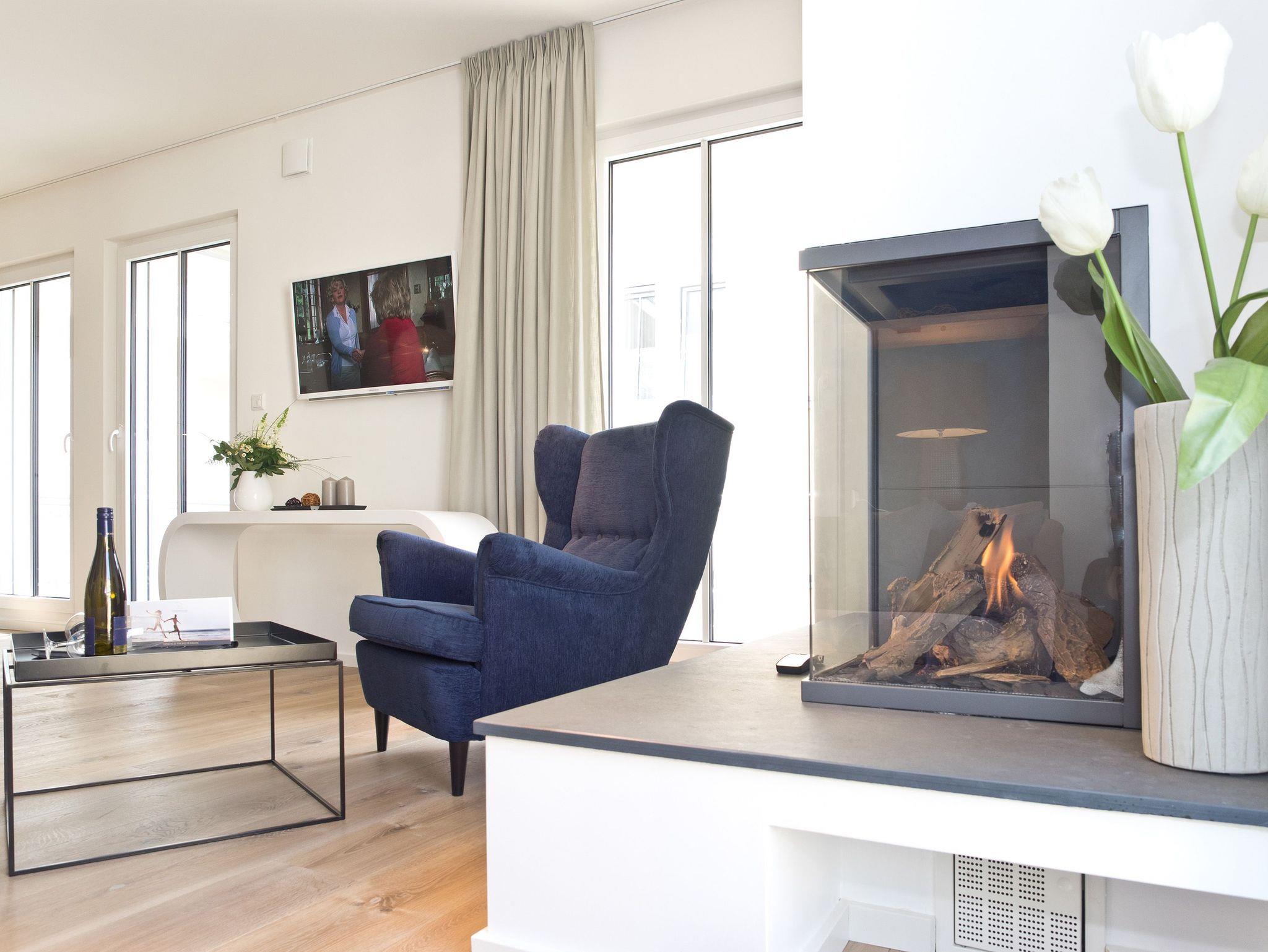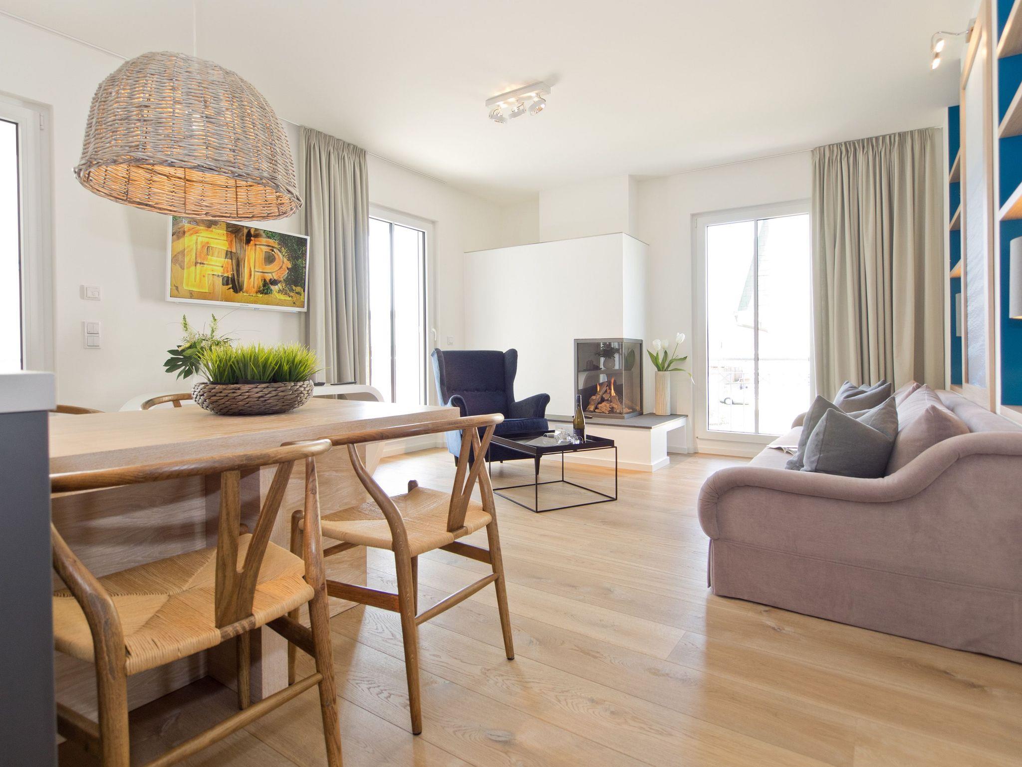 Hier ist Wohlfühlen Programm! Die stylische 3-Raum-Ferienwohnung (88 qm) im 1. Obergeschoss des Vorderhauses im Dünenpalais wird Sie begeistern! Harmonische Farben und Stoffe, edle Holzdielen, wertige Einbauten und ein ausgezeichneter Innenarchitektengeschmack inklusive! Der helle Wohnbereich mit gemütlicher Sitzgruppe, Flat-TV und modernem Design-Gaskamin (per Fernbedienung zu nutzen) schließt sich die offene Küche mit Essplatz an. Zwei Schlafzimmer mit Einbauten und hochwertigen Boxspringbetten (1,80 m x 2,20 m) sorgen für bequemen Schlafkomfort (1 Schlafzimmer mit Flat-TV). Im Bad mit Waschtisch und WC ist die wohnungseigene Sauna integriert, ein Highlight nicht nur in der kalten Jahreszeit. Auf dem Südbalkon lässt es sich entspannt auf 2 Liegen Relaxen. Ein Pkw-Stellplatz steht vor dem Haus zur Verfügung. Für Ihren Komfort steht die Erstausstattung Wäsche für Sie bereit. Für Kleinkinder können ein Babyreisebett (ohne Matratze und Kinderbettzeug) und ein Kinderhochstuhl gegen einen Aufpreis bestellt werden.