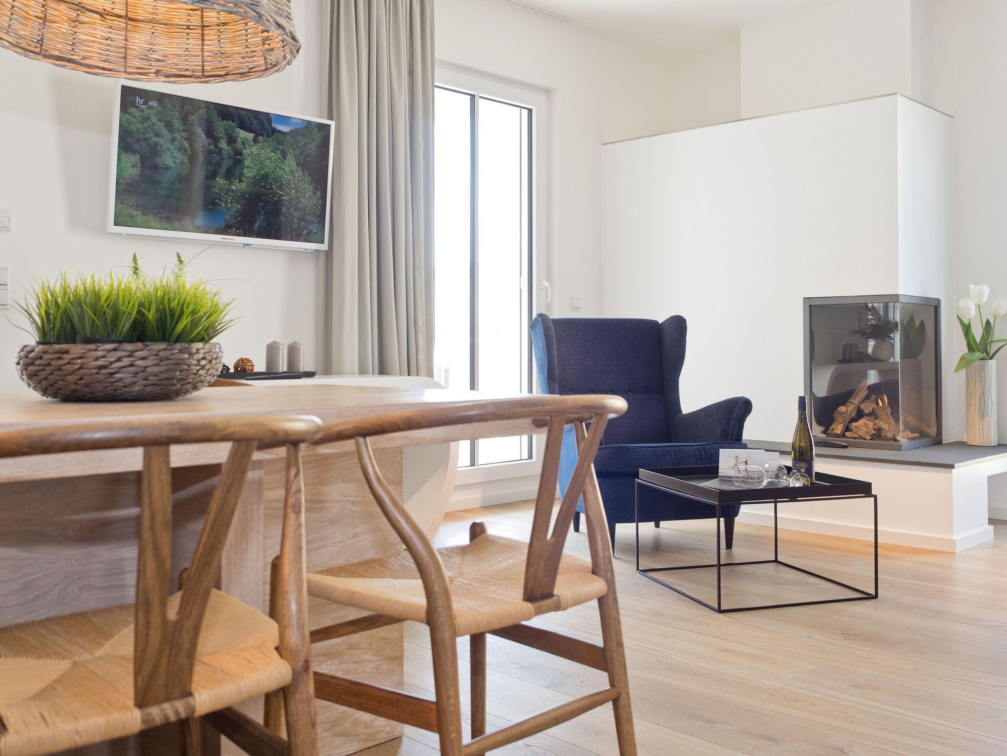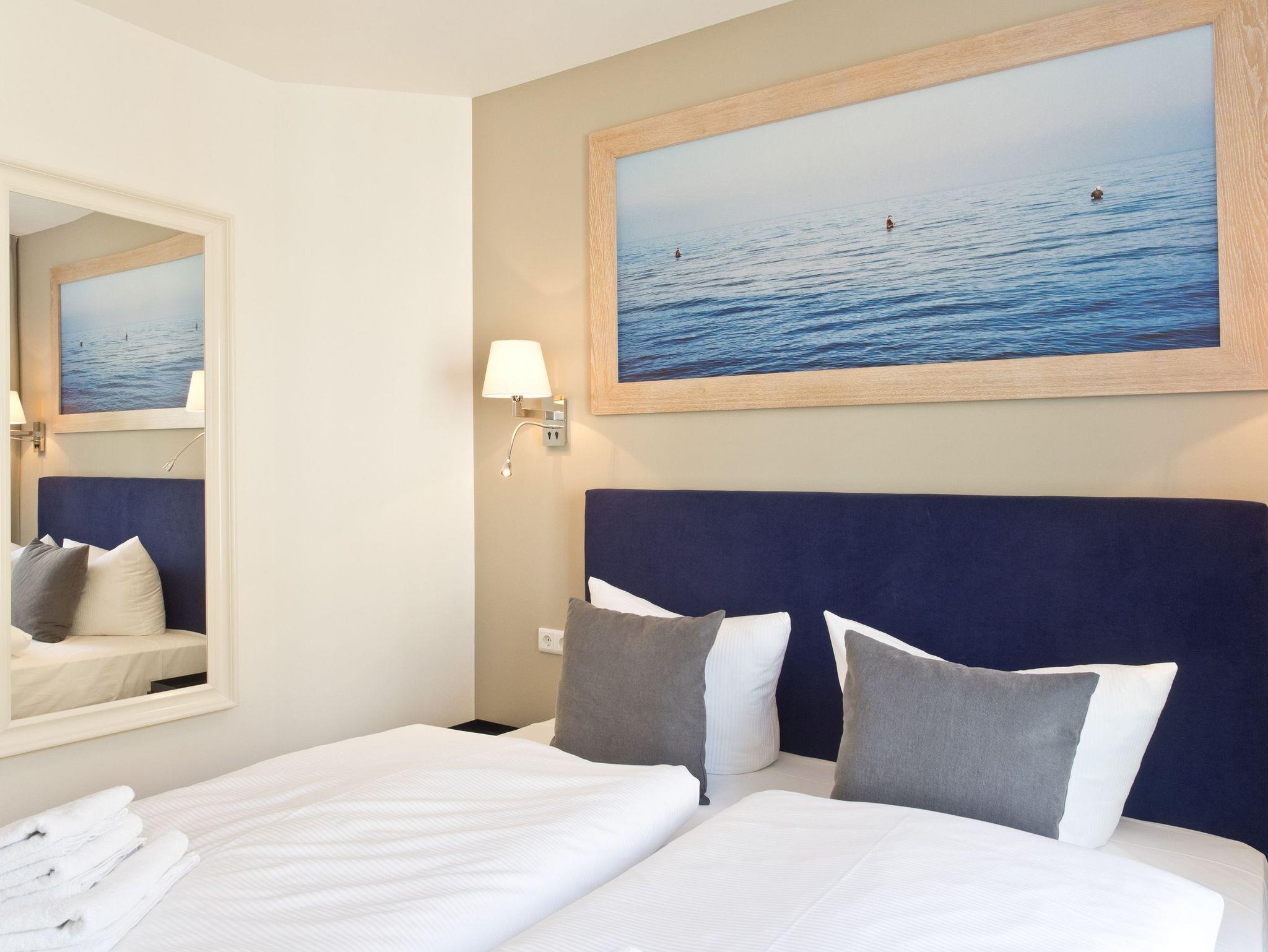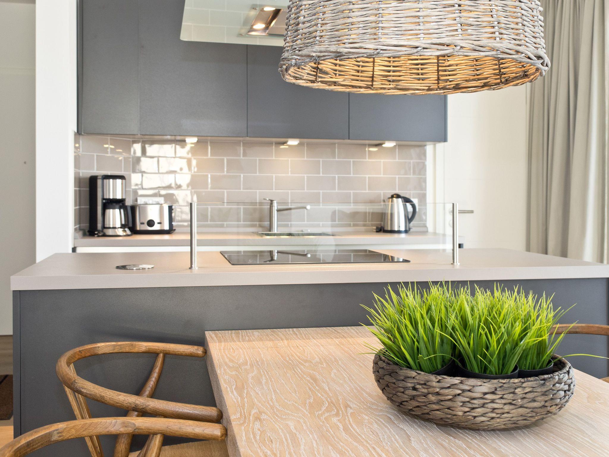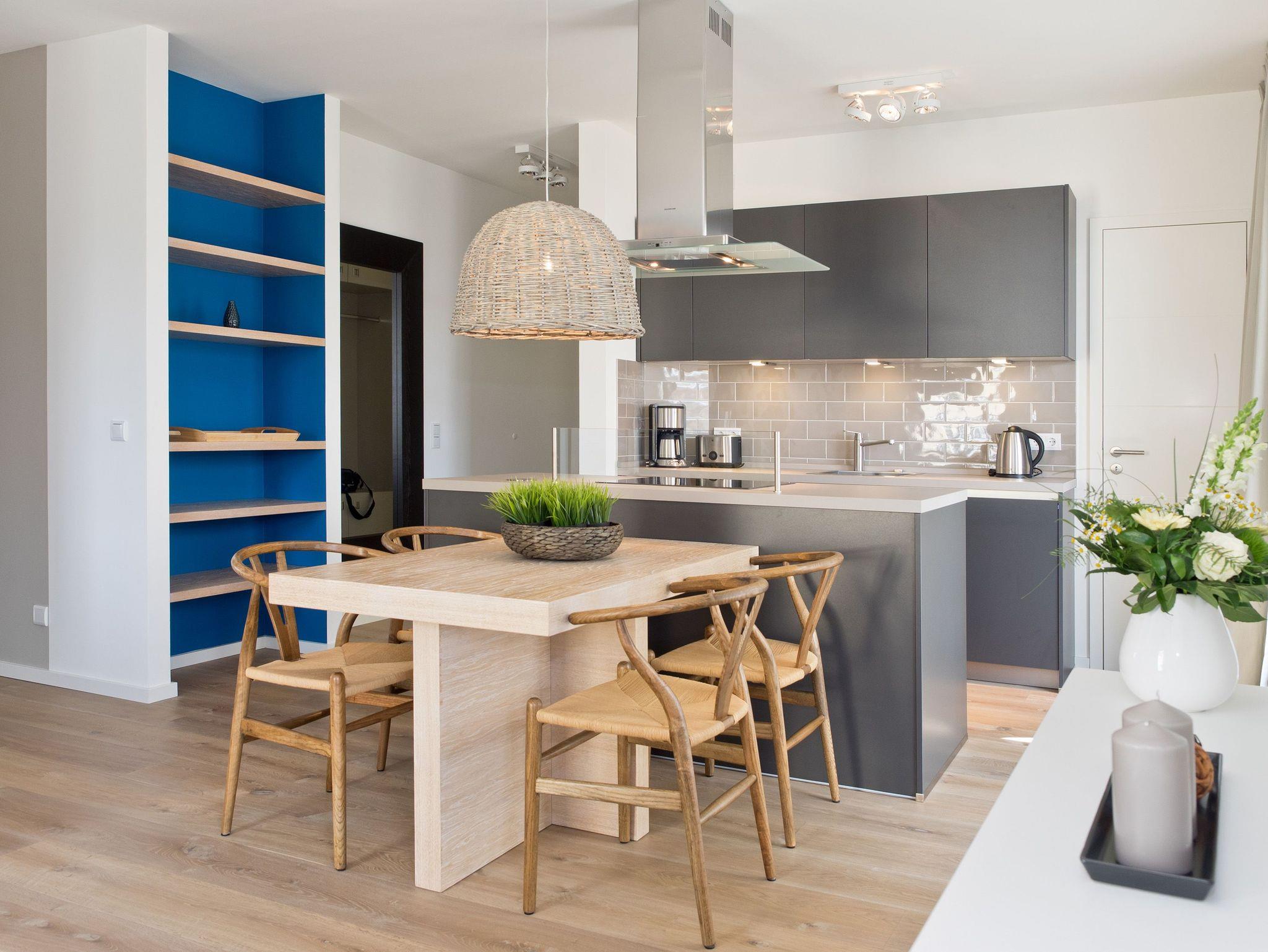 Hier ist Wohlfühlen Programm! Die stylische 3-Raum-Ferienwohnung (88 qm) im 1. Obergeschoss des Vorderhauses im Dünenpalais wird Sie begeistern! Harmonische Farben und Stoffe, edle Holzdielen, wertige Einbauten und ein ausgezeichneter Innenarchitektengeschmack inklusive! Der helle Wohnbereich mit gemütlicher Sitzgruppe, Flat-TV und modernem Design-Gaskamin (per Fernbedienung zu nutzen) schließt sich die offene Küche mit Essplatz an. Zwei Schlafzimmer mit Einbauten und hochwertigen Boxspringbetten (1,80 m x 2,20 m) sorgen für bequemen Schlafkomfort (1 Schlafzimmer mit Flat-TV). Im Bad mit Waschtisch und WC ist die wohnungseigene Sauna integriert, ein Highlight nicht nur in der kalten Jahreszeit. Auf dem Südbalkon lässt es sich entspannt auf 2 Liegen Relaxen. Ein Pkw-Stellplatz steht vor dem Haus zur Verfügung. Für Ihren Komfort steht die Erstausstattung Wäsche für Sie bereit. Für Kleinkinder können ein Babyreisebett (ohne Matratze und Kinderbettzeug) und ein Kinderhochstuhl gegen einen Aufpreis bestellt werden.