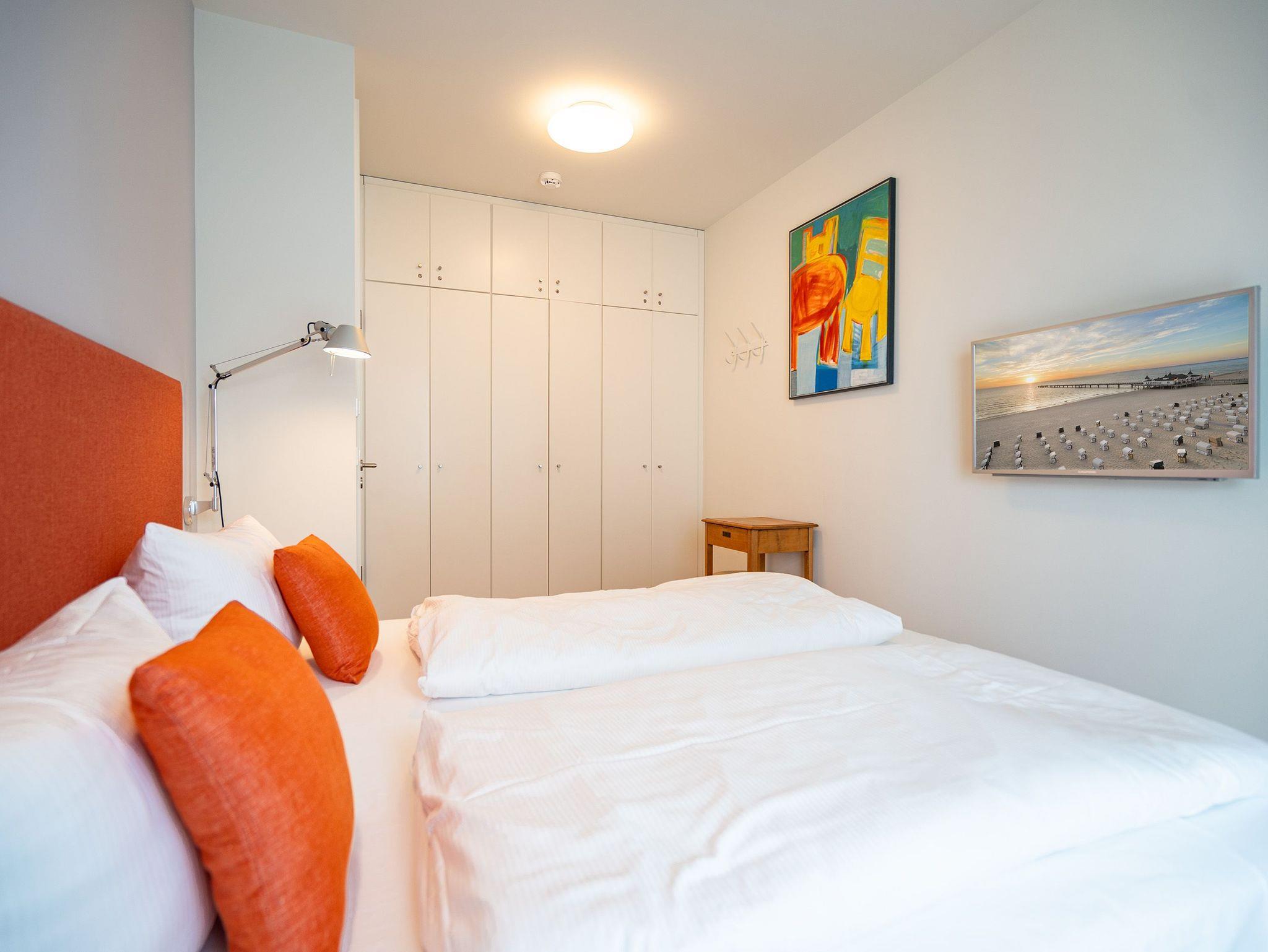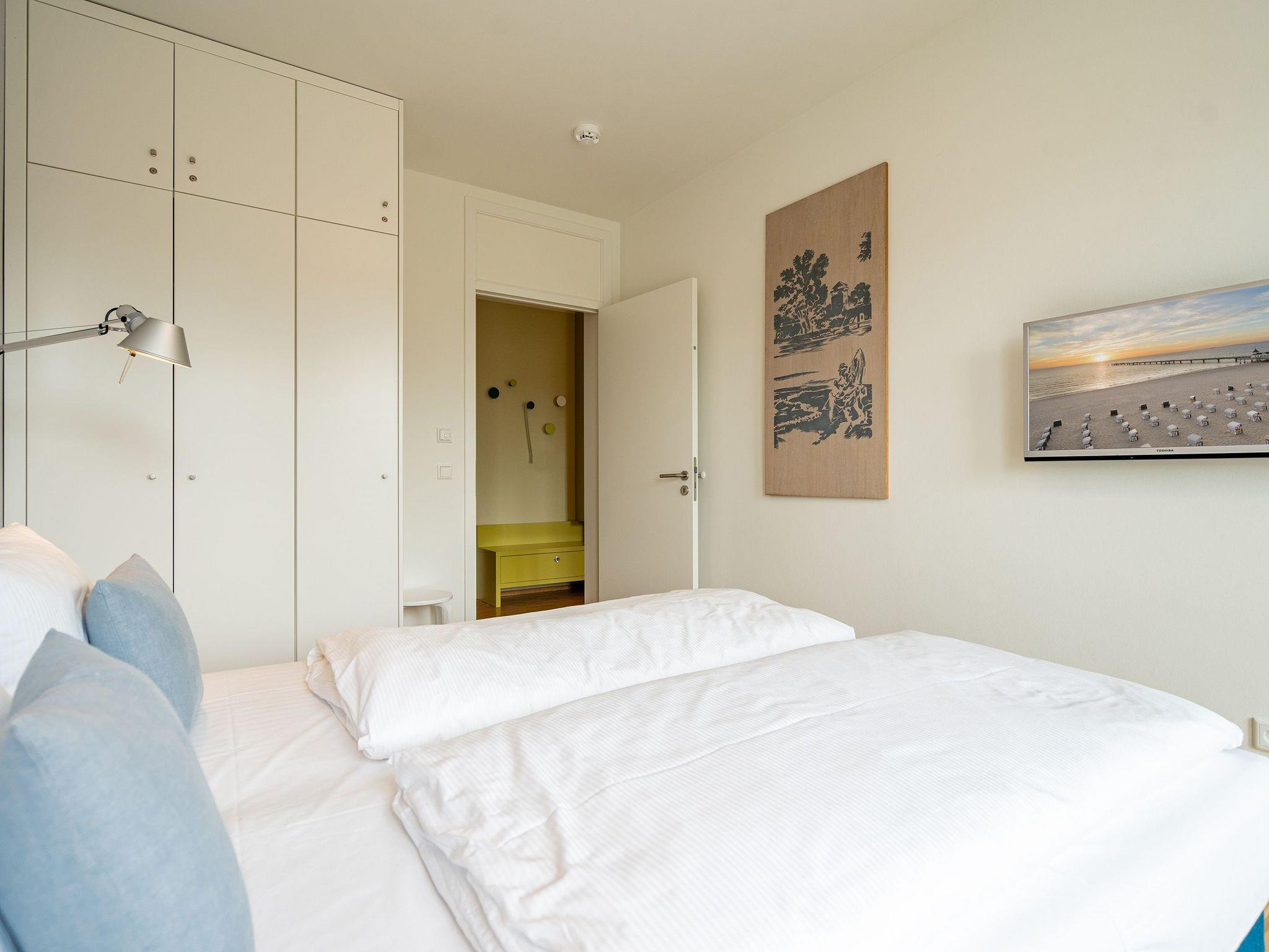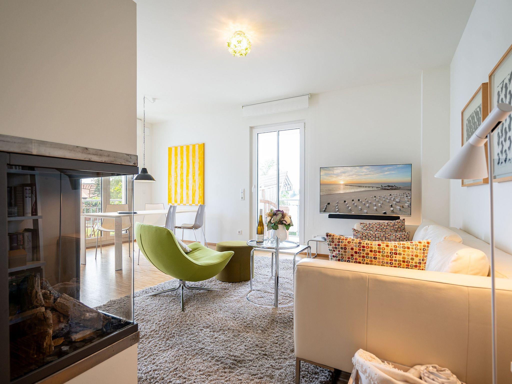 Design at its best: Im Südhaus des Dünenpalais erwartet Sie eine stylische 3-Raum-Ferienwohnung für bis zu 4 Personen (und 1 Kleinkind bis 3 Jahre im Kinderreisebett.) Parkettböden in den Wohnräumen, deckenhohe Einbauten und Türen, Designermöbel, Originalkunst und ein durchdachtes Lichtkonzept machen dieses Domizil zu etwas Besonderem. Schon beim Eintreten begrüßt Sie der farblich gestaltete Eingangsbereich mit großem Spiegel und moderner Bank. Der lichtdurchflutete offene Wohnbereich mit bequemer Ledercouch, großem Esstisch und einer angrenzenden, wohnlich gestalteten Küche mit viel Arbeitsfläche ist wunderschön. An kühlen Abenden und in der kalten Jahreszeit sorgt der mit Fernbedienung zu nutzende Gaskamin für wohlige Wärme. In allen Zimmern hängen Flat-TV und Sie können das WLAN kostenfrei nutzen. Die beiden gemütlichen Schlafzimmer haben Boxspring-Doppelbetten, geräumige Einbauschränke und Verdunkelungsvorhänge. Das komfortable Bad hat eine bodengleiche große Glasdusche mit Schwall- und Handbrause und viel Ablagefläche. Von allen Zimmern aus haben Sie Zugang zu den Balkonen. Wer keine Lust auf Strand hat, macht es sich auf dem großen, sonnigen Südwestbalkon gemütlich. Zum Frühstück in der Morgensonne lädt der zweite geräumige Balkon ein. Für Ihren Komfort sind die Betten bei der Anreise bezogen und Handtücher liegen bereit. (Auf Wunsch stellen wir Ihnen ein Kinderreisebett, ohne Matratze, ohne Bettzeug, und einen Kinderhochstuhl gegen Aufpreis zur Verfügung.) Für das Auto gibt es einen Stellplatz in der Tiefgarage mit direktem Zugang zum Aufzug.