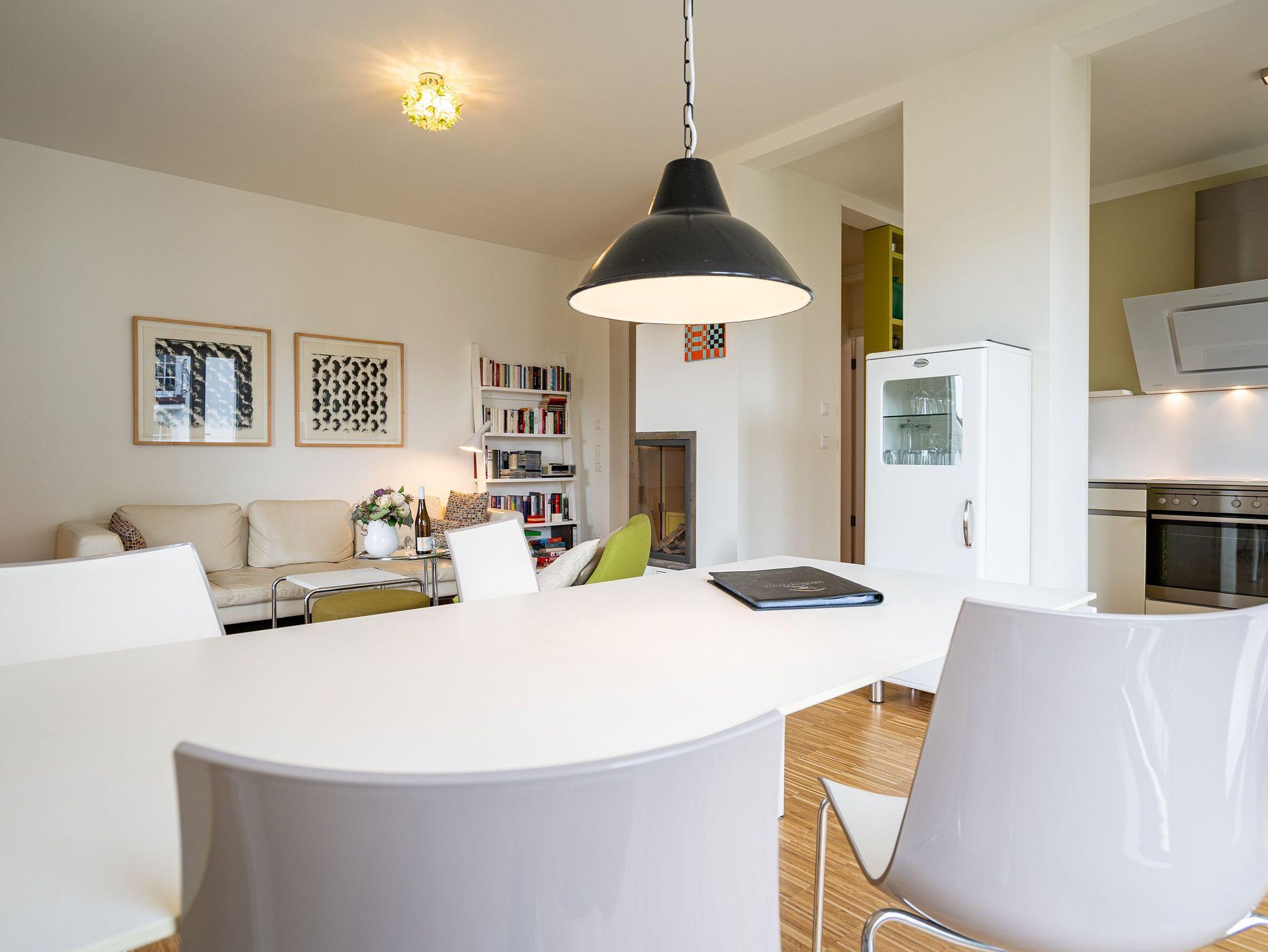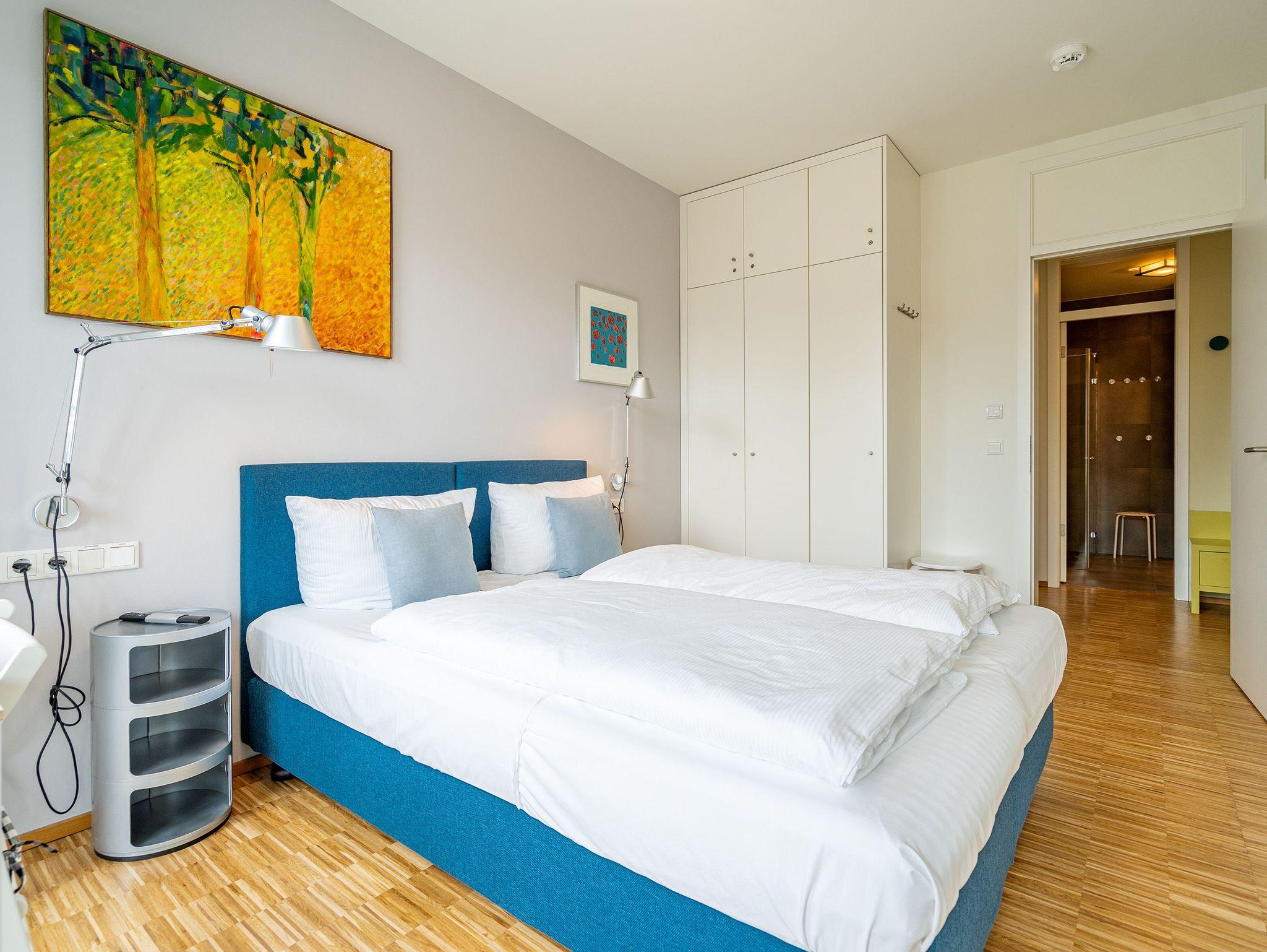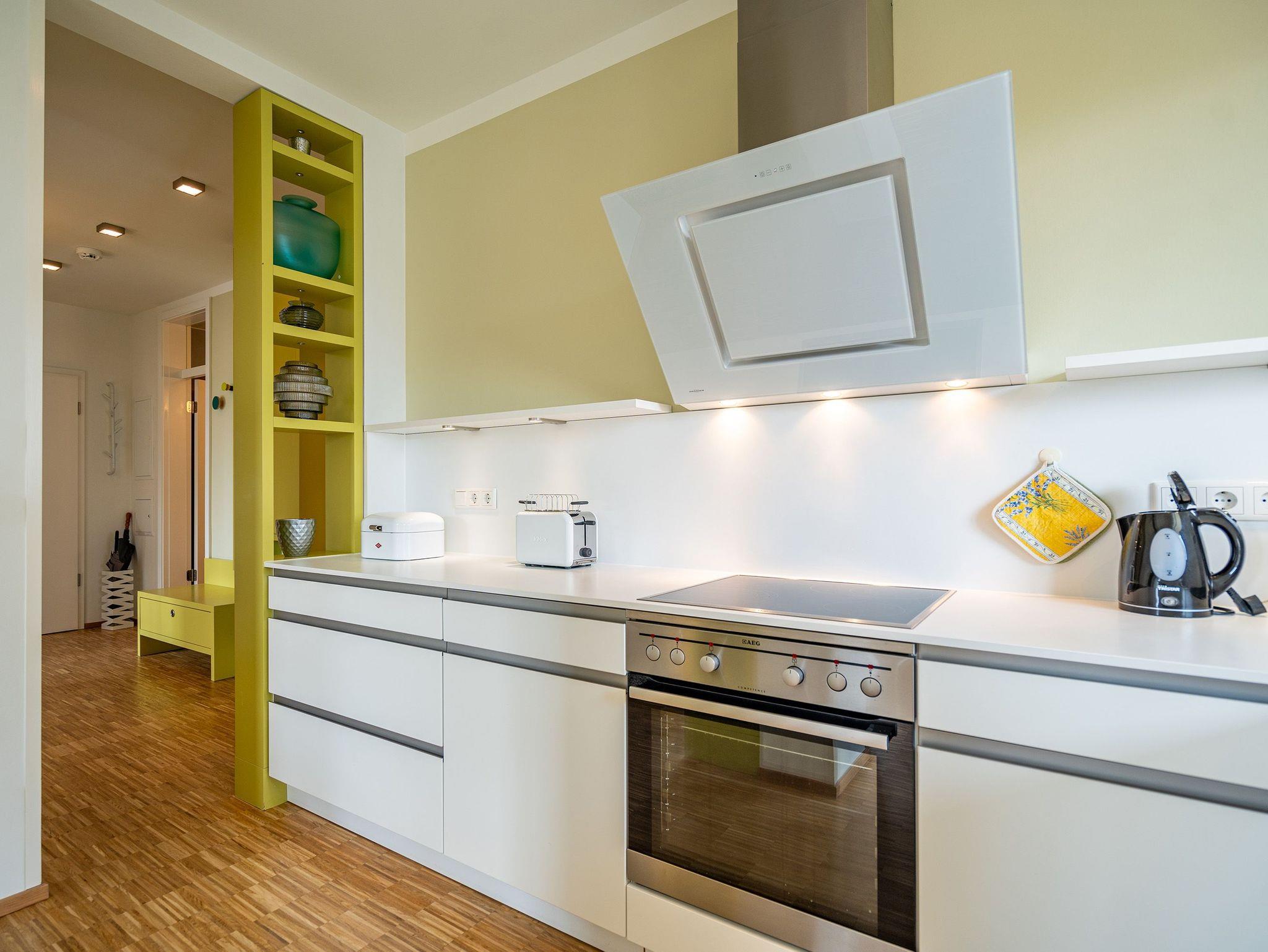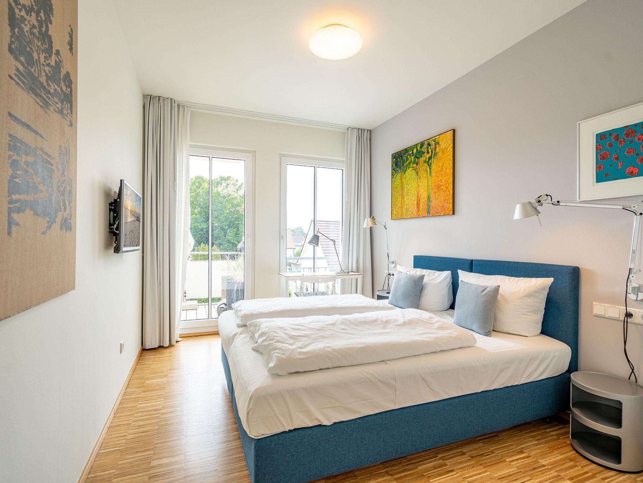 Design at its best: Im Südhaus des Dünenpalais erwartet Sie eine stylische 3-Raum-Ferienwohnung für bis zu 4 Personen (und 1 Kleinkind bis 3 Jahre im Kinderreisebett.) Parkettböden in den Wohnräumen, deckenhohe Einbauten und Türen, Designermöbel, Originalkunst und ein durchdachtes Lichtkonzept machen dieses Domizil zu etwas Besonderem. Schon beim Eintreten begrüßt Sie der farblich gestaltete Eingangsbereich mit großem Spiegel und moderner Bank. Der lichtdurchflutete offene Wohnbereich mit bequemer Ledercouch, großem Esstisch und einer angrenzenden, wohnlich gestalteten Küche mit viel Arbeitsfläche ist wunderschön. An kühlen Abenden und in der kalten Jahreszeit sorgt der mit Fernbedienung zu nutzende Gaskamin für wohlige Wärme. In allen Zimmern hängen Flat-TV und Sie können das WLAN kostenfrei nutzen. Die beiden gemütlichen Schlafzimmer haben Boxspring-Doppelbetten, geräumige Einbauschränke und Verdunkelungsvorhänge. Das komfortable Bad hat eine bodengleiche große Glasdusche mit Schwall- und Handbrause und viel Ablagefläche. Von allen Zimmern aus haben Sie Zugang zu den Balkonen. Wer keine Lust auf Strand hat, macht es sich auf dem großen, sonnigen Südwestbalkon gemütlich. Zum Frühstück in der Morgensonne lädt der zweite geräumige Balkon ein. Für Ihren Komfort sind die Betten bei der Anreise bezogen und Handtücher liegen bereit. (Auf Wunsch stellen wir Ihnen ein Kinderreisebett, ohne Matratze, ohne Bettzeug, und einen Kinderhochstuhl gegen Aufpreis zur Verfügung.) Für das Auto gibt es einen Stellplatz in der Tiefgarage mit direktem Zugang zum Aufzug.