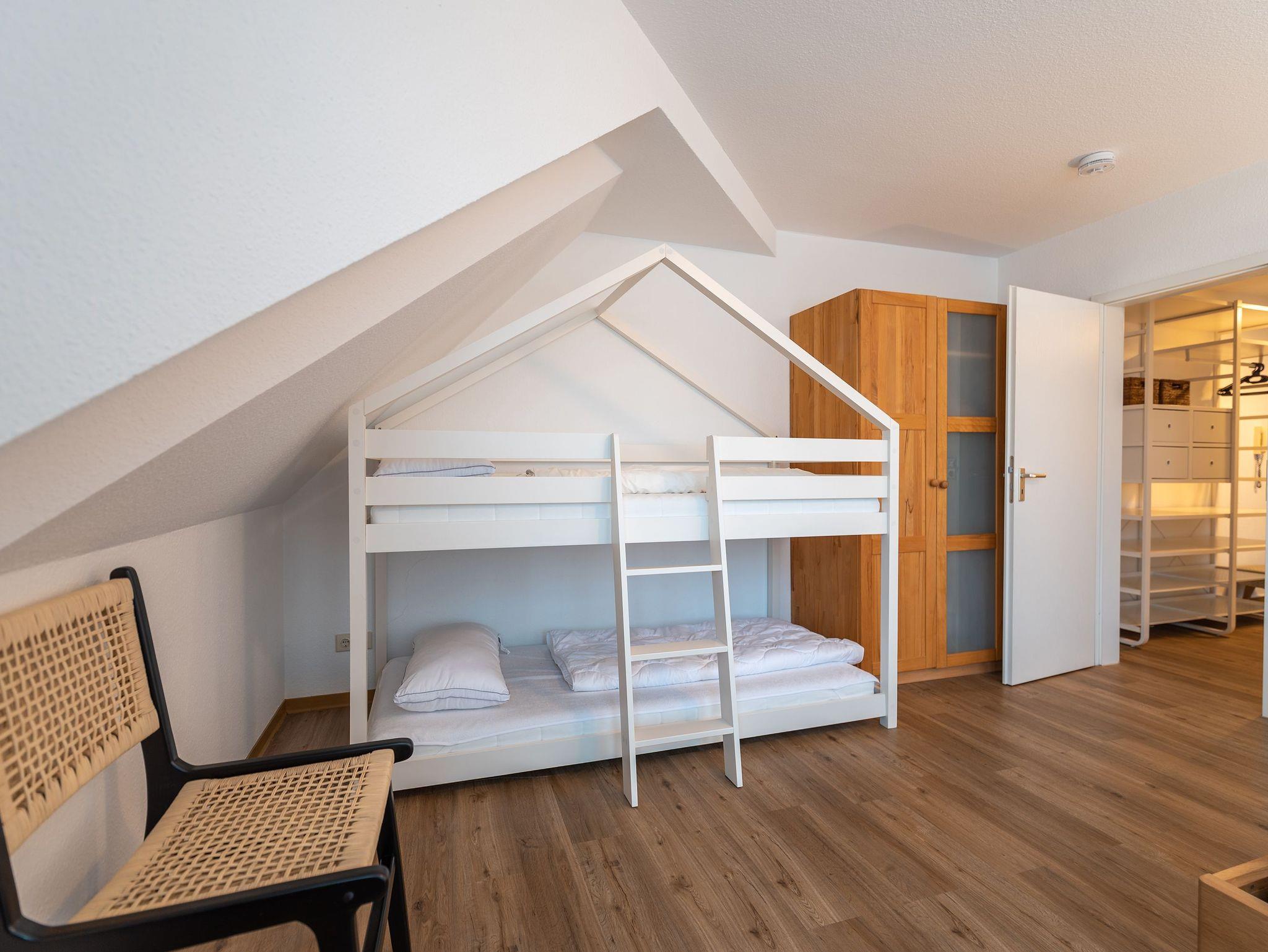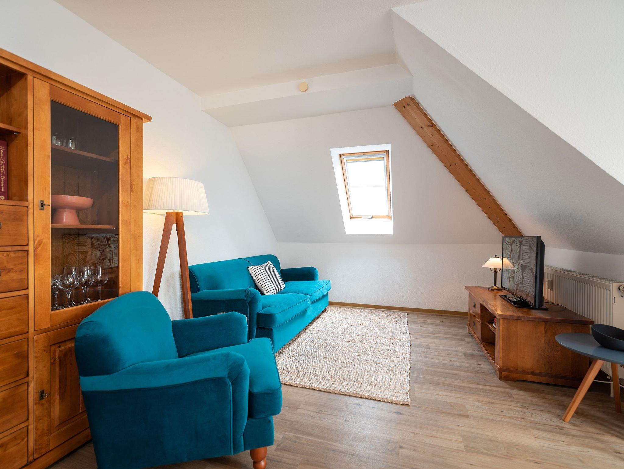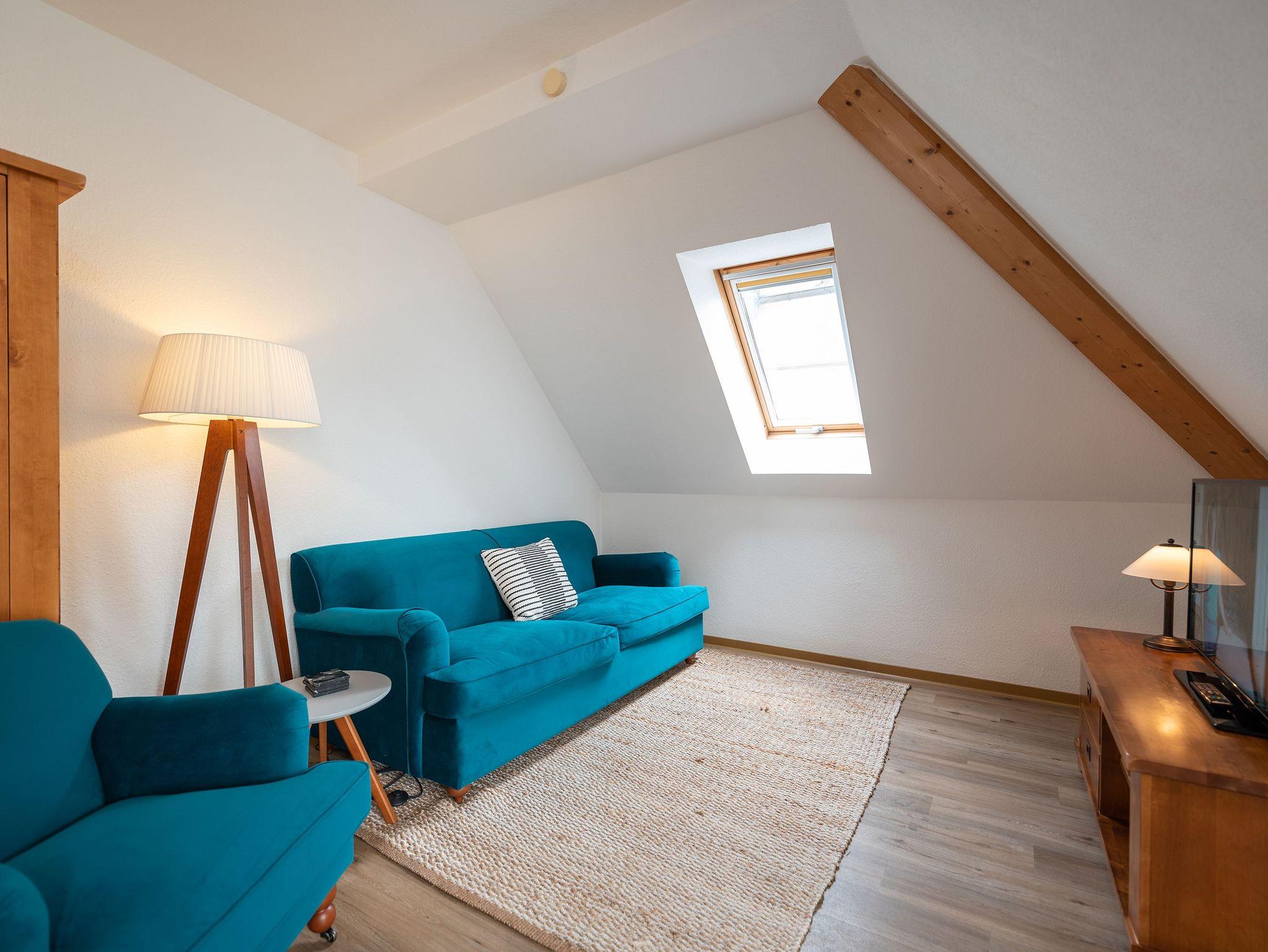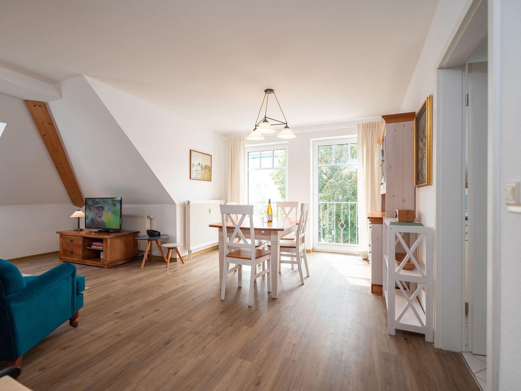 Das Appartement befindet sich im 2. Obergeschoss des Anbaus und bietet auf 64 qm eine einladende Atmosphäre für zwei Erwachsene und zwei Kinder, ideal für Familienurlaube. Der offene Wohnbereich ist mit einem gemütlichen Sofa, einem Sessel und einem Flat-TV ausgestattet, perfekt für entspannte Abende. Ein angrenzender Essbereich bietet Platz für vier Personen, direkt neben der voll ausgestatteten Küche, die keine Wünsche offenlässt.