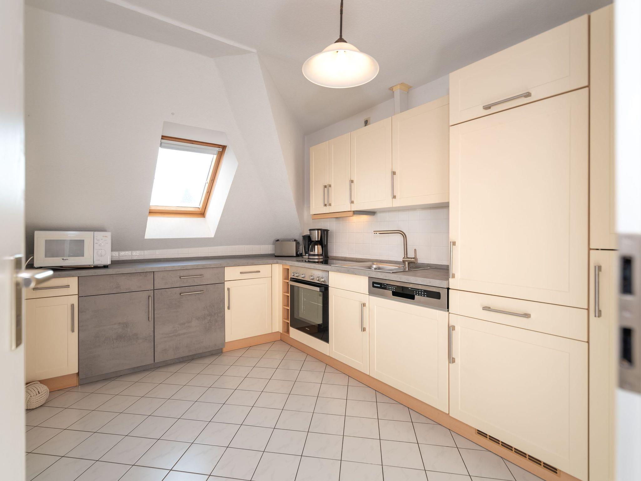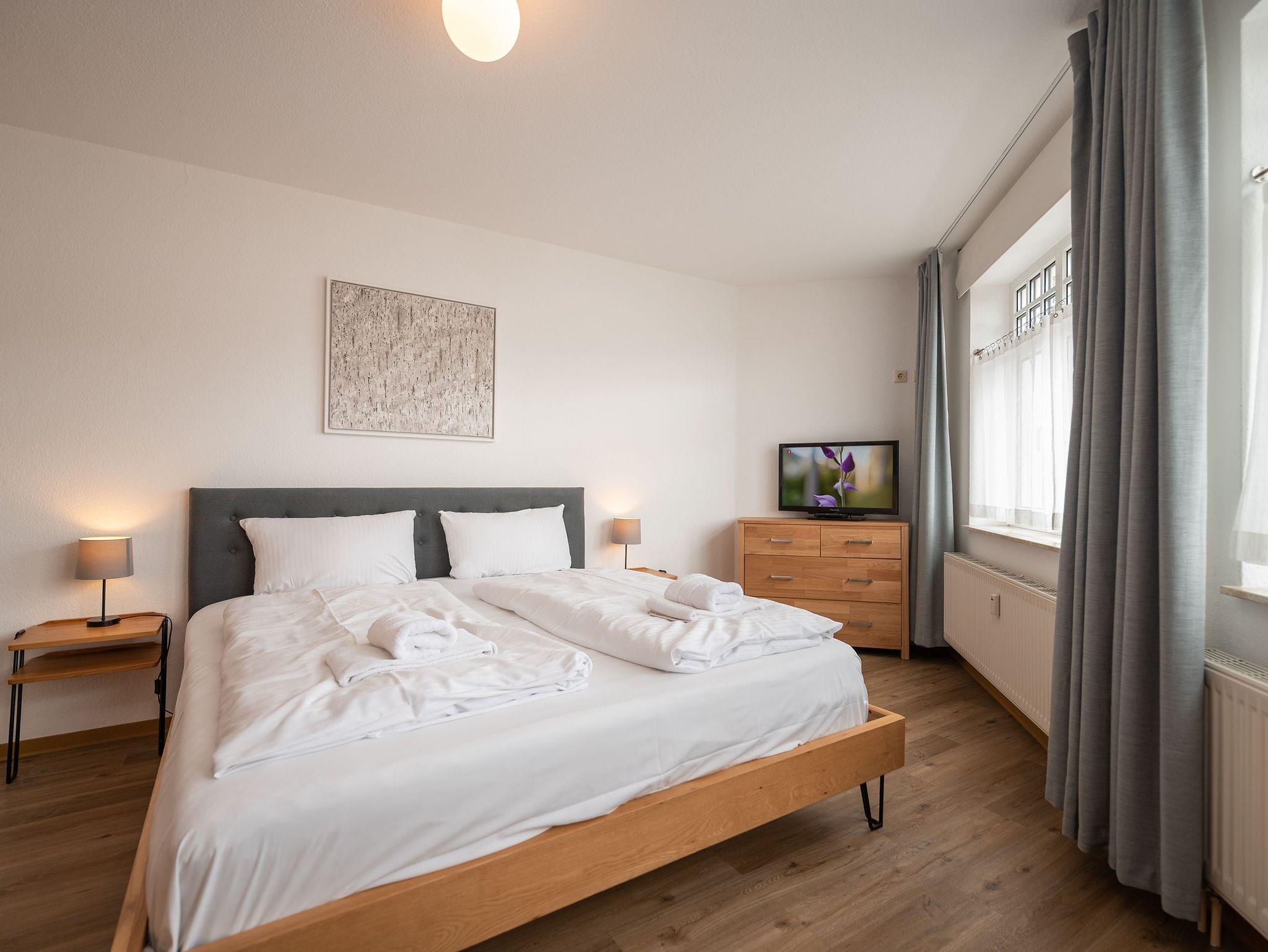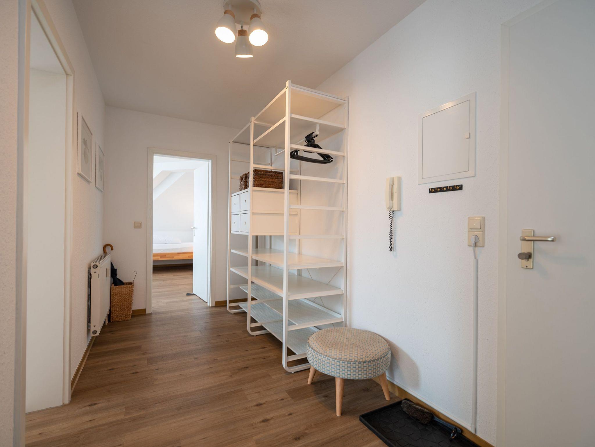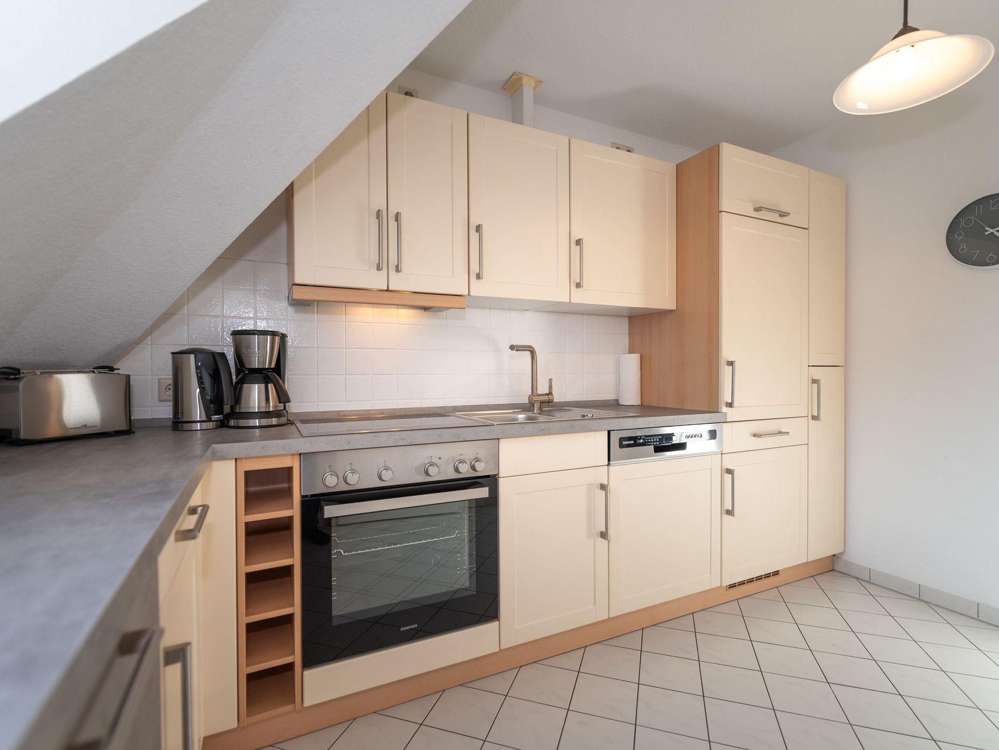 Das Appartement befindet sich im 2. Obergeschoss des Anbaus und bietet auf 64 qm eine einladende Atmosphäre für zwei Erwachsene und zwei Kinder, ideal für Familienurlaube. Der offene Wohnbereich ist mit einem gemütlichen Sofa, einem Sessel und einem Flat-TV ausgestattet, perfekt für entspannte Abende. Ein angrenzender Essbereich bietet Platz für vier Personen, direkt neben der voll ausgestatteten Küche, die keine Wünsche offenlässt.