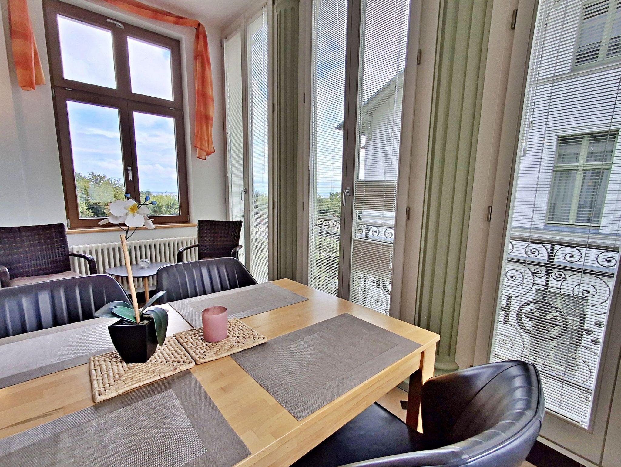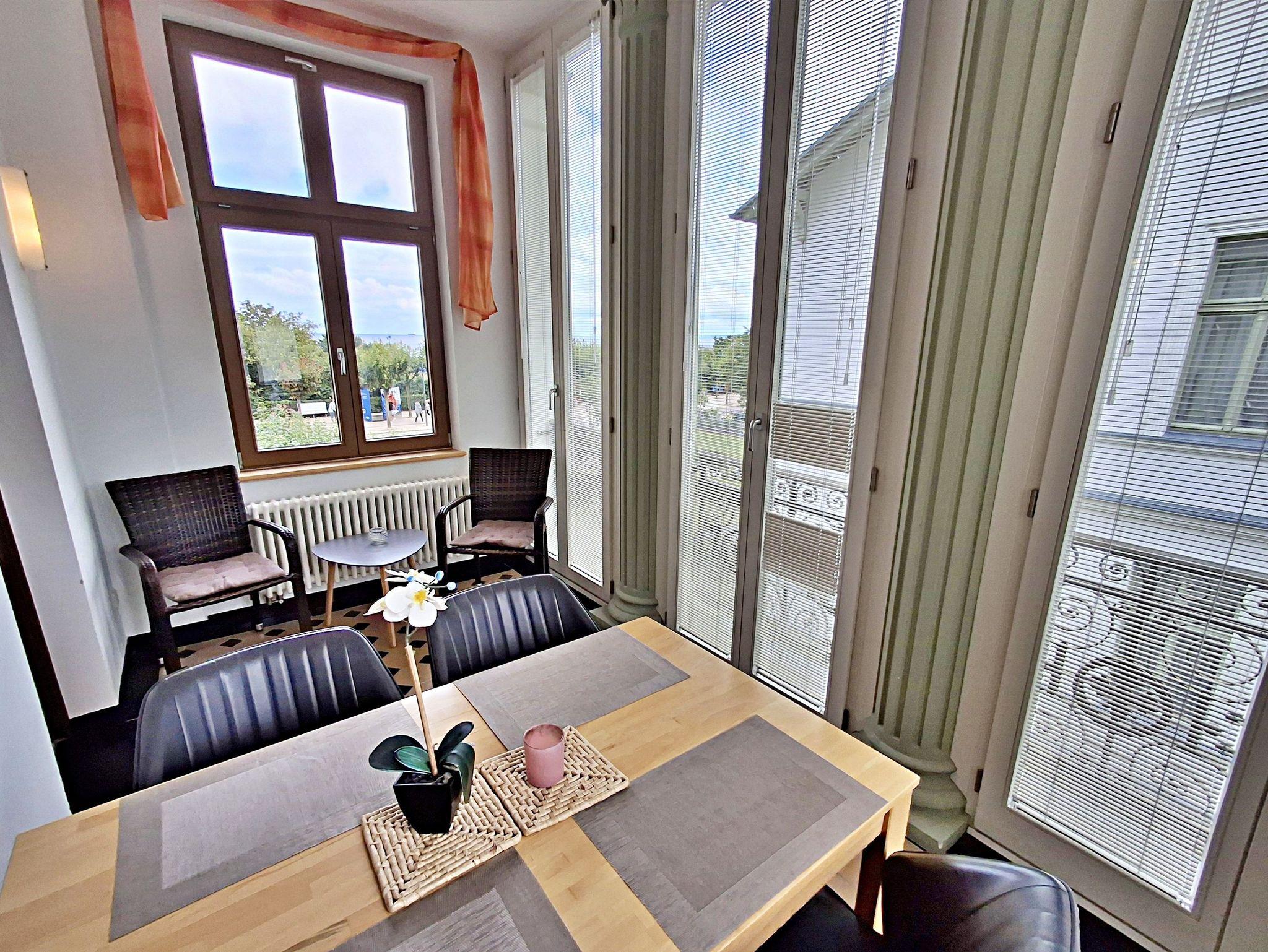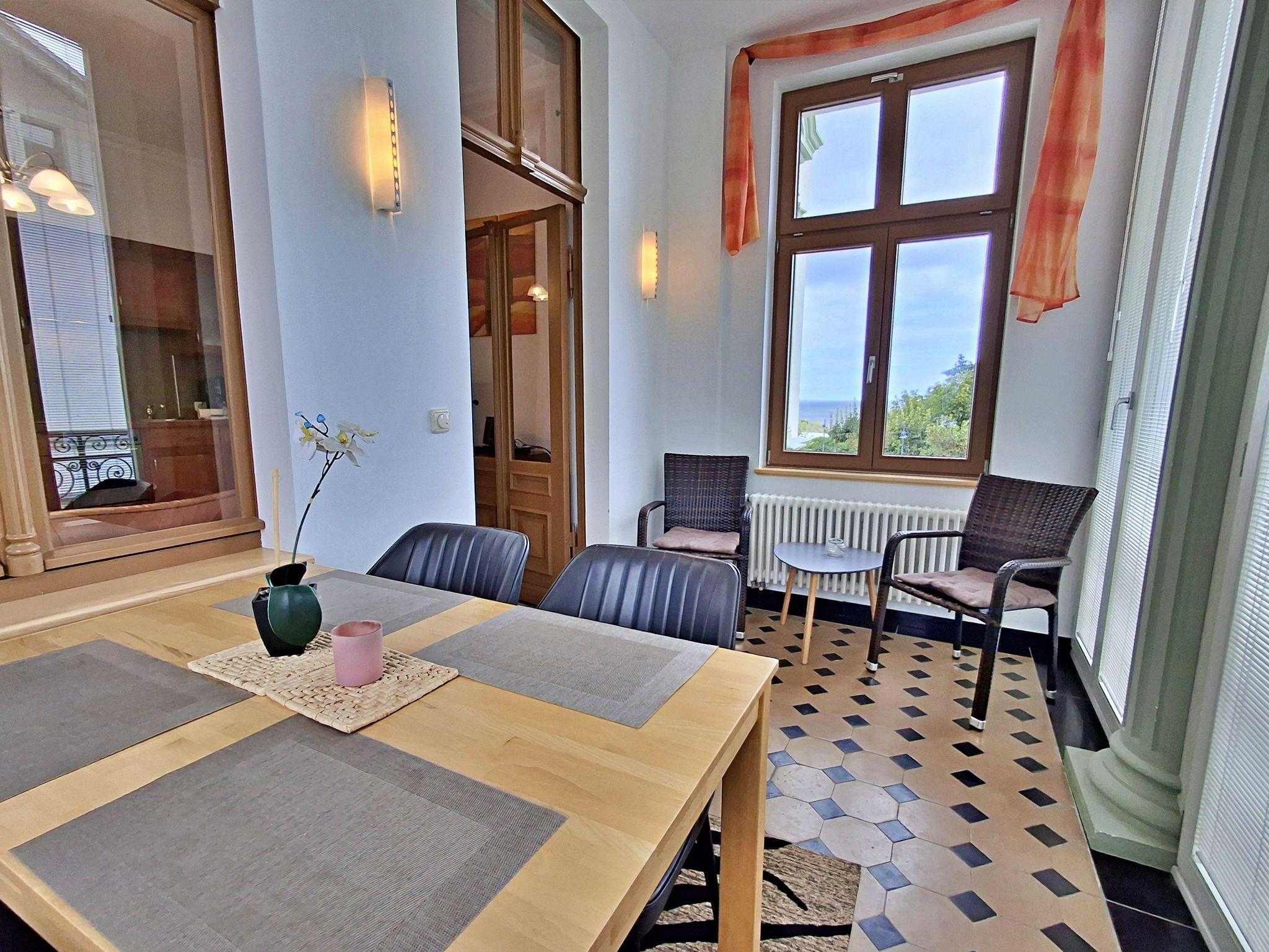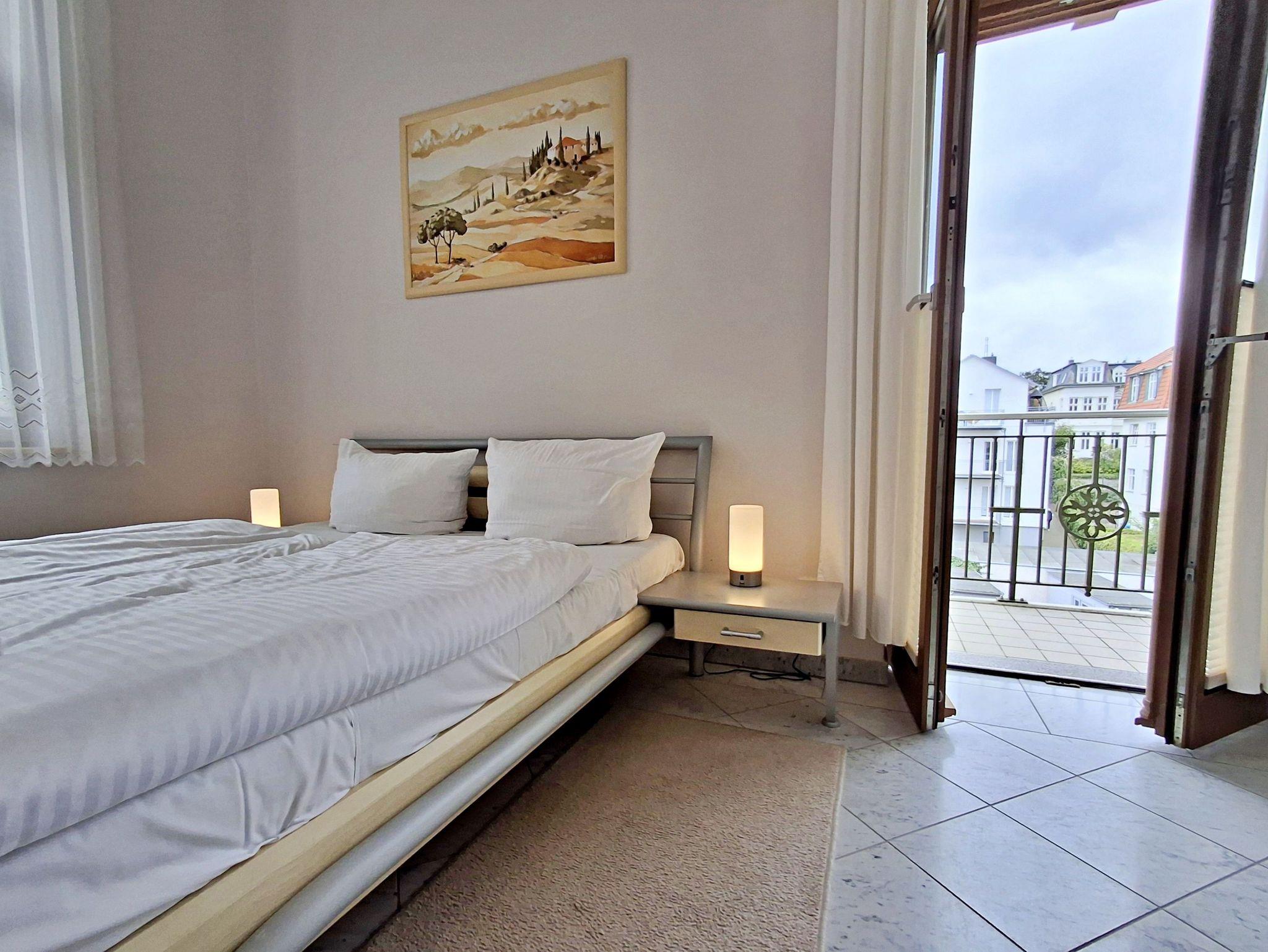 Herzlich willkommen in der Wohnung Nr. 4 der Villa Bella! Diese charmante Unterkunft befindet sich im 1. Obergeschoss des Hauptgebäudes und ist bequem über 1,5 Treppen erreichbar. Mit einer großzügigen Fläche von 64 m² bietet die Wohnung Platz für bis zu 4 Personen, um einen angenehmen Aufenthalt zu verbringen. Der kombinierte Wohn- und Küchenbereich ist komfortabel eingerichtet und lädt zum Verweilen ein. Die speziell angefertigte Küchenzeile fügt sich harmonisch in das geschmackvolle Ambiente ein und ist mit allen notwendigen Einbaugeräten ausgestattet. Genießen Sie Ihre Mahlzeiten in der Loggia, wo Sie einen tollen Blick auf die Promenade und die Ostsee haben. Die Wohnung verfügt über zwei separate Schlafzimmer, die beide mit gemütlichen Doppelbetten ausgestattet sind und entweder einen Blick auf das Meer oder zur Südseite mit Balkon bieten. Das stilvolle Bad ist mit grün-weißem Marmor gestaltet und bietet eine Dusche sowie WC. Für Ihre Wäsche stehen Ihnen Waschmaschine und Wäschetrockner in einem separaten Raum der Villa zur Verfügung, die gegen Gebühr genutzt werden können. Zudem haben Sie auf dem Grundstück einen eigenen Pkw-Stellplatz sowie einen verschließbaren Abstellraum für Fahrräder oder Zweiradfahrzeuge. Selbstverständlich ist das WLAN Netz kostenfrei, sodass Sie Ihre Urlaubserlebnisse mit der Familie zuhause oder Freunden teilen können. Bitte beachten Sie, dass eine Kaution in Höhe von 100 Euro für die Funk-Fernbedienung zum Befahren der Promenade erhoben wird.