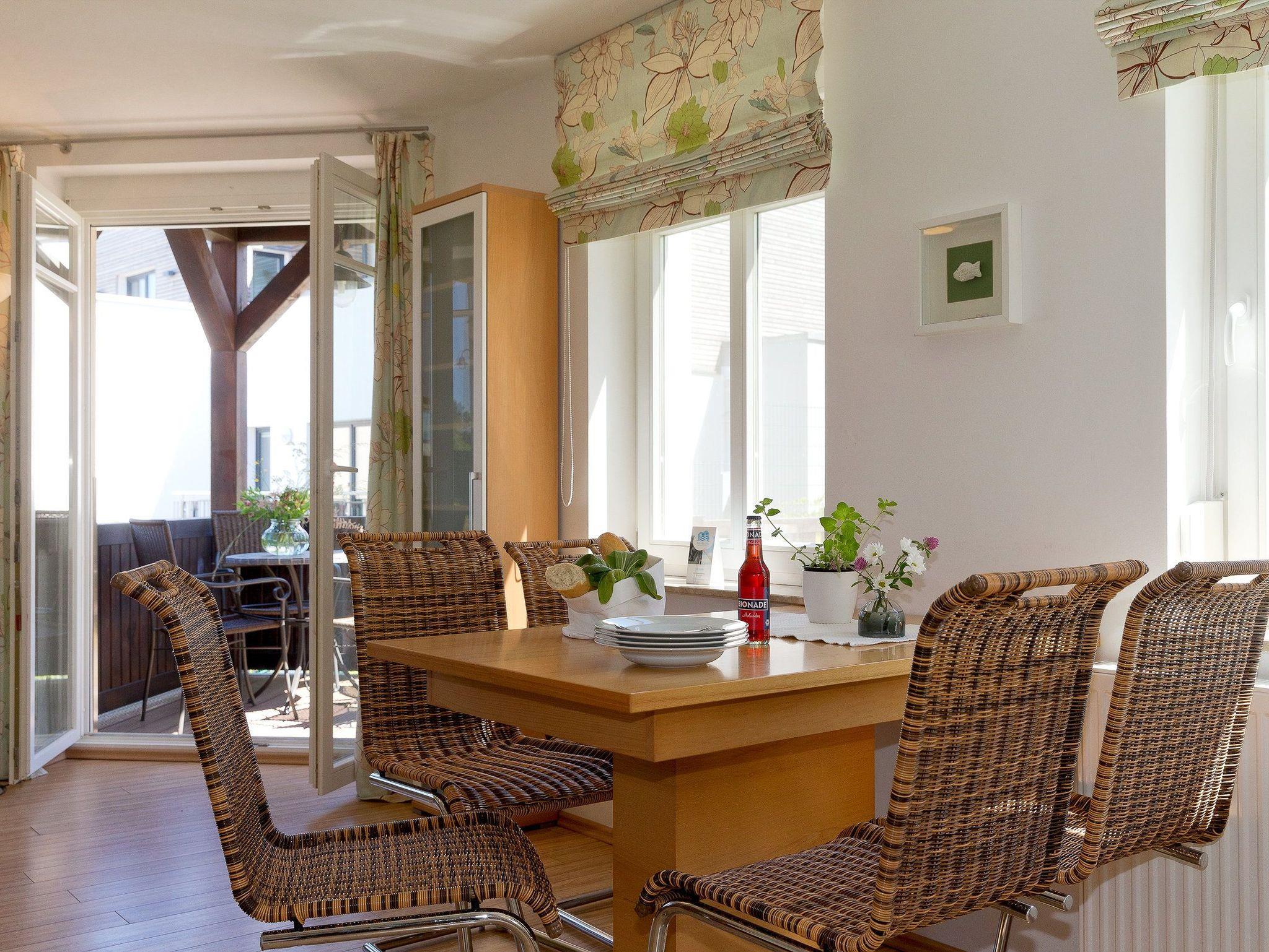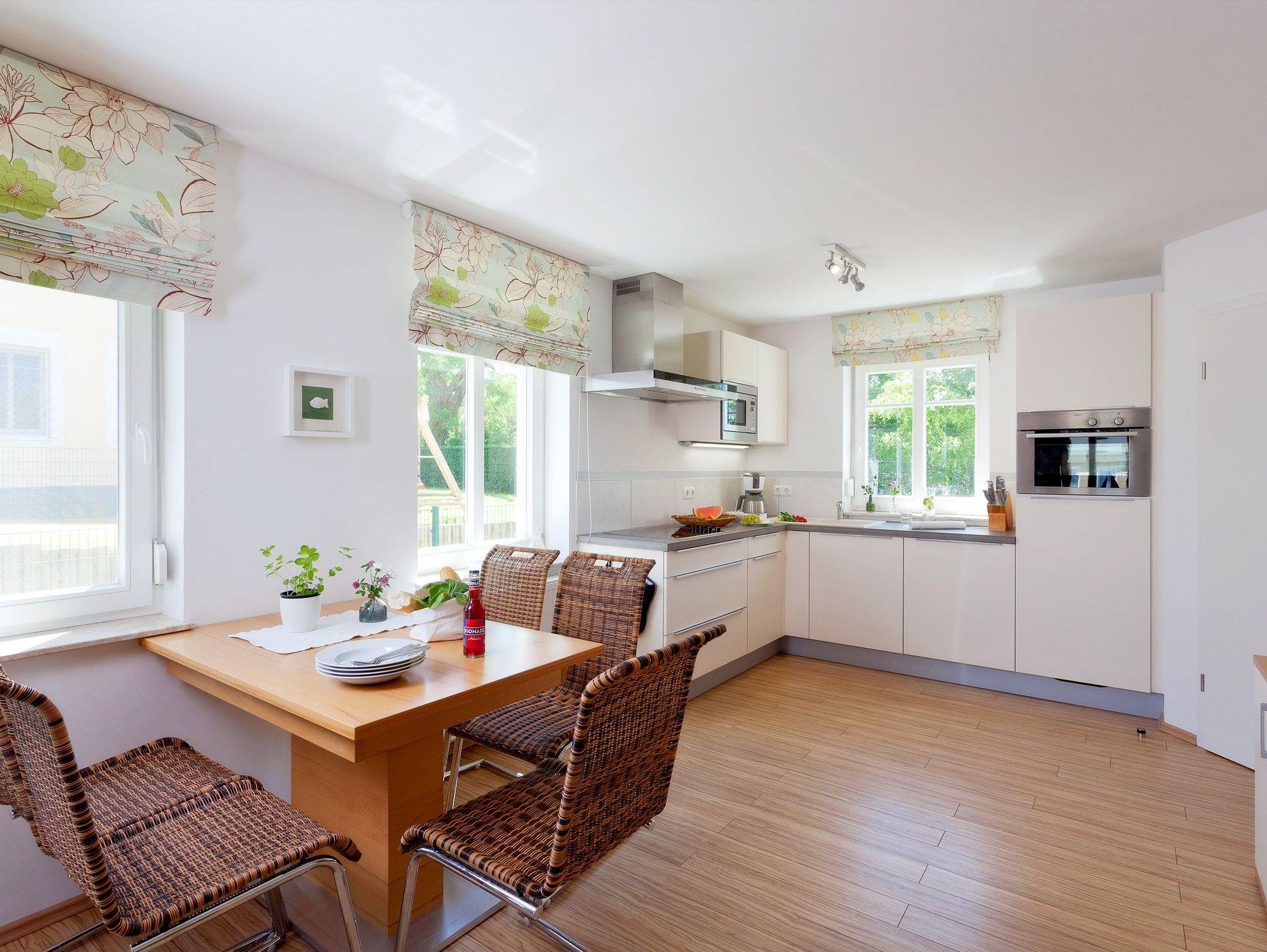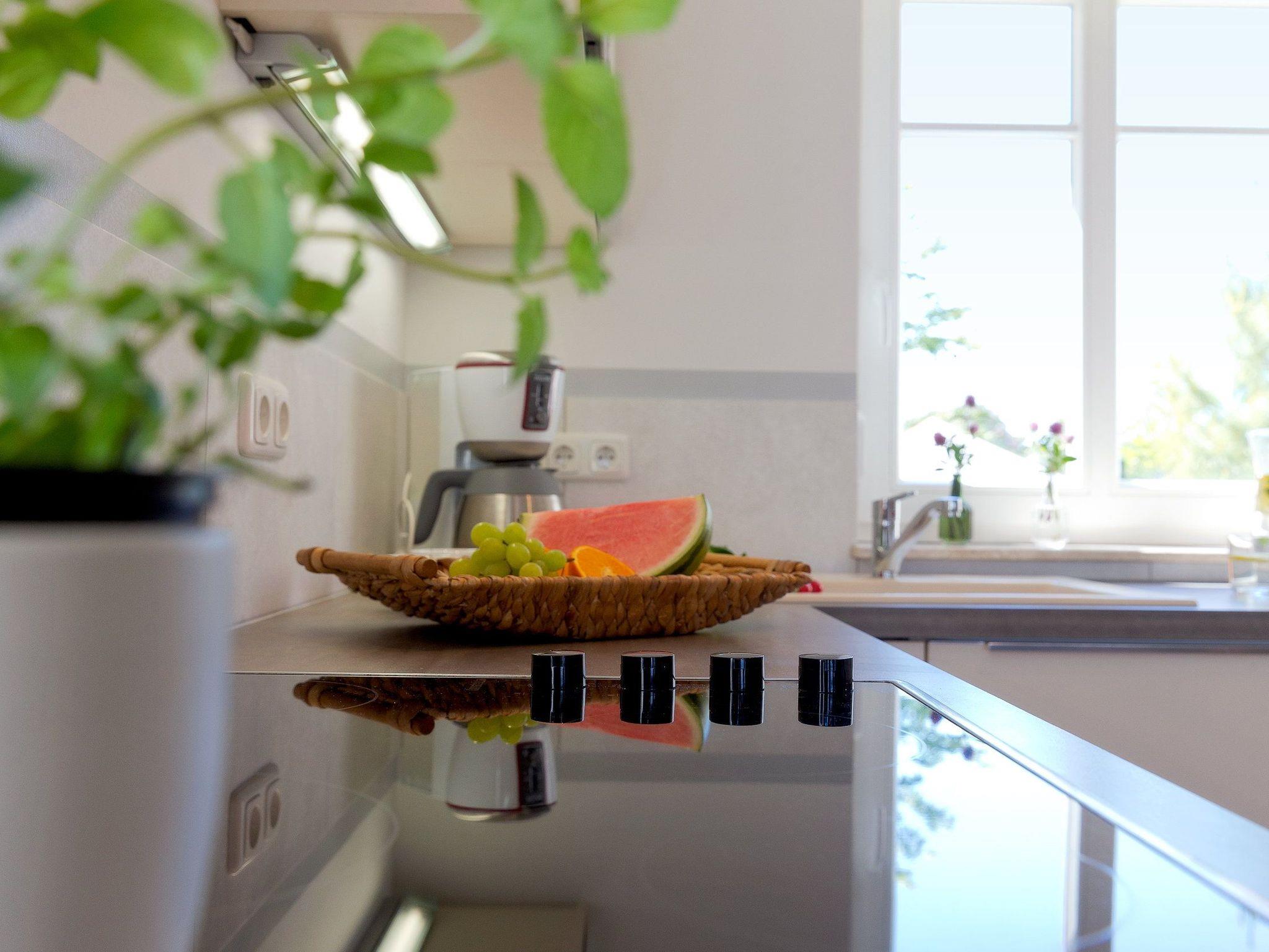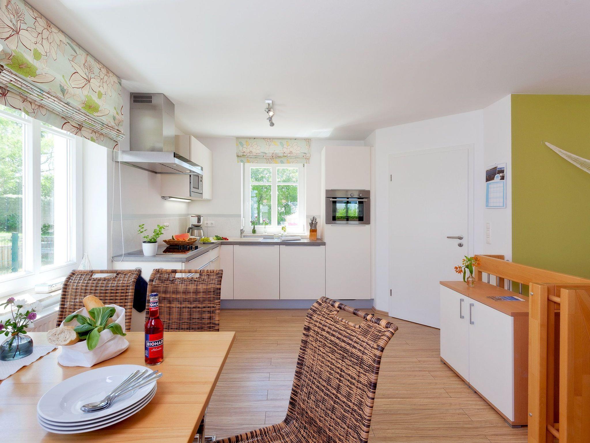 Der Wohnbereich verfügt über eine gemütliche Couch (mit Ausziehfunktion für Aufbettung) mit Leselampe, Flachbild-TV (32 Zoll), CD / DVD-System, iPod-Dockingstation sowie einen Esstisch mit Schwingstühlen. Vom Wohnbereich gelangen Sie auf Ihren Balkon mit Zugang zum Garten. Die im Wohnbereich integrierte komplett ausgestattete Einbauküche verfügt zudem über Kühlschrank, Mikrowelle, Ceran-Kochfeld (4 Platten), Backofen, Spülmaschine, Wasserkocher, Toaster, Kaffeemaschine (4er Filter), Messerblock. Über eine Treppe gelangen Sie vom Erdgeschoss in den Souterrain-Bereich. Dort befinden sich die beiden Schlafzimmer. Das eine Schlafzimmer ist mit einem hochwertigen Boxspringbett (160 x 200 cm) und Leselampe ausgestattet. Die Aufbettung für ein Kind ist im Schlafzimmer im Babyreisebett (max. 3 Jahre) oder auf Faltmatratze (3-10 Jahre) 80 x 200 cm möglich. Im 2. Schlafzimmer befindet sich für unsere kleineren Gäste ein Etagenbett (jeweils 90 x 200 cm).