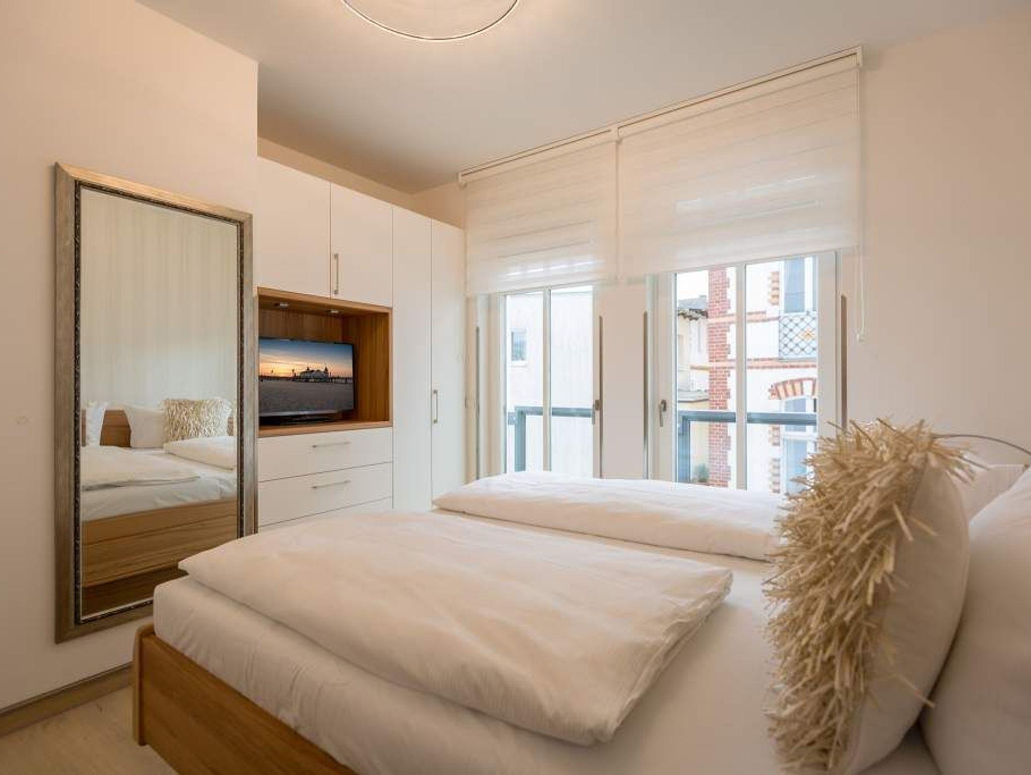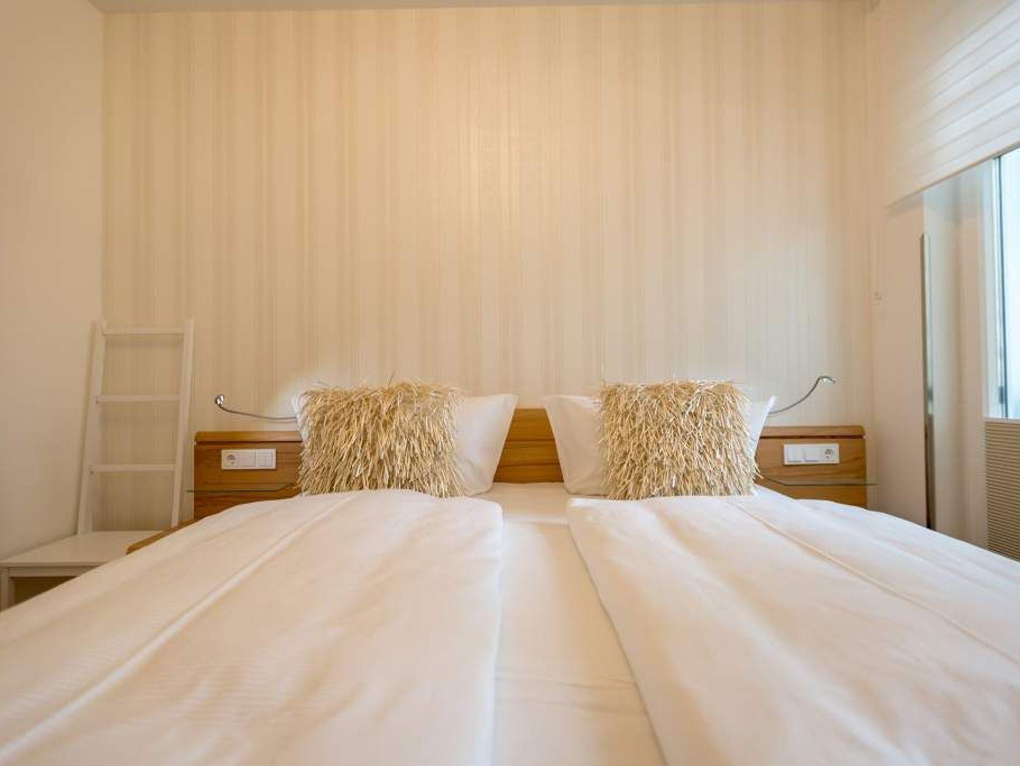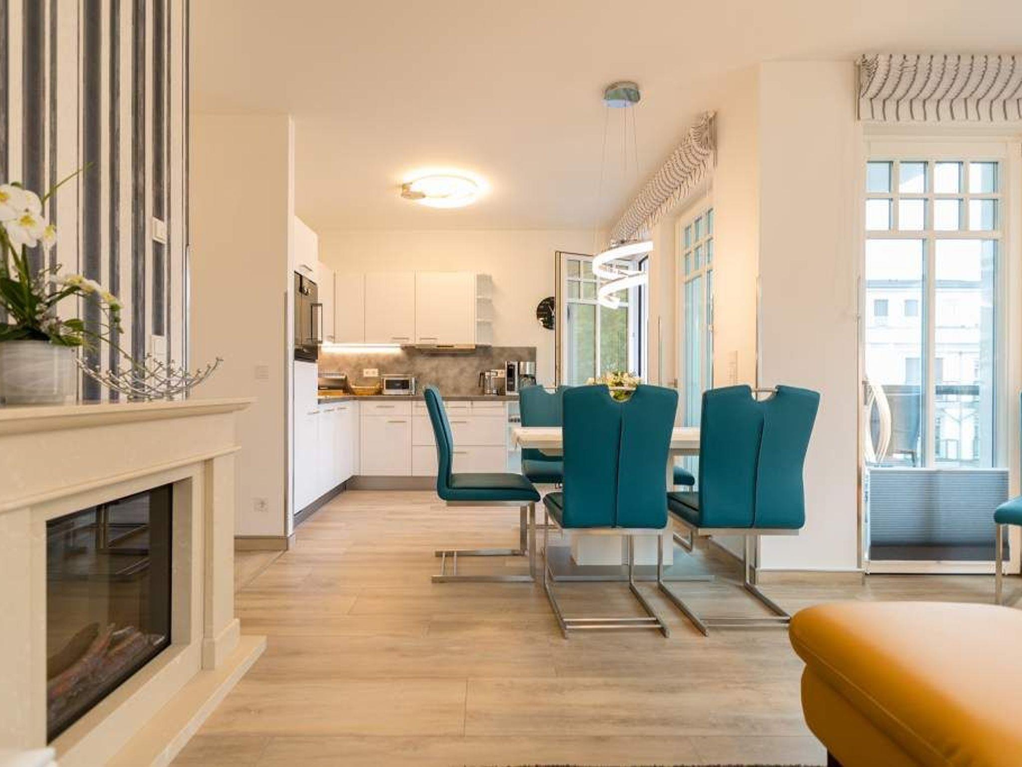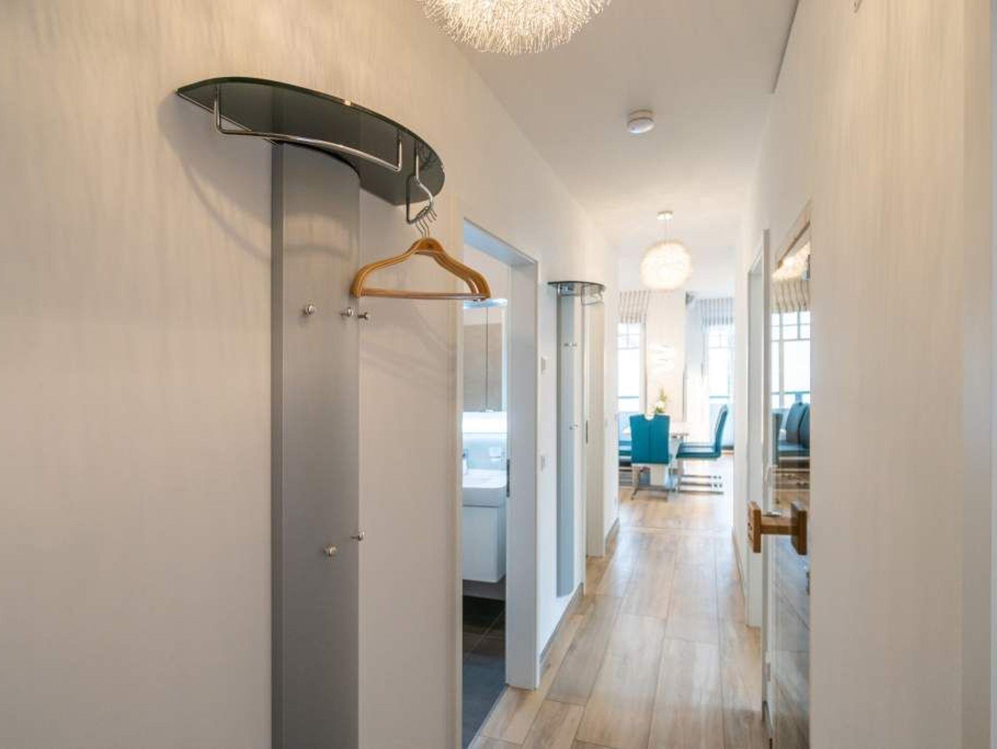 Stylisch ? von der Farbauswahl über die Wandgestaltung und das Lampendesign bis zur Einrichtung. In diesem Feriendomizil Nummer 12 in der dritten Etage des Westendpalais erwartet Sie exklusives und geschmackvolles Wohndesign. Doch ist das längst nicht alles, was die 70 Quadratmeter Wohntraum zu bieten haben. Schon in der Früh begrüßt sie die Sonne beim Frühstück auf dem Balkon. Und die Ostsee gibt Ihren unvergleichlichen Sound dazu. Lockt das Wetter nicht zum Entdecken der Inselschönheiten, bietet der Elektro-Kamin auf Knopfdruck eine gemütliche Atmosphäre. Dazu laden der große Flat-TV, ein Sony Personal Audio System (Radio, CD-Player), die CD Boombox mit USB Playback und ein Samsung Blu-ray Disc Player/DVD Player mit HDMI Kabel zum Entspannen auf der bequemen Leder-Sofalandschaft ein. Zum großzügigen, offenen Wohnzimmer gehört auch ein schöner Essplatz mit sechs Lederstühlen und einem Tisch. In der ebenfalls offenen Küchenzeile finden Sie alle notwendigen Küchengeräte und edles Designgeschirr. Von hier aus haben Sie Zugang zum Balkon. Vier Personen können in diesem schönen Domizil gemeinsam Urlauben. Denn die Wohnung verfügt über zwei Schlafzimmer mit jeweils einem Doppelbett (1,80 m 2,00 m), geräumigen Einbauschränken und Flat-TV. Das moderne Badezimmer ist mit einer Regen-Dusche, Waschtisch und WC ausgestattet. Ein Gäste-WC gibt es on top. Und in diesem Appartement können Sie sich noch auf ein ganz besonderes Highlight freuen: eine Finnische Sauna, die Sie kostenfrei benutzen können. Zur weiteren Wohnungsausstattung gehören ein Babybett sowie ein Picknick-Korb mit Strandgeschirr. Da steht dem entspannten Tag am Meer doch nichts mehr im Weg. Wollen Sie ein wenig die Insel erkunden, können Sie das mit den beiden Holländer-Fahrrädern, die zu der Wohnung dazu gehören. Also: Kommen Sie einfach an, stellen Sie Ihr Auto in der Tiefgarage ab und legen Sie los mit der Entspannung. Am Tiefgaragenstellplatz steht eine E Ladesäule zur Verfügung. Die Nutzung erfolgt bequem über handelsübliche Karten. Die Betten haben wir für Sie bereits bezogen und Handtücher liegen bereit.