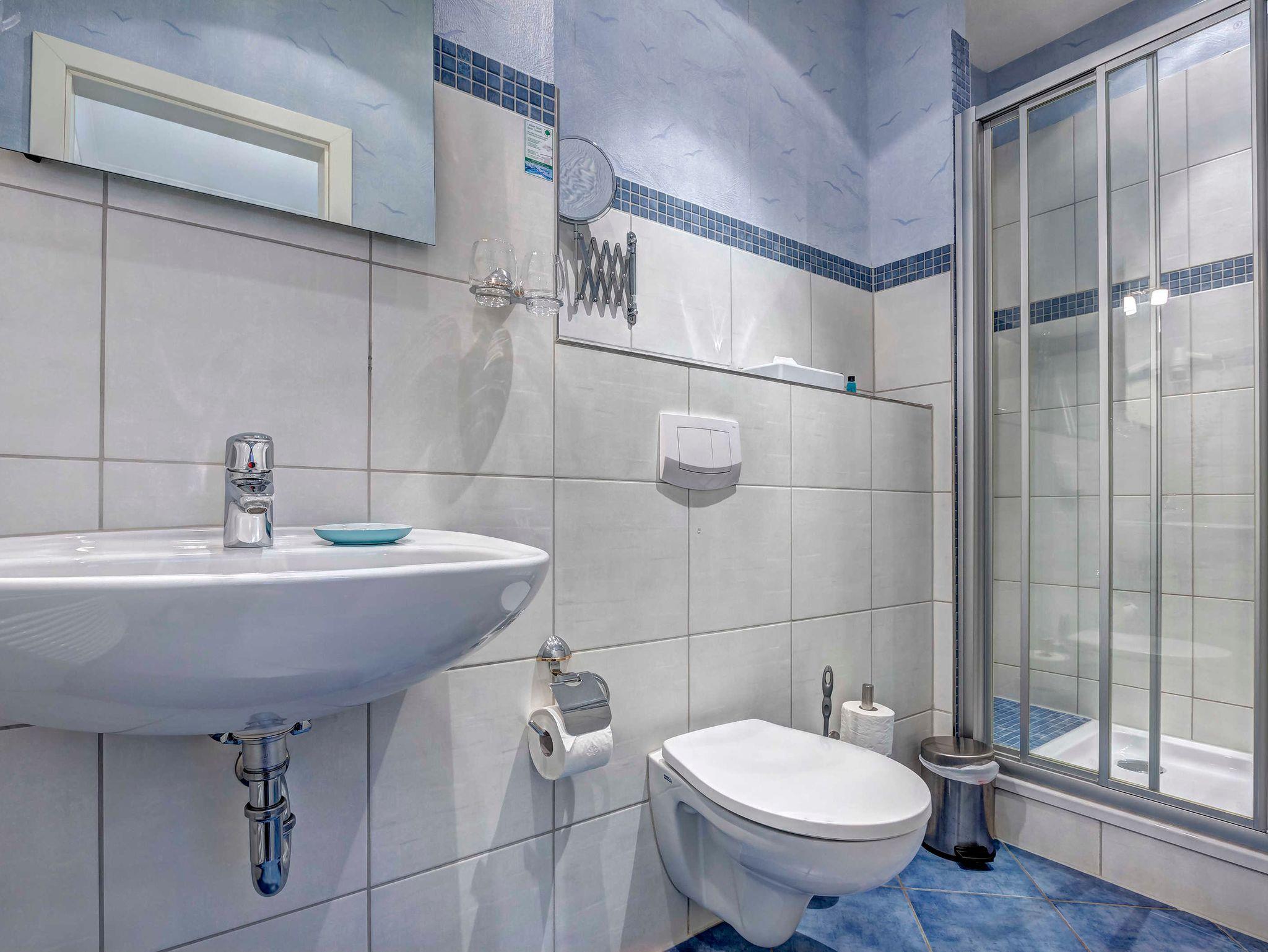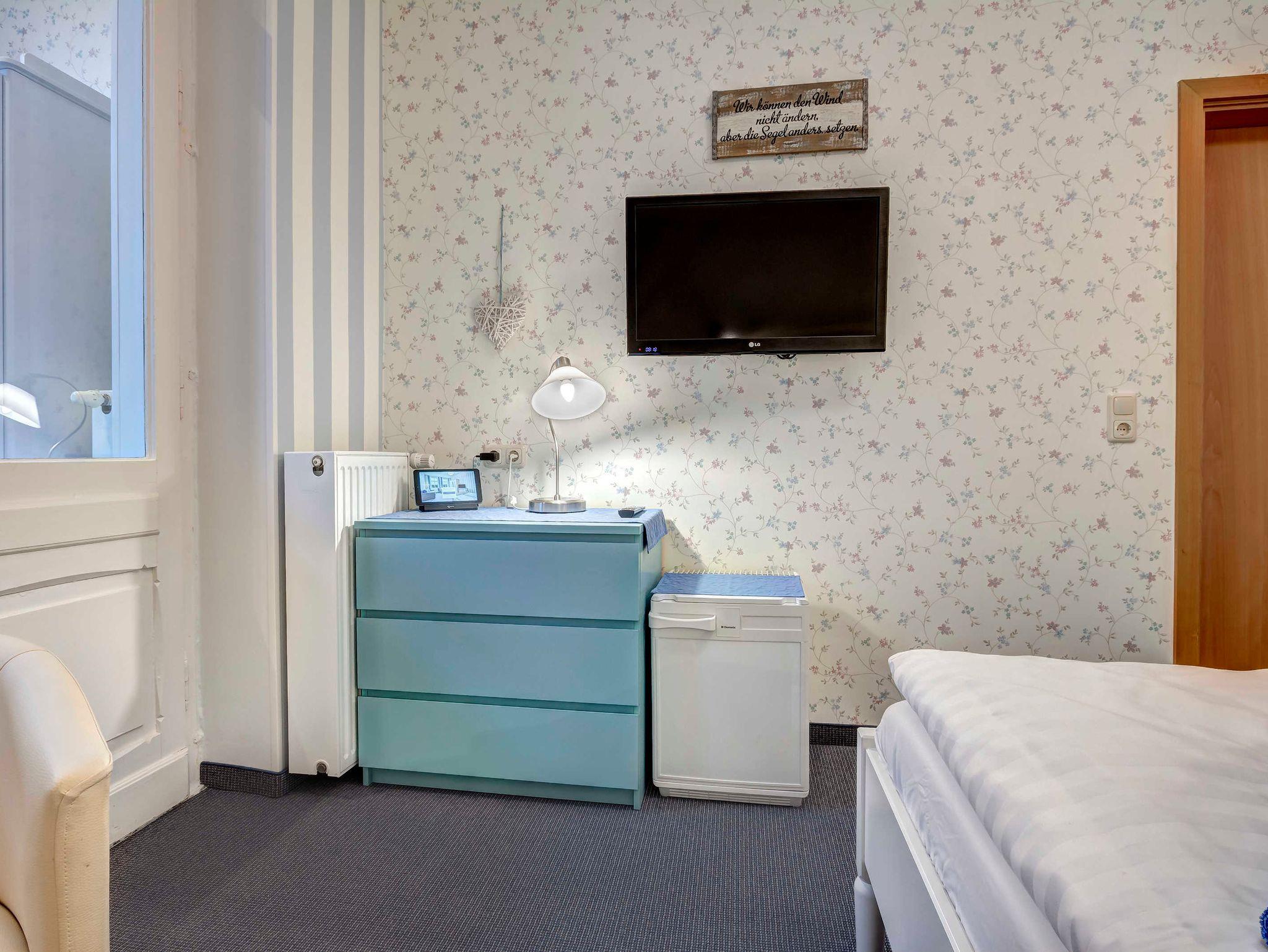 Schönes Einzelzimmer, welches regelmäßig auch von 2 Personen gebucht wird, Flachbild-TV, Tablet-PC, Sitzecke für 2 Personen, Kühlmöglichkeit, WLAN, Bettmaße: 160x200 cm, maritimes Bad mit Dusche, WC, Fön.