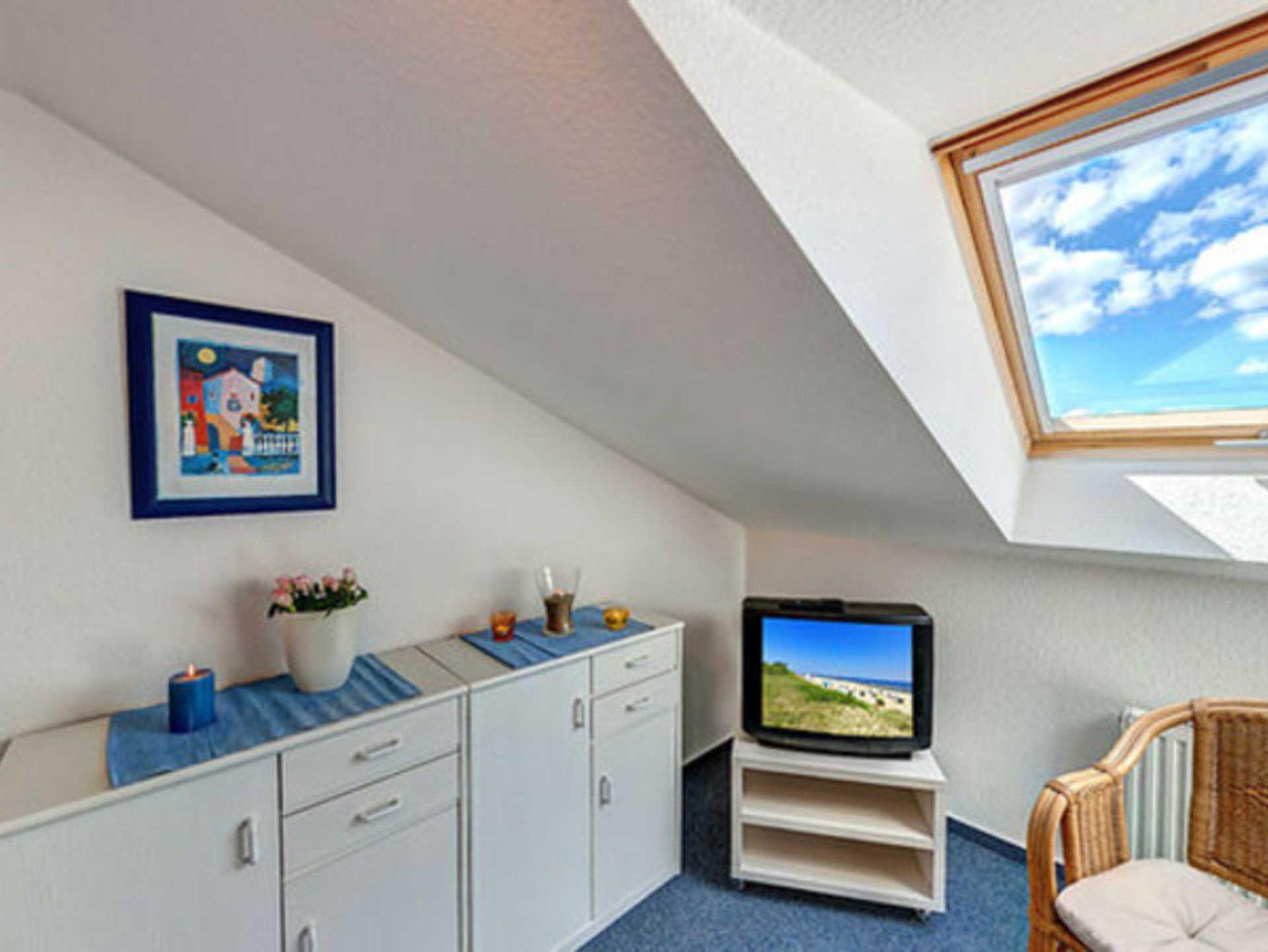 Vom Wohnraum aus gelangt man über eine Treppe in die obere Ebene, in der sich zwei weitere Schlafzimmer, eines mit einem Doppelbett und eines mit zwei Einzelbetten sowie ein geräumiges Bad, ausgestattet mit Wanne und WC, befinden. In der oberen Ebene gibt es keine volle Deckenhöhe. Ein Pkw-Stellplatz steht Ihnen auf dem Grundstück kostenfrei zur Verfügung und Ihre Fahrräder können Sie ebenfalls auf dem Grundstück in einem separaten Abstellraum unterbringen. Alle Wohnungen in der Villa Ostseewarte haben passwortgeschütztem DSL-WLAN Internetzugang (gerätegebunden, Euro 1,50 pro Tag und Gerät). Ein FAHRSTUHL wurde nachträglich eingebaut. Eine Waschmaschine können Sie direkt im Haus gegen Gebühr nutzen (Münzgerät).