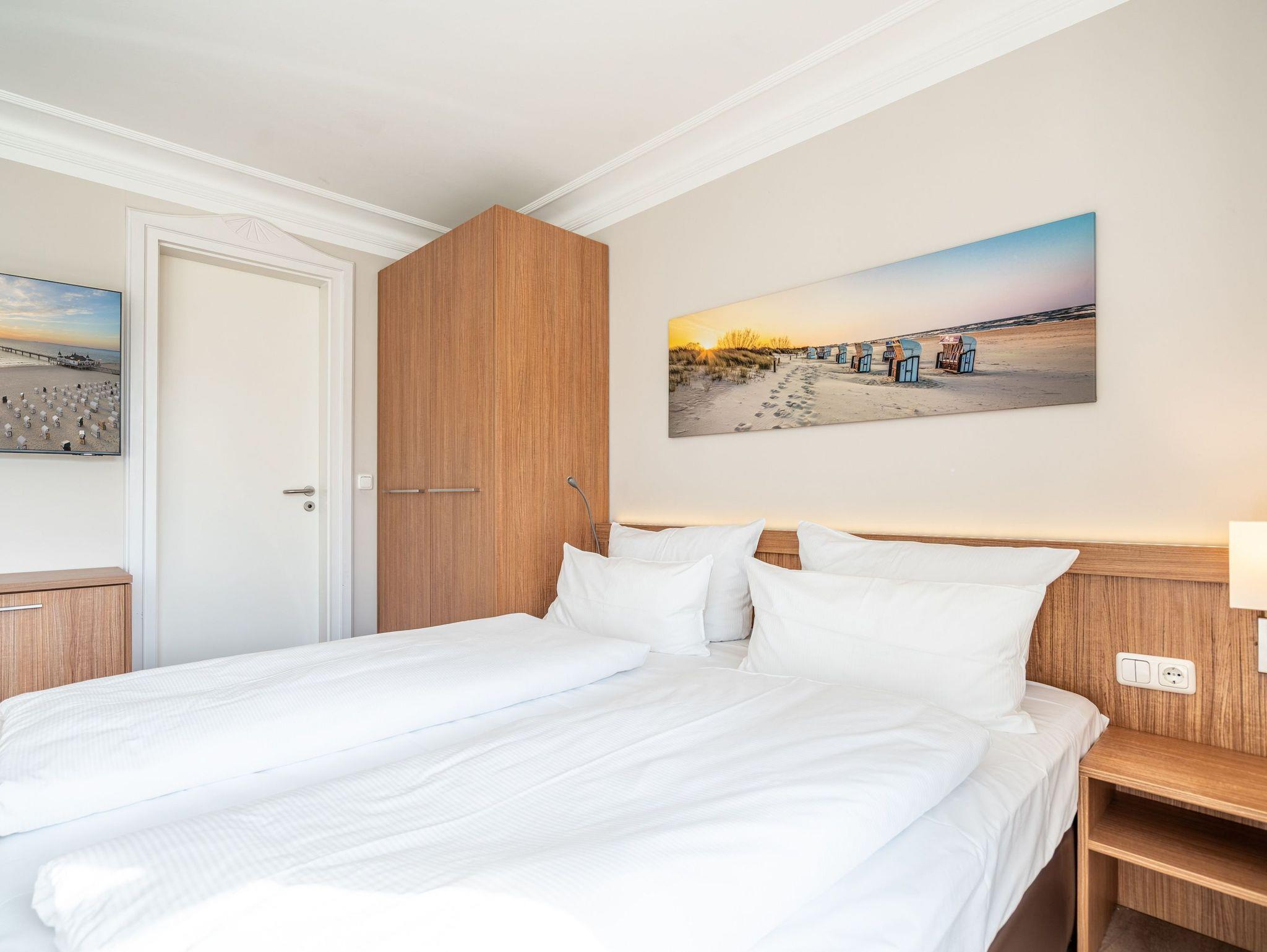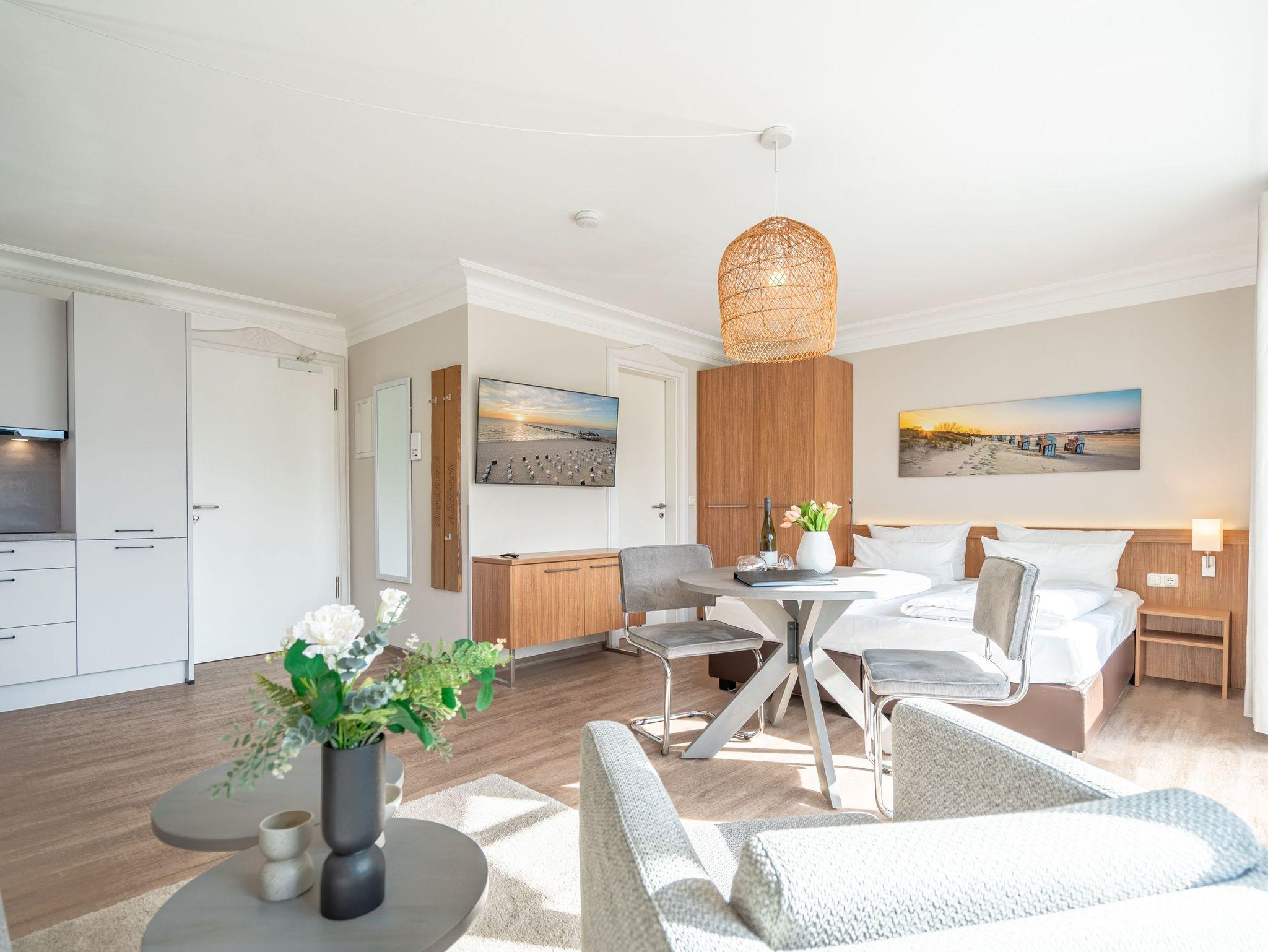Die 1-Raum-Ferienwohnung Nr. C03 in der Villa Seedüwel bietet auf 35 qm komfortablen Platz für zwei Personen und befindet sich in der 1. Etage. Der offene Wohnbereich ist mit einer Küchenzeile ausgestattet, die ein Induktionskochfeld, eine Mikrowelle und einen Kühlschrank mit Gefrierfach umfasst. Ein Essplatz für zwei Personen, eine gemütliche Sitzgruppe und ein Flat-TV sorgen für Komfort. Das Doppelbett (1,80 m x 2,00 m) befindet sich ebenfalls im Wohnbereich und wird durch eine Kommode sowie einen Kleiderschrank ergänzt. Von hier aus gelangen Sie auf den sonnigen Süd-West-Balkon. Das Tageslicht-Bad verfügt über eine Dusche, ein Waschbecken und ein WC. Ein Stellplatz in der Tiefgarage ( Einfahrthöhe 2,03m) des benachbarten Hauses „Strandterrasse“ ist für Sie reserviert. WLAN steht Ihnen kostenfrei zur Verfügung.