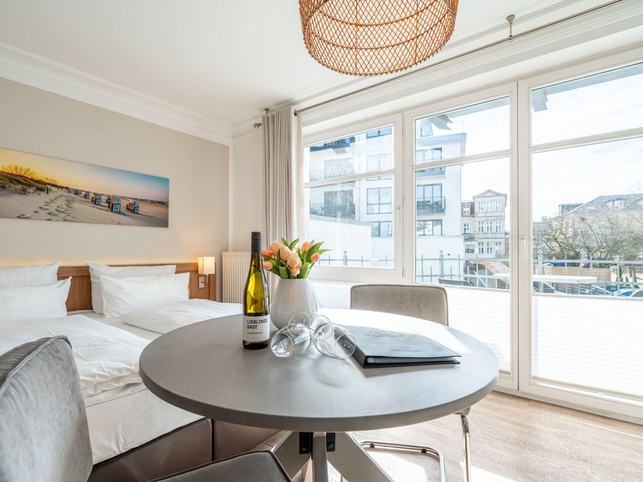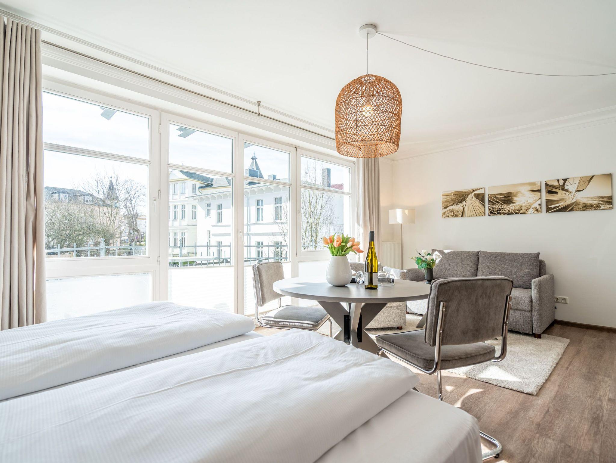 Die 1-Raum-Ferienwohnung Nr. C03 in der Villa Seedüwel bietet auf 35 qm komfortablen Platz für zwei Personen und befindet sich in der 1. Etage. Der offene Wohnbereich ist mit einer Küchenzeile ausgestattet, die ein Induktionskochfeld, eine Mikrowelle und einen Kühlschrank mit Gefrierfach umfasst. Ein Essplatz für zwei Personen, eine gemütliche Sitzgruppe und ein Flat-TV sorgen für Komfort. Das Doppelbett (1,80 m x 2,00 m) befindet sich ebenfalls im Wohnbereich und wird durch eine Kommode sowie einen Kleiderschrank ergänzt. Von hier aus gelangen Sie auf den sonnigen Süd-West-Balkon. Das Tageslicht-Bad verfügt über eine Dusche, ein Waschbecken und ein WC. Ein Stellplatz in der Tiefgarage ( Einfahrthöhe 2,03m) des benachbarten Hauses ?Strandterrasse? ist für Sie reserviert. WLAN steht Ihnen kostenfrei zur Verfügung.