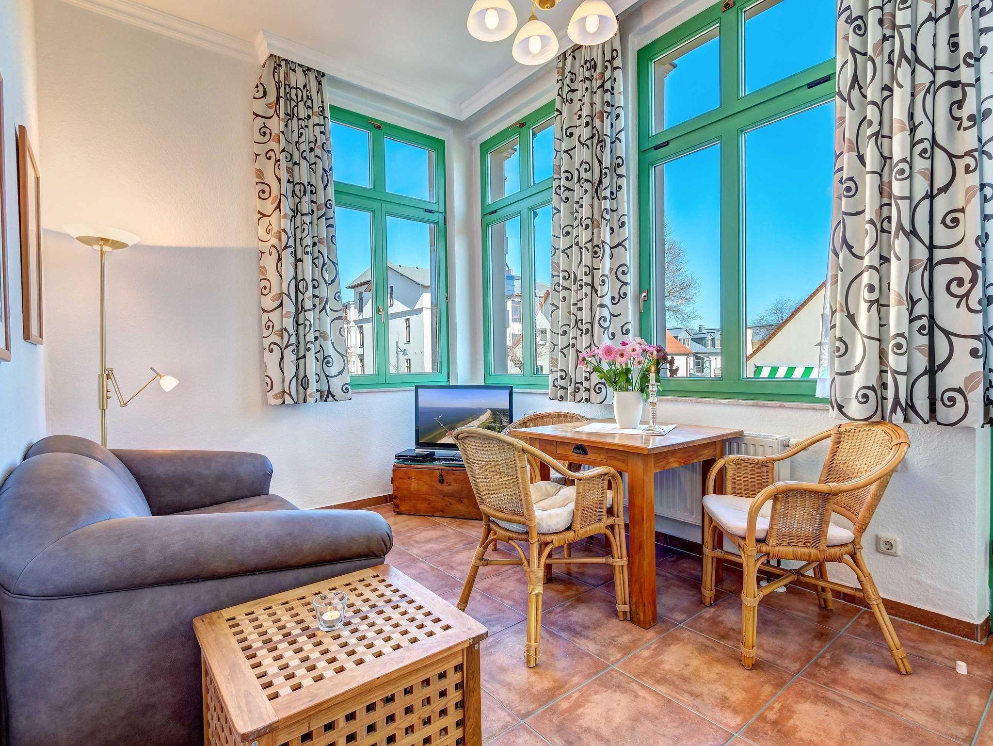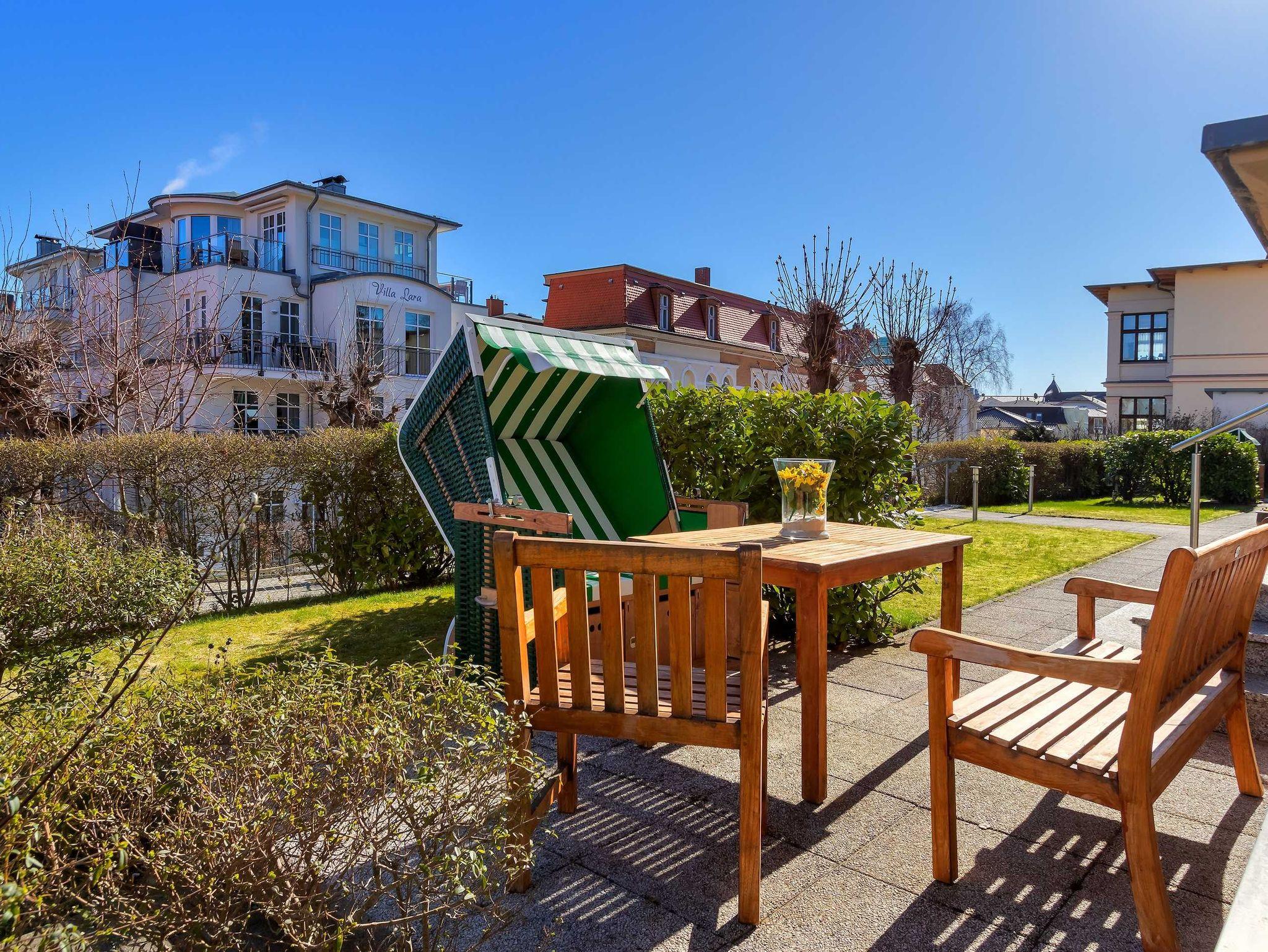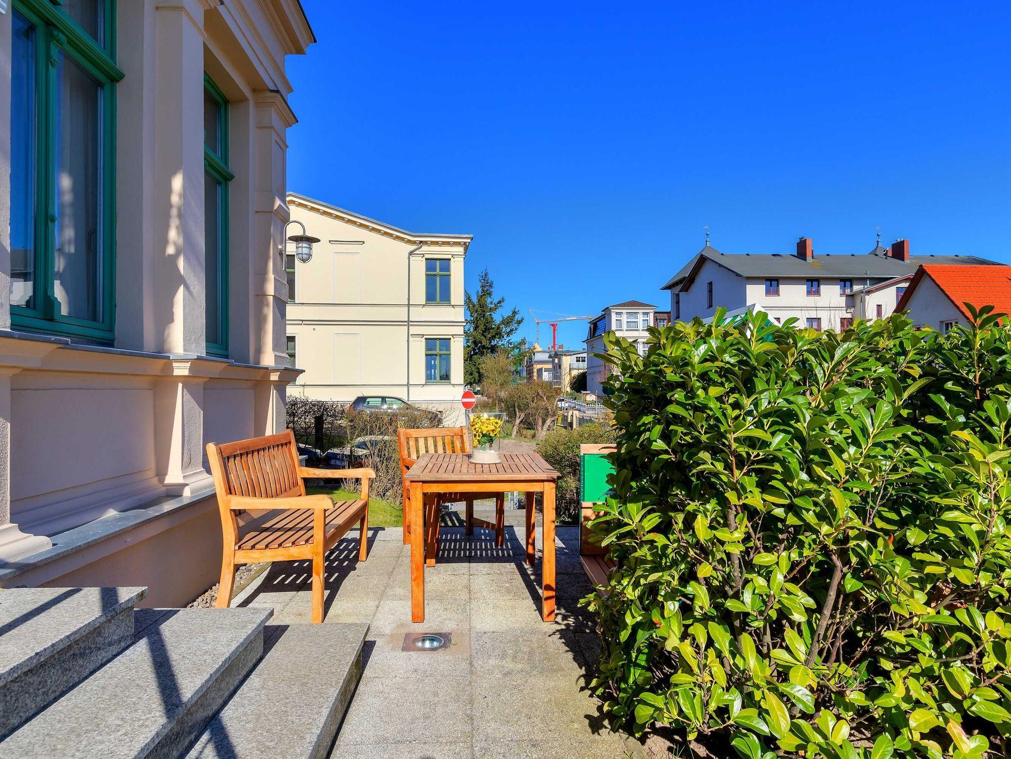 STRANDNAH! Nur ca. 100 m zur Strandpromenade mit TERRASSE, KLEINEM GARTEN und STRANDKORB! Gemütliches 2-Zimmer-Apartment mit freundlicher Ausstattung. Separates Schlafzimmer, Wohnzimmer mit Schlafcouch, Küchenzeile, Essplatz, geräumiges Duschbad, Terrasse mit Gartenmöbeln und STRANDKORB (Frühling bis Herbst) und kleinem Gartenstück, separater Eingang. Die Wohnung verfügt über einen Pkw-Stellplatz . Abstellraum für Fahrräder und ähnliches ist vorhanden. Eine Sauna in der Villa Germania kann kostenpflichtig genutzt werden. Vom Haus aus können Sie das Ortszentrum und die bekannte Ahlbecker Seebrücke in ca. 3 bzw. 5 Minuten zu Fuß erreichen.