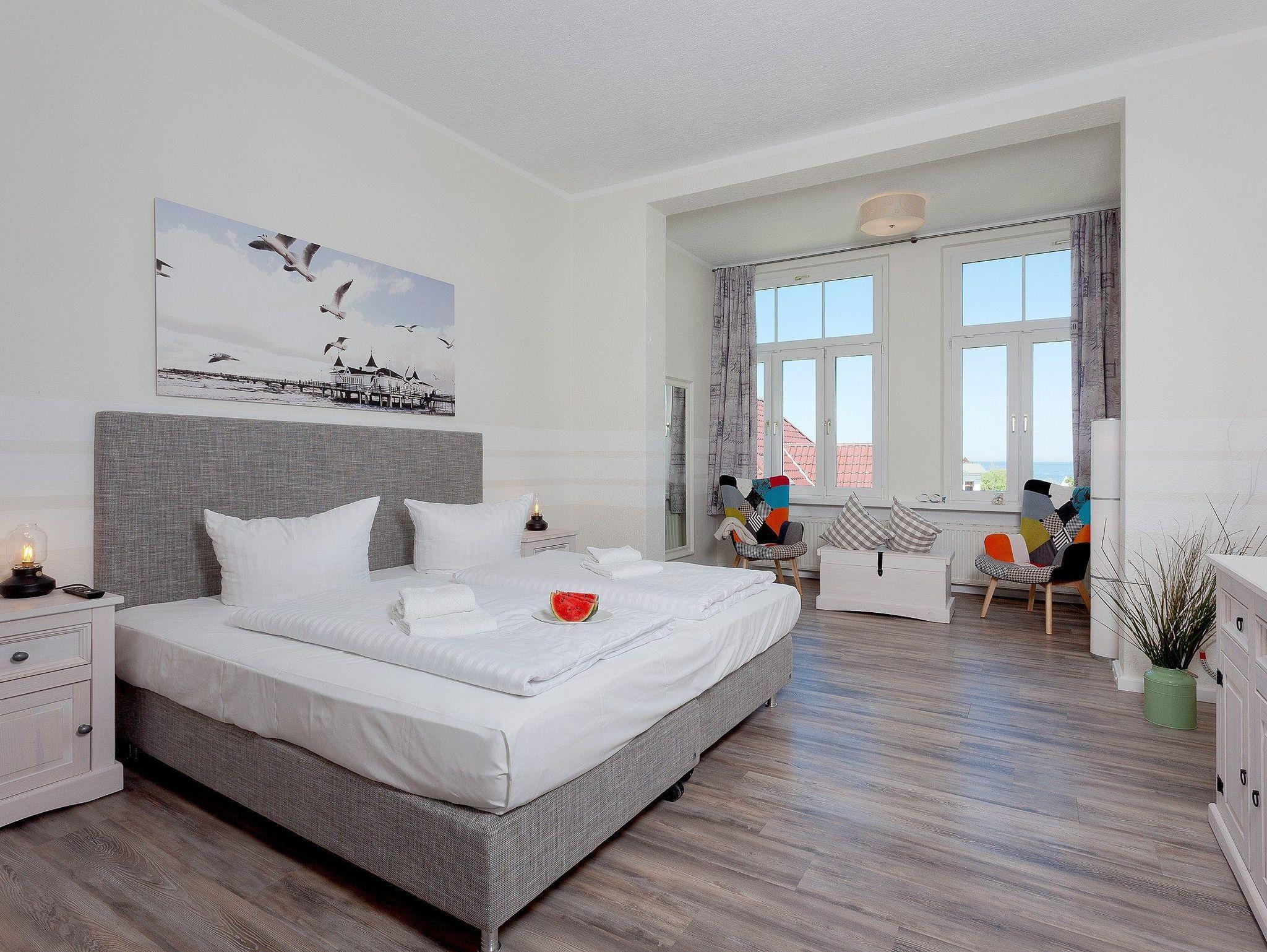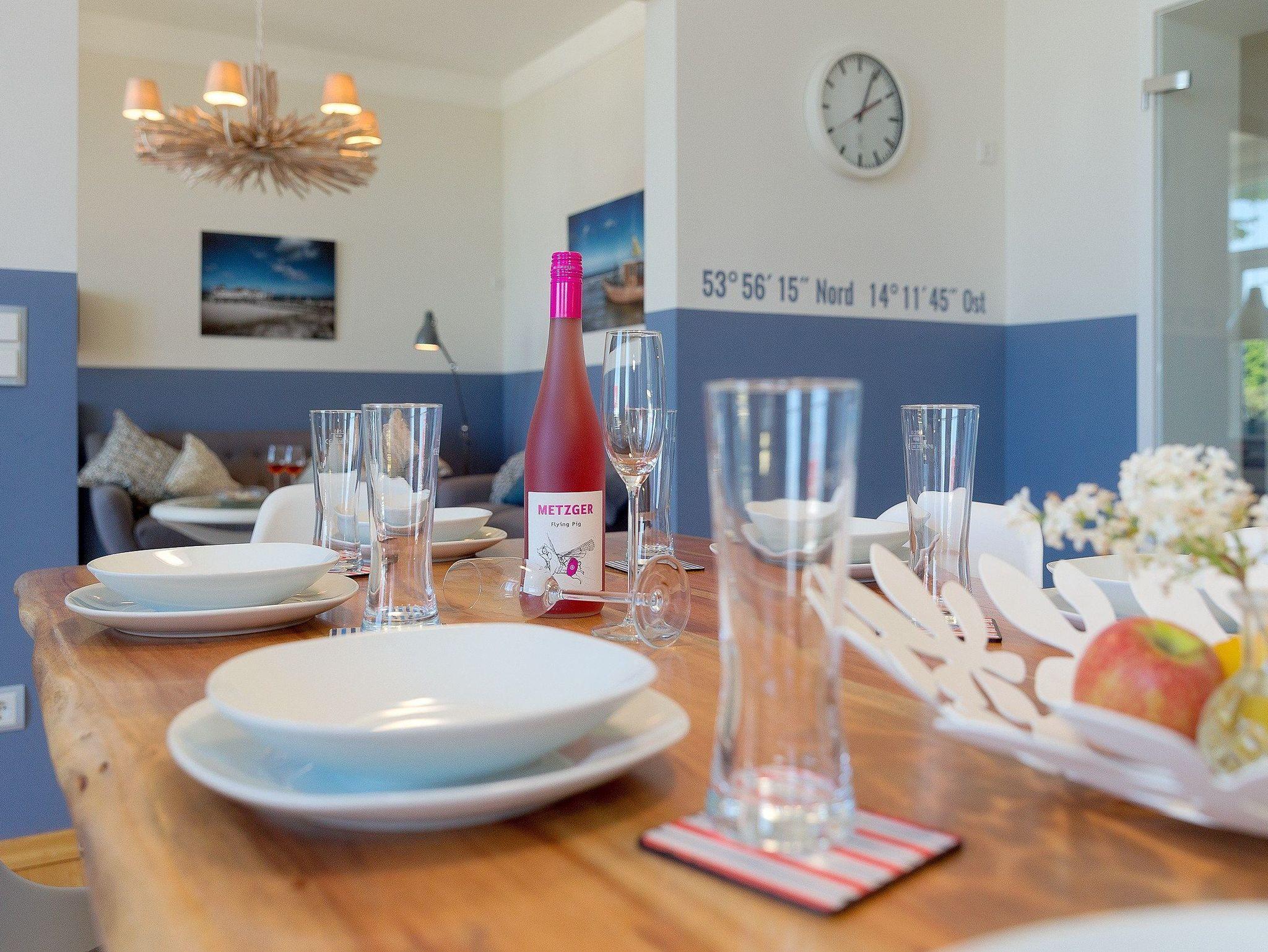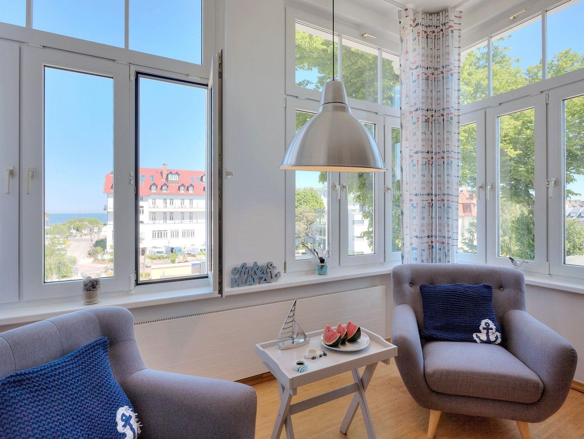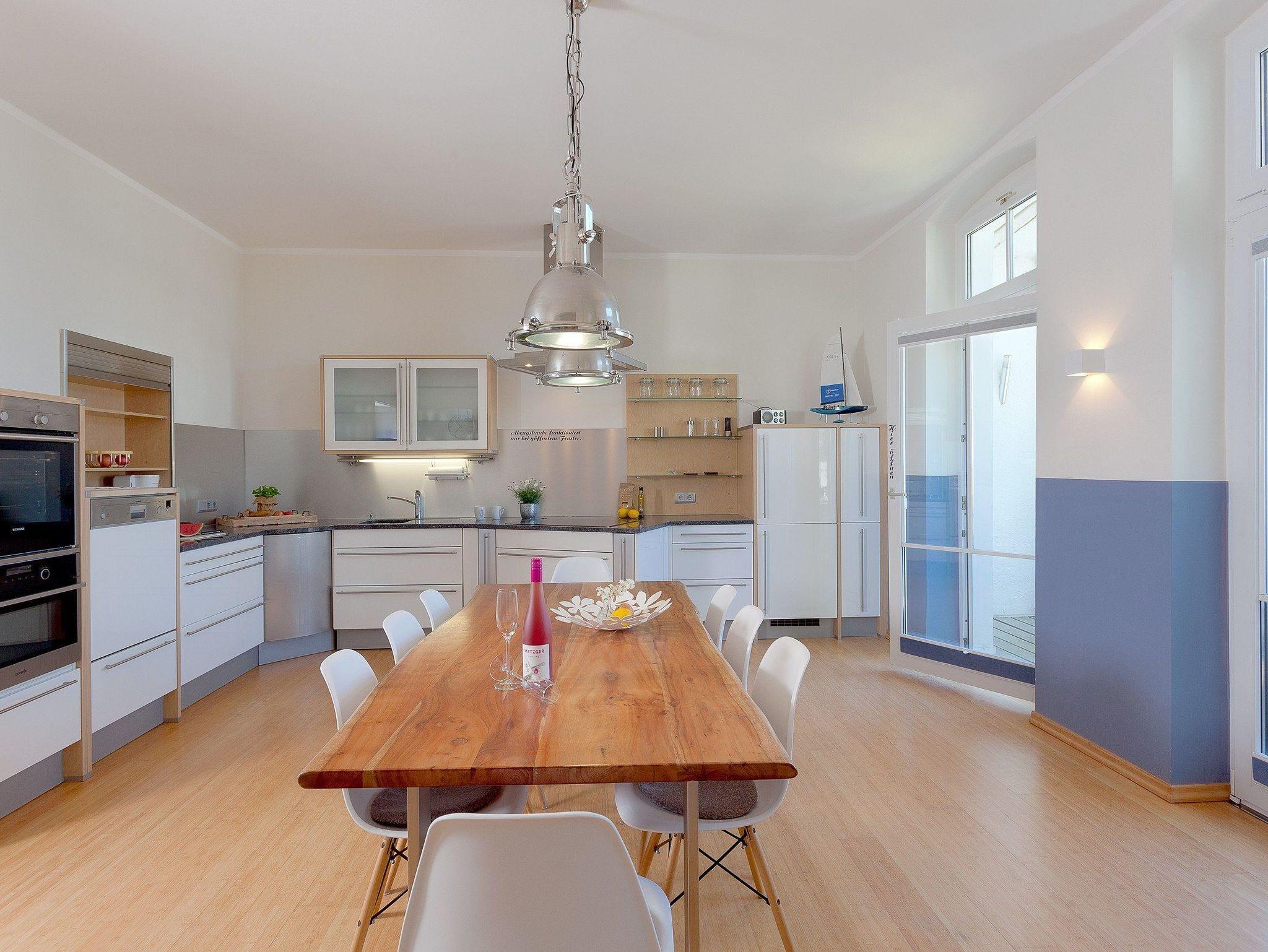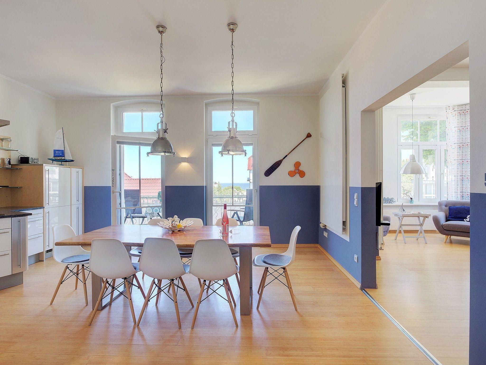 Auf 150 m² erwartet Sie ein exklusiv neu eingerichtetes 4-Raum-Appartement mit Meerblick für bis zu sechs Personen und einem Kleinkind bis zu drei Jahren im Babyreisebettchen im Seemannslook: mit separat großer Küche (Einbauküche mit Backofen, Ceranfeld, Geschirrspüler, Kühlschrank), Essplatz für 6 Personen und Zugang zum Balkon zur Meerseite.