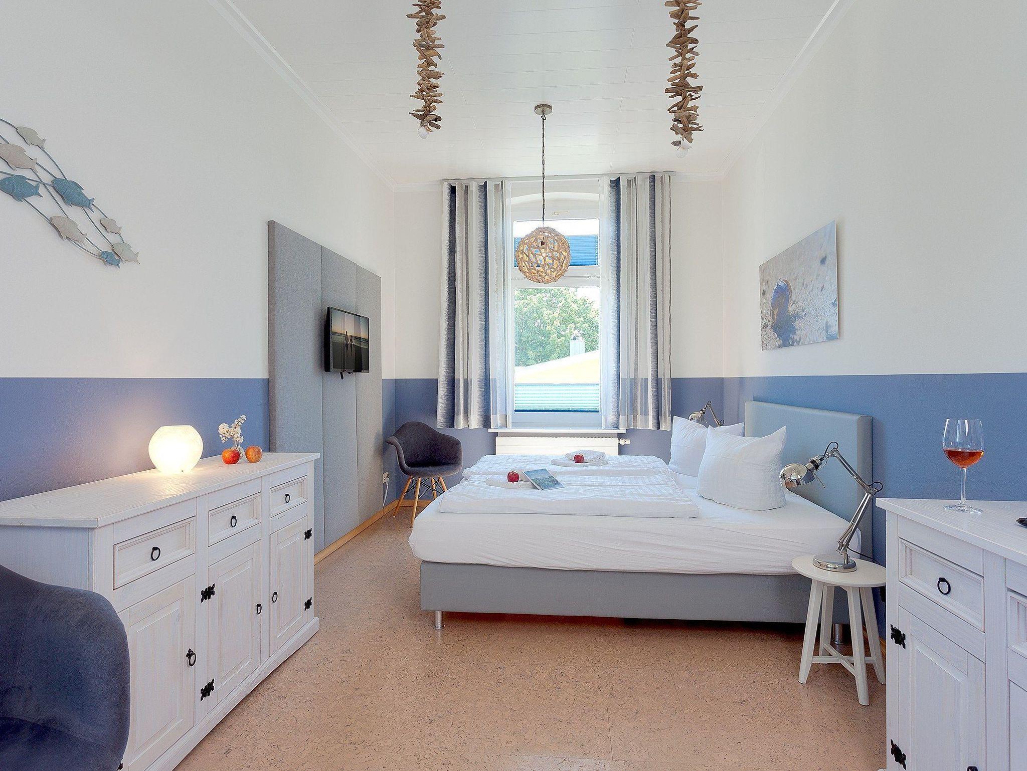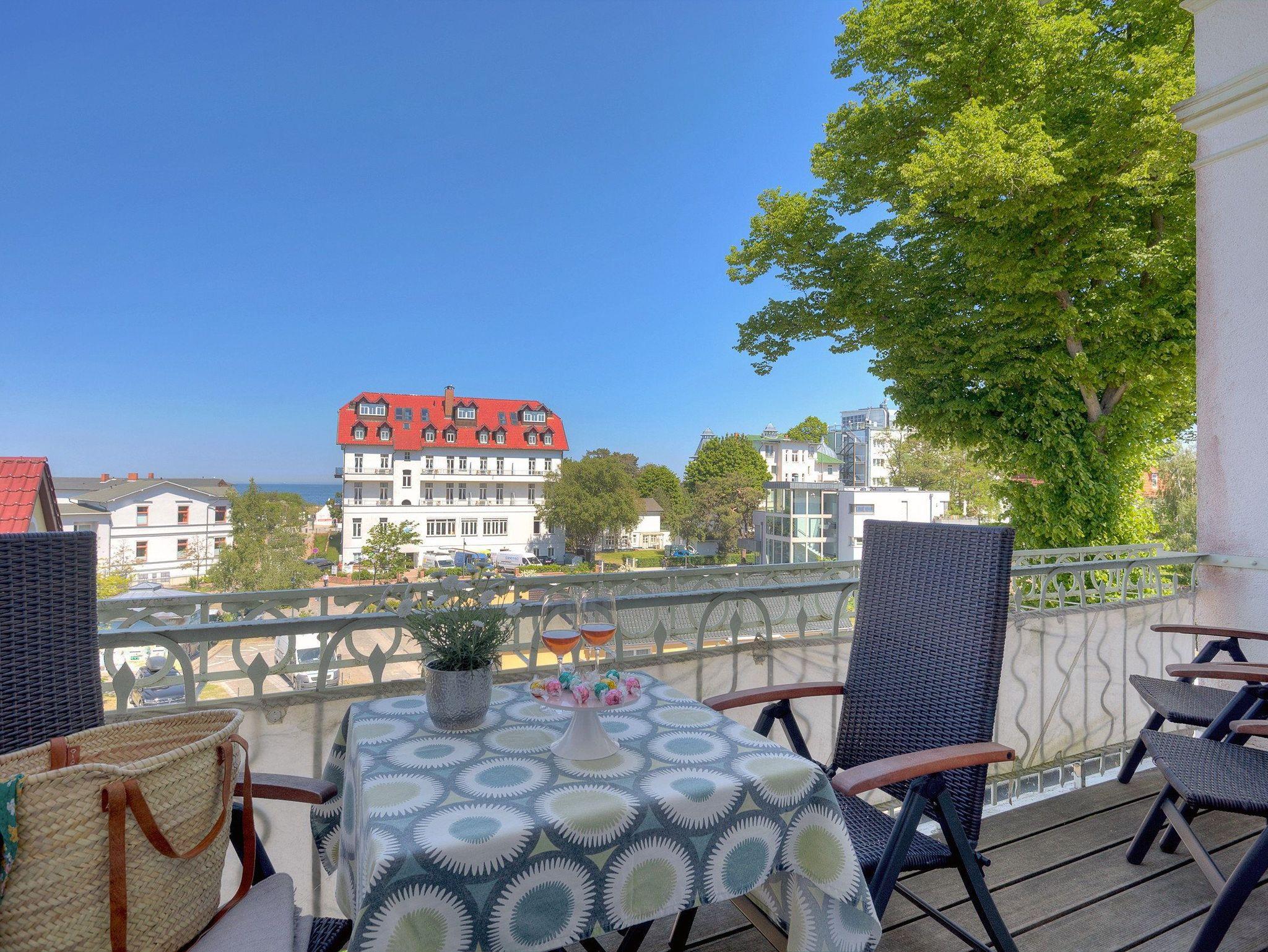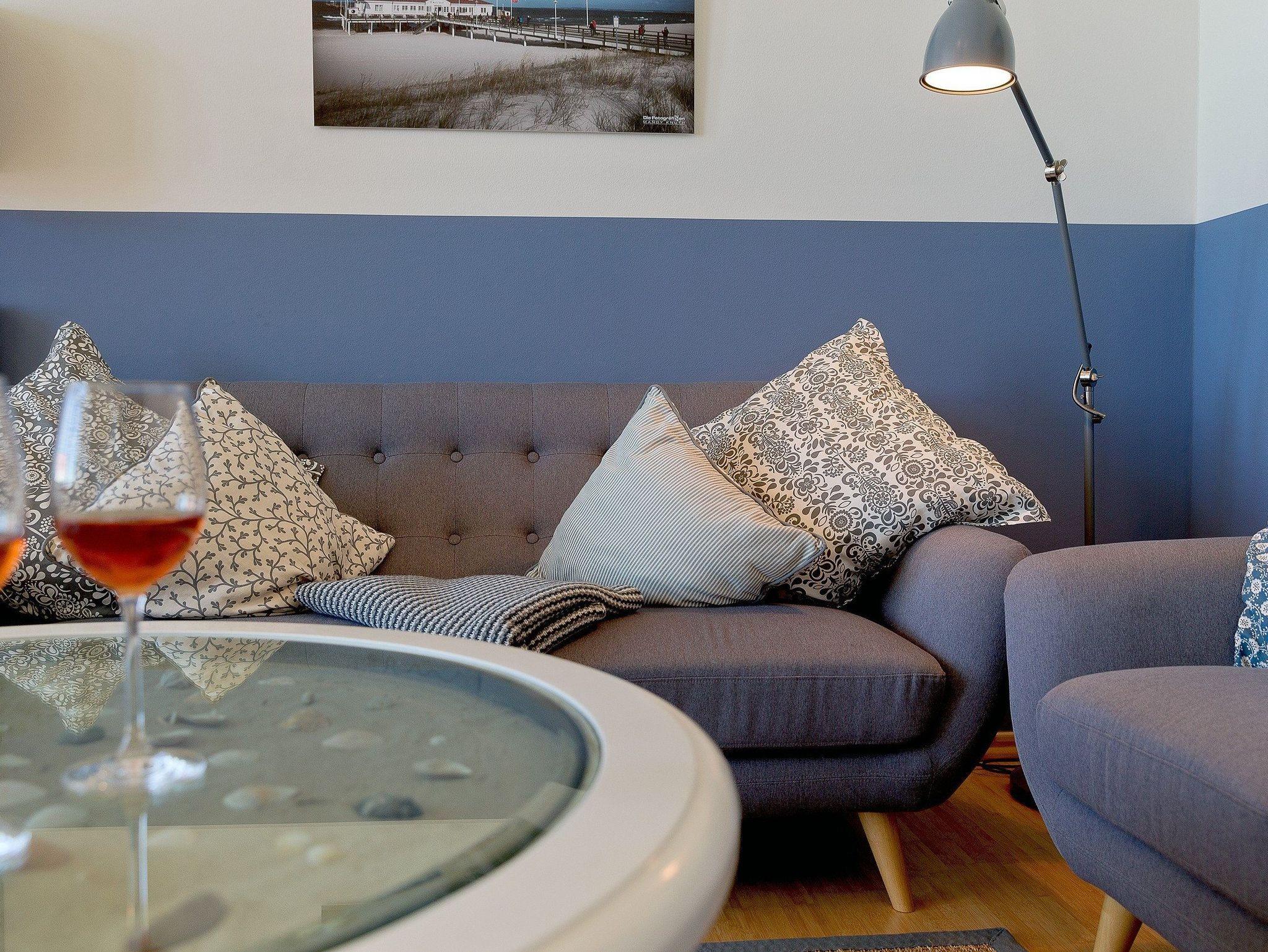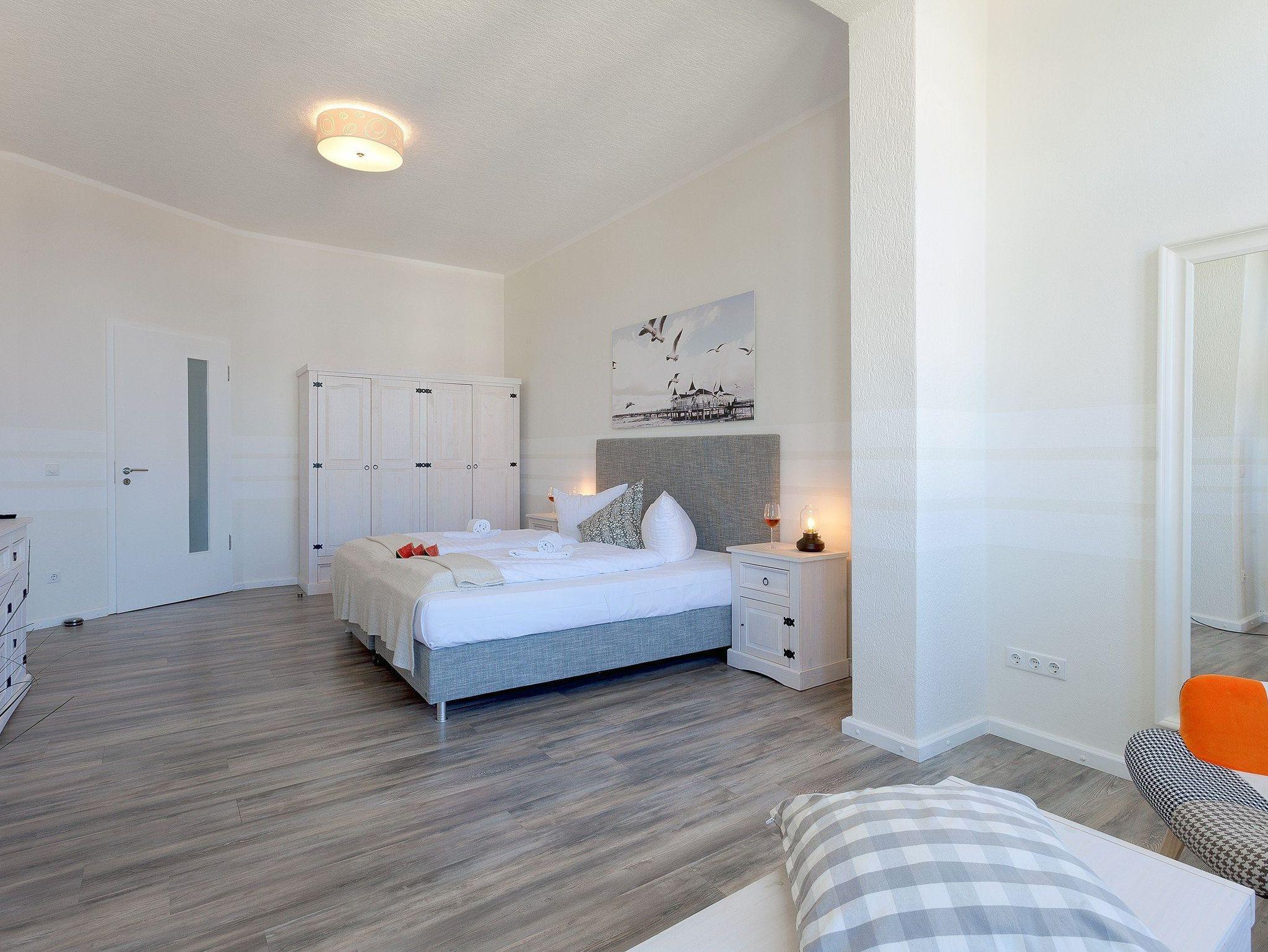 Auf 150 m² erwartet Sie ein exklusiv neu eingerichtetes 4-Raum-Appartement mit Meerblick für bis zu sechs Personen und einem Kleinkind bis zu drei Jahren im Babyreisebettchen im Seemannslook: mit separat großer Küche (Einbauküche mit Backofen, Ceranfeld, Geschirrspüler, Kühlschrank), Essplatz für 6 Personen und Zugang zum Balkon zur Meerseite.