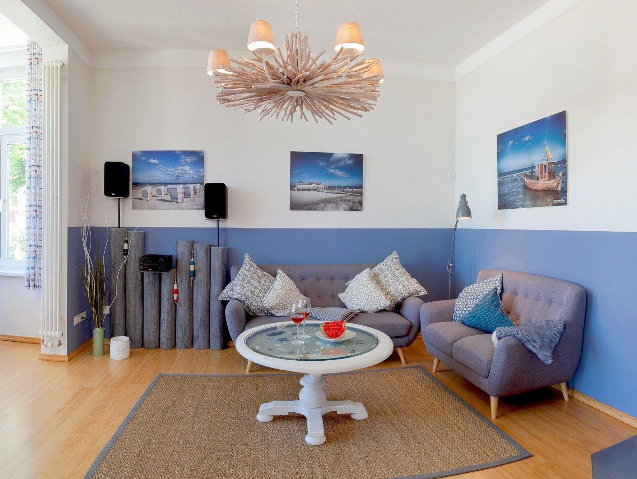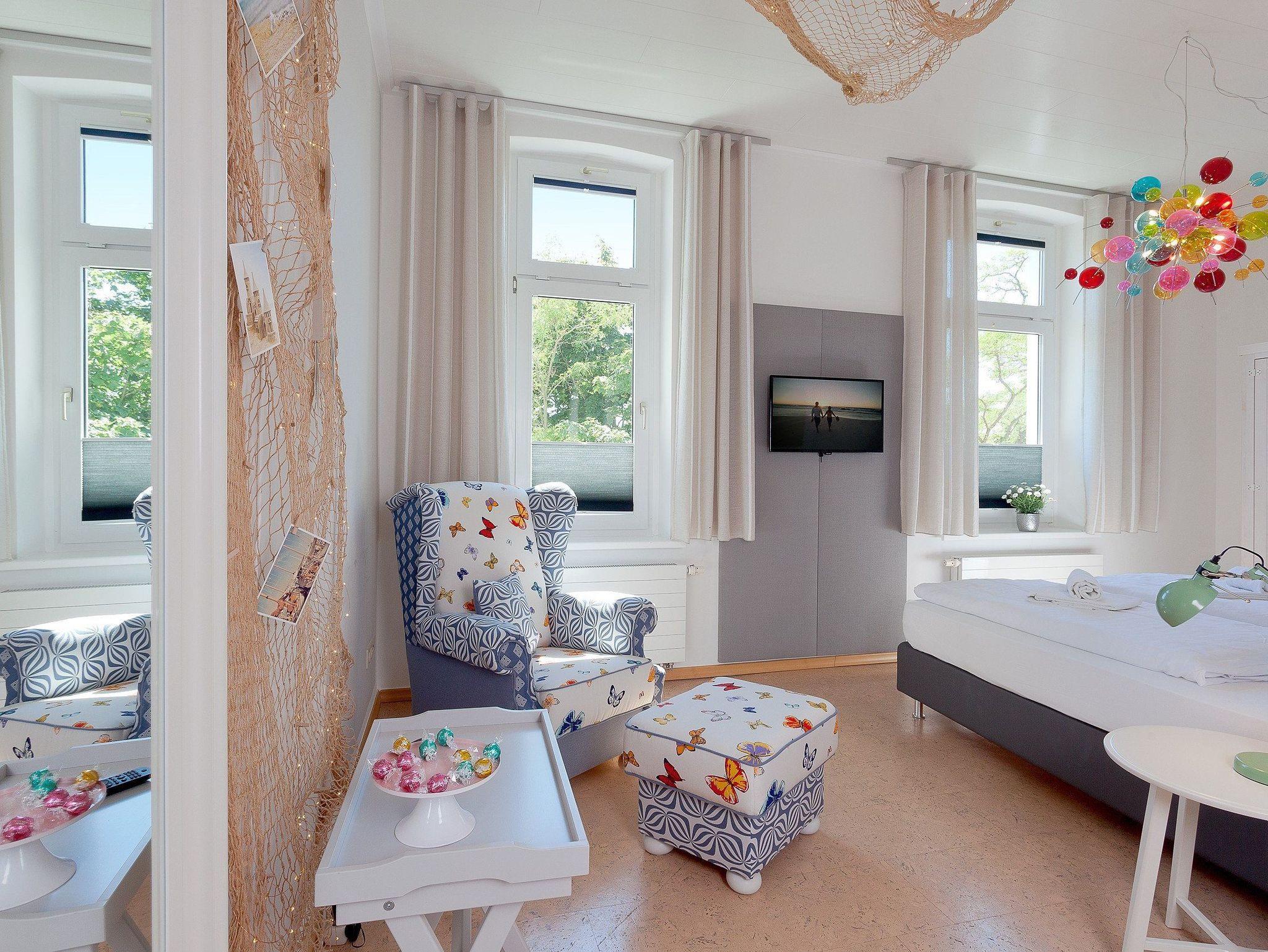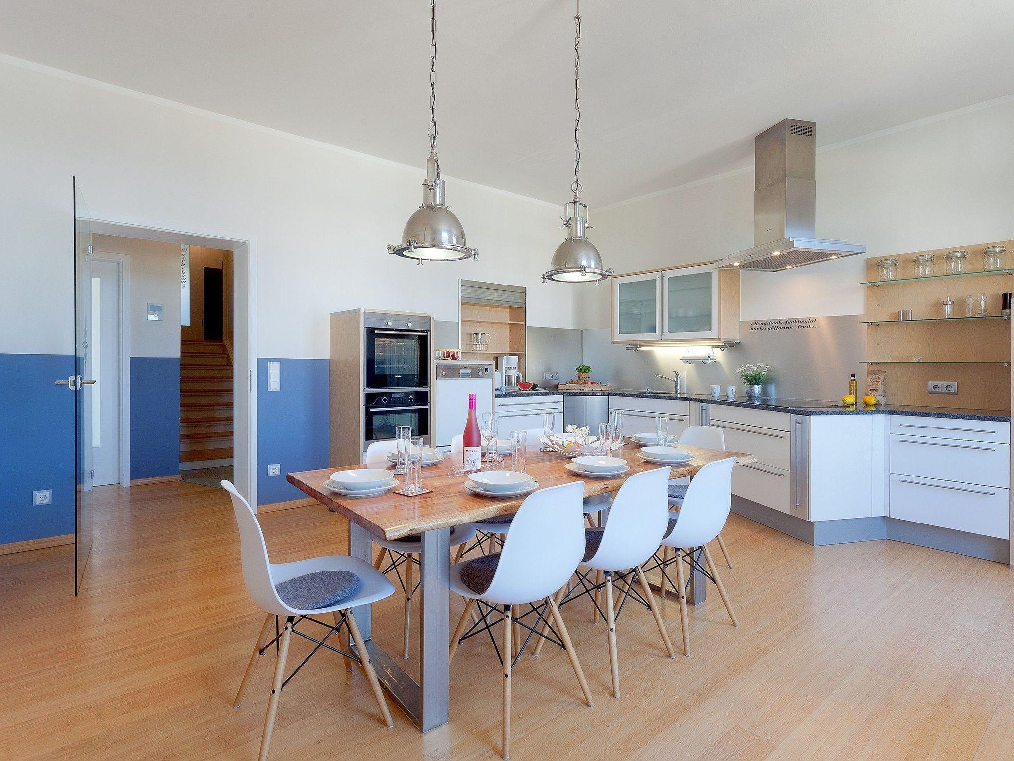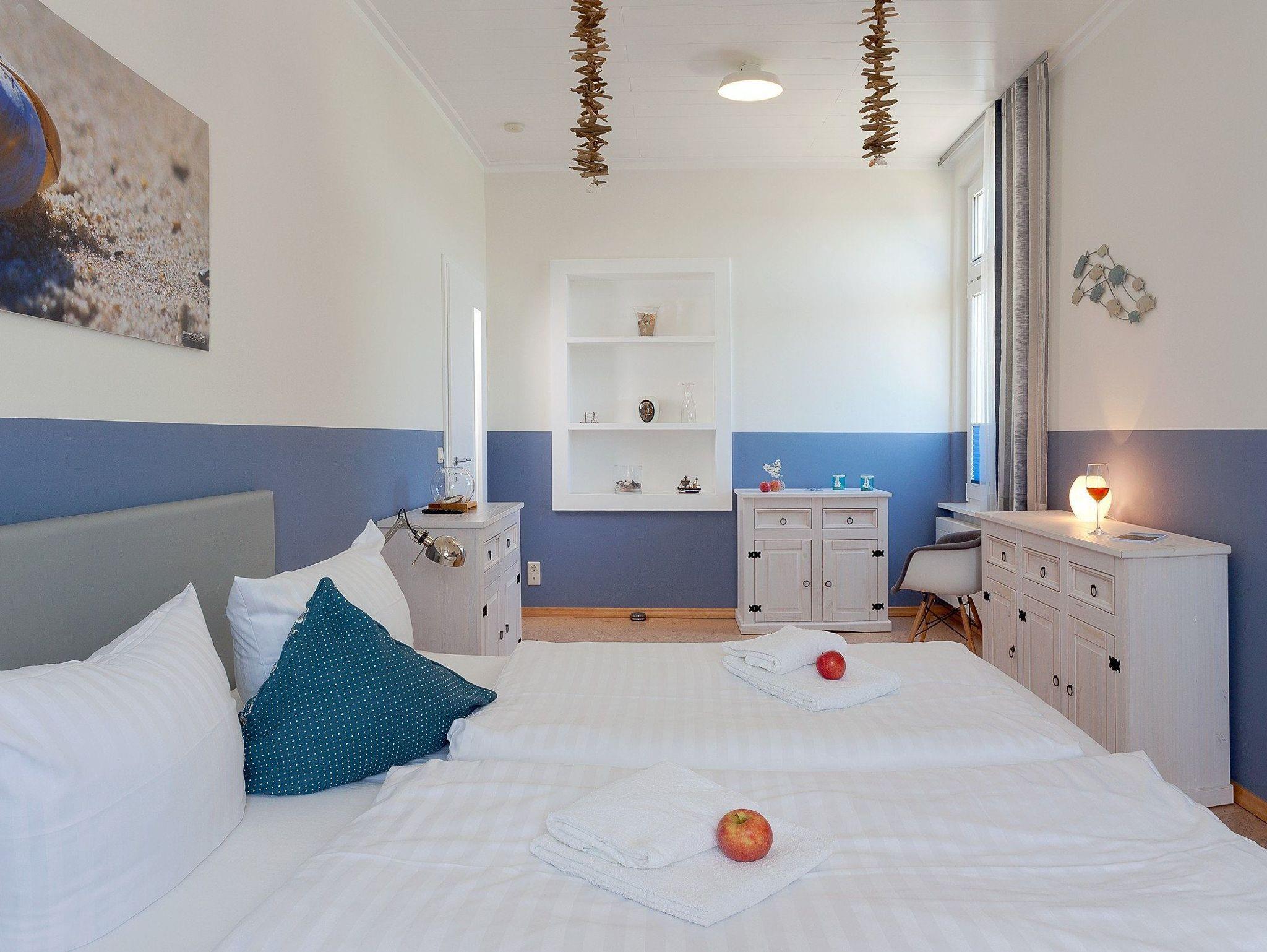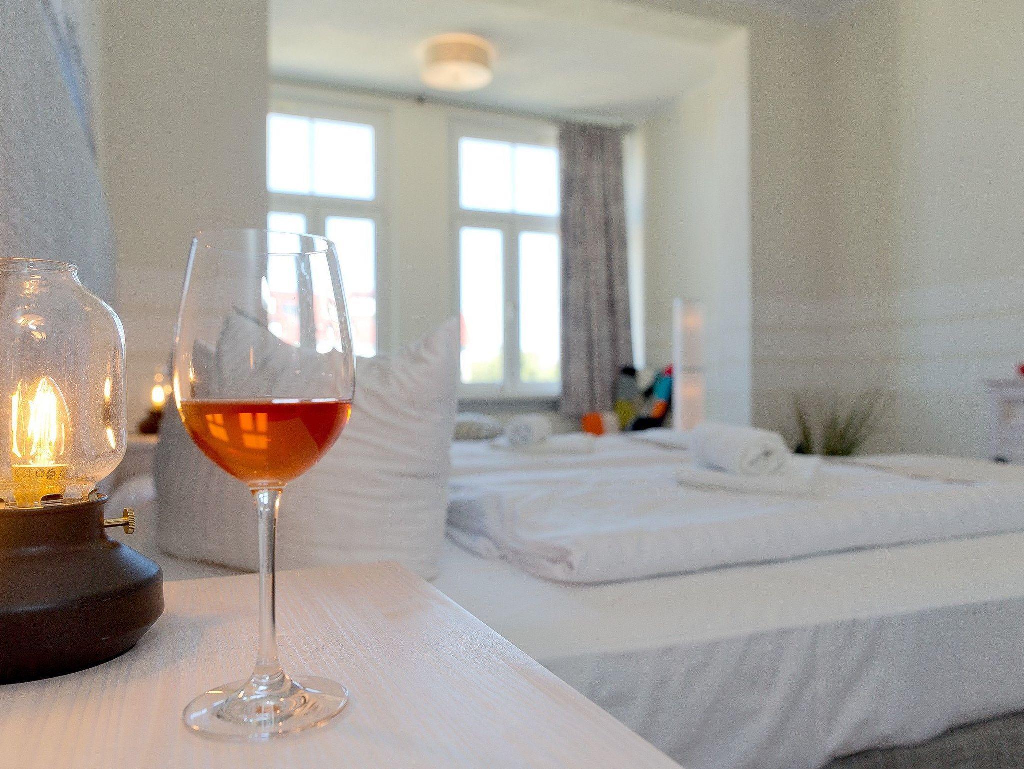 Auf 150 m² erwartet Sie ein exklusiv neu eingerichtetes 4-Raum-Appartement mit Meerblick für bis zu sechs Personen und einem Kleinkind bis zu drei Jahren im Babyreisebettchen im Seemannslook: mit separat großer Küche (Einbauküche mit Backofen, Ceranfeld, Geschirrspüler, Kühlschrank), Essplatz für 6 Personen und Zugang zum Balkon zur Meerseite.