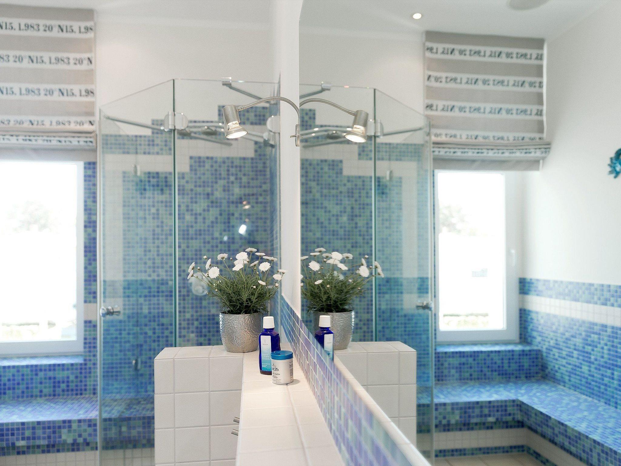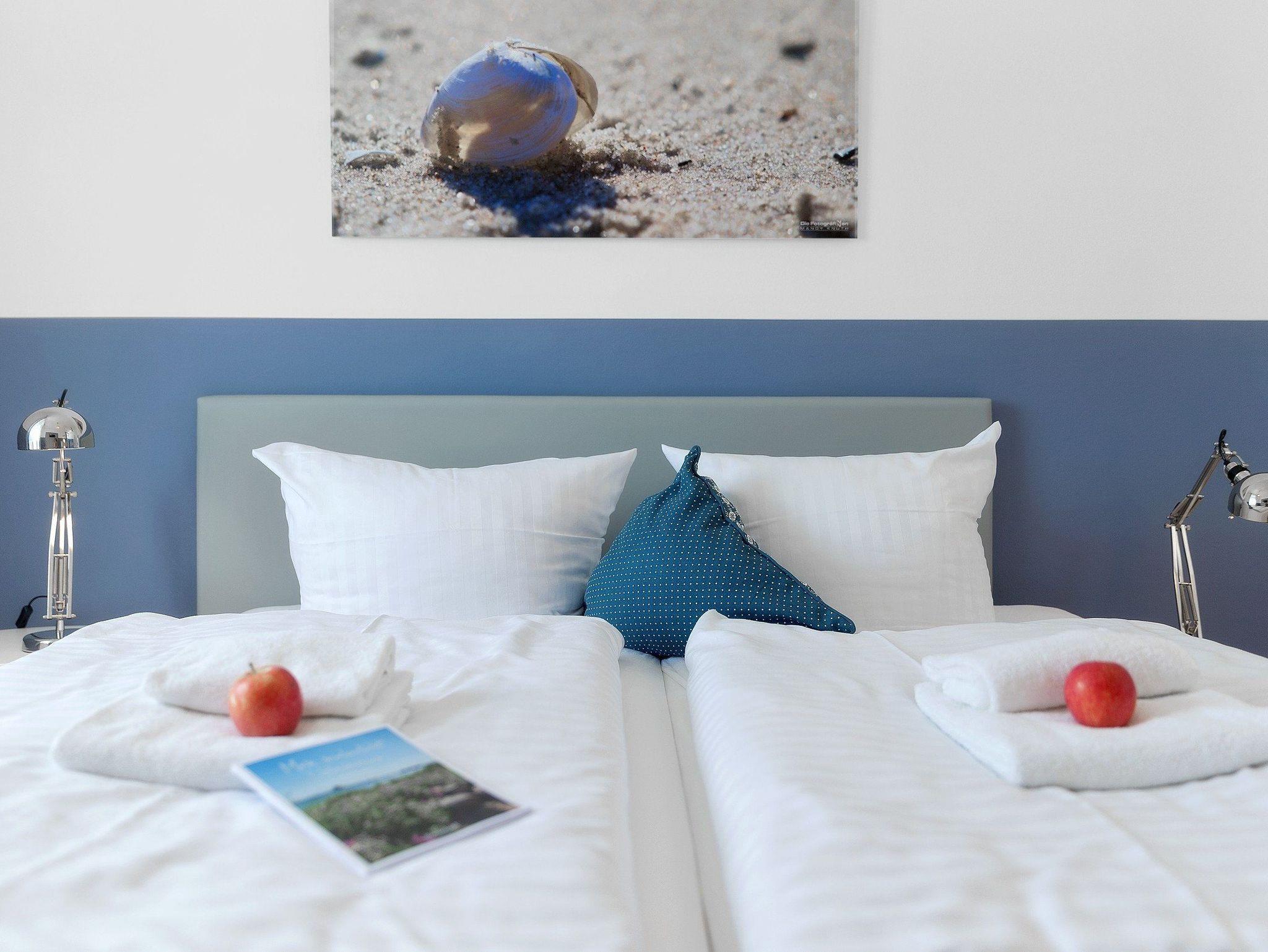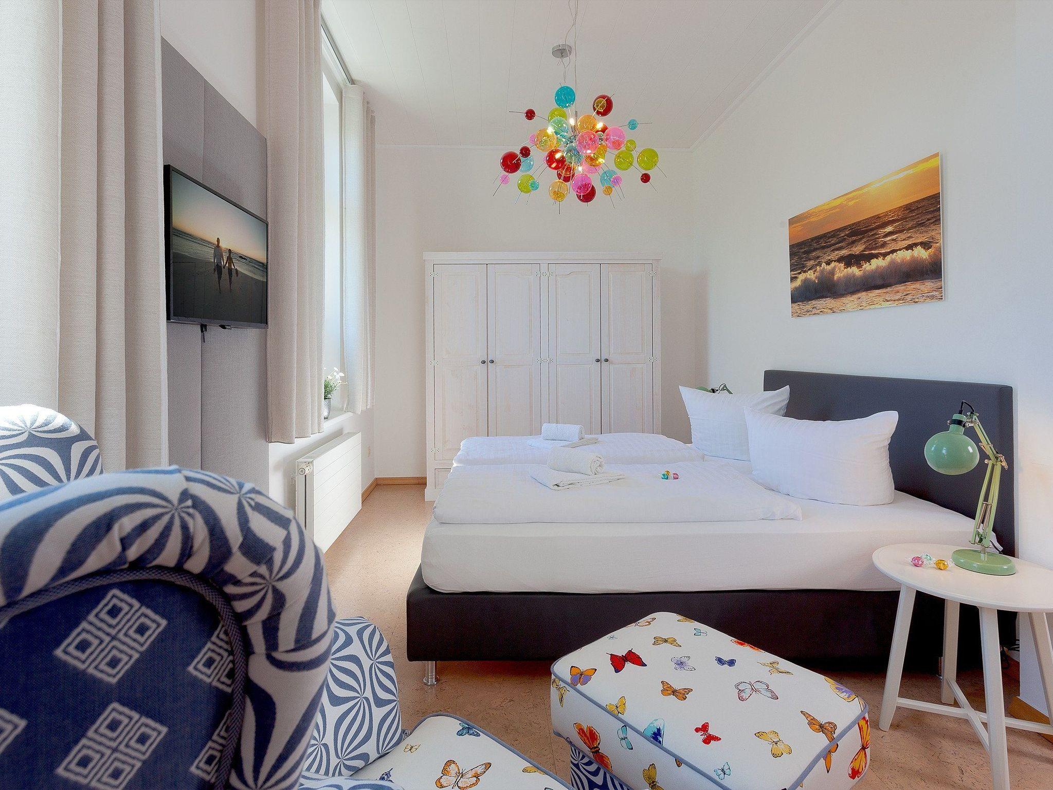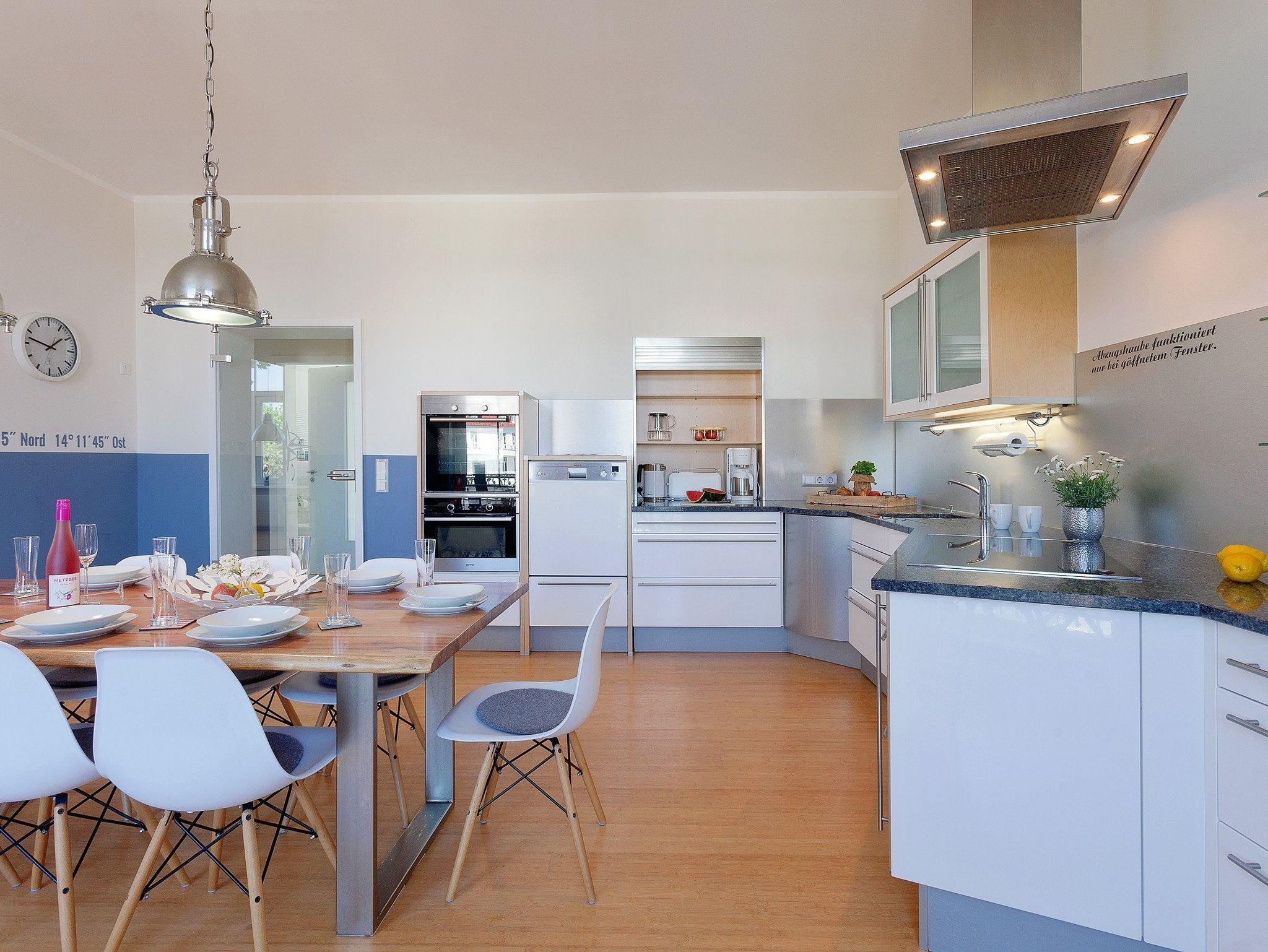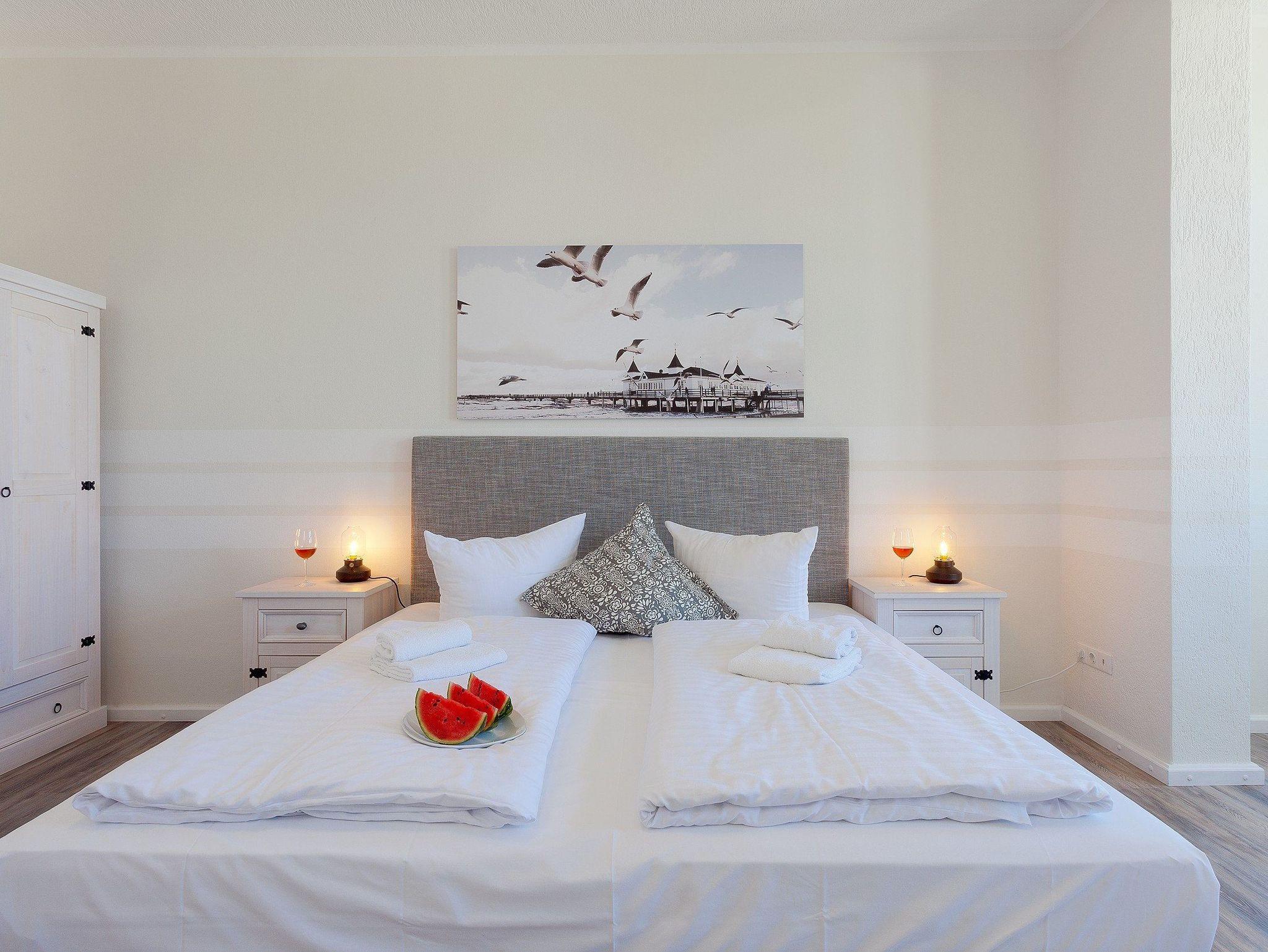 Auf 150 m² erwartet Sie ein exklusiv neu eingerichtetes 4-Raum-Appartement mit Meerblick für bis zu sechs Personen und einem Kleinkind bis zu drei Jahren im Babyreisebettchen im Seemannslook: mit separat großer Küche (Einbauküche mit Backofen, Ceranfeld, Geschirrspüler, Kühlschrank), Essplatz für 6 Personen und Zugang zum Balkon zur Meerseite.