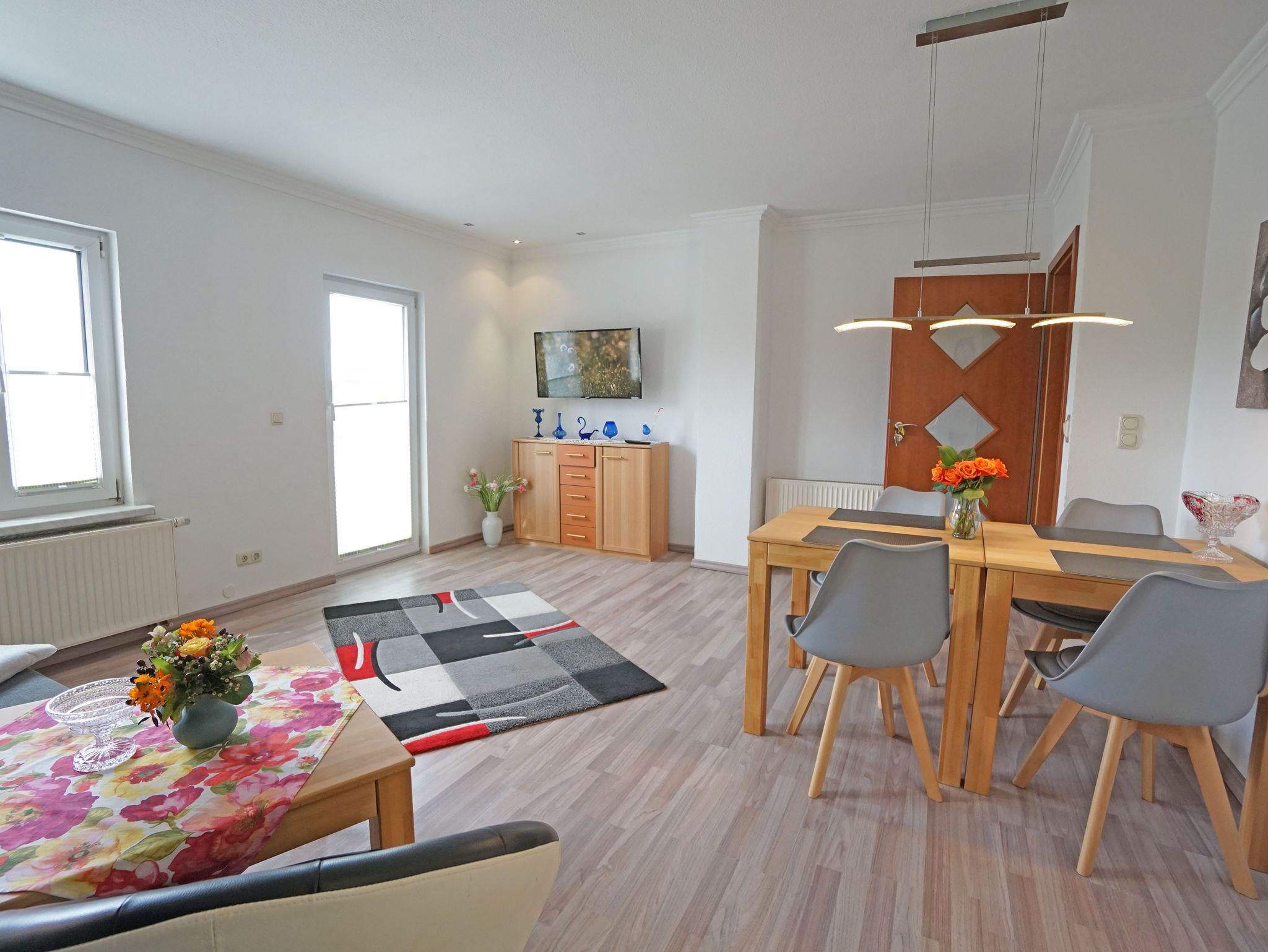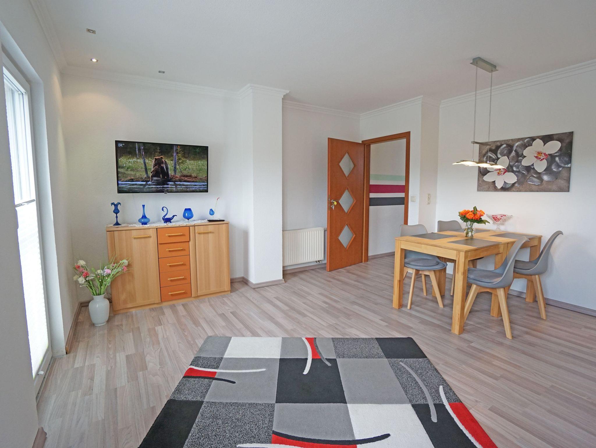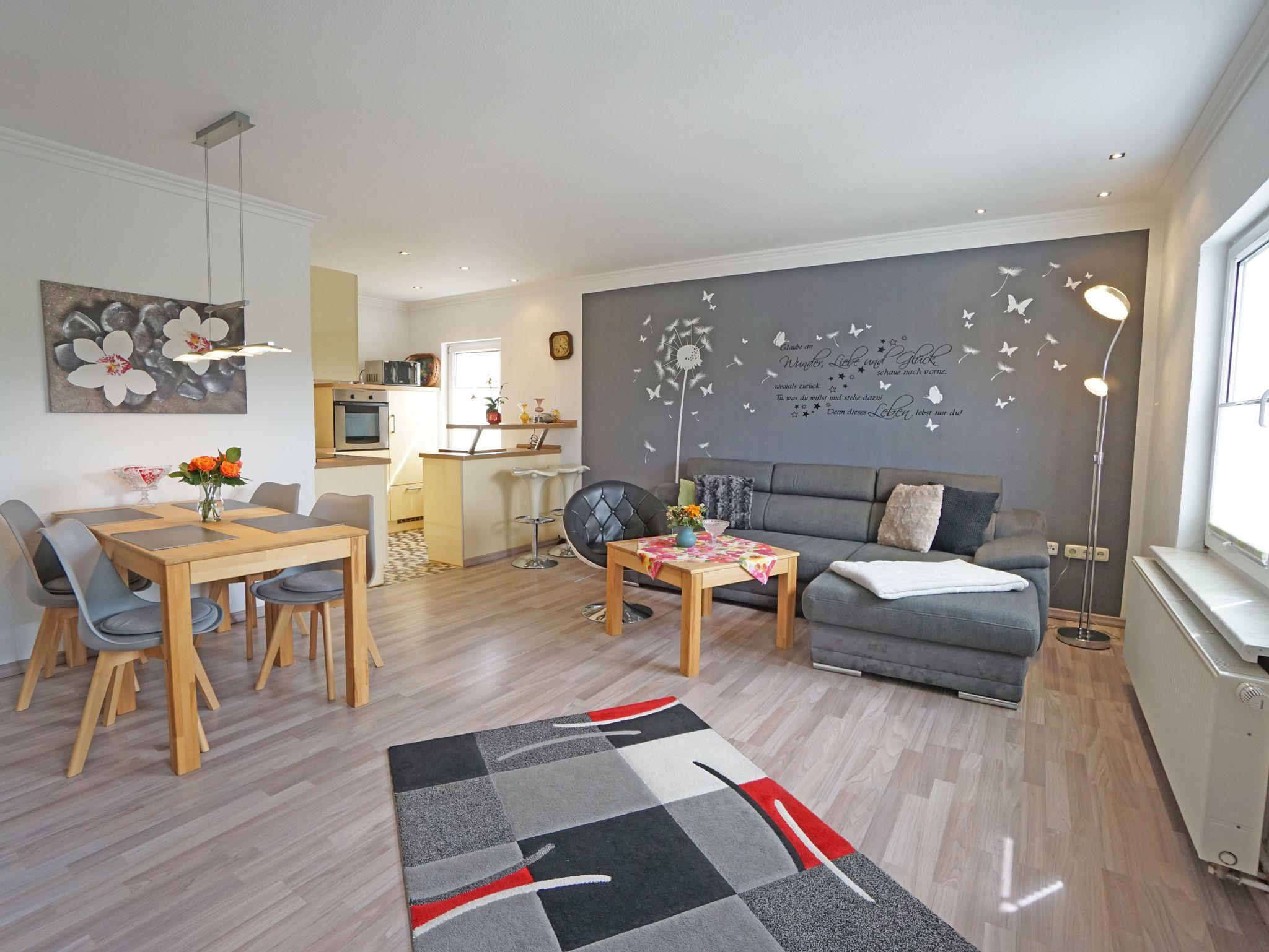 Die moderne Ferienwohnung (75qm) verfügt über 2 Schlafzimmer für max. 3 Personen. Vom großen Wohnzimmer mit offener Küche und Esstisch im ersten Obergeschoss gelangt man auf die großzügige möblierte Sonnenterrasse. Weiterhin verfügt die Wohnung über ein Duschbad. Das Grundstück ist komplett umzäunt. Für Ihren PKW gibt es einen Außenstellplatz.