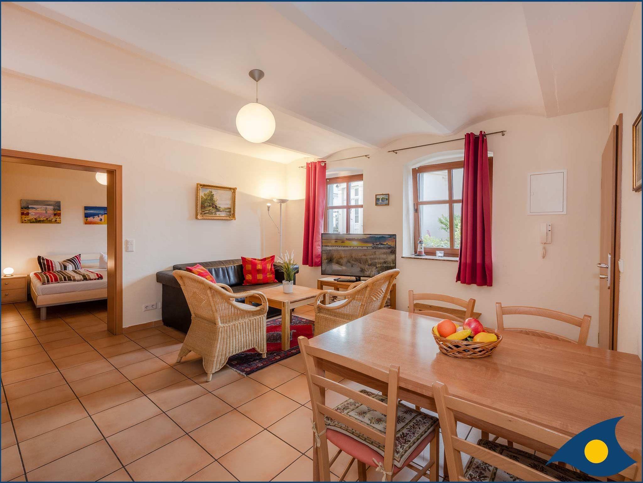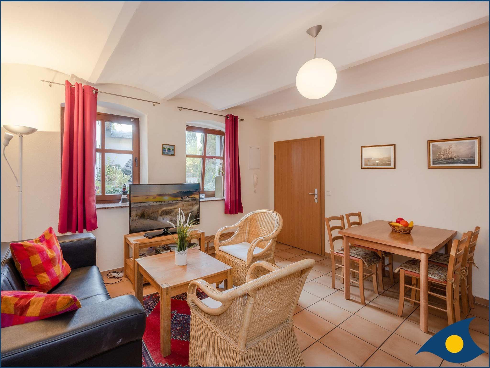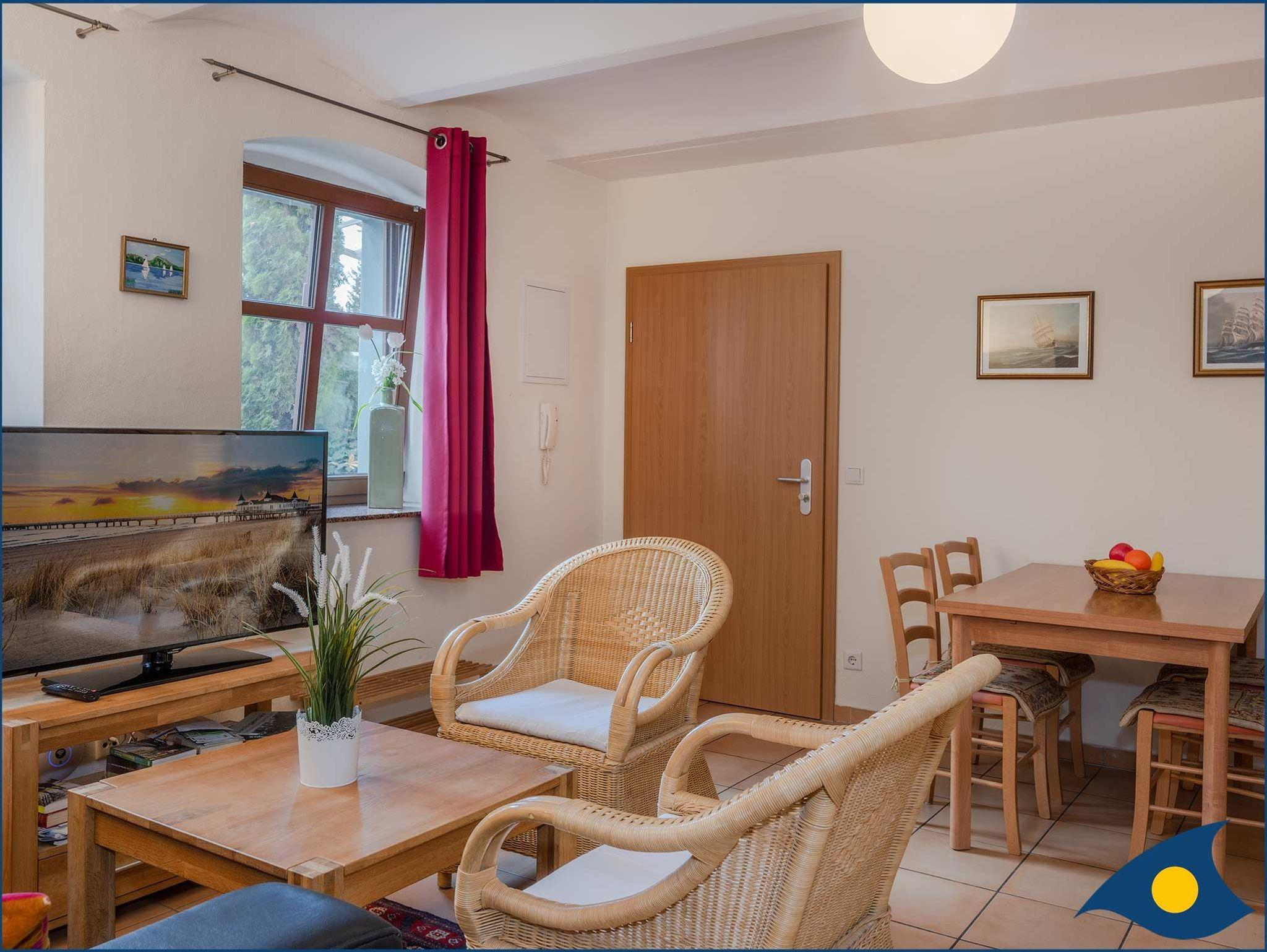 Die Wohnung 2 befindet sich im Souterrain des Hauses Ricarda mit separatem Eingang. Sie ist eine komplett ausgestattete ca. 40m² große 2-Raum-Ferienwohnungen mit offener Küche und für bis zu 4 Personen ausgelegt.
