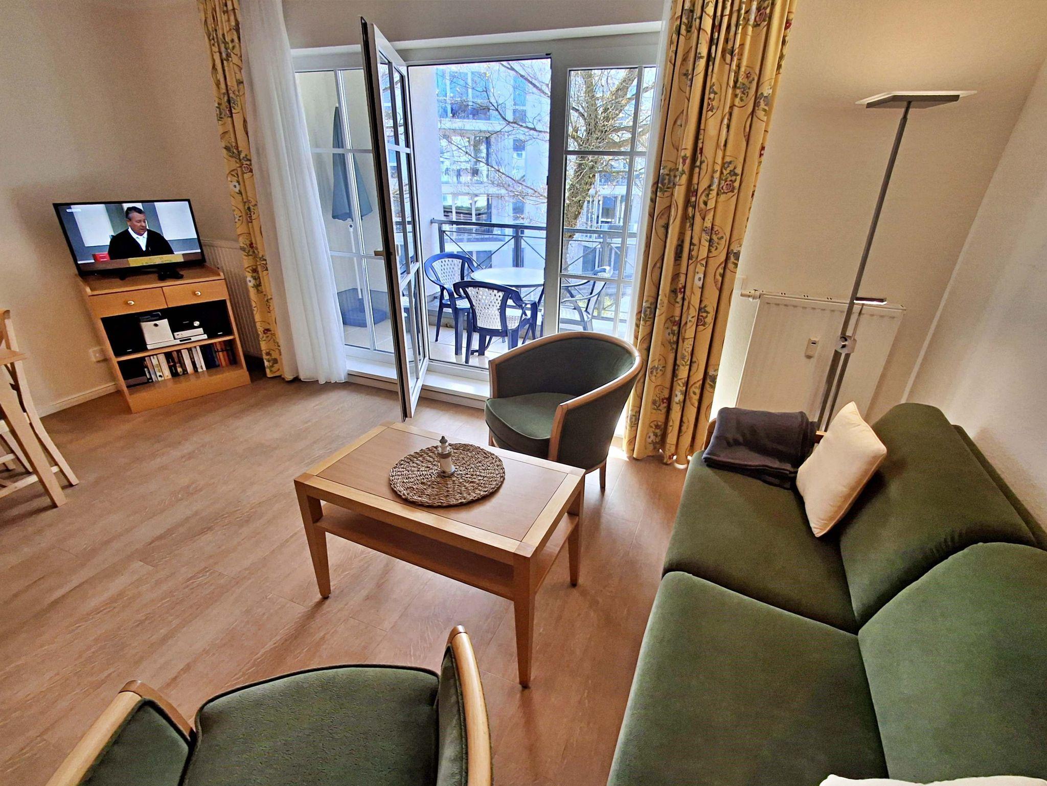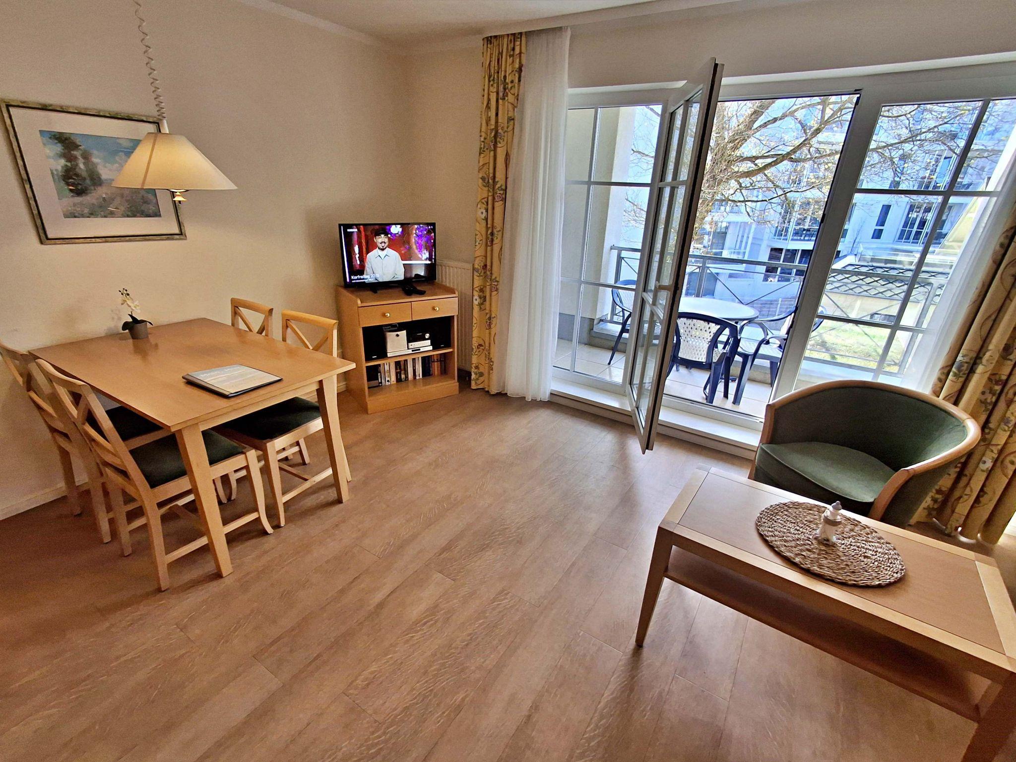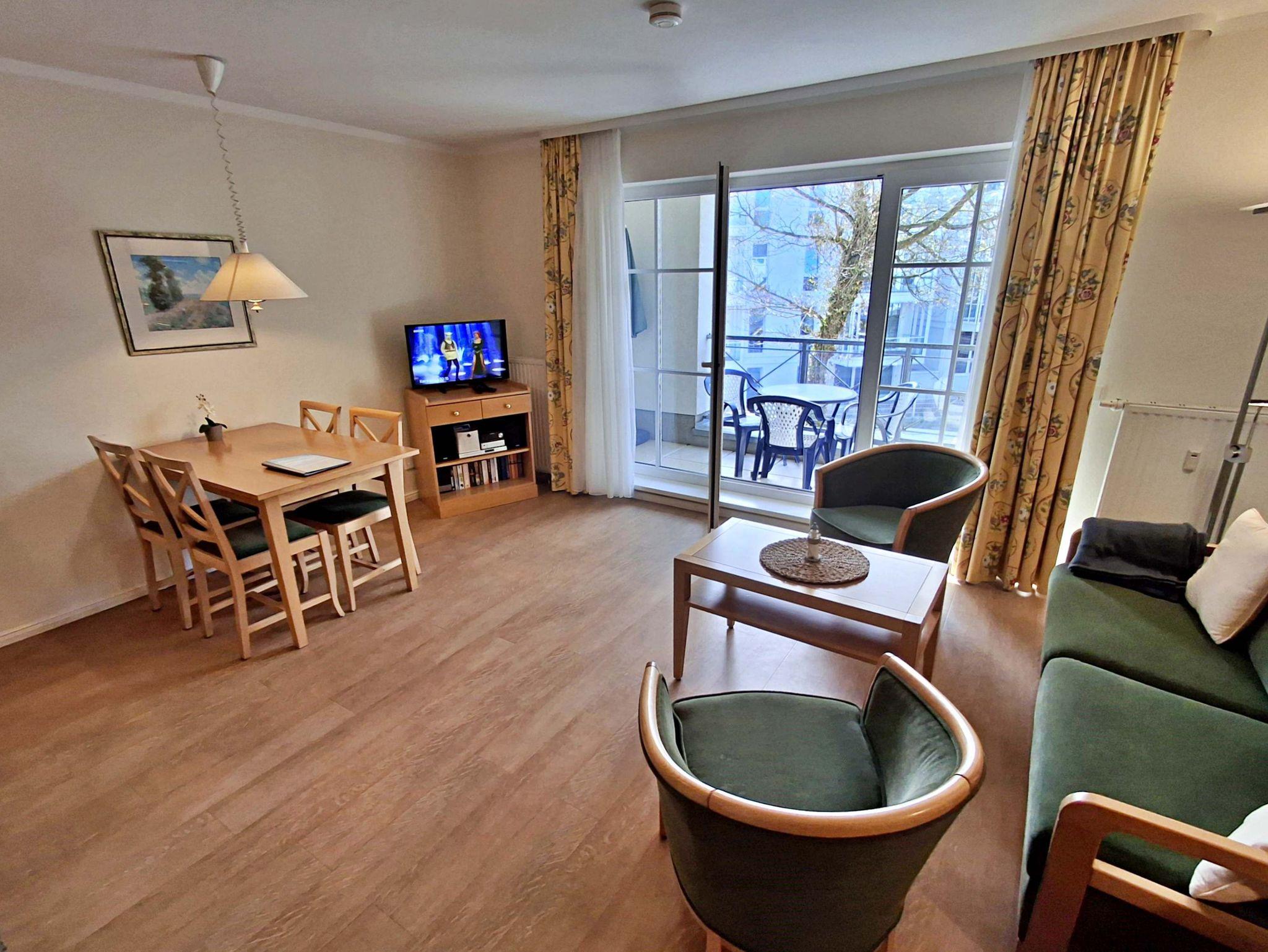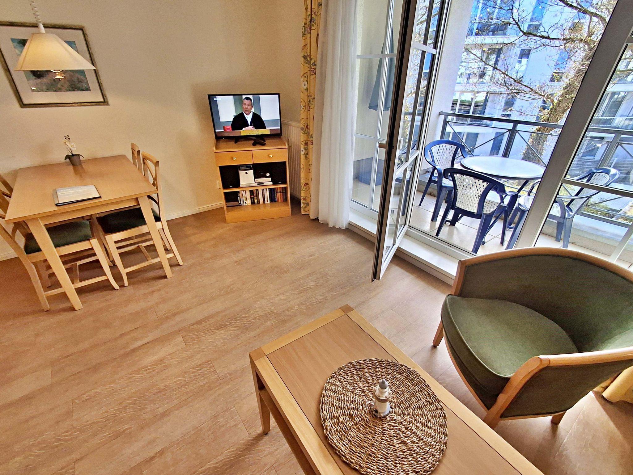 Die 47 qm große 2-Raum-Ferienwohnung mit eingeschränktem Meerblick befindet sich im zweiten Obgeschoss der Appartementanlage (Fahrstuhl vorhanden). Die Wohnung verfügt über ein Wohnzimmer mit Couch, welche auch zum Schlafen geeignet ist, bequeme Sessel sowie eine Essecke mit 4 Stühlen. Für die Unterhaltung sorgt ein Flachbild-TV, Stereo-Anlage, DVD-Player und eine Spielesammlung. Die vollständig ausgestattete Küchenzeile mit 4-Plattenherd, Backofen, Mikrowelle, Kühlschrank mit Gefrierfach, Spülmaschine, Sandwichtoaster lässt keine Wünsche offen. Im gemütlichen Schlafzimmer befindet sich ein Doppelbett (2,20 m lang und ohne Fußende). Das Tageslicht-Bad ist mit Dusche/WC und Haarfön ausgestattet. Eine Loggia zur Südseite lädt zum Sitzen und Verweilen ein.