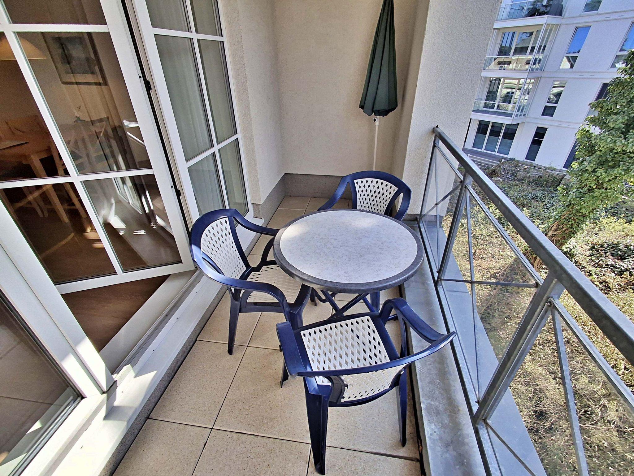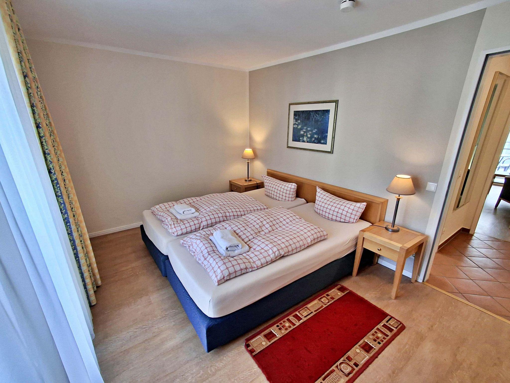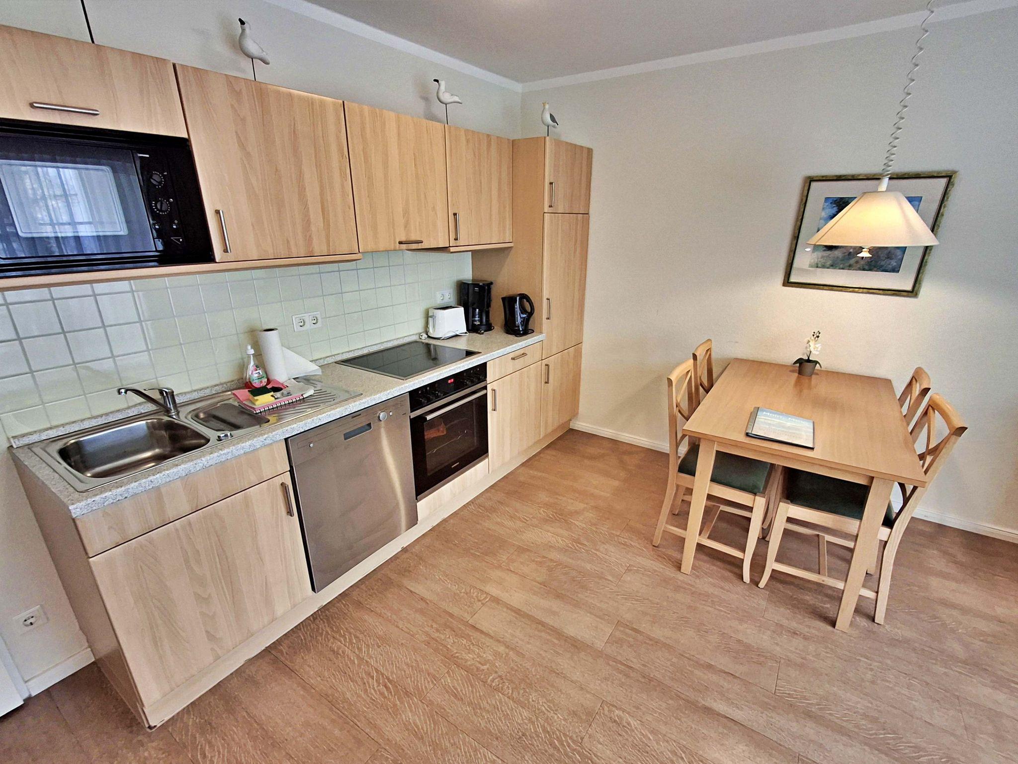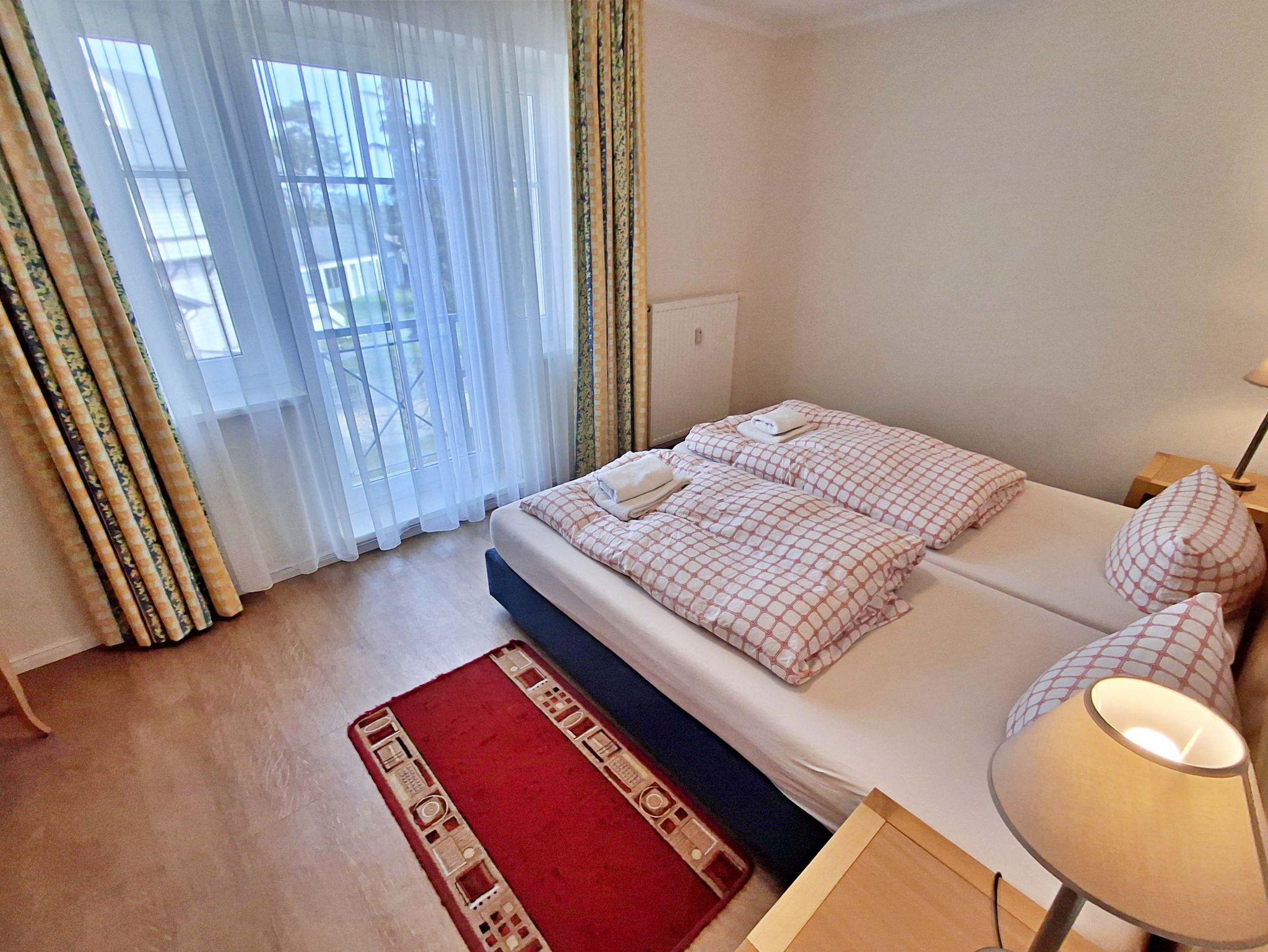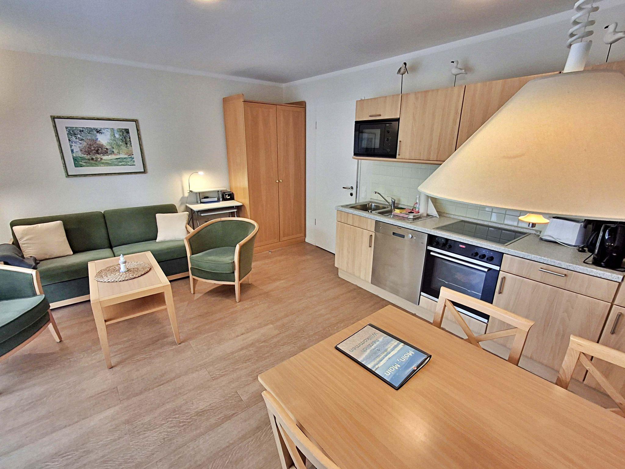 Die 47 qm große 2-Raum-Ferienwohnung mit eingeschränktem Meerblick befindet sich im zweiten Obgeschoss der Appartementanlage (Fahrstuhl vorhanden). Die Wohnung verfügt über ein Wohnzimmer mit Couch, welche auch zum Schlafen geeignet ist, bequeme Sessel sowie eine Essecke mit 4 Stühlen. Für die Unterhaltung sorgt ein Flachbild-TV, Stereo-Anlage, DVD-Player und eine Spielesammlung. Die vollständig ausgestattete Küchenzeile mit 4-Plattenherd, Backofen, Mikrowelle, Kühlschrank mit Gefrierfach, Spülmaschine, Sandwichtoaster lässt keine Wünsche offen. Im gemütlichen Schlafzimmer befindet sich ein Doppelbett (2,20 m lang und ohne Fußende). Das Tageslicht-Bad ist mit Dusche/WC und Haarfön ausgestattet. Eine Loggia zur Südseite lädt zum Sitzen und Verweilen ein.